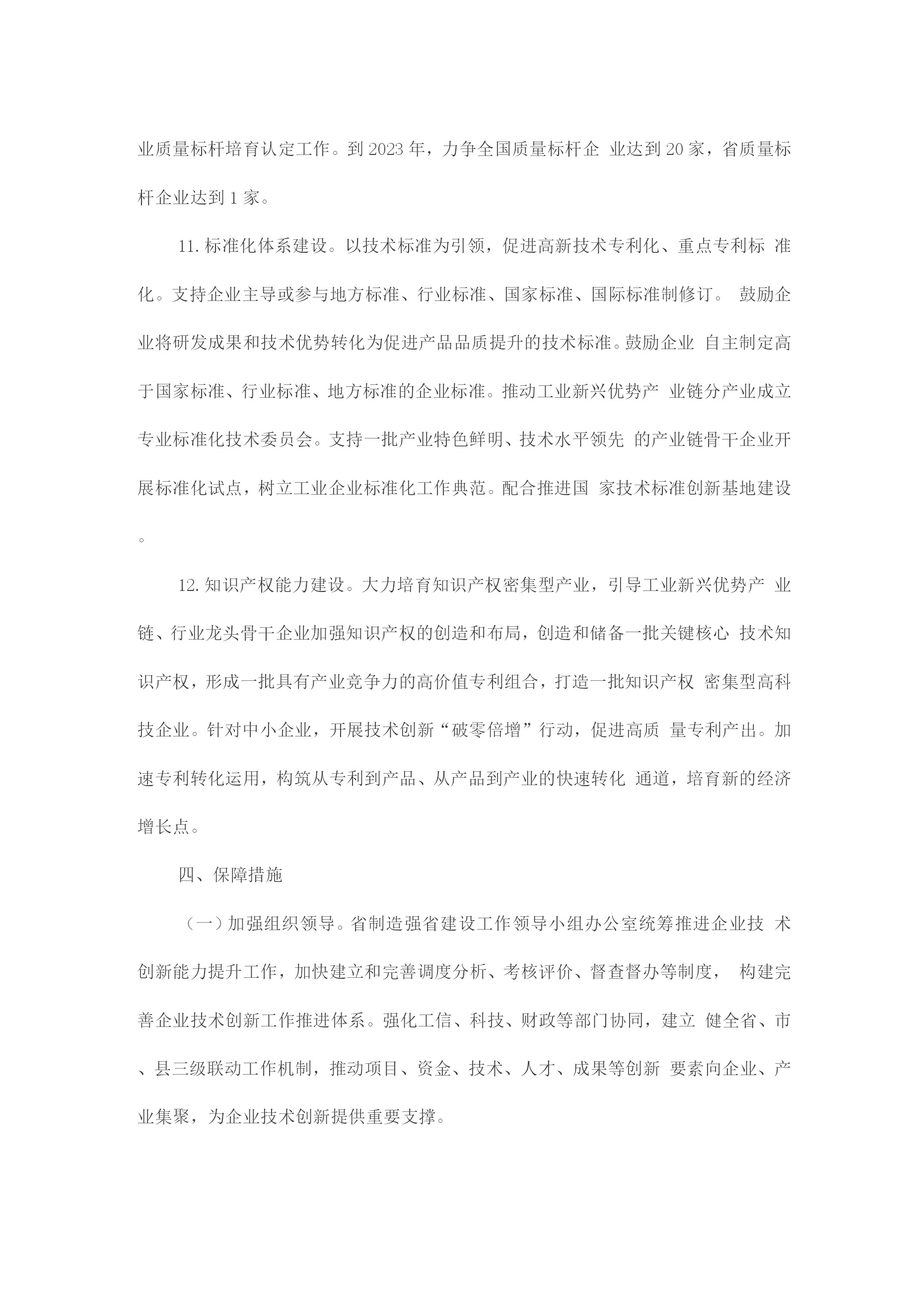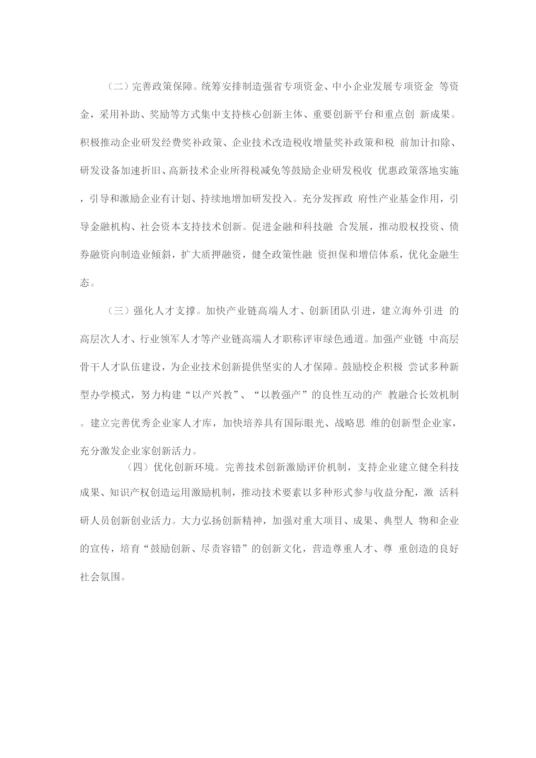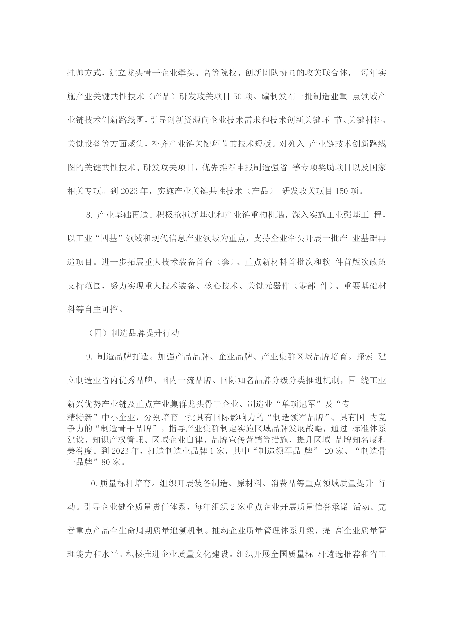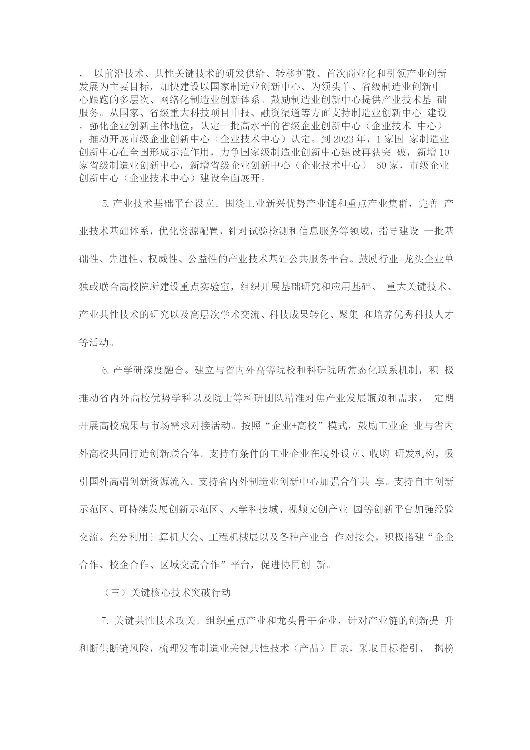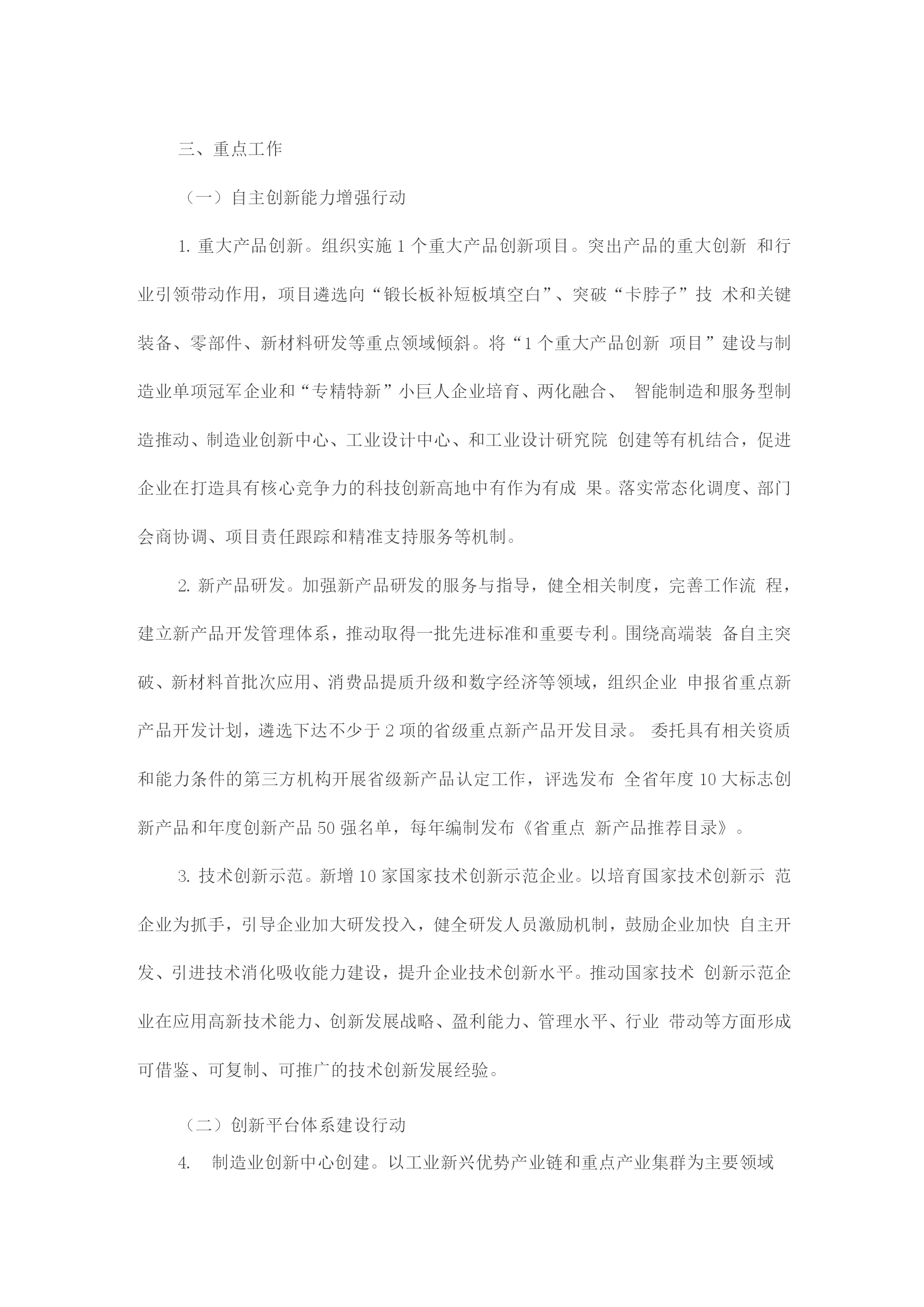 制造业创新能力提升三年行动计划(2021-2023)为深入实施制造强省战略,增强企业创新主体地位,促进产学研深度融合,健全技术创新体系,打造制造品牌,切实提升制造业创新能力和核心竞争力,支撑制造业高质量发展,特制定本行动计划。一、指导思想深入实施制造强省战略,统筹发展和安全,以“强主体、促协同、破瓶颈、铸品牌”为主线,坚持战略导向、目标导向、问题导向和需求导向,突出企业创新主体地位,打好产业基础高级化和产业链现代化水平攻坚战,增强产业链供应链自主可控能力,推动产品向品牌转变,以技术创新推动制造业实现质量变革、效率变革、动力变革,加快构建产业链、创新链、金融链、人才链、政策链深度融合的创新生态系统,为我省打造国家重要先进制造业高地、推动制造业高质量发展持续注入新动能新优势。二、行动目标到2023年,以重大产品创新、新产品研发和技术创新示范为抓手,企业自主创新能力显著增强。以制造业创新中心、企业创新中心(企业技术中心)和产业技术基础平台为重点,创新平台体系建设扎实推进。以关键共性技术导向目录、产业链技术创新路线图和关键共性技术攻关项目为导向,产业关键核心、技术取得突破。以质量标杆培育、标准化体系建设和知识产权能力建设为支撑,制造品牌建设成效明显。规模以上工业企业新产品销售收入占比突破24%、研发强度达1.8%,制造业创新能力和核心竞争力显著提升。三、重点工作(一)自主创新能力增强行动重大产品创新。组织实施1个重大产品创新项目。突出产品的重大创新和行业引领带动作用,项目遴选向“锻长板补短板填空白”、突破“卡脖子”技术和关键装备、零部件、新材料研发等重点领域倾斜。将“1个重大产品创新项目”建设与制造业单项冠军企业和“专精特新”小巨人企业培育、两化融合、智能制造和服务型制造推动、制造业创新中心、工业设计中心、和工业设计研究院创建等有机结合,促进企业在打造具有核心竞争力的科技创新高地中有作为有成果。落实常态化调度、部门会商协调、项目责任跟踪和精准支持服务等机制。新产品研发。加强新产品研发的服务与指导,健全相关制度,完善工作流程,建立新产品开发管理体系,推动取得一批先进标准和重要专利。围绕高端装备自主突破、新材料首批次应用、消费品提质升级和数字经济等领域,组织企业申报省重点新产品开发计划,遴选下达不少于2项的省级重点新产品开发目录。委托具有相关资质和能力条件的第三方机构开展省级新产品认定工作,评选发布全省年度10大标志创新产品和年度创新产品50强名单,每年编制发布《省重点新产品推荐目录》。技术创新示范。新增10家国家技术创新示范企业。以培育国家技术创新示范企业为抓手,引导企业加大研发投入,健全研发人员激励机制,鼓励企业加快自主开发、引进技术消化吸收能力建设,提升企业技术创新水平。推动国家技术创新示范企业在应用高新技术能力、创新发展战略、盈利能力、管理水平、行业带动等方面形成可借鉴、可复制、可推广的技术创新发展经验。(二)创新平台体系建设行动制造业创新中心创建。以工业新兴优势产业链和重点产业集群为主要领域,以前沿技术、共性关键技术的研发供给、转移扩散、首次商业化和引领产业创新发展为主要目标,加快建设以国家制造业创新中心、为领头羊、省级制造业创新中心跟跑的多层次、网络化制造业创新体系。鼓励制造业创新中心提供产业技术基础服务。从国家、省级重大科技项目申报、融资渠道等方面支持制造业创新中心建设。强化企业创新主体地位,认定一批高水平的省级企业创新中心(企业技术中心),推动开展市级企业创新中心(企业技术中心)认定。到2023年,1家国家制造业创新中心在全国形成示范作用,力争国家级制造业创新中心建设再获突破,新增10家省级制造业创新中心,新增省级企业创新中心(企业技术中心)60家,市级企业创新中心(企业技术中心)建设全面展开。产业技术基础平台设立。围绕工业新兴优势产业链和重点产业集群,完善产业技术基础体系,优化资源配置,针对试验检测和信息服务等领域,指导建设一批基础性、先进性、权威性、公益性的产业技术基础公共服务平台。鼓励行业龙头企业单独或联合高校院所建设重点实验室,组织开展基础研究和应用基础、重大关键技术、产业共性技术的研究以及高层次学术交流、科技成果转化、聚集和培养优秀科技人才等活动。产学研深度融合。建立与省内外高等院校和科研院所常态化联系机制,积极推动省内外高校优势学科以及院士等科研团队精准对焦产业发展瓶颈和需求,定期开展高校成果与市场需求对接活动。按照“企业+高校”模式,鼓励工业企业与省内外高校共同打造创新联合体。支持有条件的工业企业在境外设立、收购研发机构,吸引国外高端创新资源流入。支持省内外制造业创新中心加强合作共享。支持自主创新示范区、可持续发展创新示范区、大学科技城、视频文创产业园等创新平台加强经验交流。充分