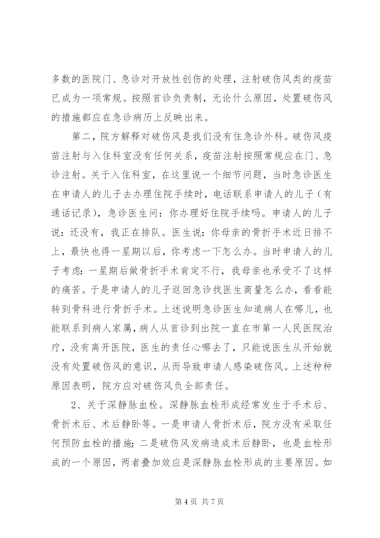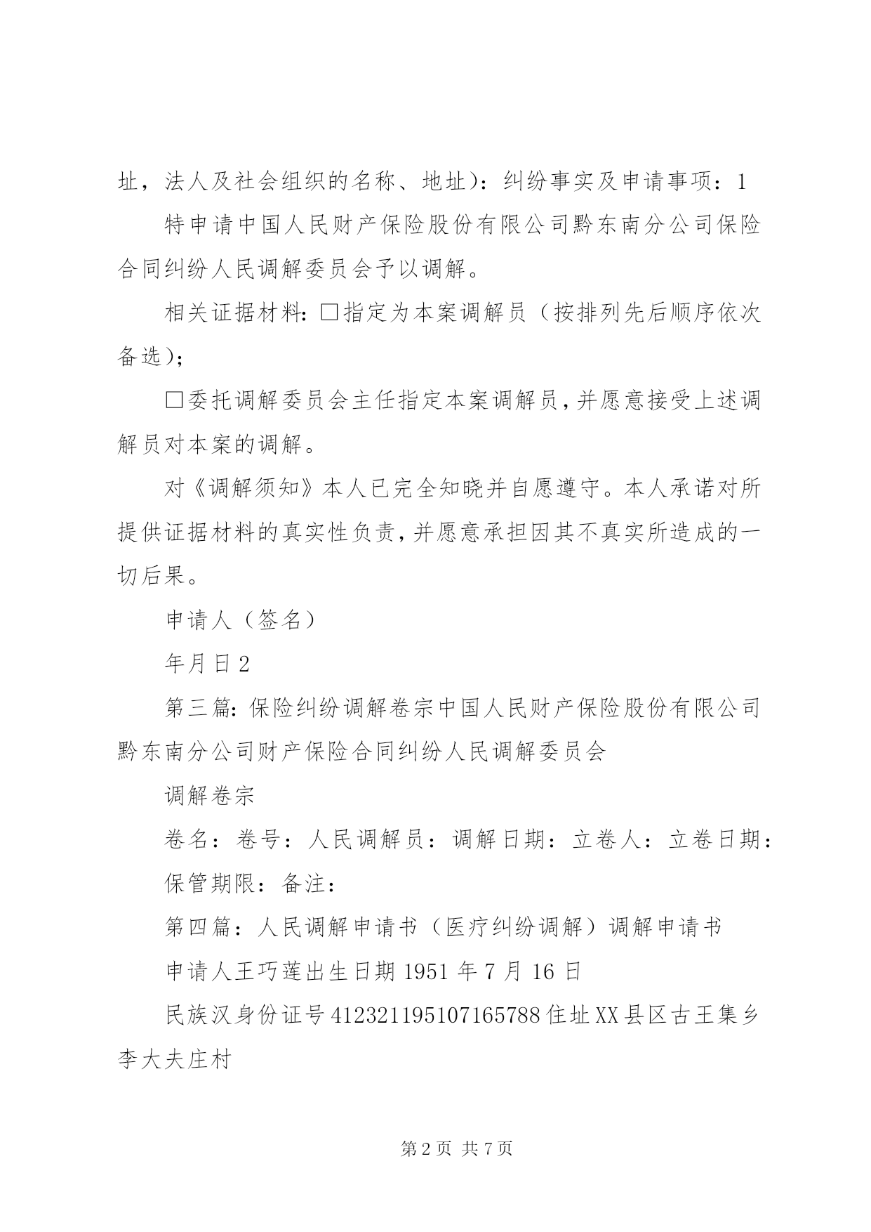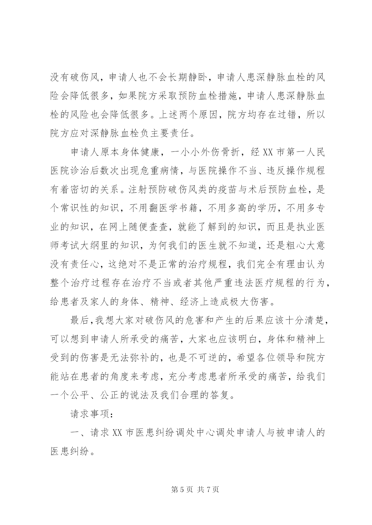 第PAGE\*Arabic\*MERGEFORMAT7页共NUMPAGES\*MERGEFORMAT7页保险纠纷调解申请书申请书当事人(自然人姓名、性别、年龄、民族、职业、单位或住址,法人及社会组织的名称、地址):纠纷事实及申请事项:1特申请中国人民财产保险股份有限公司黔东南分公司保险合同纠纷人民调解委员会予以调解。相关证据材料:□指定为本案调解员(按排列先后顺序依次备选);□委托调解委员会主任指定本案调解员,并愿意接受上述调解员对本案的调解。对《调解须知》本人已完全知晓并自愿遵守。本人承诺对所提供证据材料的真实性负责,并愿意承担因其不真实所造成的一切后果。申请人(签名)年月日第二篇:保险纠纷调解申请书中国人民财产保险股份有限公司黔东南分公司保险合同纠纷人民调解委员会调解申请书当事人(自然人姓名、性别、年龄、民族、职业、单位或住址,法人及社会组织的名称、地址):纠纷事实及申请事项:1特申请中国人民财产保险股份有限公司黔东南分公司保险合同纠纷人民调解委员会予以调解。相关证据材料:□指定为本案调解员(按排列先后顺序依次备选);□委托调解委员会主任指定本案调解员,并愿意接受上述调解员对本案的调解。对《调解须知》本人已完全知晓并自愿遵守。本人承诺对所提供证据材料的真实性负责,并愿意承担因其不真实所造成的一切后果。申请人(签名)年月日2第三篇:保险纠纷调解卷宗中国人民财产保险股份有限公司黔东南分公司财产保险合同纠纷人民调解委员会调解卷宗卷名:卷号:人民调解员:调解日期:立卷人:立卷日期:保管期限:备注:第四篇:人民调解申请书(医疗纠纷调解)调解申请书申请人王巧莲出生日期1951年7月16日民族汉身份证号412321195107165788住址XX县区古王集乡李大夫庄村被申请人XX市第一人民医院法定代表人事实与理由:一、事情经过2015年10月14日上午10点,申请人王巧莲在路上因骑车不慎摔伤,导致左侧锁骨骨折,双腿大面积擦伤,右脚有一约5-6厘米长2-3厘米深的伤口。于上午11点50分到达XX市一人民医院急诊科就诊,经急诊医生进行清创缝合,于下午3点左右转入骨二病区,于16日上午进行锁骨固定手术,19日经医生同意后出院,回家约一周后感到身体不适,26日出现全身乏力、咀嚼无力、抽筋等症状,于29日下午经XX市第一人民医院传染科确诊为破伤风,后转入XX市第一人民医院分院,在分院治疗5日后,出现左腿疼痛、肿胀,经医生诊断为左腿深静脉血栓,后转入市第一人民医院中医外科治疗。二、院方存在问题1、关于破伤风。第一,破伤风疫苗注射应在首诊时注射。当时急诊医生进行清创、缝合、包扎,伤口的情况只有急诊医生了解,按照操作规程清创、缝合后应根据伤口情况立即判断是否注射破伤风疫苗,我母亲的伤口深且污染严重(伤口内有泥土及杂草),完全符合注射破伤风疫苗的要求,按照预防破伤风的原则应尽快,一般在门、急诊处理伤口后立即注射。从查阅相关资料来看,当前绝大多数的医院门、急诊对开放性创伤的处理,注射破伤风类的疫苗已成为一项常规。按照首诊负责制,无论什么原因,处置破伤风的措施都应在急诊病历上反映出来。第二,院方解释对破伤风是我们没有住急诊外科。破伤风疫苗注射与入住科室没有任何关系,疫苗注射按照常规应在门、急诊注射。关于入住科室,在这里说一个细节问题,当时急诊医生在申请人的儿子去办理住院手续时,电话联系申请人的儿子(有通话记录),急诊医生问:你办理好住院手续吗。申请人的儿子说:还没有,我正在排队。医生说:你母亲的骨折手术近日排不上,最快也得一星期以后,你考虑一下怎么办。当时申请人的儿子考虑:一星期后做骨折手术肯定不行,我母亲也承受不了这样的痛苦。于是申请人的儿子返回急诊找医生商量怎么办,看看能转到骨科进行骨折手术。上述说明急诊医生知道病人在哪儿,也能联系到病人家属,病人从首诊到出院一直在市第一人民医院治疗,没有离开医院,医生的责任心哪去了,只能说医生从开始就没有处置破伤风的意识,从而导致申请人感染破伤风。上述种种原因表明,院方应对破伤风负全部责任。2、关于深静脉血栓。深静脉血栓形成经常发生于手术后、骨折术后、术后静卧等。一是申请人骨折术后,院方没有采取任何预防血栓的措施;二是破伤风发病造成术后静卧,也是血栓形成的一个原因,两者叠加效应是深静脉血栓形成的主要原因。如没有破伤风,申请人也不会长期静卧,申请人患深静脉血栓的风险会降低很多,如果院方采取预防血栓措施,申请人患深静脉血栓的风险也会降低很多。上述两个原因,院方均存在过错,所以院方应对深静脉血栓负主要责任。申请人原本身体健康,一小小外伤骨折,经XX市第一人民医院诊治后数次出现危重病情,与医院操作不当、违反操作规程有着密切的关系。注射预防破伤风类的疫苗与术后预防血栓,是个常识性的知识,不用翻医学书籍,