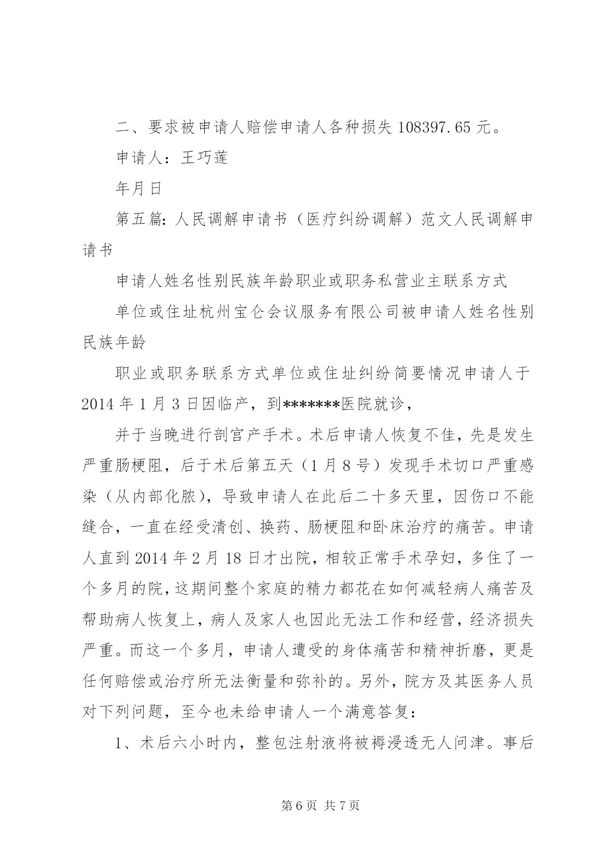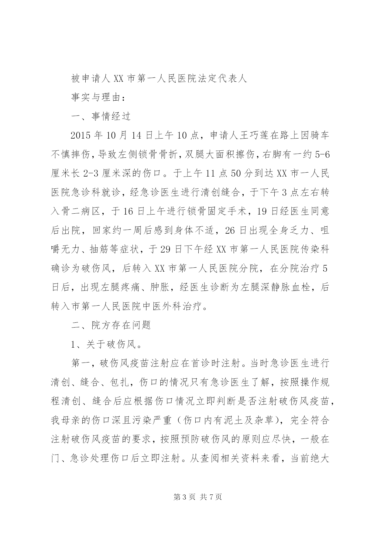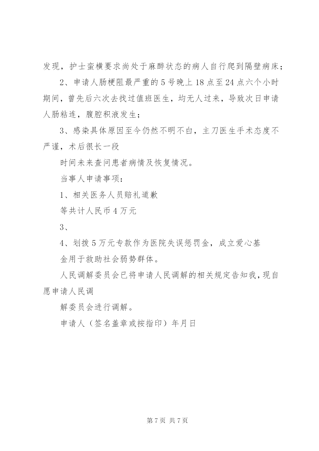 第PAGE\*Arabic\*MERGEFORMAT7页共NUMPAGES\*MERGEFORMAT7页保险纠纷调解申请书申请书当事人(自然人姓名、性别、年龄、民族、职业、单位或住址,法人及社会组织的名称、地址):纠纷事实及申请事项:1特申请中国人民财产保险股份有限公司黔东南分公司保险合同纠纷人民调解委员会予以调解。相关证据材料:□指定为本案调解员(按排列先后顺序依次备选);□委托调解委员会主任指定本案调解员,并愿意接受上述调解员对本案的调解。对《调解须知》本人已完全知晓并自愿遵守。本人承诺对所提供证据材料的真实性负责,并愿意承担因其不真实所造成的一切后果。申请人(签名)年月日第二篇:保险纠纷调解申请书中国人民财产保险股份有限公司黔东南分公司保险合同纠纷人民调解委员会调解申请书当事人(自然人姓名、性别、年龄、民族、职业、单位或住址,法人及社会组织的名称、地址):纠纷事实及申请事项:1特申请中国人民财产保险股份有限公司黔东南分公司保险合同纠纷人民调解委员会予以调解。相关证据材料:□指定为本案调解员(按排列先后顺序依次备选);□委托调解委员会主任指定本案调解员,并愿意接受上述调解员对本案的调解。对《调解须知》本人已完全知晓并自愿遵守。本人承诺对所提供证据材料的真实性负责,并愿意承担因其不真实所造成的一切后果。申请人(签名)年月日2第三篇:保险纠纷调解卷宗中国人民财产保险股份有限公司黔东南分公司财产保险合同纠纷人民调解委员会调解卷宗卷名:卷号:人民调解员:调解日期:立卷人:立卷日期:保管期限:备注:第四篇:人民调解申请书(医疗纠纷调解)调解申请书申请人王巧莲出生日期1951年7月16日民族汉身份证号412321195107165788住址XX县区古王集乡李大夫庄村被申请人XX市第一人民医院法定代表人事实与理由:一、事情经过2015年10月14日上午10点,申请人王巧莲在路上因骑车不慎摔伤,导致左侧锁骨骨折,双腿大面积擦伤,右脚有一约5-6厘米长2-3厘米深的伤口。于上午11点50分到达XX市一人民医院急诊科就诊,经急诊医生进行清创缝合,于下午3点左右转入骨二病区,于16日上午进行锁骨固定手术,19日经医生同意后出院,回家约一周后感到身体不适,26日出现全身乏力、咀嚼无力、抽筋等症状,于29日下午经XX市第一人民医院传染科确诊为破伤风,后转入XX市第一人民医院分院,在分院治疗5日后,出现左腿疼痛、肿胀,经医生诊断为左腿深静脉血栓,后转入市第一人民医院中医外科治疗。二、院方存在问题1、关于破伤风。第一,破伤风疫苗注射应在首诊时注射。当时急诊医生进行清创、缝合、包扎,伤口的情况只有急诊医生了解,按照操作规程清创、缝合后应根据伤口情况立即判断是否注射破伤风疫苗,我母亲的伤口深且污染严重(伤口内有泥土及杂草),完全符合注射破伤风疫苗的要求,按照预防破伤风的原则应尽快,一般在门、急诊处理伤口后立即注射。从查阅相关资料来看,当前绝大多数的医院门、急诊对开放性创伤的处理,注射破伤风类的疫苗已成为一项常规。按照首诊负责制,无论什么原因,处置破伤风的措施都应在急诊病历上反映出来。第二,院方解释对破伤风是我们没有住急诊外科。破伤风疫苗注射与入住科室没有任何关系,疫苗注射按照常规应在门、急诊注射。关于入住科室,在这里说一个细节问题,当时急诊医生在申请人的儿子去办理住院手续时,电话联系申请人的儿子(有通话记录),急诊医生问:你办理好住院手续吗。申请人的儿子说:还没有,我正在排队。医生说:你母亲的骨折手术近日排不上,最快也得一星期以后,你考虑一下怎么办。当时申请人的儿子考虑:一星期后做骨折手术肯定不行,我母亲也承受不了这样的痛苦。于是申请人的儿子返回急诊找医生商量怎么办,看看能转到骨科进行骨折手术。上述说明急诊医生知道病人在哪儿,也能联系到病人家属,病人从首诊到出院一直在市第一人民医院治疗,没有离开医院,医生的责任心哪去了,只能说医生从开始就没有处置破伤风的意识,从而导致申请人感染破伤风。上述种种原因表明,院方应对破伤风负全部责任。2、关于深静脉血栓。深静脉血栓形成经常发生于手术后、骨折术后、术后静卧等。一是申请人骨折术后,院方没有采取任何预防血栓的措施;二是破伤风发病造成术后静卧,也是血栓形成的一个原因,两者叠加效应是深静脉血栓形成的主要原因。如没有破伤风,申请人也不会长期静卧,申请人患深静脉血栓的风险会降低很多,如果院方采取预防血栓措施,申请人患深静脉血栓的风险也会降低很多。上述两个原因,院方均存在过错,所以院方应对深静脉血栓负主要责任。申请人原本身体健康,一小小外伤骨折,经XX市第一人民医院诊治后数次出现危重病情,与医院操作不当、违反操作规程有着密切的关系。注射预防破伤风类的疫苗与术后预防血栓,是个常识性的知识,不用翻医学书籍,