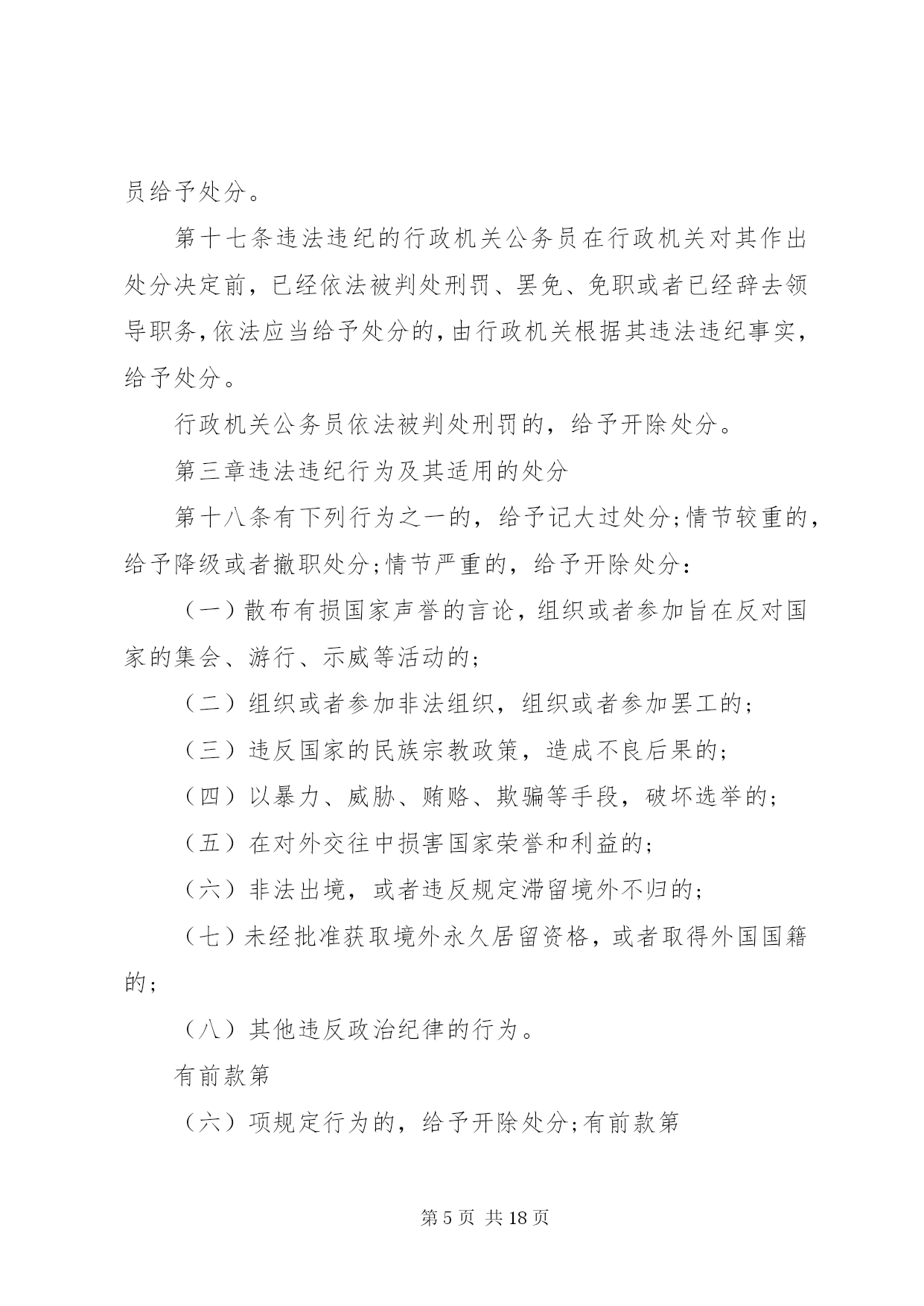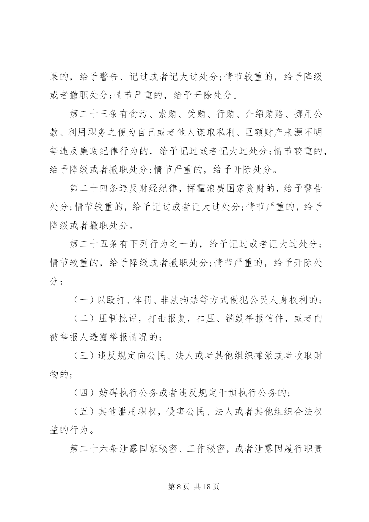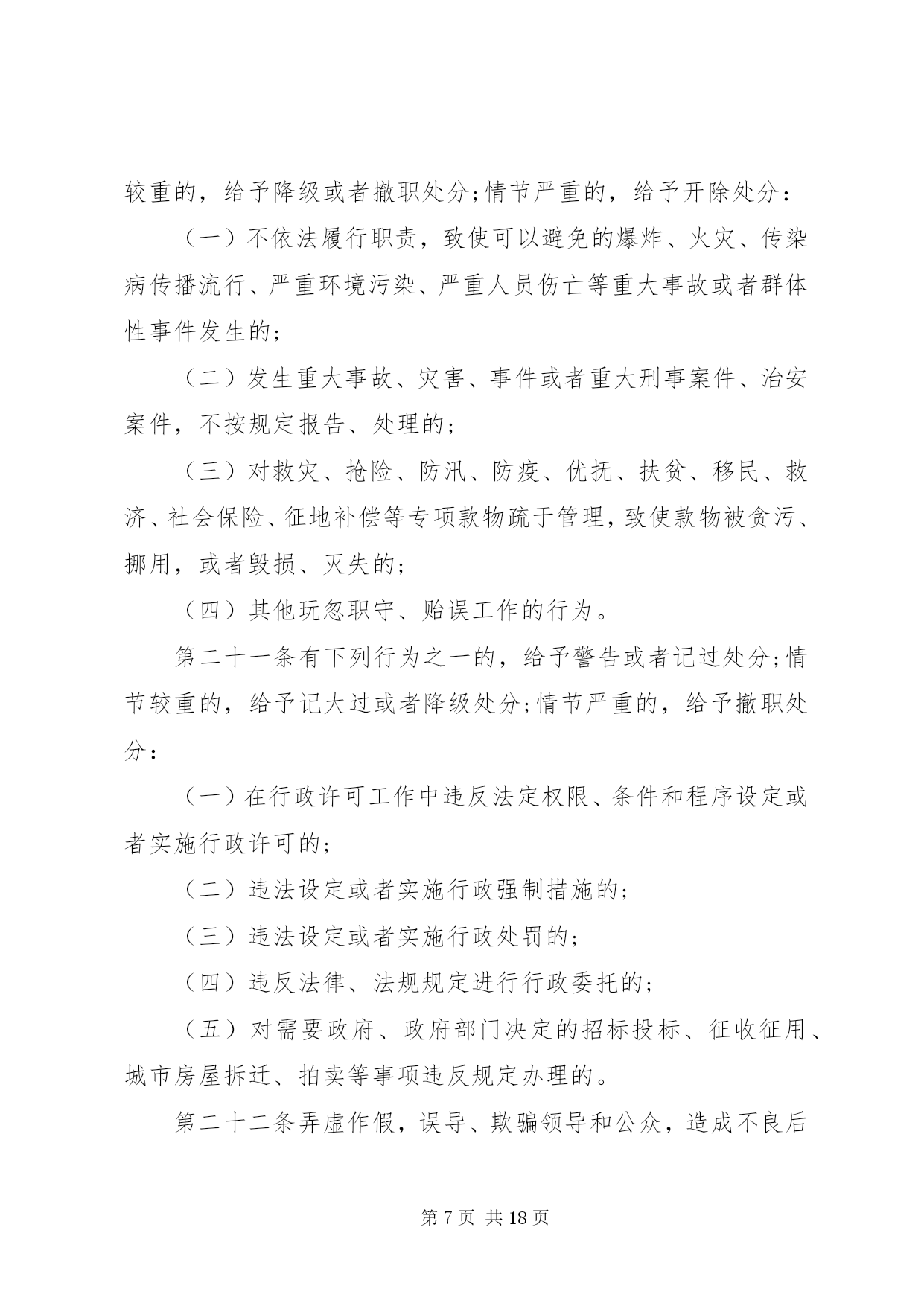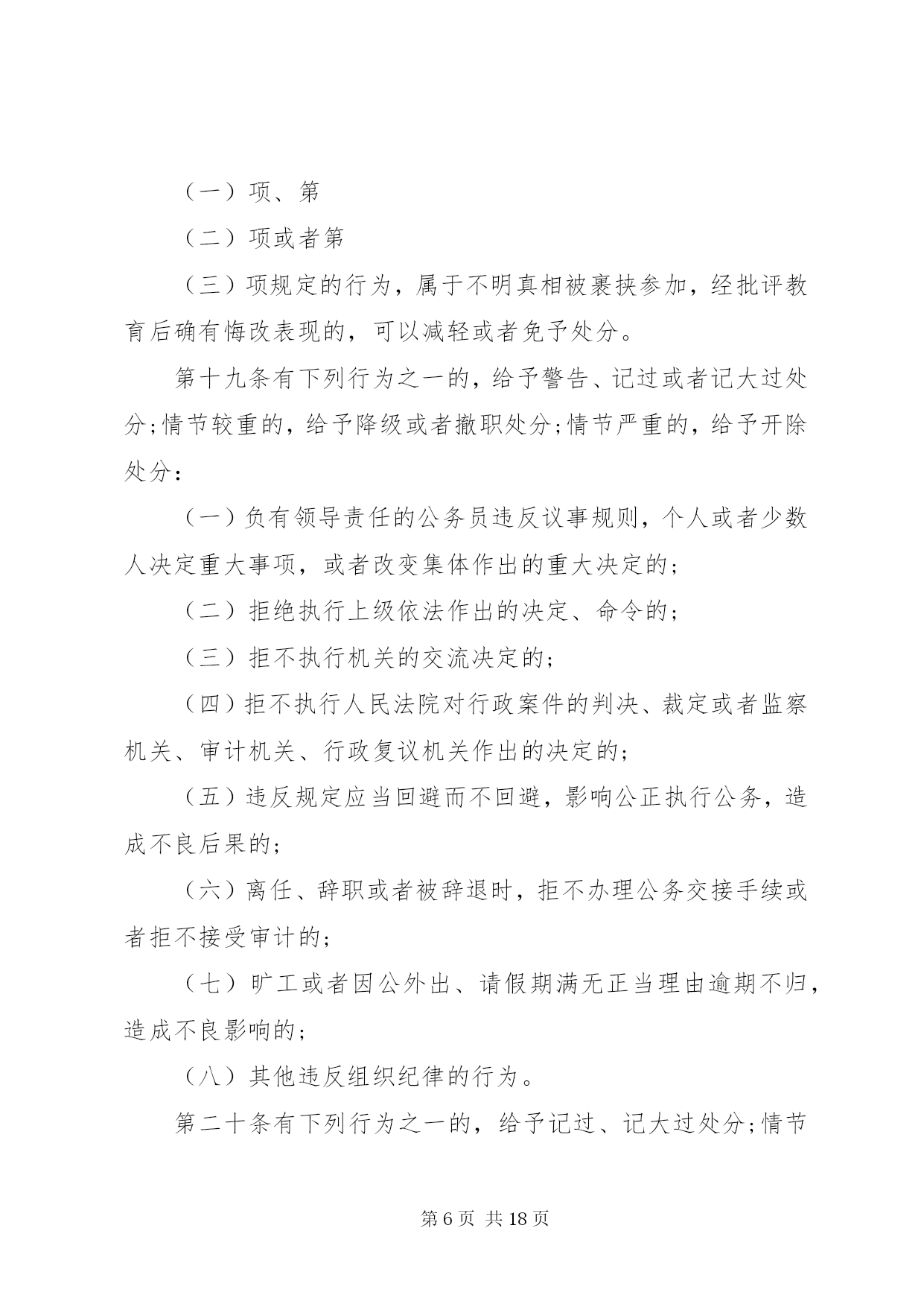第PAGE\*Arabic\*MERGEFORMAT18页共NUMPAGES\*MERGEFORMAT18页甘肃公务员处分条例甘肃公务员处分条例最新版第一章总则第一条为了严肃行政机关纪律,规范行政机关公务员的行为,保证行政机关及其公务员依法履行职责,根据《中华人民共和国公务员法》和《中华人民共和国行政监察法》,制定本条例。第二条行政机关公务员违反法律、法规、规章以及行政机关的决定和命令,应当承担纪律责任的,依照本条例给予处分。法律、其他行政法规、国务院决定对行政机关公务员处分有规定的,依照该法律、行政法规、国务院决定的规定执行;法律、其他行政法规、国务院决定对行政机关公务员应当受到处分的违法违纪行为做了规定,但是未对处分幅度做规定的,适用本条例第三章与其最相类似的条款有关处分幅度的规定。地方性法规、部门规章、地方政府规章可以补充规定本条例第三章未作规定的应当给予处分的违法违纪行为以及相应的处分幅度。除国务院监察机关、国务院人事部门外,国务院其他部门制定处分规章,应当与国务院监察机关、国务院人事部门联合制定。除法律、法规、规章以及国务院决定外,行政机关不得以其他形式设定行政机关公务员处分事项。第三条行政机关公务员依法履行职务的行为受法律保护,非因法定事由,非经法定程序,不受处分。第四条给予行政机关公务员处分,应当坚持公正、公平和教育与惩处相结合的原则。给予行政机关公务员处分,应当与其违法违纪行为的性质、情节、危害程度相适应。给予行政机关公务员处分,应当事实清楚、证据确凿、定性准确、处理恰当、程序合法、手续完备。第五条行政机关公务员违法违纪涉嫌犯罪的,应当移送司法机关依法追究刑事责任。第二章处分的种类和适用第六条行政机关公务员处分的种类为:(一)警告;(二)记过;(三)记大过;(四)降级;(五)撤职;(六)开除。第七条行政机关公务员受处分的期间为:(一)警告,6个月;(二)记过,12个月;(三)记大过,18个月;(四)降级、撤职,24个月。第八条行政机关公务员在受处分期间不得晋升职务和级别,其中,受记过、记大过、降级、撤职处分的,不得晋升工资档次;受撤职处分的,应当按照规定降低级别。第九条行政机关公务员受开除处分的,自处分决定生效之日起,解除其与单位的人事关系,不得再担任公务员职务。行政机关公务员受开除以外的处分,在受处分期间有悔改表现,并且没有再发生违法违纪行为的,处分期满后,应当解除处分。解除处分后,晋升工资档次、级别和职务不再受原处分的影响。但是,解除降级、撤职处分的,不视为恢复原级别、原职务。第十条行政机关公务员同时有两种以上需要给予处分的行为的,应当分别确定其处分。应当给予的处分种类不同的,执行其中最重的处分;应当给予撤职以下多个相同种类处分的,执行该处分,并在一个处分期以上、多个处分期之和以下,决定处分期。行政机关公务员在受处分期间受到新的处分的,其处分期为原处分期尚未执行的期限与新处分期限之和。处分期最长不得超过48个月。第十一条行政机关公务员2人以上共同违法违纪,需要给予处分的,根据各自应当承担的纪律责任,分别给予处分。第十二条有下列情形之一的,应当从重处分:(一)在2人以上的共同违法违纪行为中起主要作用的;(二)隐匿、伪造、销毁证据的;(三)串供或者阻止他人揭发检举、提供证据材料的;(四)包庇同案人员的;(五)法律、法规、规章规定的其他从重情节。第十三条有下列情形之一的,应当从轻处分:(一)主动交代违法违纪行为的;(二)主动采取措施,有效避免或者挽回损失的;(三)检举他人重大违法违纪行为,情况属实的。第十四条行政机关公务员主动交代违法违纪行为,并主动采取措施有效避免或者挽回损失的,应当减轻处分。行政机关公务员违纪行为情节轻微,经过批评教育后改正的,可以免予处分。第十五条行政机关公务员有本条例第十二条、第十三条规定情形之一的,应当在本条例第三章规定的处分幅度以内从重或者从轻给予处分。行政机关公务员有本条例第十四条第一款规定情形的,应当在本条例第三章规定的处分幅度以外,减轻一个处分的档次给予处分。应当给予警告处分,又有减轻处分的情形的,免予处分。第十六条行政机关经人民法院、监察机关、行政复议机关或者上级行政机关依法认定有行政违法行为或者其他违法违纪行为,需要追究纪律责任的,对负有责任的领导人员和直接责任人员给予处分。第十七条违法违纪的行政机关公务员在行政机关对其作出处分决定前,已经依法被判处刑罚、罢免、免职或者已经辞去领导职务,依法应当给予处分的,由行政机关根据其违法违纪事实,给予处分。行政机关公务员依法被判处刑罚的,给予开除处分。第三章违法违纪行为及其适用的处分第十八条有下列行为之一的,给予记大过处分;情节较重的,给予降级或者撤职处分;情节严重的,给予开除处分:(一)散布有损国家声誉的言论
