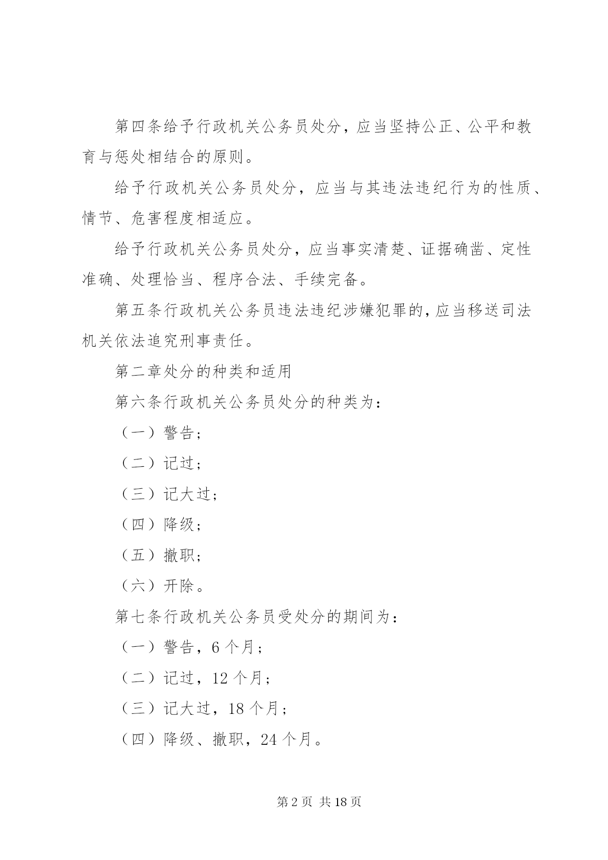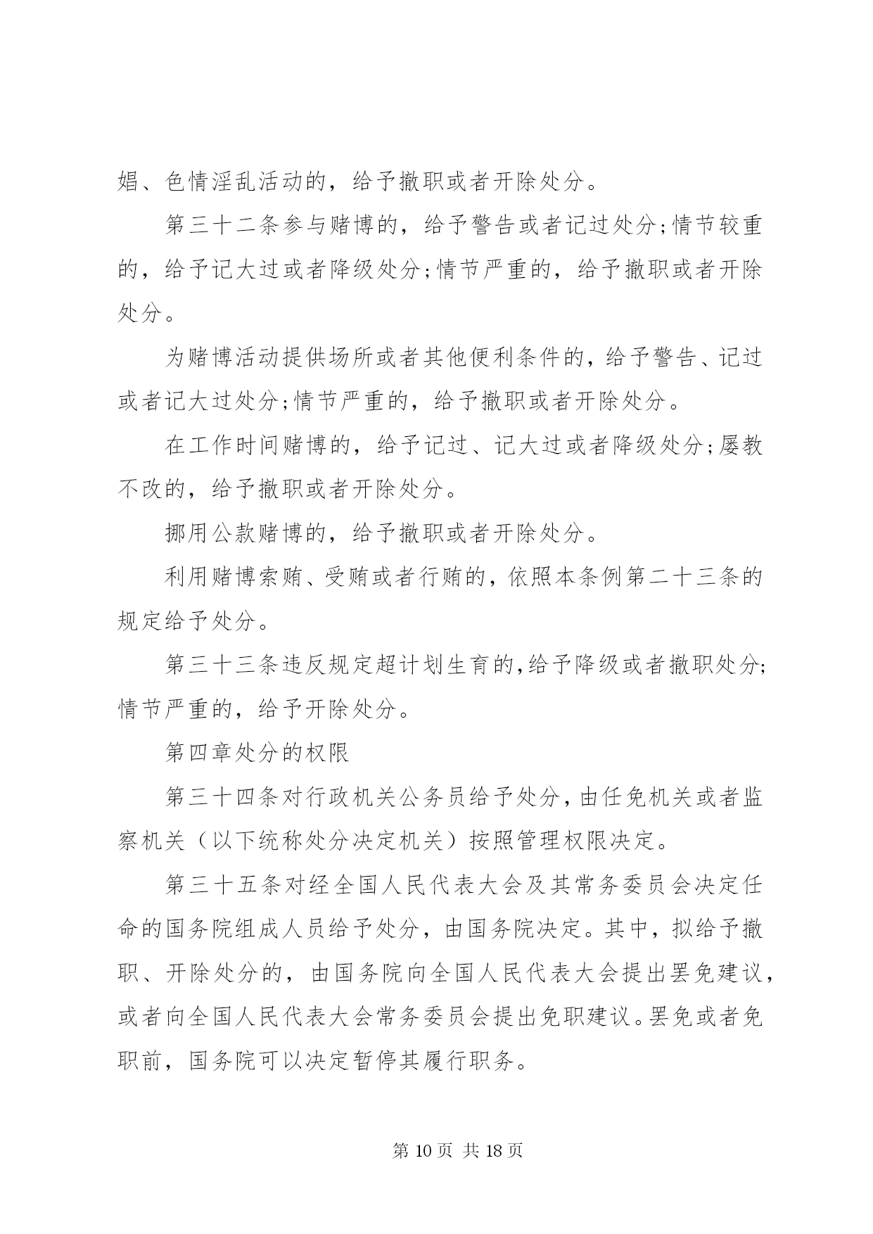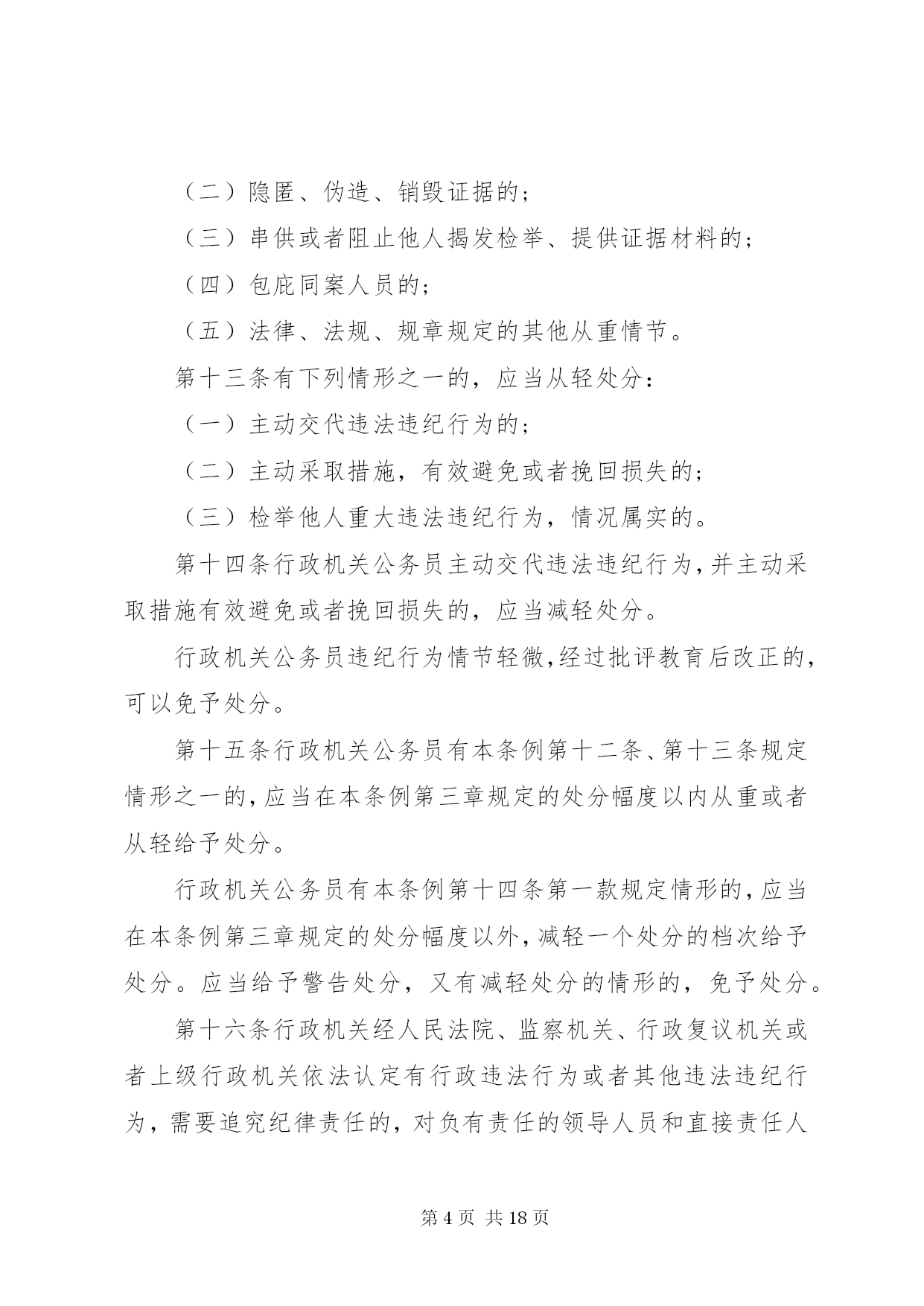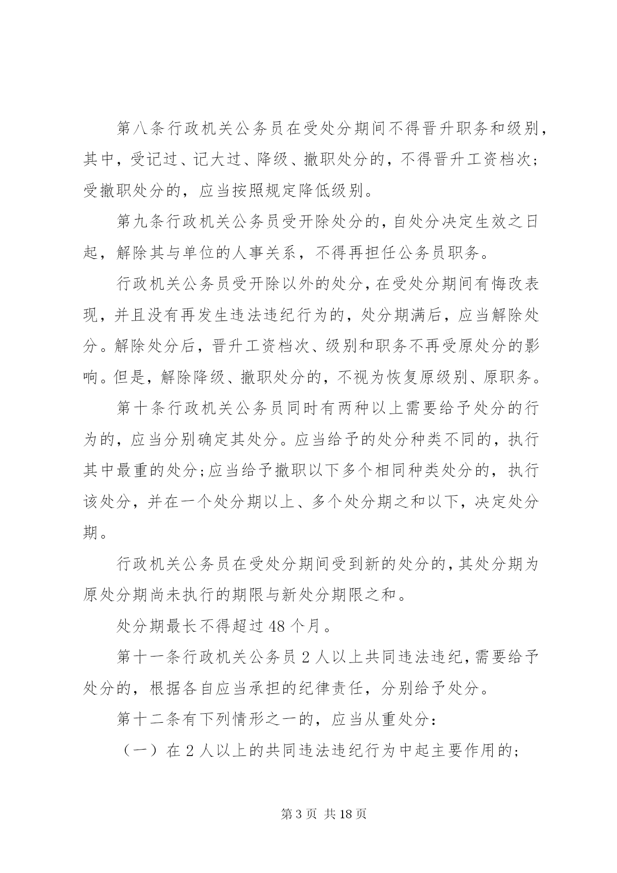 第PAGE\*Arabic\*MERGEFORMAT18页共NUMPAGES\*MERGEFORMAT18页甘肃公务员处分条例甘肃公务员处分条例最新版第一章总则第一条为了严肃行政机关纪律,规范行政机关公务员的行为,保证行政机关及其公务员依法履行职责,根据《中华人民共和国公务员法》和《中华人民共和国行政监察法》,制定本条例。第二条行政机关公务员违反法律、法规、规章以及行政机关的决定和命令,应当承担纪律责任的,依照本条例给予处分。法律、其他行政法规、国务院决定对行政机关公务员处分有规定的,依照该法律、行政法规、国务院决定的规定执行;法律、其他行政法规、国务院决定对行政机关公务员应当受到处分的违法违纪行为做了规定,但是未对处分幅度做规定的,适用本条例第三章与其最相类似的条款有关处分幅度的规定。地方性法规、部门规章、地方政府规章可以补充规定本条例第三章未作规定的应当给予处分的违法违纪行为以及相应的处分幅度。除国务院监察机关、国务院人事部门外,国务院其他部门制定处分规章,应当与国务院监察机关、国务院人事部门联合制定。除法律、法规、规章以及国务院决定外,行政机关不得以其他形式设定行政机关公务员处分事项。第三条行政机关公务员依法履行职务的行为受法律保护,非因法定事由,非经法定程序,不受处分。第四条给予行政机关公务员处分,应当坚持公正、公平和教育与惩处相结合的原则。给予行政机关公务员处分,应当与其违法违纪行为的性质、情节、危害程度相适应。给予行政机关公务员处分,应当事实清楚、证据确凿、定性准确、处理恰当、程序合法、手续完备。第五条行政机关公务员违法违纪涉嫌犯罪的,应当移送司法机关依法追究刑事责任。第二章处分的种类和适用第六条行政机关公务员处分的种类为:(一)警告;(二)记过;(三)记大过;(四)降级;(五)撤职;(六)开除。第七条行政机关公务员受处分的期间为:(一)警告,6个月;(二)记过,12个月;(三)记大过,18个月;(四)降级、撤职,24个月。第八条行政机关公务员在受处分期间不得晋升职务和级别,其中,受记过、记大过、降级、撤职处分的,不得晋升工资档次;受撤职处分的,应当按照规定降低级别。第九条行政机关公务员受开除处分的,自处分决定生效之日起,解除其与单位的人事关系,不得再担任公务员职务。行政机关公务员受开除以外的处分,在受处分期间有悔改表现,并且没有再发生违法违纪行为的,处分期满后,应当解除处分。解除处分后,晋升工资档次、级别和职务不再受原处分的影响。但是,解除降级、撤职处分的,不视为恢复原级别、原职务。第十条行政机关公务员同时有两种以上需要给予处分的行为的,应当分别确定其处分。应当给予的处分种类不同的,执行其中最重的处分;应当给予撤职以下多个相同种类处分的,执行该处分,并在一个处分期以上、多个处分期之和以下,决定处分期。行政机关公务员在受处分期间受到新的处分的,其处分期为原处分期尚未执行的期限与新处分期限之和。处分期最长不得超过48个月。第十一条行政机关公务员2人以上共同违法违纪,需要给予处分的,根据各自应当承担的纪律责任,分别给予处分。第十二条有下列情形之一的,应当从重处分:(一)在2人以上的共同违法违纪行为中起主要作用的;(二)隐匿、伪造、销毁证据的;(三)串供或者阻止他人揭发检举、提供证据材料的;(四)包庇同案人员的;(五)法律、法规、规章规定的其他从重情节。第十三条有下列情形之一的,应当从轻处分:(一)主动交代违法违纪行为的;(二)主动采取措施,有效避免或者挽回损失的;(三)检举他人重大违法违纪行为,情况属实的。第十四条行政机关公务员主动交代违法违纪行为,并主动采取措施有效避免或者挽回损失的,应当减轻处分。行政机关公务员违纪行为情节轻微,经过批评教育后改正的,可以免予处分。第十五条行政机关公务员有本条例第十二条、第十三条规定情形之一的,应当在本条例第三章规定的处分幅度以内从重或者从轻给予处分。行政机关公务员有本条例第十四条第一款规定情形的,应当在本条例第三章规定的处分幅度以外,减轻一个处分的档次给予处分。应当给予警告处分,又有减轻处分的情形的,免予处分。第十六条行政机关经人民法院、监察机关、行政复议机关或者上级行政机关依法认定有行政违法行为或者其他违法违纪行为,需要追究纪律责任的,对负有责任的领导人员和直接责任人员给予处分。第十七条违法违纪的行政机关公务员在行政机关对其作出处分决定前,已经依法被判处刑罚、罢免、免职或者已经辞去领导职务,依法应当给予处分的,由行政机关根据其违法违纪事实,给予处分。行政机关公务员依法被判处刑罚的,给予开除处分。第三章违法违纪行为及其适用的处分第十八条有下列行为之一的,给予记大过处分;情节较重的,给予降级或者撤职处分;情节严重的,给予开除处分:(一)散布有损国家声誉的言论