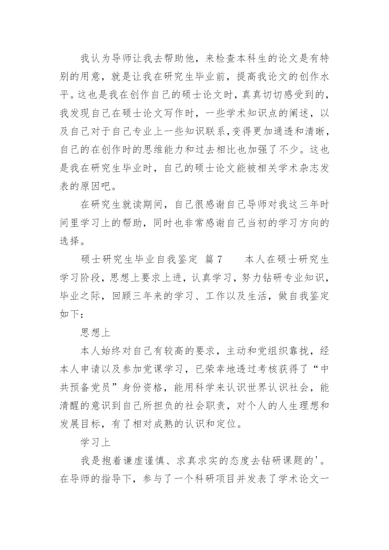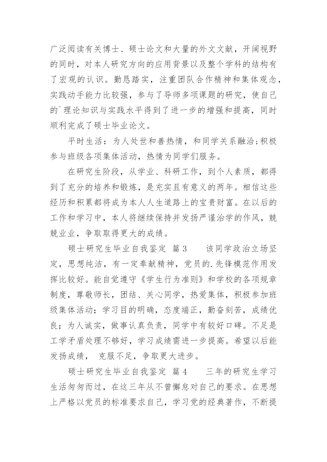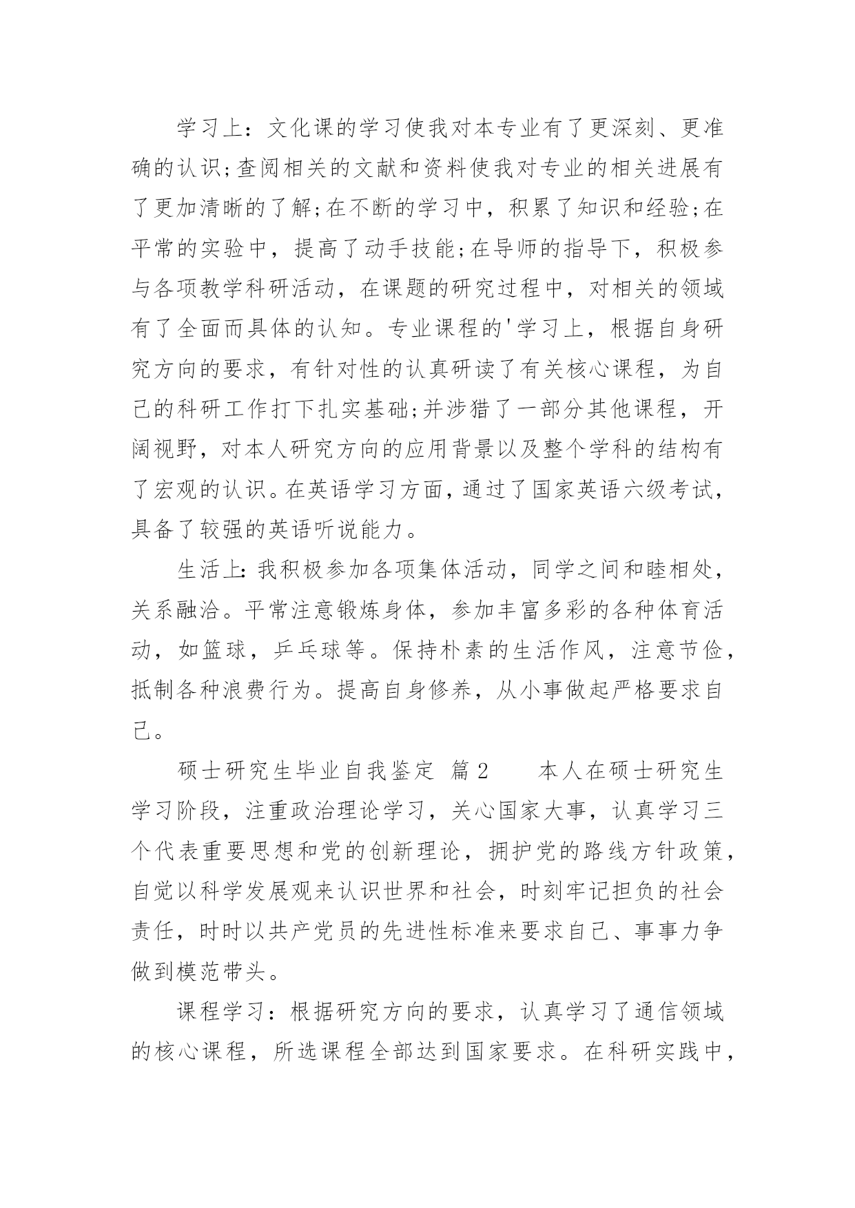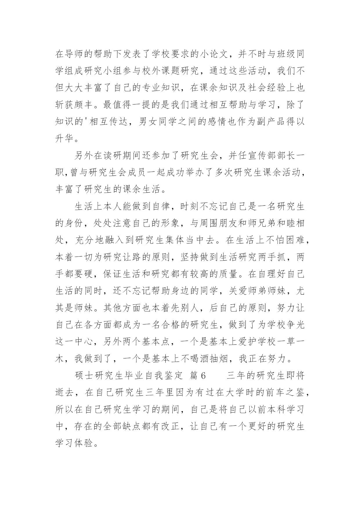 硕士研究生毕业自我鉴定硕士研究生毕业自我鉴定范文(精选13篇)正常来讲,自我鉴定即为自我总结,它可以帮助我们有寻找学习和工作中的规律,我想我们需要写一份自我鉴定了吧。我们该怎么写自我鉴定呢?以下是小编收集整理的硕士研究生毕业自我鉴定范文,仅供参考,大家一起来看看吧。硕士研究生毕业自我鉴定篇1在硕士研究生期间,无论是在思想上、个人素质上还是在学业上我都有了长足的进步,是充实且有意义的三年。我相信在这三年当中所得到的培养和锻炼将是我人生当中的一笔不可多的财富。在今后的工作当中我将继续保持并发扬这些优点,以取得更大的成绩。思想上:我一直积极要求进步。我是在xx年5月光荣地成为了一名预备党员,在进入华南农业大学后,通过本党支部同志的影响,带动,帮助,思想上有了更大的进步,并加深了我对建设有中国特色的社会主义理论和党的基本路线深刻的认识,进一步的树立了坚定的共产主义信念。经过党组织1年预备期的考察,于xx年年5月如期转为正式党员。在成为一名党员后我时刻牢记自己是一名党员,处处以身作则,以一名合格党员的要求严格规范自己的言行举止。在这次汶川大地震后能积极捐款,自愿缴纳特殊党费,贡献出自己的一份绵薄之力。学习上:文化课的学习使我对本专业有了更深刻、更准确的认识;查阅相关的文献和资料使我对专业的相关进展有了更加清晰的了解;在不断的学习中,积累了知识和经验;在平常的实验中,提高了动手技能;在导师的指导下,积极参与各项教学科研活动,在课题的研究过程中,对相关的领域有了全面而具体的认知。专业课程的'学习上,根据自身研究方向的要求,有针对性的认真研读了有关核心课程,为自己的科研工作打下扎实基础;并涉猎了一部分其他课程,开阔视野,对本人研究方向的应用背景以及整个学科的结构有了宏观的认识。在英语学习方面,通过了国家英语六级考试,具备了较强的英语听说能力。生活上:我积极参加各项集体活动,同学之间和睦相处,关系融洽。平常注意锻炼身体,参加丰富多彩的各种体育活动,如篮球,乒乓球等。保持朴素的生活作风,注意节俭,抵制各种浪费行为。提高自身修养,从小事做起严格要求自己。硕士研究生毕业自我鉴定篇2本人在硕士研究生学习阶段,注重政治理论学习,关心国家大事,认真学习三个代表重要思想和党的创新理论,拥护党的路线方针政策,自觉以科学发展观来认识世界和社会,时刻牢记担负的社会责任,时时以共产党员的先进性标准来要求自己、事事力争做到模范带头。课程学习:根据研究方向的要求,认真学习了通信领域的核心课程,所选课程全部达到国家要求。在科研实践中,广泛阅读有关博士、硕士论文和大量的外文文献,开阔视野的同时,对本人研究方向的应用背景以及整个学科的结构有了宏观的认识。勤恳踏实,注重团队合作精神和集体观念,实践动手能力比较强,参与了导师多项课题的研究,使自己的`理论知识与实践水平得到了进一步的增强和提高,同时顺利完成了硕士毕业论文。平时生活:为人处世和善热情,和同学关系融洽;积极参与班级各项集体活动,热情为同学们服务。在研究生阶段,从学业、科研工作,到个人素质,都得到了充分的培养和锻炼,是充实且有意义的两年。相信这些经历和积累都将成为本人人生道路上的宝贵财富。在以后的工作和学习中,本人将继续保持并发扬严谨治学的作风,兢兢业业,争取取得更大的成绩。硕士研究生毕业自我鉴定篇3该同学政治立场坚定,思想纯洁,有一定奉献精神,党员的.先锋模范作用发挥比较好。能自觉遵守《学生行为准则》和学校的各项规章制度,尊敬师长,团结、关心同学,热爱集体,积极参加班级集体活动;学习目的明确,态度端正,勤奋刻苦,成绩优良;为人诚实,做事认真负责,同学中有较好口碑。不足是工学矛盾处理不够好,学习成绩需进一步提高。希望以后能发扬成绩,克服不足,争取更大进步。硕士研究生毕业自我鉴定篇4三年的研究生学习生活匆匆而过,在这三年从不曾懈怠对自己的要求。在思想上严格以党员的标准要求自己,学习党的经典著作,不断提高自己的理论水平。作为其他同学的入党培养人,多次与培养对象交流、探讨,帮助他们提高思想认识。在科研上,一方面认真学习专业基础课程,掌握专业基本理论,夯实专业基础,拓宽知识领域,为自己的科研工作打下扎实基础;另一方面根据自己研究方向,有针对性的进行学习和研究,探寻本专业的学科前沿领域,学术论文。除此之外还广泛涉猎了各方面知识,开阔视野。在英语学习方面,通过了大学英语六级考试,具备了较强的英语听说能力。在教学实践的过程中,认真备课,查阅学术资料,在授课过程中提高了自己的理论水平和实践能力。在日常生活中,积极参见班集体的各项活动,尊敬师长,团结同学,热情为同学服务,同学关系融洽,受到大家的一致好评。研究生三年的学习收获颇丰,从学业、科研工作,到个人素质,都得到了充分的培养和锻炼,这些经历和积累都将成为我人生道路上的宝贵财富。激励