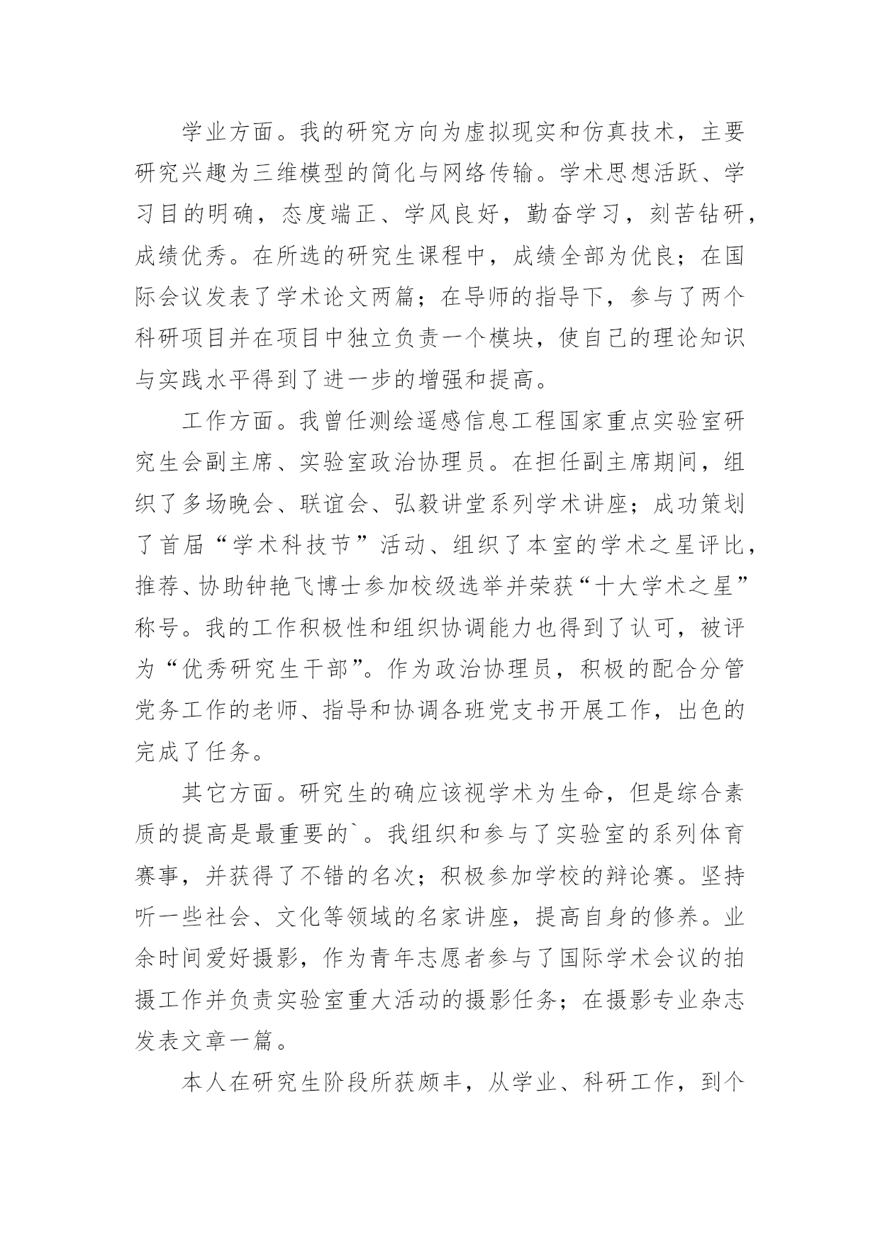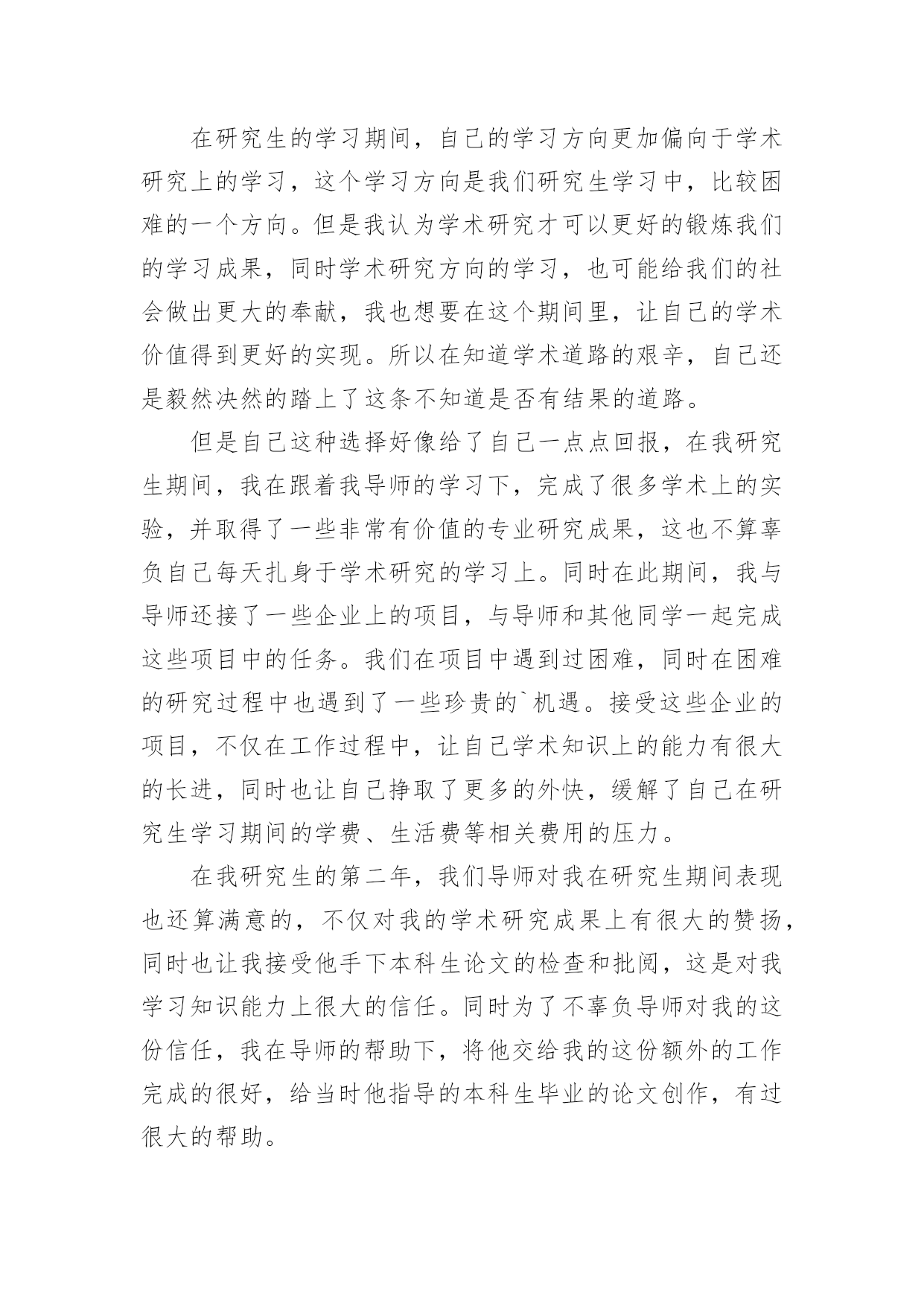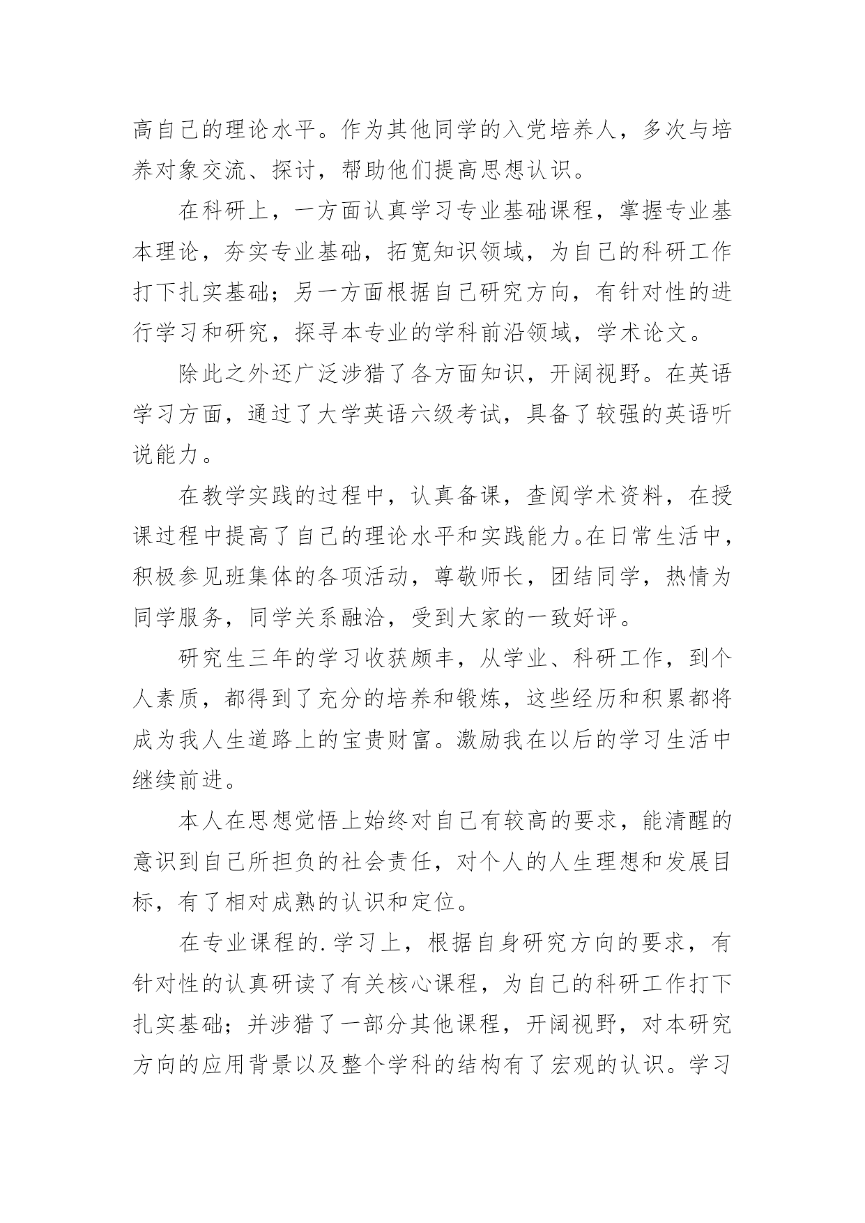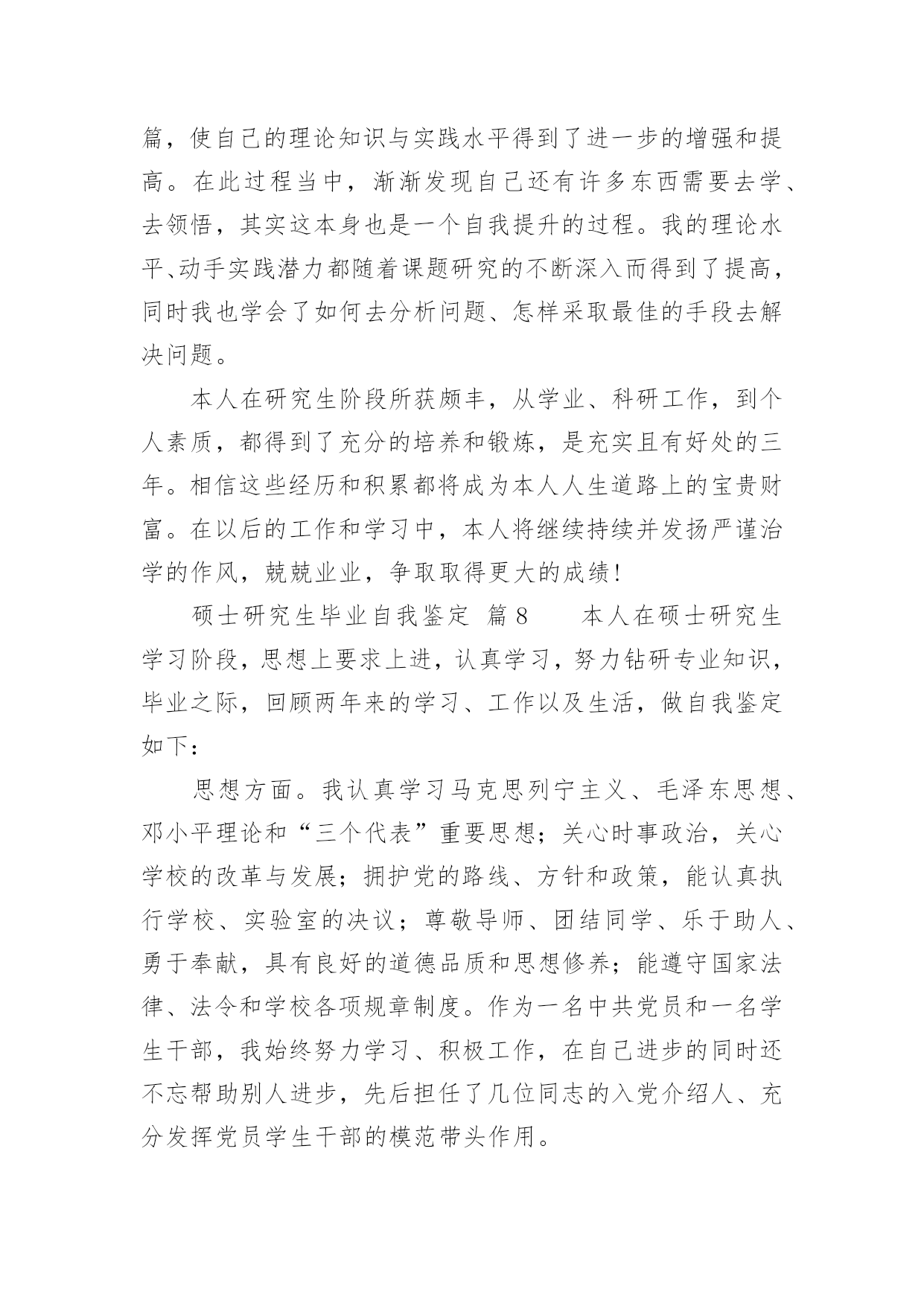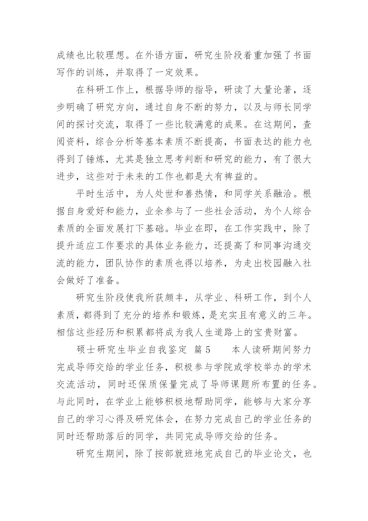 硕士研究生毕业自我鉴定硕士研究生毕业自我鉴定范文(精选13篇)正常来讲,自我鉴定即为自我总结,它可以帮助我们有寻找学习和工作中的规律,我想我们需要写一份自我鉴定了吧。我们该怎么写自我鉴定呢?以下是小编收集整理的硕士研究生毕业自我鉴定范文,仅供参考,大家一起来看看吧。硕士研究生毕业自我鉴定篇1在硕士研究生期间,无论是在思想上、个人素质上还是在学业上我都有了长足的进步,是充实且有意义的三年。我相信在这三年当中所得到的培养和锻炼将是我人生当中的一笔不可多的财富。在今后的工作当中我将继续保持并发扬这些优点,以取得更大的成绩。思想上:我一直积极要求进步。我是在xx年5月光荣地成为了一名预备党员,在进入华南农业大学后,通过本党支部同志的影响,带动,帮助,思想上有了更大的进步,并加深了我对建设有中国特色的社会主义理论和党的基本路线深刻的认识,进一步的树立了坚定的共产主义信念。经过党组织1年预备期的考察,于xx年年5月如期转为正式党员。在成为一名党员后我时刻牢记自己是一名党员,处处以身作则,以一名合格党员的要求严格规范自己的言行举止。在这次汶川大地震后能积极捐款,自愿缴纳特殊党费,贡献出自己的一份绵薄之力。学习上:文化课的学习使我对本专业有了更深刻、更准确的认识;查阅相关的文献和资料使我对专业的相关进展有了更加清晰的了解;在不断的学习中,积累了知识和经验;在平常的实验中,提高了动手技能;在导师的指导下,积极参与各项教学科研活动,在课题的研究过程中,对相关的领域有了全面而具体的认知。专业课程的'学习上,根据自身研究方向的要求,有针对性的认真研读了有关核心课程,为自己的科研工作打下扎实基础;并涉猎了一部分其他课程,开阔视野,对本人研究方向的应用背景以及整个学科的结构有了宏观的认识。在英语学习方面,通过了国家英语六级考试,具备了较强的英语听说能力。生活上:我积极参加各项集体活动,同学之间和睦相处,关系融洽。平常注意锻炼身体,参加丰富多彩的各种体育活动,如篮球,乒乓球等。保持朴素的生活作风,注意节俭,抵制各种浪费行为。提高自身修养,从小事做起严格要求自己。硕士研究生毕业自我鉴定篇2本人在硕士研究生学习阶段,注重政治理论学习,关心国家大事,认真学习三个代表重要思想和党的创新理论,拥护党的路线方针政策,自觉以科学发展观来认识世界和社会,时刻牢记担负的社会责任,时时以共产党员的先进性标准来要求自己、事事力争做到模范带头。课程学习:根据研究方向的要求,认真学习了通信领域的核心课程,所选课程全部达到国家要求。在科研实践中,广泛阅读有关博士、硕士论文和大量的外文文献,开阔视野的同时,对本人研究方向的应用背景以及整个学科的结构有了宏观的认识。勤恳踏实,注重团队合作精神和集体观念,实践动手能力比较强,参与了导师多项课题的研究,使自己的`理论知识与实践水平得到了进一步的增强和提高,同时顺利完成了硕士毕业论文。平时生活:为人处世和善热情,和同学关系融洽;积极参与班级各项集体活动,热情为同学们服务。在研究生阶段,从学业、科研工作,到个人素质,都得到了充分的培养和锻炼,是充实且有意义的两年。相信这些经历和积累都将成为本人人生道路上的宝贵财富。在以后的工作和学习中,本人将继续保持并发扬严谨治学的作风,兢兢业业,争取取得更大的成绩。硕士研究生毕业自我鉴定篇3该同学政治立场坚定,思想纯洁,有一定奉献精神,党员的.先锋模范作用发挥比较好。能自觉遵守《学生行为准则》和学校的各项规章制度,尊敬师长,团结、关心同学,热爱集体,积极参加班级集体活动;学习目的明确,态度端正,勤奋刻苦,成绩优良;为人诚实,做事认真负责,同学中有较好口碑。不足是工学矛盾处理不够好,学习成绩需进一步提高。希望以后能发扬成绩,克服不足,争取更大进步。硕士研究生毕业自我鉴定篇4三年的研究生学习生活匆匆而过,在这三年从不曾懈怠对自己的要求。在思想上严格以党员的标准要求自己,学习党的经典著作,不断提高自己的理论水平。作为其他同学的入党培养人,多次与培养对象交流、探讨,帮助他们提高思想认识。在科研上,一方面认真学习专业基础课程,掌握专业基本理论,夯实专业基础,拓宽知识领域,为自己的科研工作打下扎实基础;另一方面根据自己研究方向,有针对性的进行学习和研究,探寻本专业的学科前沿领域,学术论文。除此之外还广泛涉猎了各方面知识,开阔视野。在英语学习方面,通过了大学英语六级考试,具备了较强的英语听说能力。在教学实践的过程中,认真备课,查阅学术资料,在授课过程中提高了自己的理论水平和实践能力。在日常生活中,积极参见班集体的各项活动,尊敬师长,团结同学,热情为同学服务,同学关系融洽,受到大家的一致好评。研究生三年的学习收获颇丰,从学业、科研工作,到个人素质,都得到了充分的培养和锻炼,这些经历和积累都将成为我人生道路上的宝贵财富。激励