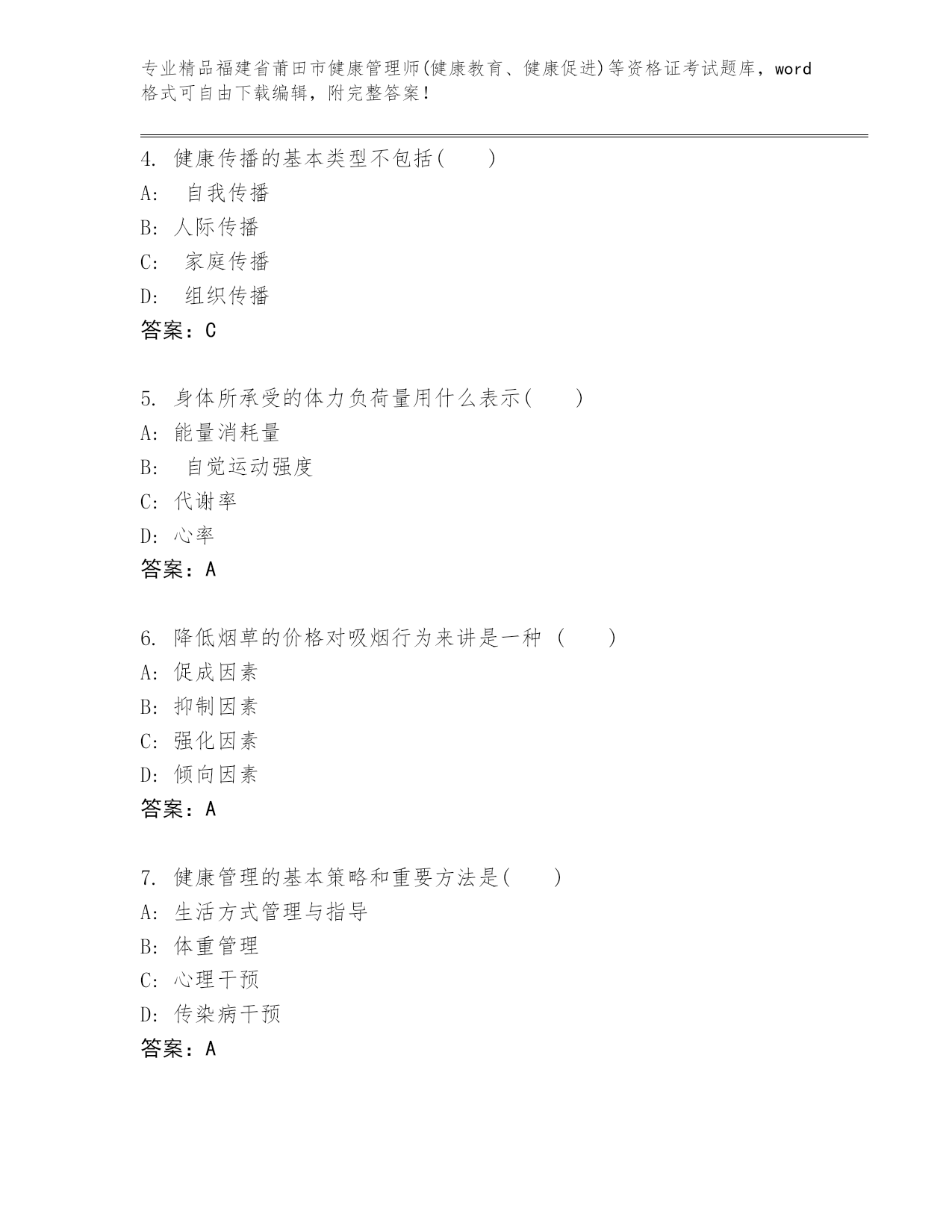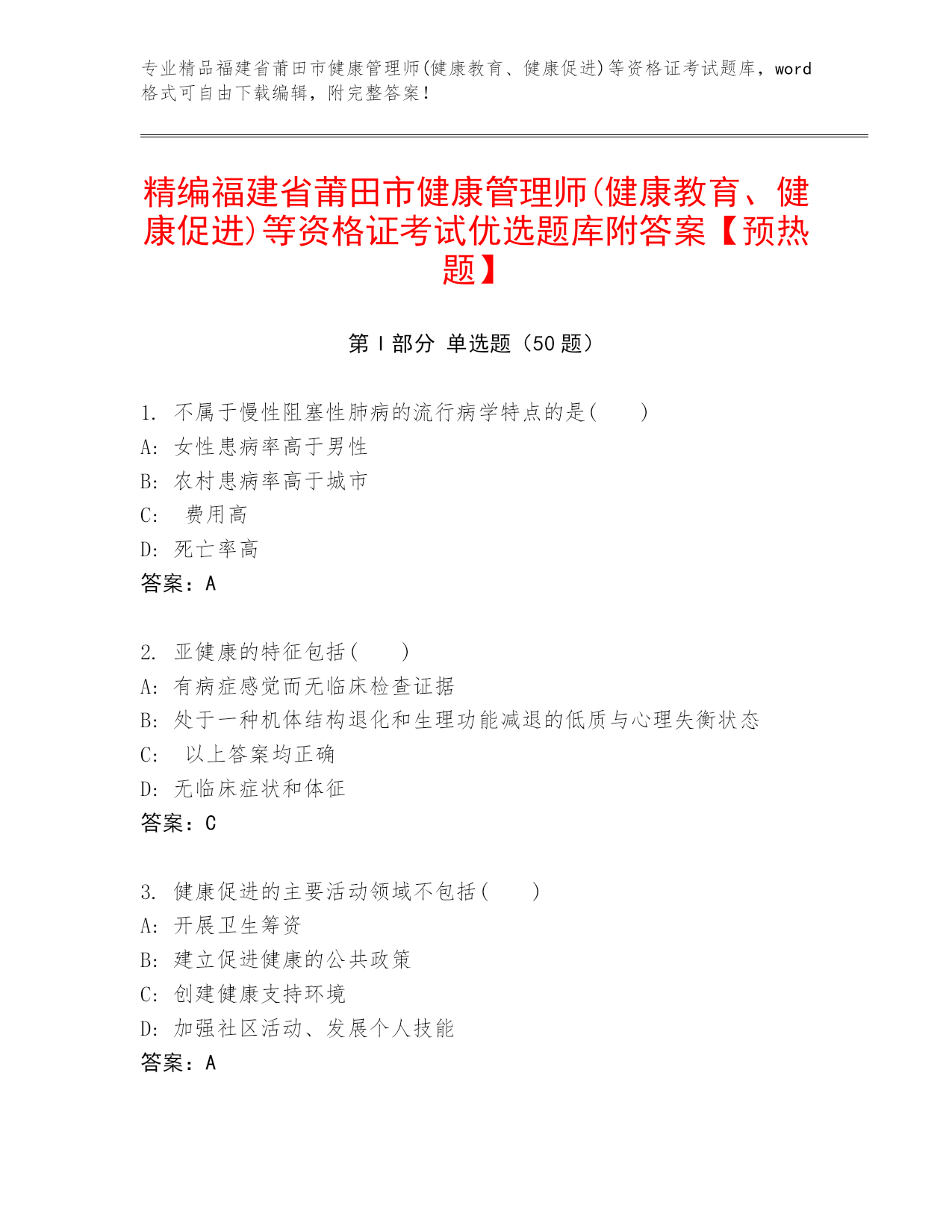 精编福建省莆田市健康管理师(健康教育、健康促进)等资格证考试优选题库附答案【预热题】.docx