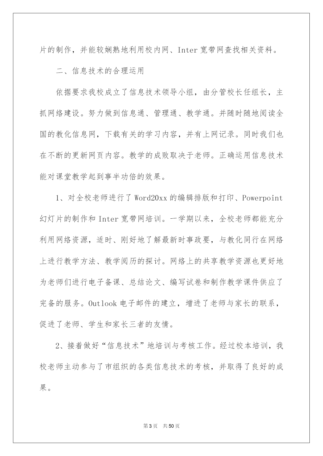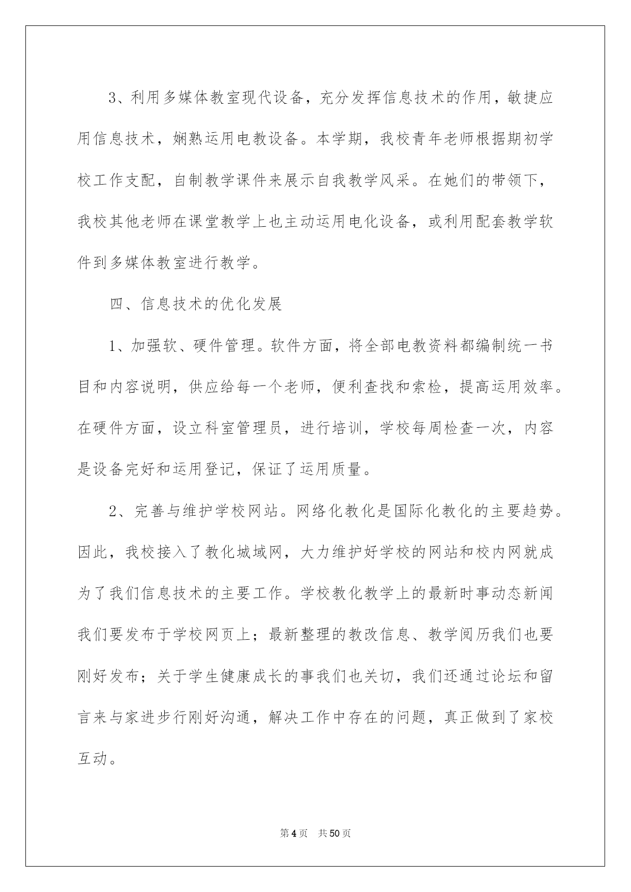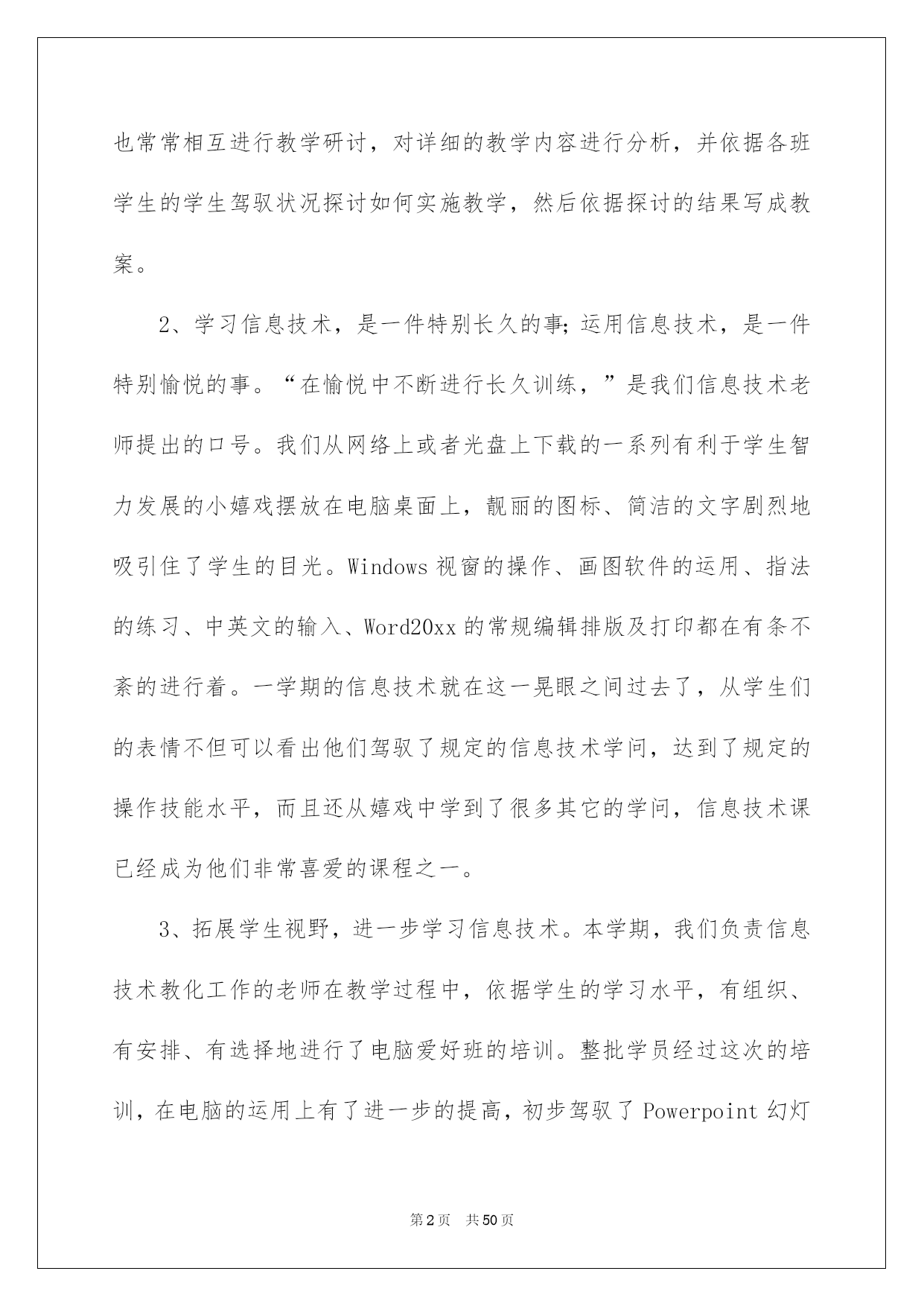 第PAGE\*Arabic\*MERGEFORMAT50页共NUMPAGES\*Arabic\*MERGEFORMAT50页第PAGE\*MERGEFORMAT50页共NUMPAGES\*MERGEFORMAT50页第PAGE\*MERGEFORMAT50页共NUMPAGES\*MERGEFORMAT50页第PAGE\*MERGEFORMAT50页共NUMPAGES\*MERGEFORMAT50页第PAGE\*MERGEFORMAT50页共NUMPAGES\*MERGEFORMAT50页第PAGE\*MERGEFORMAT50页共NUMPAGES\*MERGEFORMAT50页第PAGE\*MERGEFORMAT50页共NUMPAGES\*MERGEFORMAT50页第PAGE\*MERGEFORMAT50页共NUMPAGES\*MERGEFORMAT50页第PAGE\*MERGEFORMAT50页共NUMPAGES\*MERGEFORMAT50页第PAGE\*MERGEFORMAT50页共NUMPAGES\*MERGEFORMAT50页第PAGE\*MERGEFORMAT50页共NUMPAGES\*MERGEFORMAT50页2022信息技术工作总结信息技术工作总结总结在一个时期、一个年度、一个阶段对学习和工作生活等状况加以回顾和分析的一种书面材料,它是增长才能的一种好方法,不如我们来制定一份总结吧。但是却发觉不知道该写些什么,下面是我帮大家整理的信息技术工作总结,仅供参考,希望能够帮助到大家。信息技术工作总结1本学期我校坚固树立“为教学服务,为老师服务,为学生服务”的思想,围绕立项建设这一中心工作,勤奋学习,努力工作,不断创新,力求在信息技术教化上有新的突破。以“校内信息化促进教化教学现代化”为指导思想,以提高教化教学质量为中心,不断提高老师信息技术教化的整体水平,进而提高我校教化教学质量和管理水平,提高师生的信息素养,全面推动我校教化信息化工作。一、结合计算机的硬件实际,开展好常规教学。1、开学初,我校依据本校计算机硬件实际,制定出的确可行的教学安排,并严格按教学安排进行上课。在教学过程中,信息技术老师也常常相互进行教学研讨,对详细的教学内容进行分析,并依据各班学生的学生驾驭状况探讨如何实施教学,然后依据探讨的结果写成教案。2、学习信息技术,是一件特别长久的事;运用信息技术,是一件特别愉悦的事。“在愉悦中不断进行长久训练,”是我们信息技术老师提出的口号。我们从网络上或者光盘上下载的一系列有利于学生智力发展的小嬉戏摆放在电脑桌面上,靓丽的图标、简洁的文字剧烈地吸引住了学生的目光。Windows视窗的操作、画图软件的运用、指法的练习、中英文的输入、Word20xx的常规编辑排版及打印都在有条不紊的进行着。一学期的信息技术就在这一晃眼之间过去了,从学生们的表情不但可以看出他们驾驭了规定的信息技术学问,达到了规定的操作技能水平,而且还从嬉戏中学到了很多其它的学问,信息技术课已经成为他们非常喜爱的课程之一。3、拓展学生视野,进一步学习信息技术。本学期,我们负责信息技术教化工作的老师在教学过程中,依据学生的学习水平,有组织、有安排、有选择地进行了电脑爱好班的培训。整批学员经过这次的培训,在电脑的运用上有了进一步的提高,初步驾驭了Powerpoint幻灯片的制作,并能较娴熟地利用校内网、Inter宽带网查找相关资料。二、信息技术的合理运用依据要求我校成立了信息技术领导小组,由分管校长任组长,主抓网络建设。努力做到信息通、管理通、教学通。并随时随地阅读全国的教化信息网,下载有关的学习内容,并有上网记录。同时我们也在不断的更新网页内容。教学的成败取决于老师。正确运用信息技术能对课堂教学起到事半功倍的效果。1、对全校老师进行了Word20xx的编辑排版和打印、Powerpoint幻灯片的制作和Inter宽带网培训。一学期以来,全校老师都能充分利用网络资源,适时、刚好地了解最新时事政要,与教化同行在网络上进行教学方法、教学阅历的探讨。网络上的共享教学资源也更好地为老师们进行电子备课、总结论文、编写试卷和制作教学课件供应了完备的服务。Outlook电子邮件的建立,增进了老师与家长的联系,促进了老师、学生和家长三者的友情。2、接着做好“信息技术”地培训与考核工作。经过校本培训,我校老师主动参与了市组织的各类信息技术的考核,并取得了良好的成果。3、利用多媒体教室现代设备,充分发挥信息技术的作用,敏捷应用信息技术,娴熟运用电教设备。本学期,我校青年老师根据期初学校工作支配,自制教学课件来展示自我