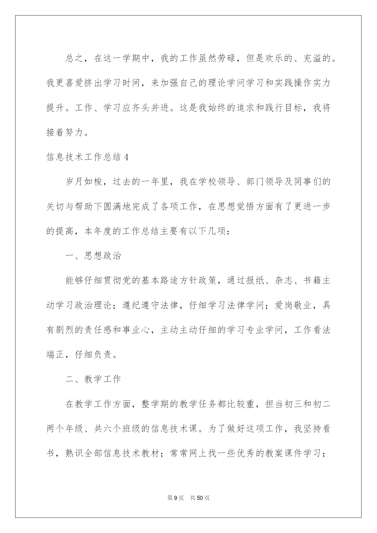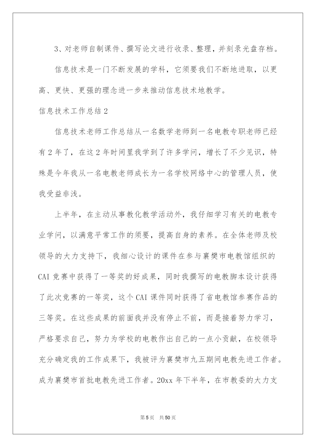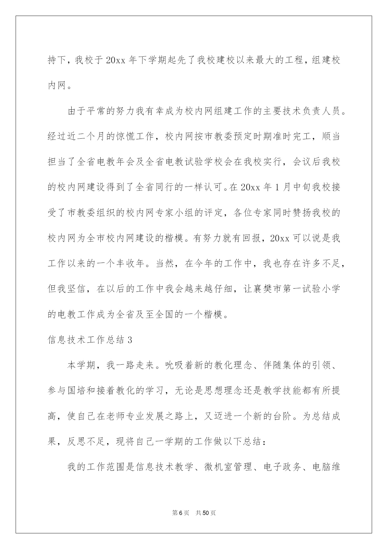 第PAGE\*Arabic\*MERGEFORMAT50页共NUMPAGES\*Arabic\*MERGEFORMAT50页第PAGE\*MERGEFORMAT50页共NUMPAGES\*MERGEFORMAT50页第PAGE\*MERGEFORMAT50页共NUMPAGES\*MERGEFORMAT50页第PAGE\*MERGEFORMAT50页共NUMPAGES\*MERGEFORMAT50页第PAGE\*MERGEFORMAT50页共NUMPAGES\*MERGEFORMAT50页第PAGE\*MERGEFORMAT50页共NUMPAGES\*MERGEFORMAT50页第PAGE\*MERGEFORMAT50页共NUMPAGES\*MERGEFORMAT50页第PAGE\*MERGEFORMAT50页共NUMPAGES\*MERGEFORMAT50页第PAGE\*MERGEFORMAT50页共NUMPAGES\*MERGEFORMAT50页第PAGE\*MERGEFORMAT50页共NUMPAGES\*MERGEFORMAT50页第PAGE\*MERGEFORMAT50页共NUMPAGES\*MERGEFORMAT50页2022信息技术工作总结信息技术工作总结总结在一个时期、一个年度、一个阶段对学习和工作生活等状况加以回顾和分析的一种书面材料,它是增长才能的一种好方法,不如我们来制定一份总结吧。但是却发觉不知道该写些什么,下面是我帮大家整理的信息技术工作总结,仅供参考,希望能够帮助到大家。信息技术工作总结1本学期我校坚固树立“为教学服务,为老师服务,为学生服务”的思想,围绕立项建设这一中心工作,勤奋学习,努力工作,不断创新,力求在信息技术教化上有新的突破。以“校内信息化促进教化教学现代化”为指导思想,以提高教化教学质量为中心,不断提高老师信息技术教化的整体水平,进而提高我校教化教学质量和管理水平,提高师生的信息素养,全面推动我校教化信息化工作。一、结合计算机的硬件实际,开展好常规教学。1、开学初,我校依据本校计算机硬件实际,制定出的确可行的教学安排,并严格按教学安排进行上课。在教学过程中,信息技术老师也常常相互进行教学研讨,对详细的教学内容进行分析,并依据各班学生的学生驾驭状况探讨如何实施教学,然后依据探讨的结果写成教案。2、学习信息技术,是一件特别长久的事;运用信息技术,是一件特别愉悦的事。“在愉悦中不断进行长久训练,”是我们信息技术老师提出的口号。我们从网络上或者光盘上下载的一系列有利于学生智力发展的小嬉戏摆放在电脑桌面上,靓丽的图标、简洁的文字剧烈地吸引住了学生的目光。Windows视窗的操作、画图软件的运用、指法的练习、中英文的输入、Word20xx的常规编辑排版及打印都在有条不紊的进行着。一学期的信息技术就在这一晃眼之间过去了,从学生们的表情不但可以看出他们驾驭了规定的信息技术学问,达到了规定的操作技能水平,而且还从嬉戏中学到了很多其它的学问,信息技术课已经成为他们非常喜爱的课程之一。3、拓展学生视野,进一步学习信息技术。本学期,我们负责信息技术教化工作的老师在教学过程中,依据学生的学习水平,有组织、有安排、有选择地进行了电脑爱好班的培训。整批学员经过这次的培训,在电脑的运用上有了进一步的提高,初步驾驭了Powerpoint幻灯片的制作,并能较娴熟地利用校内网、Inter宽带网查找相关资料。二、信息技术的合理运用依据要求我校成立了信息技术领导小组,由分管校长任组长,主抓网络建设。努力做到信息通、管理通、教学通。并随时随地阅读全国的教化信息网,下载有关的学习内容,并有上网记录。同时我们也在不断的更新网页内容。教学的成败取决于老师。正确运用信息技术能对课堂教学起到事半功倍的效果。1、对全校老师进行了Word20xx的编辑排版和打印、Powerpoint幻灯片的制作和Inter宽带网培训。一学期以来,全校老师都能充分利用网络资源,适时、刚好地了解最新时事政要,与教化同行在网络上进行教学方法、教学阅历的探讨。网络上的共享教学资源也更好地为老师们进行电子备课、总结论文、编写试卷和制作教学课件供应了完备的服务。Outlook电子邮件的建立,增进了老师与家长的联系,促进了老师、学生和家长三者的友情。2、接着做好“信息技术”地培训与考核工作。经过校本培训,我校老师主动参与了市组织的各类信息技术的考核,并取得了良好的成果。3、利用多媒体教室现代设备,充分发挥信息技术的作用,敏捷应用信息技术,娴熟运用电教设备。本学期,我校青年老师根据期初学校工作支配,自制教学课件来展示自我