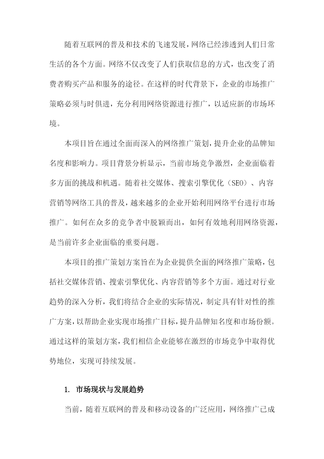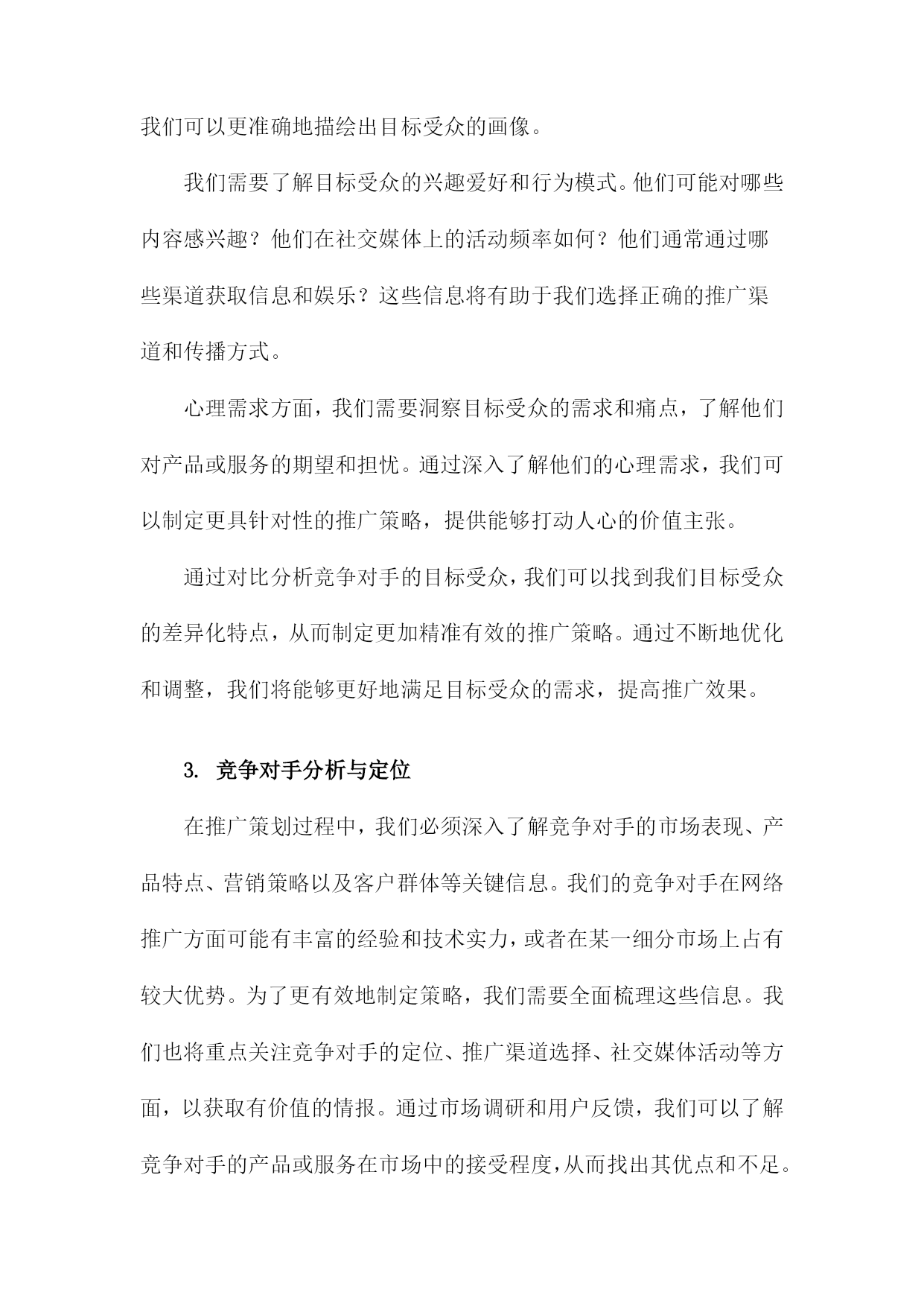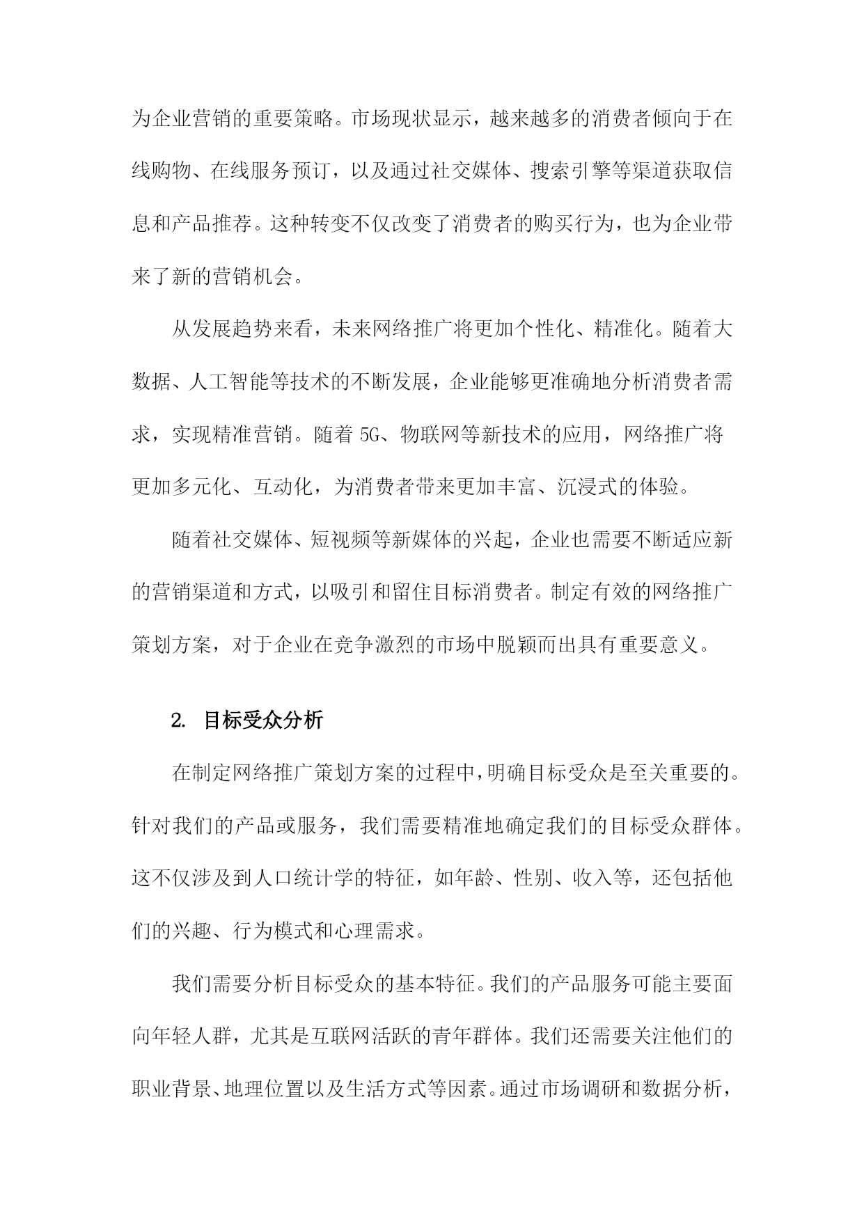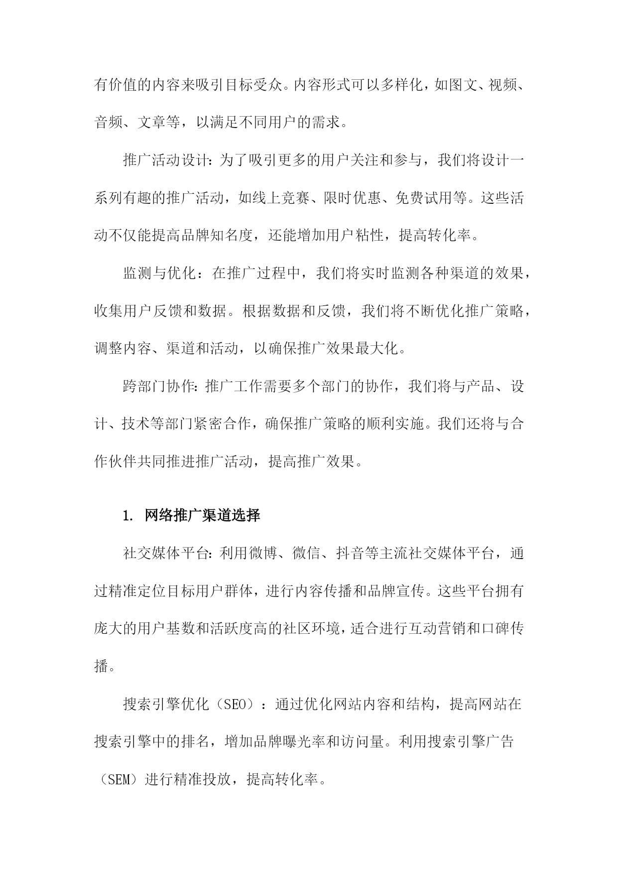 网络推广策划方案一、《网络推广策划方案》概述随着互联网的快速发展和普及,网络推广已成为企业、品牌或个人实现价值最大化的一种重要手段。本《网络推广策划方案》旨在通过系统性的规划,充分利用网络资源和新媒体平台,提升目标对象(企业、品牌或个人)的知名度、影响力和市场份额。本方案将围绕网络推广的核心目标,详细阐述推广策略、推广渠道、内容创意及执行时间表等关键内容,以确保推广活动的高效实施和预期效果的达成。本策划方案注重整合网络营销资源,结合搜索引擎优化(SEO)、社交媒体营销(SMM)、内容营销、电子邮件营销以及网络广告等多种手段,形成全方位、多角度的网络推广格局。方案强调数据分析和效果评估,以实时调整和优化推广策略,确保推广活动的精准性和有效性。通过本策划方案的实施,预期将提升目标受众的品牌认知度,扩大市场份额,增加客户粘性,最终实现业务增长和盈利提升。在接下来的章节中,我们将详细阐述各推广阶段的具体实施步骤和策略选择。1.推广目标与目的随着互联网的普及与发展,网络推广已成为企业宣传品牌、提升知名度、拓展市场份额的关键手段。本推广策划方案的制定,旨在明确推广目标,确定推广策略,以期达到提升网站流量、增强品牌影响力、提高转化率的目的。我们设定推广的主要目标为提升网站访问量及用户活跃度。通过运用多元化的推广渠道,如社交媒体、搜索引擎优化(SEO)、内容营销等,吸引潜在用户的关注,增加网站的访问量,提高用户留存率及活跃度,从而扩大市场份额。我们旨在通过推广提升品牌知名度与影响力。通过精准定位目标用户群体,制定符合其需求的推广内容,借助网络平台的广泛传播,提升品牌在目标用户中的认知度与影响力,塑造品牌形象,增强品牌忠诚度。我们的目的是通过推广实现销售增长与盈利提升。通过网络推广吸引潜在消费者,将潜在消费者转化为实际购买用户,提高转化率,从而实现销售增长与盈利提升。我们将重视推广活动的数据监控与分析,根据数据分析结果优化推广策略,确保推广活动的效果最大化。本网络推广策划方案的制定,旨在通过明确的推广目标与目的,制定符合企业需求的推广策略,提升网站流量、品牌影响力及转化率,从而实现企业的可持续发展。二、项目背景分析随着互联网的普及和技术的飞速发展,网络已经渗透到人们日常生活的各个方面。网络不仅改变了人们获取信息的方式,也改变了消费者购买产品和服务的途径。在这样的时代背景下,企业的市场推广策略必须与时俱进,充分利用网络资源进行推广,以适应新的市场环境。本项目旨在通过全面而深入的网络推广策划,提升企业的品牌知名度和影响力。项目背景分析显示,当前市场竞争激烈,企业面临着多方面的挑战和机遇。随着社交媒体、搜索引擎优化(SEO)、内容营销等网络工具的普及,越来越多的企业开始利用网络平台进行市场推广。如何在众多的竞争者中脱颖而出,如何有效地利用网络资源,是当前许多企业面临的重要问题。本项目的推广策划方案旨在为企业提供全面的网络推广策略,包括社交媒体营销、搜索引擎优化、内容营销等多个方面。通过对行业趋势的深入分析,我们将结合企业的实际情况,制定具有针对性的推广方案,以帮助企业实现市场推广目标,提升品牌知名度和市场份额。通过这样的策划方案,我们相信企业能够在激烈的市场竞争中取得优势地位,实现可持续发展。1.市场现状与发展趋势当前,随着互联网的普及和移动设备的广泛应用,网络推广已成为企业营销的重要策略。市场现状显示,越来越多的消费者倾向于在线购物、在线服务预订,以及通过社交媒体、搜索引擎等渠道获取信息和产品推荐。这种转变不仅改变了消费者的购买行为,也为企业带来了新的营销机会。从发展趋势来看,未来网络推广将更加个性化、精准化。随着大数据、人工智能等技术的不断发展,企业能够更准确地分析消费者需求,实现精准营销。随着5G、物联网等新技术的应用,网络推广将更加多元化、互动化,为消费者带来更加丰富、沉浸式的体验。随着社交媒体、短视频等新媒体的兴起,企业也需要不断适应新的营销渠道和方式,以吸引和留住目标消费者。制定有效的网络推广策划方案,对于企业在竞争激烈的市场中脱颖而出具有重要意义。2.目标受众分析在制定网络推广策划方案的过程中,明确目标受众是至关重要的。针对我们的产品或服务,我们需要精准地确定我们的目标受众群体。这不仅涉及到人口统计学的特征,如年龄、性别、收入等,还包括他们的兴趣、行为模式和心理需求。我们需要分析目标受众的基本特征。我们的产品服务可能主要面向年轻人群,尤其是互联网活跃的青年群体。我们还需要关注他们的职业背景、地理位置以及生活方式等因素。通过市场调研和数据分析,我们可以更准确地描绘出目标受众的画像。我们需要了解目标受众的兴趣爱好和行为模式。他们可能对哪些内容感兴趣?他们在社交媒体上的活动频率如何?他们通常通过哪些