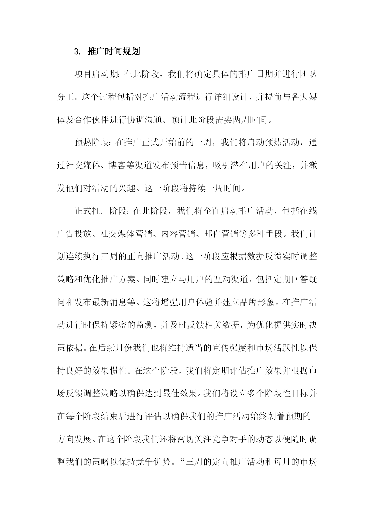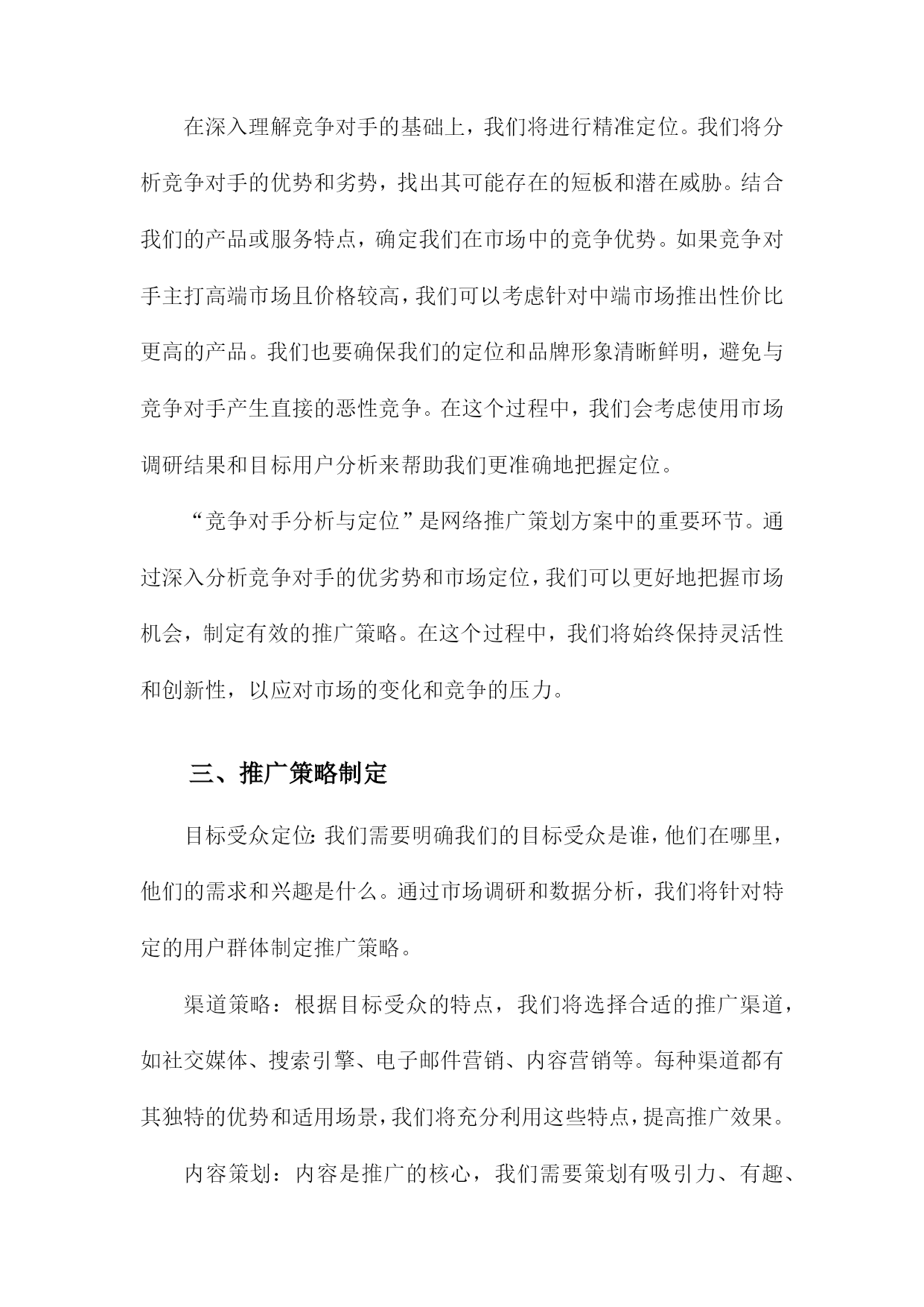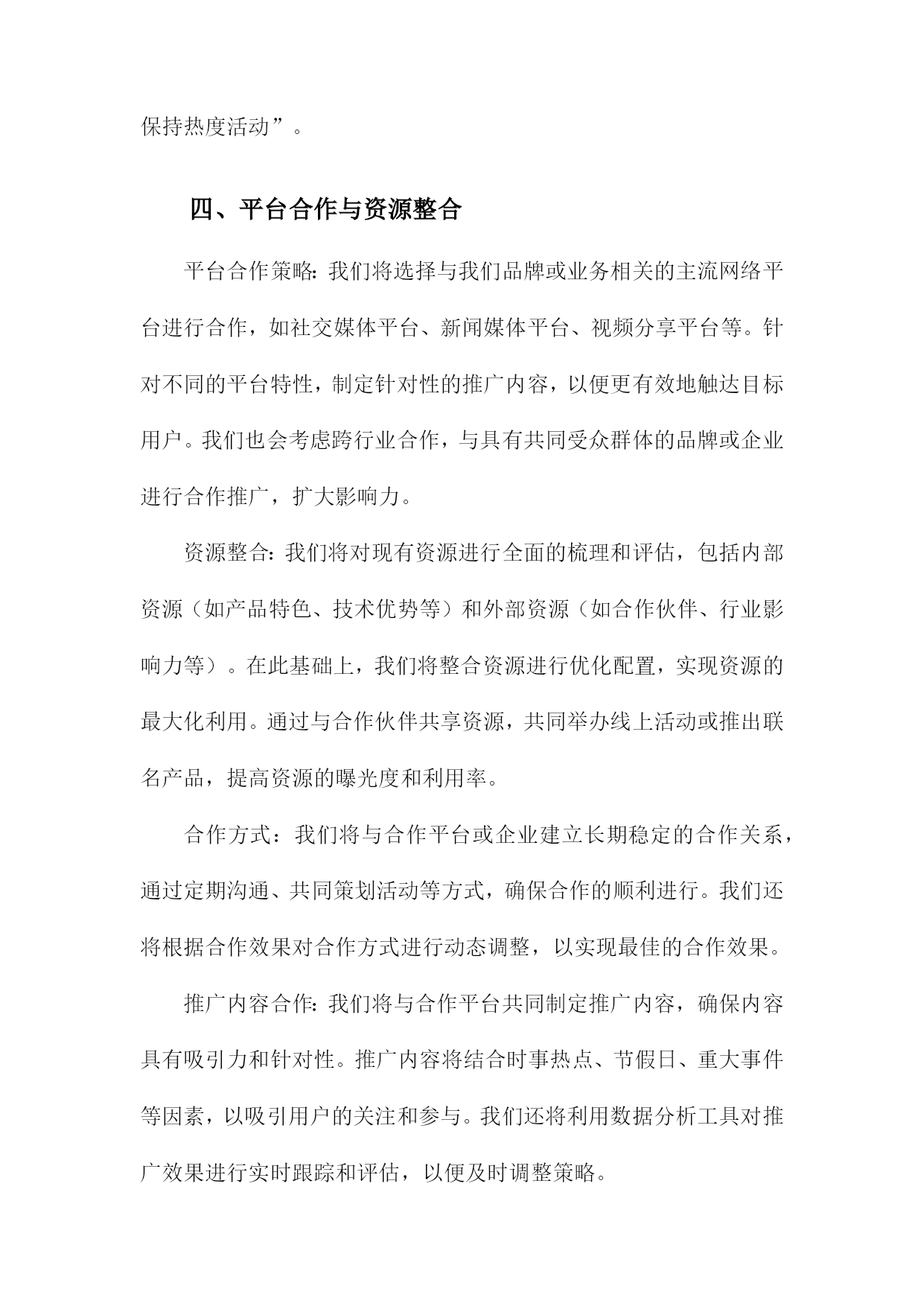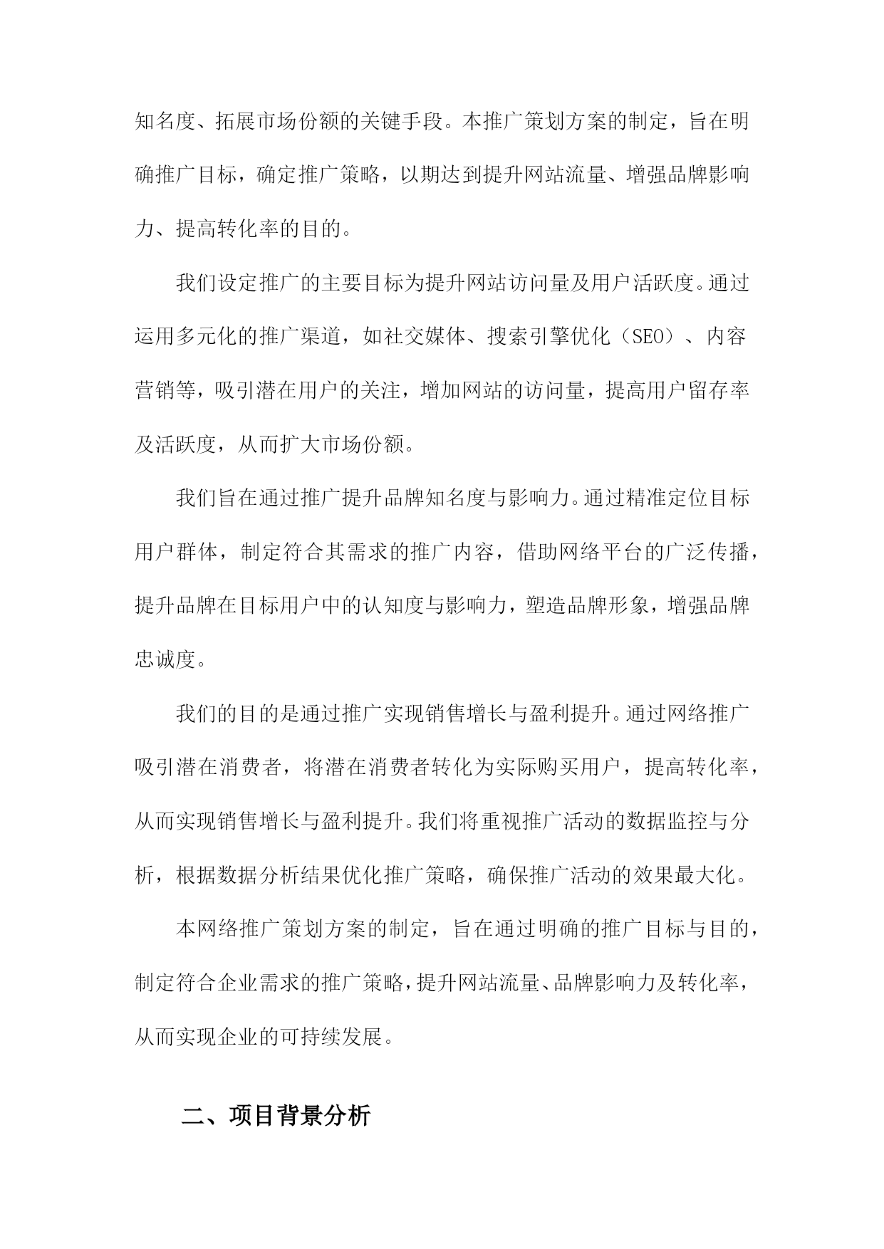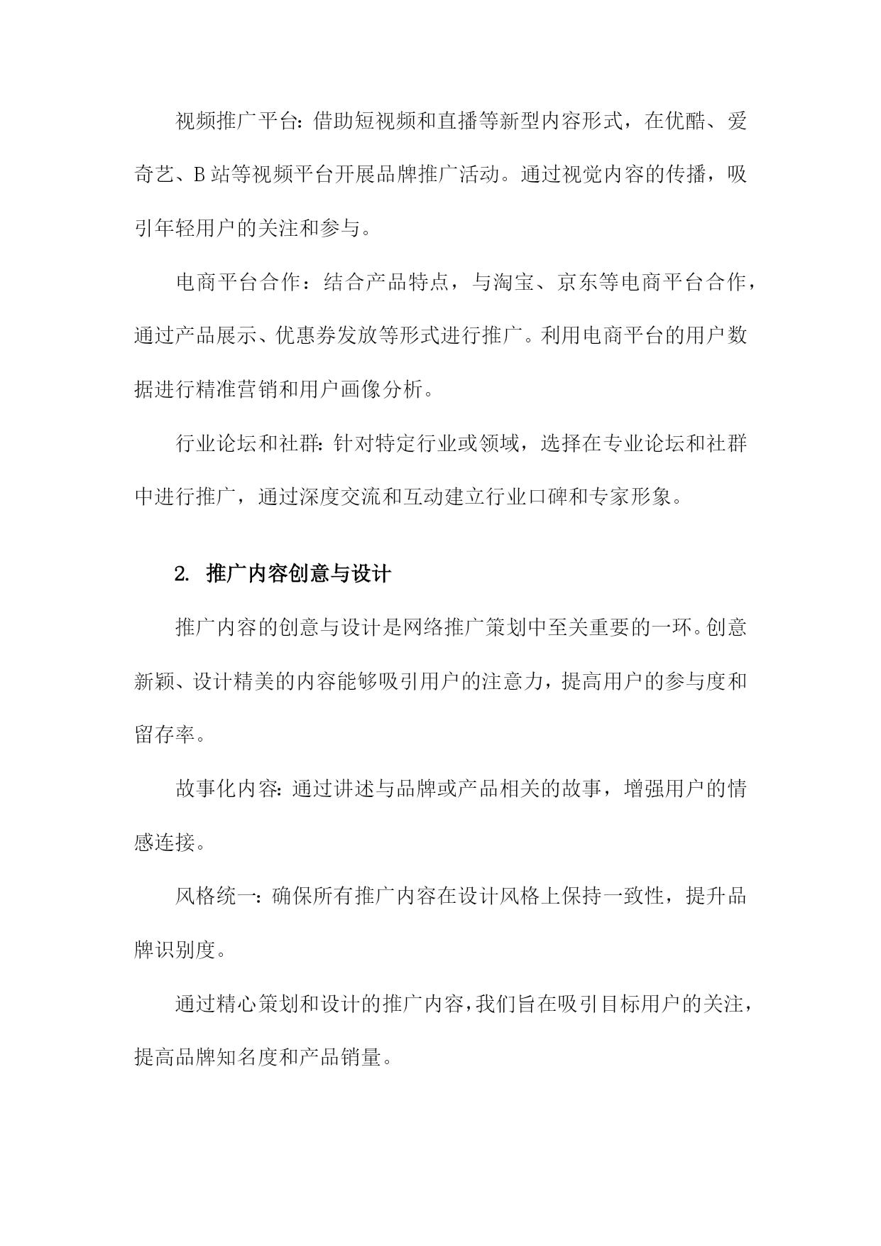 网络推广策划方案一、《网络推广策划方案》概述随着互联网的快速发展和普及,网络推广已成为企业、品牌或个人实现价值最大化的一种重要手段。本《网络推广策划方案》旨在通过系统性的规划,充分利用网络资源和新媒体平台,提升目标对象(企业、品牌或个人)的知名度、影响力和市场份额。本方案将围绕网络推广的核心目标,详细阐述推广策略、推广渠道、内容创意及执行时间表等关键内容,以确保推广活动的高效实施和预期效果的达成。本策划方案注重整合网络营销资源,结合搜索引擎优化(SEO)、社交媒体营销(SMM)、内容营销、电子邮件营销以及网络广告等多种手段,形成全方位、多角度的网络推广格局。方案强调数据分析和效果评估,以实时调整和优化推广策略,确保推广活动的精准性和有效性。通过本策划方案的实施,预期将提升目标受众的品牌认知度,扩大市场份额,增加客户粘性,最终实现业务增长和盈利提升。在接下来的章节中,我们将详细阐述各推广阶段的具体实施步骤和策略选择。1.推广目标与目的随着互联网的普及与发展,网络推广已成为企业宣传品牌、提升知名度、拓展市场份额的关键手段。本推广策划方案的制定,旨在明确推广目标,确定推广策略,以期达到提升网站流量、增强品牌影响力、提高转化率的目的。我们设定推广的主要目标为提升网站访问量及用户活跃度。通过运用多元化的推广渠道,如社交媒体、搜索引擎优化(SEO)、内容营销等,吸引潜在用户的关注,增加网站的访问量,提高用户留存率及活跃度,从而扩大市场份额。我们旨在通过推广提升品牌知名度与影响力。通过精准定位目标用户群体,制定符合其需求的推广内容,借助网络平台的广泛传播,提升品牌在目标用户中的认知度与影响力,塑造品牌形象,增强品牌忠诚度。我们的目的是通过推广实现销售增长与盈利提升。通过网络推广吸引潜在消费者,将潜在消费者转化为实际购买用户,提高转化率,从而实现销售增长与盈利提升。我们将重视推广活动的数据监控与分析,根据数据分析结果优化推广策略,确保推广活动的效果最大化。本网络推广策划方案的制定,旨在通过明确的推广目标与目的,制定符合企业需求的推广策略,提升网站流量、品牌影响力及转化率,从而实现企业的可持续发展。二、项目背景分析随着互联网的普及和技术的飞速发展,网络已经渗透到人们日常生活的各个方面。网络不仅改变了人们获取信息的方式,也改变了消费者购买产品和服务的途径。在这样的时代背景下,企业的市场推广策略必须与时俱进,充分利用网络资源进行推广,以适应新的市场环境。本项目旨在通过全面而深入的网络推广策划,提升企业的品牌知名度和影响力。项目背景分析显示,当前市场竞争激烈,企业面临着多方面的挑战和机遇。随着社交媒体、搜索引擎优化(SEO)、内容营销等网络工具的普及,越来越多的企业开始利用网络平台进行市场推广。如何在众多的竞争者中脱颖而出,如何有效地利用网络资源,是当前许多企业面临的重要问题。本项目的推广策划方案旨在为企业提供全面的网络推广策略,包括社交媒体营销、搜索引擎优化、内容营销等多个方面。通过对行业趋势的深入分析,我们将结合企业的实际情况,制定具有针对性的推广方案,以帮助企业实现市场推广目标,提升品牌知名度和市场份额。通过这样的策划方案,我们相信企业能够在激烈的市场竞争中取得优势地位,实现可持续发展。1.市场现状与发展趋势当前,随着互联网的普及和移动设备的广泛应用,网络推广已成为企业营销的重要策略。市场现状显示,越来越多的消费者倾向于在线购物、在线服务预订,以及通过社交媒体、搜索引擎等渠道获取信息和产品推荐。这种转变不仅改变了消费者的购买行为,也为企业带来了新的营销机会。从发展趋势来看,未来网络推广将更加个性化、精准化。随着大数据、人工智能等技术的不断发展,企业能够更准确地分析消费者需求,实现精准营销。随着5G、物联网等新技术的应用,网络推广将更加多元化、互动化,为消费者带来更加丰富、沉浸式的体验。随着社交媒体、短视频等新媒体的兴起,企业也需要不断适应新的营销渠道和方式,以吸引和留住目标消费者。制定有效的网络推广策划方案,对于企业在竞争激烈的市场中脱颖而出具有重要意义。2.目标受众分析在制定网络推广策划方案的过程中,明确目标受众是至关重要的。针对我们的产品或服务,我们需要精准地确定我们的目标受众群体。这不仅涉及到人口统计学的特征,如年龄、性别、收入等,还包括他们的兴趣、行为模式和心理需求。我们需要分析目标受众的基本特征。我们的产品服务可能主要面向年轻人群,尤其是互联网活跃的青年群体。我们还需要关注他们的职业背景、地理位置以及生活方式等因素。通过市场调研和数据分析,我们可以更准确地描绘出目标受众的画像。我们需要了解目标受众的兴趣爱好和行为模式。他们可能对哪些内容感兴趣?他们在社交媒体上的活动频率如何?他们通常通过哪些