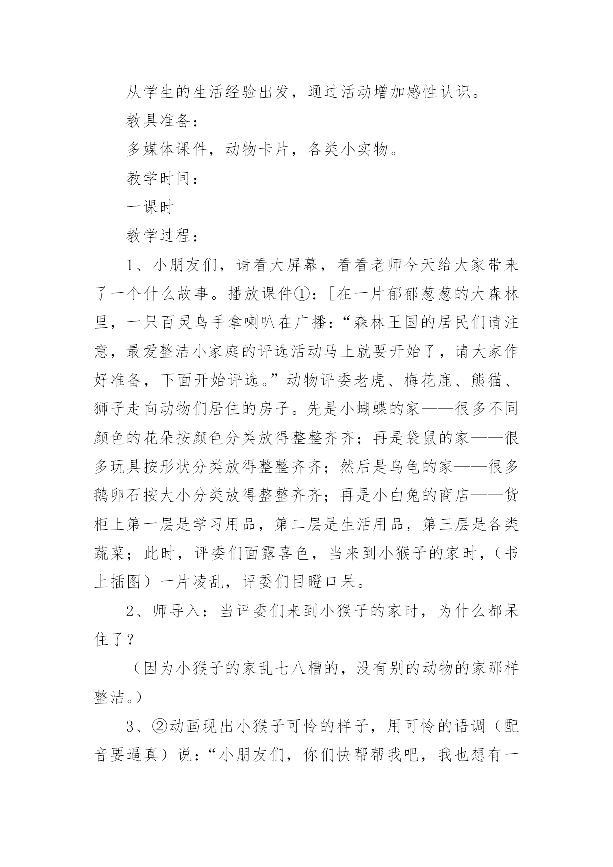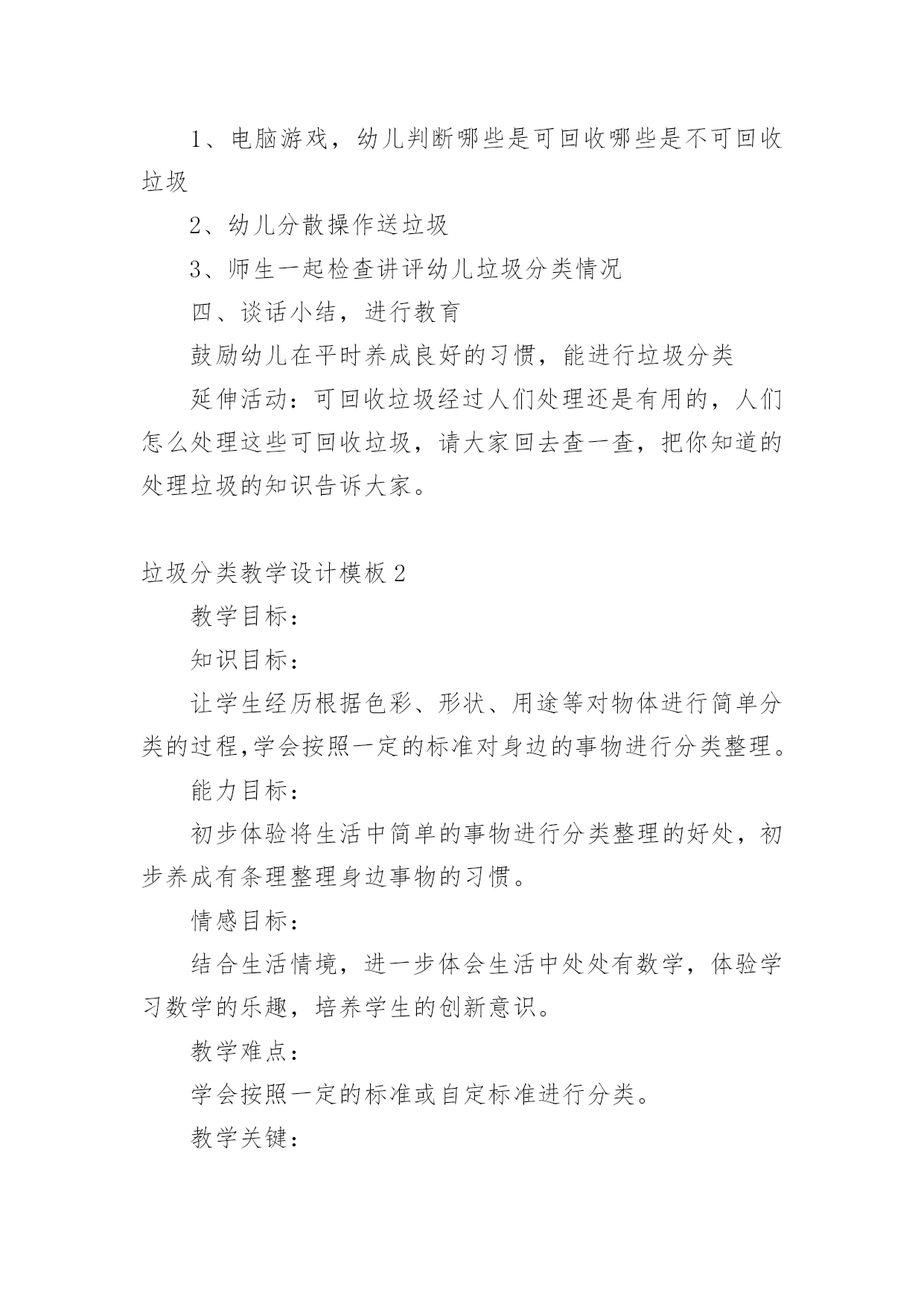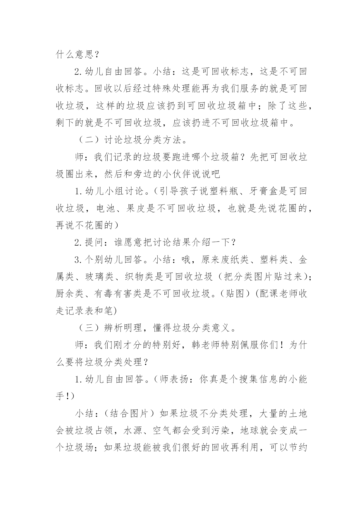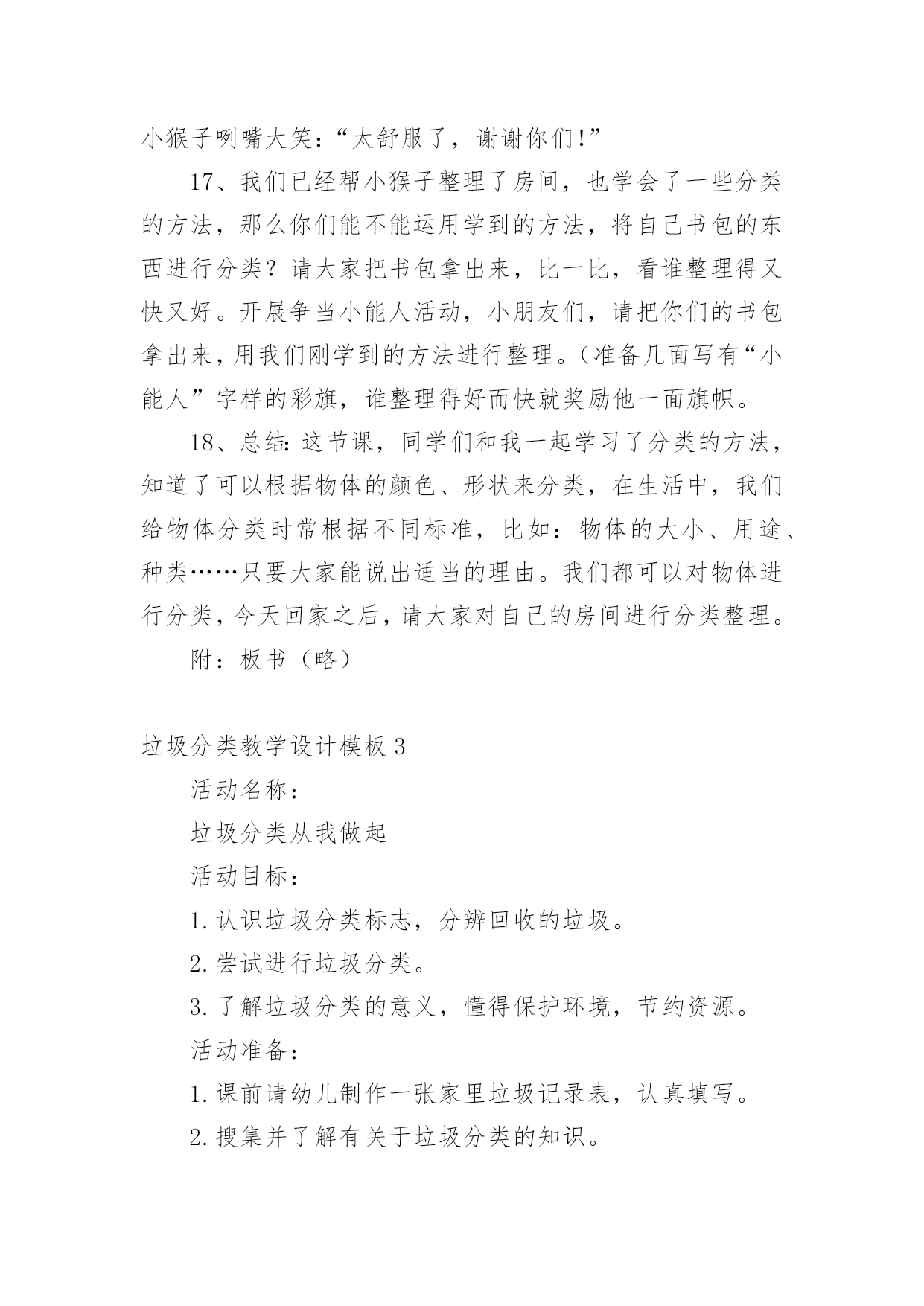 垃圾分类教学设计垃圾分类教学设计模板作为一名老师,时常需要准备好教学设计,编写教学设计有利于我们科学、合理地支配课堂时间。那么优秀的教学设计是什么样的呢?以下是小编收集整理的垃圾分类教学设计模板,希望对大家有所帮助。垃圾分类教学设计模板1活动目标:1、了解可回收和不可回收垃圾,并能进行垃圾分类。2、树立环保意识,养成分类处理垃圾的良好习惯。活动准备:视频、课件、幼儿收集的生活垃圾等等活动过程:一、对比照片,了解垃圾是哪里来的二、结合图片,认识垃圾箱上的标记1、幼儿讨论:如何清理公园的垃圾2、结合图片,认识垃圾箱上的标记3、播放视频,了解可回收垃圾与不可回收垃圾4、幼儿讨论,哪些是可回收的哪些是不可回收的垃圾5、教师小结,垃圾分类摆放的好处三、电脑游戏、操作活动,进行垃圾分类1、电脑游戏,幼儿判断哪些是可回收哪些是不可回收垃圾2、幼儿分散操作送垃圾3、师生一起检查讲评幼儿垃圾分类情况四、谈话小结,进行教育鼓励幼儿在平时养成良好的习惯,能进行垃圾分类延伸活动:可回收垃圾经过人们处理还是有用的,人们怎么处理这些可回收垃圾,请大家回去查一查,把你知道的处理垃圾的知识告诉大家。垃圾分类教学设计模板2教学目标:知识目标:让学生经历根据色彩、形状、用途等对物体进行简单分类的过程,学会按照一定的标准对身边的事物进行分类整理。能力目标:初步体验将生活中简单的事物进行分类整理的好处,初步养成有条理整理身边事物的习惯。情感目标:结合生活情境,进一步体会生活中处处有数学,体验学习数学的乐趣,培养学生的创新意识。教学难点:学会按照一定的标准或自定标准进行分类。教学关键:从学生的生活经验出发,通过活动增加感性认识。教具准备:多媒体课件,动物卡片,各类小实物。教学时间:一课时教学过程:1、小朋友们,请看大屏幕,看看老师今天给大家带来了一个什么故事。播放课件①:[在一片郁郁葱葱的大森林里,一只百灵鸟手拿喇叭在广播:“森林王国的居民们请注意,最爱整洁小家庭的评选活动马上就要开始了,请大家作好准备,下面开始评选。”动物评委老虎、梅花鹿、熊猫、狮子走向动物们居住的房子。先是小蝴蝶的家——很多不同颜色的花朵按颜色分类放得整整齐齐;再是袋鼠的家——很多玩具按形状分类放得整整齐齐;然后是乌龟的家——很多鹅卵石按大小分类放得整整齐齐;再是小白兔的商店——货柜上第一层是学习用品,第二层是生活用品,第三层是各类蔬菜;此时,评委们面露喜色,当来到小猴子的家时,(书上插图)一片凌乱,评委们目瞪口呆。2、师导入:当评委们来到小猴子的家时,为什么都呆住了?(因为小猴子的家乱七八槽的,没有别的动物的家那样整洁。)3、②动画现出小猴子可怜的样子,用可怜的语调(配音要逼真)说:“小朋友们,你们快帮帮我吧,我也想有一个干净整洁的家”)4、师:小朋友们:你们想不想帮助小猴子把它的家整理得整整齐齐的呀?(想),那么该按怎样的方法去把这些凌乱的物体分类整理好呢?这就是我们今天将要学习的知识——给物体分类,板书;分类。5、出示课件③:桌子上有一些三角形、圆形(4个红三角形、2个白三角形,2个红圆形,3个白圆形)6、师:小朋友们,请看大屏幕,这里有一些图片,小华和小红分别把它们分成了两堆,我们先来看小华的分法:课件④(要显示出分的顺序),大家仔细观察,桌子的左边都是些什么?右边呢?6个三角形一堆,5个圆形一堆。想一想小华为什么这样分?(引导学生归纳:这样是按物体的形状来分类的,板书:形状)(刚才小华把6个三角形分一堆,5个圆形分一堆,再看小红又是怎样分的呢?桌子的左边都是?右边都是?想一想,小红为什么这样分?)引导学生归纳:这样是按物体的颜色来分。板书:颜色7、如果学生同时按颜色、形状分成四类,教师要给予表扬。8、教师:刚才我们学习了可以按物体的形状、颜色给物体进行分类,其实在生活中,我们可以按照不同的标准对物体进行分类,比如:请大家把书翻开(P55),看看第一题这里有许多动物,请大家把生活在水里的动物涂上自己喜欢的颜色。(稍候片刻,教师巡视批改。)9、现在,老师想和大家一起来做游戏。请看老师在黑板上画了一片草地,草地上空飘着几朵白云,草地下面是一条小河,请小朋友们想一想:哪些东西可以在天上飞?哪些东西可以在地上走?哪些东西可以在水里游?(让学生自由说)再拿出一些卡片[燕子、飞机、氢气球、小鸡、猪、汽车、海豚、鱼、鸭子、兔子、蝴蝶、鹅]。老师给大家带来了一些卡片,看看画的是什么?想想它们分别可以在什么地方?(抽学生到黑板上把图片贴到相应的地方,放轻音乐——⑤只设置音小而活泼的音乐)。10、刚才同学们表现得很好,老师为了奖励你们,特给你们带来了一些礼物(出示四个蓝子,内装各类物体,上用布覆盖。)将四个篮子放在讲台上,请小组长上台领取。11、现在,每个小组都挑了一篮礼物,不过上课前(老师在装礼物的时候