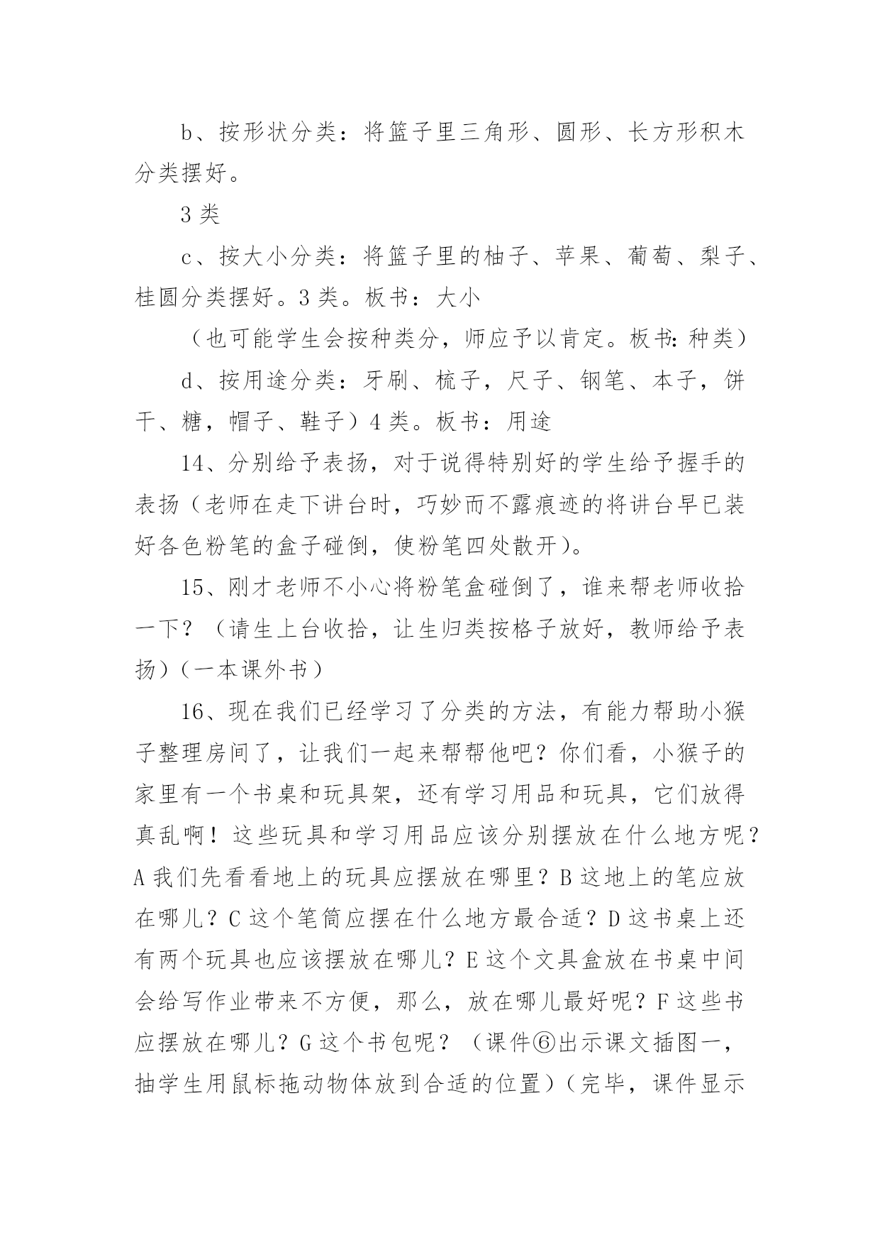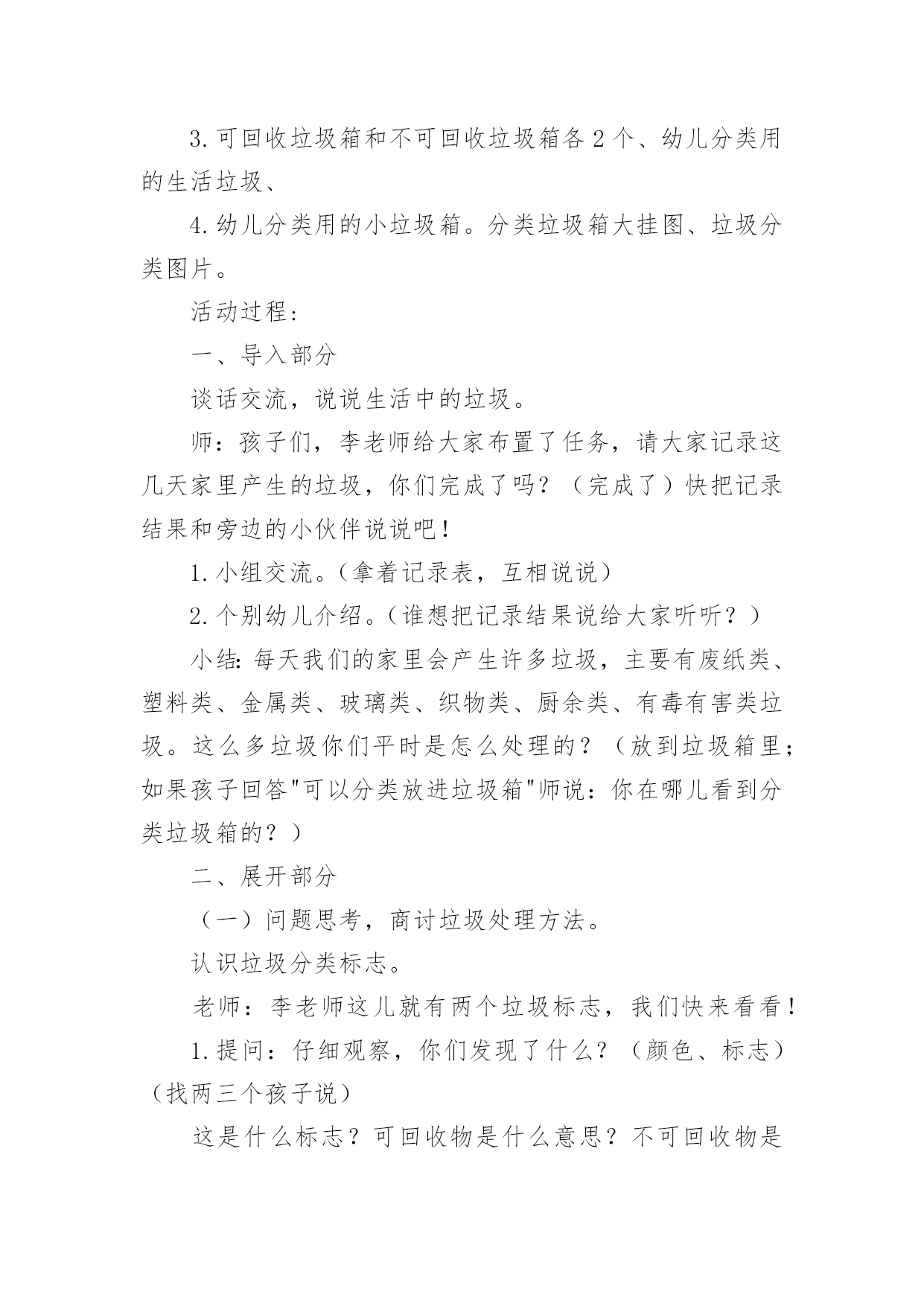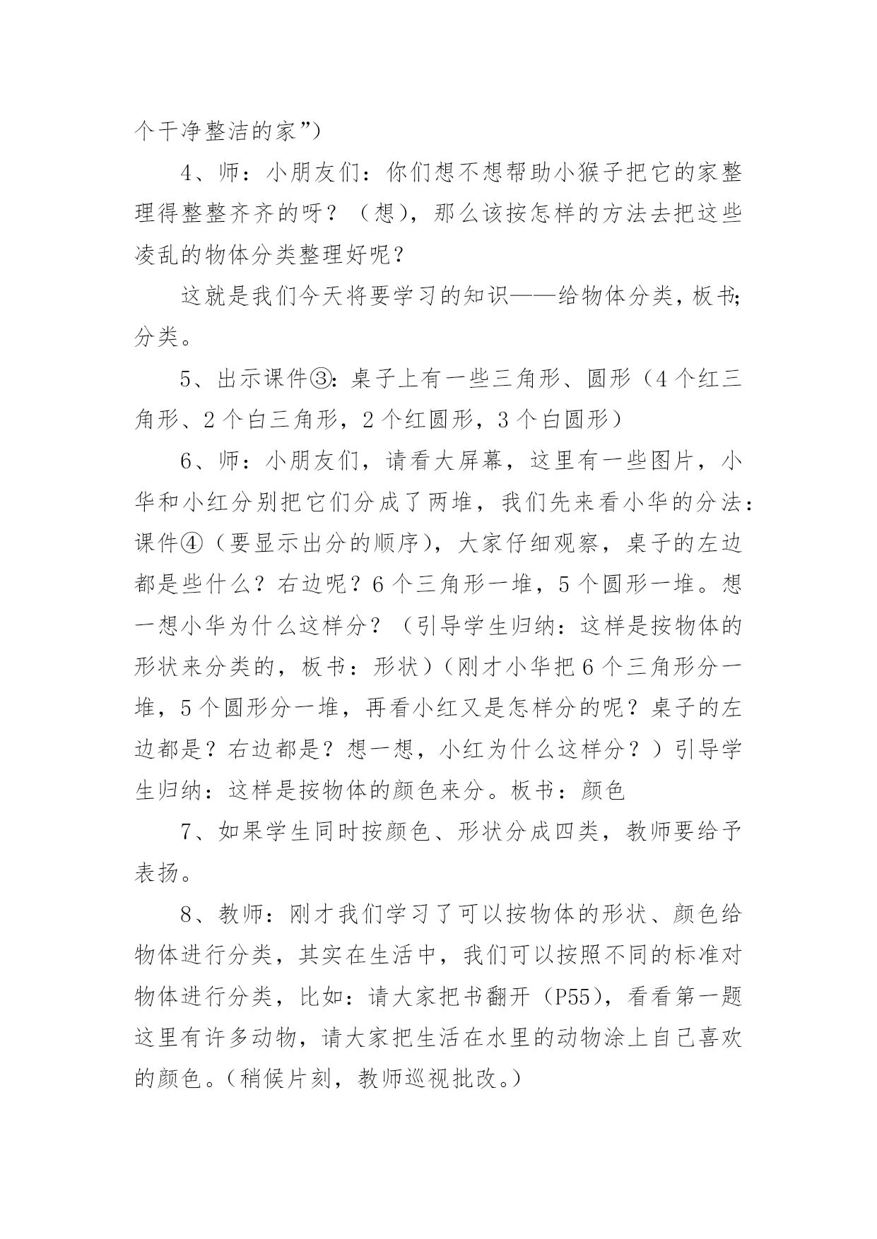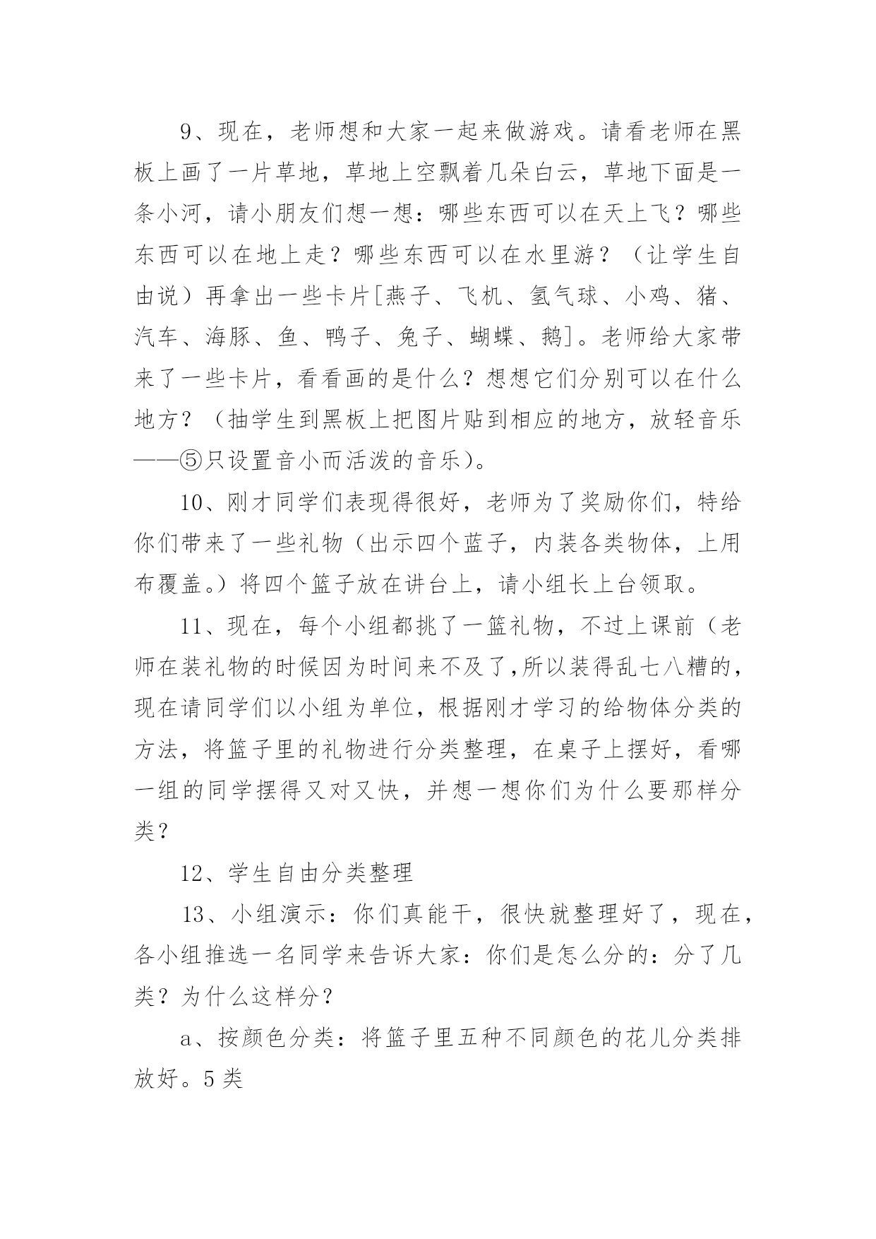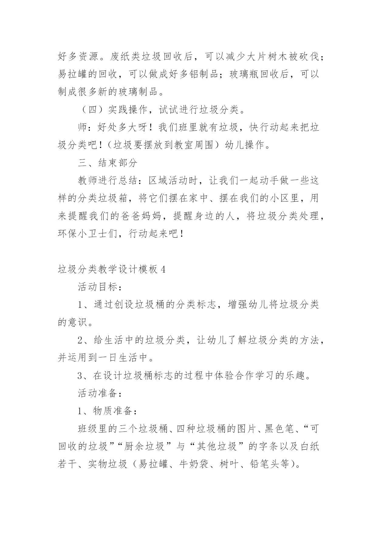 垃圾分类教学设计垃圾分类教学设计模板作为一名老师,时常需要准备好教学设计,编写教学设计有利于我们科学、合理地支配课堂时间。那么优秀的教学设计是什么样的呢?以下是小编收集整理的垃圾分类教学设计模板,希望对大家有所帮助。垃圾分类教学设计模板1活动目标:1、了解可回收和不可回收垃圾,并能进行垃圾分类。2、树立环保意识,养成分类处理垃圾的良好习惯。活动准备:视频、课件、幼儿收集的生活垃圾等等活动过程:一、对比照片,了解垃圾是哪里来的二、结合图片,认识垃圾箱上的标记1、幼儿讨论:如何清理公园的垃圾2、结合图片,认识垃圾箱上的标记3、播放视频,了解可回收垃圾与不可回收垃圾4、幼儿讨论,哪些是可回收的哪些是不可回收的垃圾5、教师小结,垃圾分类摆放的好处三、电脑游戏、操作活动,进行垃圾分类1、电脑游戏,幼儿判断哪些是可回收哪些是不可回收垃圾2、幼儿分散操作送垃圾3、师生一起检查讲评幼儿垃圾分类情况四、谈话小结,进行教育鼓励幼儿在平时养成良好的习惯,能进行垃圾分类延伸活动:可回收垃圾经过人们处理还是有用的,人们怎么处理这些可回收垃圾,请大家回去查一查,把你知道的处理垃圾的知识告诉大家。垃圾分类教学设计模板2教学目标:知识目标:让学生经历根据色彩、形状、用途等对物体进行简单分类的过程,学会按照一定的标准对身边的事物进行分类整理。能力目标:初步体验将生活中简单的事物进行分类整理的好处,初步养成有条理整理身边事物的习惯。情感目标:结合生活情境,进一步体会生活中处处有数学,体验学习数学的乐趣,培养学生的创新意识。教学难点:学会按照一定的标准或自定标准进行分类。教学关键:从学生的生活经验出发,通过活动增加感性认识。教具准备:多媒体课件,动物卡片,各类小实物。教学时间:一课时教学过程:1、小朋友们,请看大屏幕,看看老师今天给大家带来了一个什么故事。播放课件①:[在一片郁郁葱葱的大森林里,一只百灵鸟手拿喇叭在广播:“森林王国的居民们请注意,最爱整洁小家庭的评选活动马上就要开始了,请大家作好准备,下面开始评选。”动物评委老虎、梅花鹿、熊猫、狮子走向动物们居住的房子。先是小蝴蝶的家——很多不同颜色的花朵按颜色分类放得整整齐齐;再是袋鼠的家——很多玩具按形状分类放得整整齐齐;然后是乌龟的家——很多鹅卵石按大小分类放得整整齐齐;再是小白兔的商店——货柜上第一层是学习用品,第二层是生活用品,第三层是各类蔬菜;此时,评委们面露喜色,当来到小猴子的家时,(书上插图)一片凌乱,评委们目瞪口呆。2、师导入:当评委们来到小猴子的家时,为什么都呆住了?(因为小猴子的家乱七八槽的,没有别的动物的家那样整洁。)3、②动画现出小猴子可怜的样子,用可怜的语调(配音要逼真)说:“小朋友们,你们快帮帮我吧,我也想有一个干净整洁的家”)4、师:小朋友们:你们想不想帮助小猴子把它的家整理得整整齐齐的呀?(想),那么该按怎样的方法去把这些凌乱的物体分类整理好呢?这就是我们今天将要学习的知识——给物体分类,板书;分类。5、出示课件③:桌子上有一些三角形、圆形(4个红三角形、2个白三角形,2个红圆形,3个白圆形)6、师:小朋友们,请看大屏幕,这里有一些图片,小华和小红分别把它们分成了两堆,我们先来看小华的分法:课件④(要显示出分的顺序),大家仔细观察,桌子的左边都是些什么?右边呢?6个三角形一堆,5个圆形一堆。想一想小华为什么这样分?(引导学生归纳:这样是按物体的形状来分类的,板书:形状)(刚才小华把6个三角形分一堆,5个圆形分一堆,再看小红又是怎样分的呢?桌子的左边都是?右边都是?想一想,小红为什么这样分?)引导学生归纳:这样是按物体的颜色来分。板书:颜色7、如果学生同时按颜色、形状分成四类,教师要给予表扬。8、教师:刚才我们学习了可以按物体的形状、颜色给物体进行分类,其实在生活中,我们可以按照不同的标准对物体进行分类,比如:请大家把书翻开(P55),看看第一题这里有许多动物,请大家把生活在水里的动物涂上自己喜欢的颜色。(稍候片刻,教师巡视批改。)9、现在,老师想和大家一起来做游戏。请看老师在黑板上画了一片草地,草地上空飘着几朵白云,草地下面是一条小河,请小朋友们想一想:哪些东西可以在天上飞?哪些东西可以在地上走?哪些东西可以在水里游?(让学生自由说)再拿出一些卡片[燕子、飞机、氢气球、小鸡、猪、汽车、海豚、鱼、鸭子、兔子、蝴蝶、鹅]。老师给大家带来了一些卡片,看看画的是什么?想想它们分别可以在什么地方?(抽学生到黑板上把图片贴到相应的地方,放轻音乐——⑤只设置音小而活泼的音乐)。10、刚才同学们表现得很好,老师为了奖励你们,特给你们带来了一些礼物(出示四个蓝子,内装各类物体,上用布覆盖。)将四个篮子放在讲台上,请小组长上台领取。11、现在,每个小组都挑了一篮礼物,不过上课前(老师在装礼物的时候
