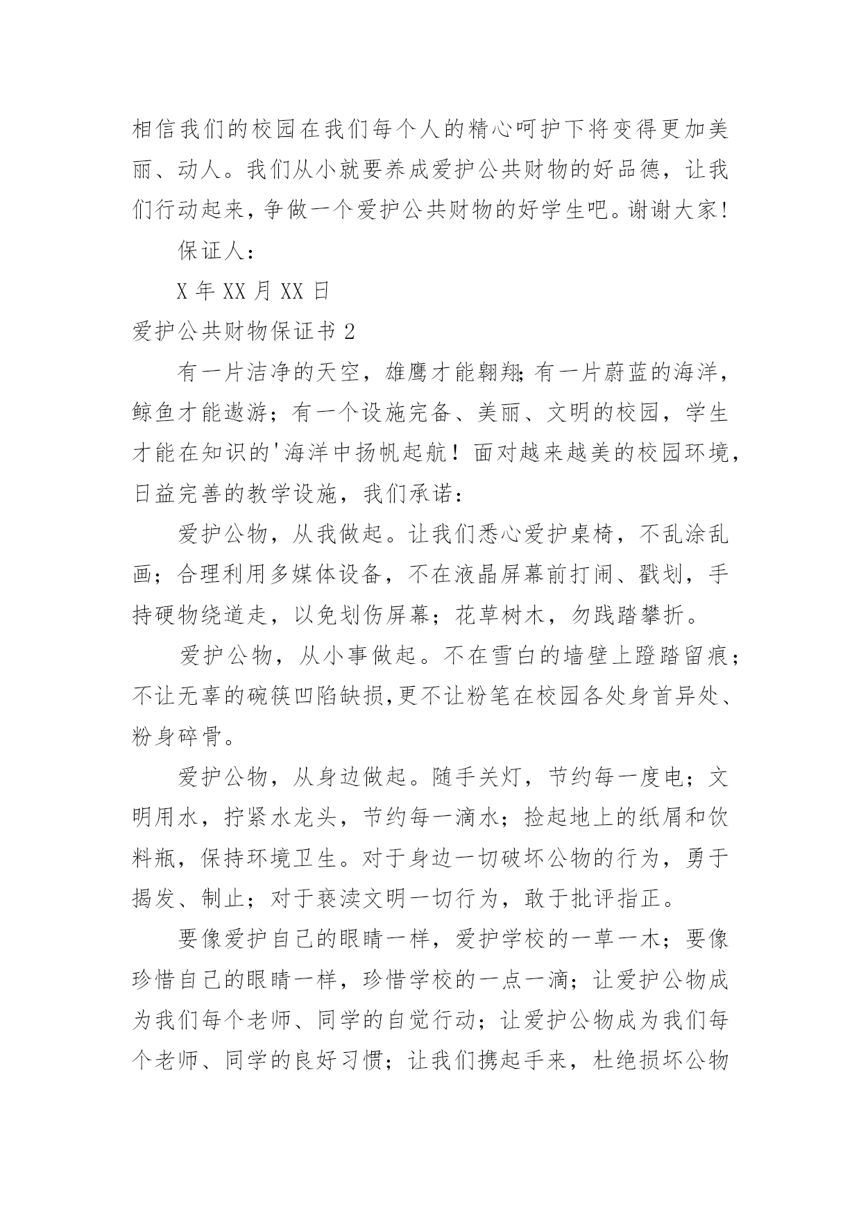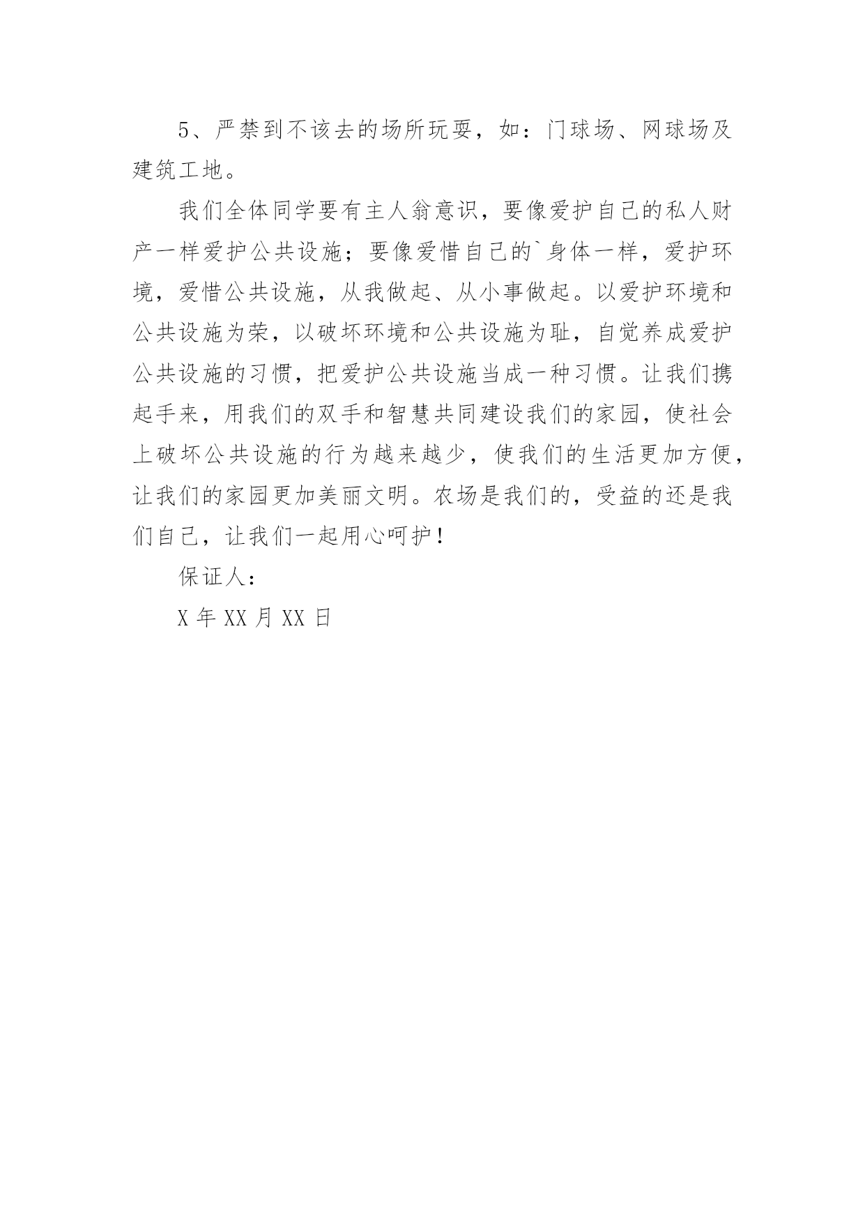爱护公共财物保证书爱护公共财物保证书在社会发展不断提速的今天,保证书使用的次数愈发增长,保证书便于上级组织或集体根据保证者所保证的内容实施监督和检查。写起保证书来就毫无头绪?以下是小编收集整理的爱护公共财物保证书,仅供参考,欢迎大家阅读。爱护公共财物保证书1老师们,同学们,大家好:今天国旗下讲话,我想讲讲爱护公共财物的问题。一说起爱护公物,也许有人会认为这是老生常谈,因为类似“爱护公物光荣,破坏公物可耻”、“爱护公物,人人有责”这样的口号恐怕连幼儿园小朋友也能说上几条。但现实生活中的我们又做得怎么样呢?细心观察就会发现,校园里破坏公物的现象还是有的:教室墙壁上的斑斑污迹,课桌椅上各式各样的涂鸦,地面上被拖行的桌椅留下的印记等等。你有没有想过,不论是有意还是无意,这些行为都对公物造成了损坏,也给其他同学的学习和生活带来了不必要的麻烦。还会增加学校对公物的维修费用。在我们学校里,课桌、图书资料、花草树木、体育器材等等都是公共财物。这些公共财务,我们全体师生都要悉心爱护,妥善保管,不可随意损坏,更不能故意破坏。因为它是我们师生工作、学习的物质保证。爱护公共财物是我们每一个同学应尽的义务。在爱护公共财务方面,我国有许多少年儿童为我们树立了光辉的榜样。就如赖宁为了扑灭森林大火,保护国家财产而光荣牺牲。爱护公物的英雄是值得我们学习的。在讲到爱护公共财物时,使我想起一篇课文,课文的题目是《课桌椅的对话》,课文的大概内容是这样的:有一天冬冬刚跨进教室门,就听到课桌椅在说话,桌子说:“前几天我的小主人用笔在我身上乱涂乱画,弄得我全身很脏。昨天他又在我身上用小刀划了几下,我真痛啊!现在全身伤痕累累。”椅子接着说:“是啊,我也如此,我的小主人整天把我摇啊摇,现在我的腿受不了了,一条腿都断了!”同学们,你们听了刚才我讲的这篇课文的大概内容后,你有何感想呢?你作为课桌的小主人,是否像课文中的小主人的`现象呢?当你每天走进教室是否也听到过课桌椅的对话?当你每天上下学走学校教学楼楼梯时,是否听到过楼梯的护拦在呼唤:“爱护我吧!”当你上完每一节体育课时是否把器材归还原处。同学们,有许多爱护公物的事情只是举手之劳,让我们像爱护自己的眼睛一样爱护公物,让我们像珍惜自己的身体一样珍惜公物。让我们从自己做起,从身边做起,从小事做起。爱护公物从我做起,挪动桌椅小心翼翼,桌面椅背干干净净;开门开窗轻手轻脚;扫帚拖把不当武器;洁白墙上不留足迹;午餐饭盒轻拿轻放;花草树木细心呵护。使自己拥有一颗爱护公物的公德心,成为一个真正的爱护公物的文明人。相信我们的校园在我们每个人的精心呵护下将变得更加美丽、动人。我们从小就要养成爱护公共财物的好品德,让我们行动起来,争做一个爱护公共财物的好学生吧。谢谢大家!保证人:X年XX月XX日爱护公共财物保证书2有一片洁净的天空,雄鹰才能翱翔;有一片蔚蓝的海洋,鲸鱼才能遨游;有一个设施完备、美丽、文明的校园,学生才能在知识的'海洋中扬帆起航!面对越来越美的校园环境,日益完善的教学设施,我们承诺:爱护公物,从我做起。让我们悉心爱护桌椅,不乱涂乱画;合理利用多媒体设备,不在液晶屏幕前打闹、戳划,手持硬物绕道走,以免划伤屏幕;花草树木,勿践踏攀折。爱护公物,从小事做起。不在雪白的墙壁上蹬踏留痕;不让无辜的碗筷凹陷缺损,更不让粉笔在校园各处身首异处、粉身碎骨。爱护公物,从身边做起。随手关灯,节约每一度电;文明用水,拧紧水龙头,节约每一滴水;捡起地上的纸屑和饮料瓶,保持环境卫生。对于身边一切破坏公物的行为,勇于揭发、制止;对于亵渎文明一切行为,敢于批评指正。要像爱护自己的眼睛一样,爱护学校的一草一木;要像珍惜自己的眼睛一样,珍惜学校的一点一滴;让爱护公物成为我们每个老师、同学的自觉行动;让爱护公物成为我们每个老师、同学的良好习惯;让我们携起手来,杜绝损坏公物的行为。爱护公物,从身边做起,从小事做起,从我做起。保证人:X年XX月XX日爱护公共财物保证书3同学们大地之母给予了我们生存的环境,可爱的校园给予我们“学习栖身”之所。我们应该保护它们,而不能破坏。让我们从身边的事做起“保护环境卫生,爱护公共设施”。不让我们的绿色的草坪、别致的花坛被践踏,井盖、垃圾箱以及街边健身设备、路灯等公用设施不要被毁容,不要随手丢垃圾,不要随扣吐痰,不浪费水资源,不闯红灯,遵守交通规则,保护环境,爱护公共设施。公共设施是每个公民共同享有的公共服务资源,它是为大家服务的,需要我们共同来爱护和维护,这应该既是一种自觉行动,也是一种社会美德。全体学生必须按照学校要求进行承诺:1、每个人从自身做起,做一个讲文明、讲卫生的小学生,不管在家、在校、还是在社区、楼道、在广场,我们都应该养成良好的讲卫生习惯。做美好环境的保卫者。2、要学会保持好周围的环境。珍惜别人的劳动成果。不随地吐痰,乱扔