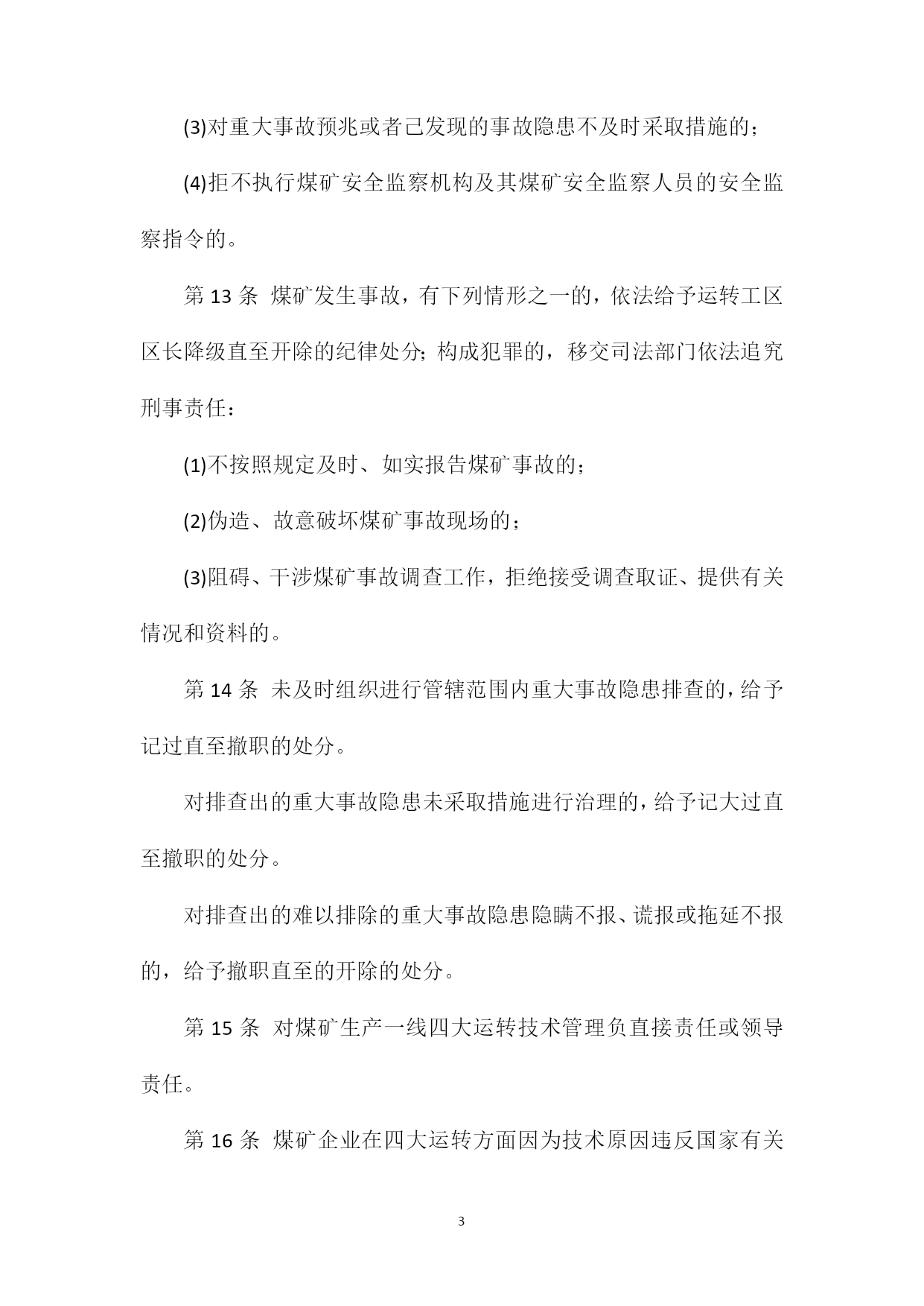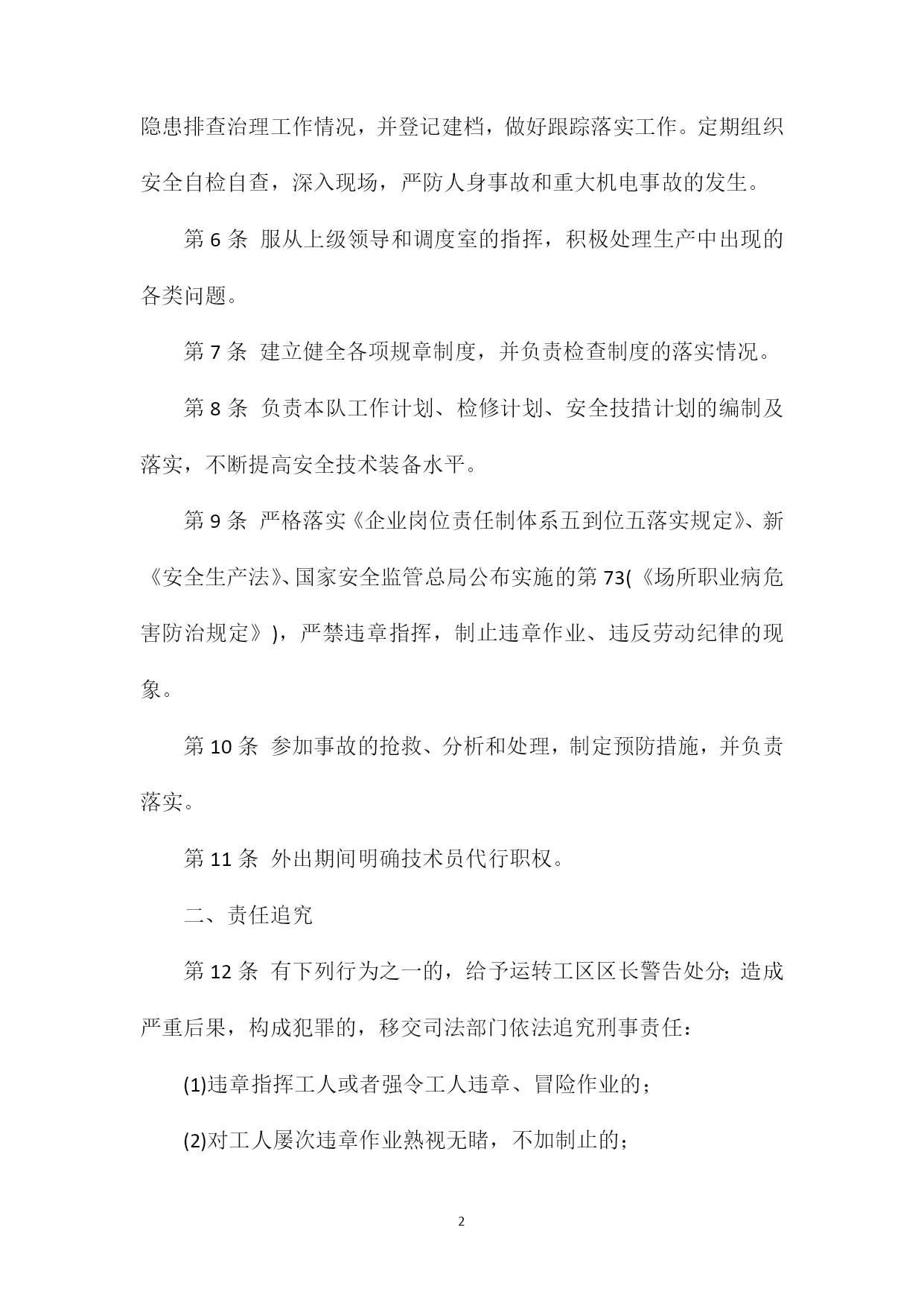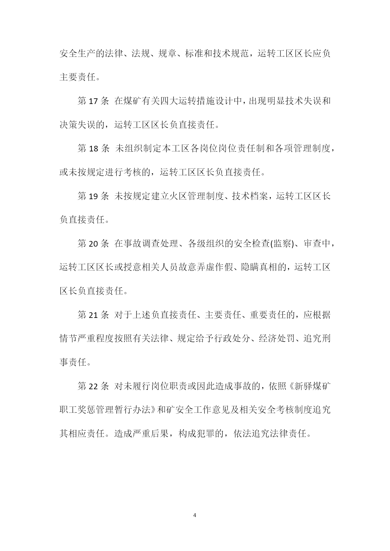 PAGEPAGE4机电工区区长岗位责任制机电工区区长岗位责任制机电工区区长是煤矿矿井四大运转安全技术管理的具体负责人,是煤矿矿井四大运转安全技术管理的第一责任者。运转工区区长必须熟练掌握煤矿安全专业知识并依法经过培训、取得安全资格证。一、岗位职责第1条区长是本区安全生产第一责任者,对全区的安全工作负责。第2条认真贯彻落实党的安全生产方针和上级安全指示、指令,严格遵守安全法律、法规和有关规章制度。第3条主持每周五的安全活动,传达贯彻矿各种安全会议文件精神,总结上周全队安全生产情况,布置安全工作,对存在的问题落实整改,保证安全生产。第4条切实抓好本队范围内设备的检查、维护、检修工作,提高设备完好率,确保机电设备安全运转。第5条负责矿井供电、提升、通风、压风、排水等系统的危险源辨识评估和安全风险分级管控工作。每天组织本队管理人员对本单位区域内的事故隐患进行排查一次,对排查出的事故隐患,按事故隐患分级采取有针对性措施进行整改,及时向有关领导和部门汇报事故隐患排查治理工作情况,并登记建档,做好跟踪落实工作。定期组织安全自检自查,深入现场,严防人身事故和重大机电事故的发生。第6条服从上级领导和调度室的指挥,积极处理生产中出现的各类问题。第7条建立健全各项规章制度,并负责检查制度的落实情况。第8条负责本队工作计划、检修计划、安全技措计划的编制及落实,不断提高安全技术装备水平。第9条严格落实《企业岗位责任制体系五到位五落实规定》、新《安全生产法》、国家安全监管总局公布实施的第73(《场所职业病危害防治规定》),严禁违章指挥,制止违章作业、违反劳动纪律的现象。第10条参加事故的抢救、分析和处理,制定预防措施,并负责落实。第11条外出期间明确技术员代行职权。二、责任追究第12条有下列行为之一的,给予运转工区区长警告处分;造成严重后果,构成犯罪的,移交司法部门依法追究刑事责任:(1)违章指挥工人或者强令工人违章、冒险作业的;(2)对工人屡次违章作业熟视无睹,不加制止的;(3)对重大事故预兆或者己发现的事故隐患不及时采取措施的;(4)拒不执行煤矿安全监察机构及其煤矿安全监察人员的安全监察指令的。第13条煤矿发生事故,有下列情形之一的,依法给予运转工区区长降级直至开除的纪律处分;构成犯罪的,移交司法部门依法追究刑事责任:(1)不按照规定及时、如实报告煤矿事故的;(2)伪造、故意破坏煤矿事故现场的;(3)阻碍、干涉煤矿事故调查工作,拒绝接受调查取证、提供有关情况和资料的。第14条未及时组织进行管辖范围内重大事故隐患排查的,给予记过直至撤职的处分。对排查出的重大事故隐患未采取措施进行治理的,给予记大过直至撤职的处分。对排查出的难以排除的重大事故隐患隐瞒不报、谎报或拖延不报的,给予撤职直至的开除的处分。第15条对煤矿生产一线四大运转技术管理负直接责任或领导责任。第16条煤矿企业在四大运转方面因为技术原因违反国家有关安全生产的法律、法规、规章、标准和技术规范,运转工区区长应负主要责任。第17条在煤矿有关四大运转措施设计中,出现明显技术失误和决策失误的,运转工区区长负直接责任。第18条未组织制定本工区各岗位岗位责任制和各项管理制度,或未按规定进行考核的,运转工区区长负直接责任。第19条未按规定建立火区管理制度、技术档案,运转工区区长负直接责任。第20条在事故调查处理、各级组织的安全检查(监察)、审查中,运转工区区长或授意相关人员故意弄虚作假、隐瞒真相的,运转工区区长负直接责任。第21条对于上述负直接责任、主要责任、重要责任的,应根据情节严重程度按照有关法律、规定给予行政处分、经济处罚、追究刑事责任。第22条对未履行岗位职责或因此造成事故的,依照《新驿煤矿职工奖惩管理暂行办法》和矿安全工作意见及相关安全考核制度追究其相应责任。造成严重后果,构成犯罪的,依法追究法律责任。