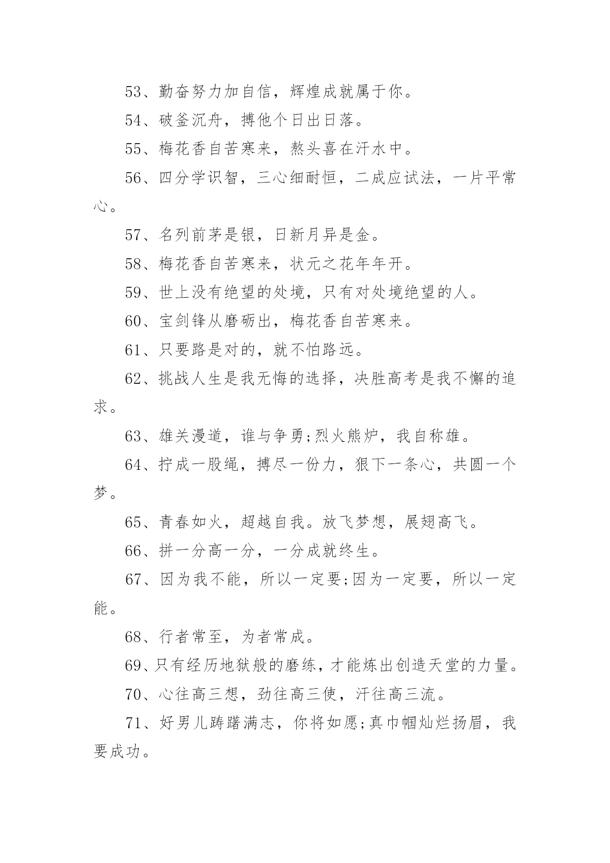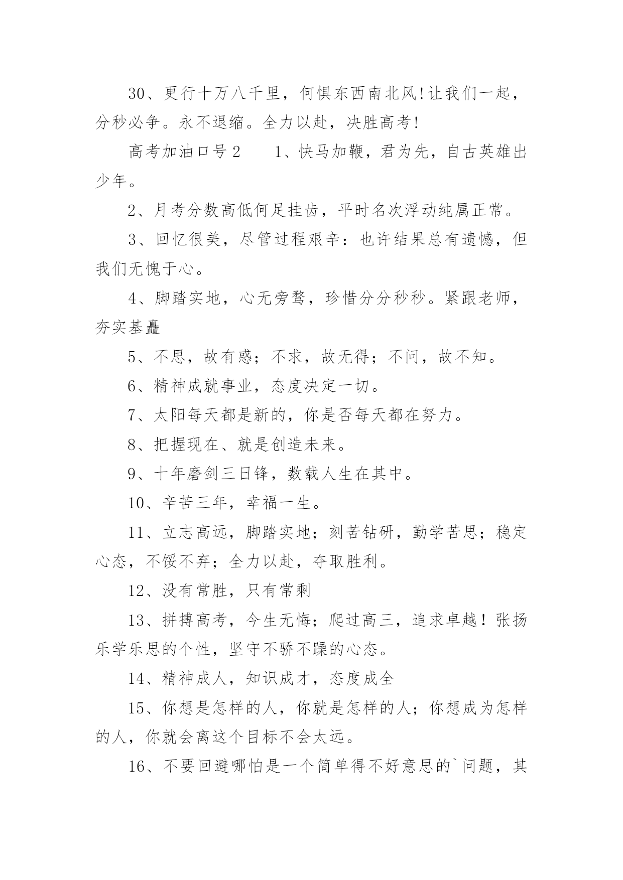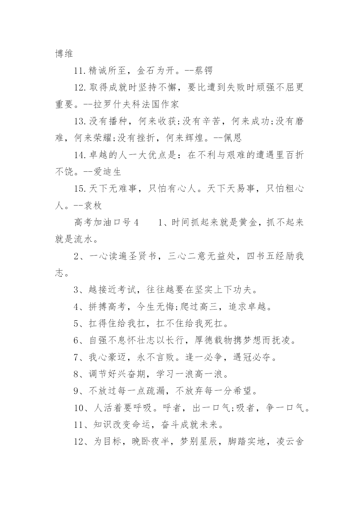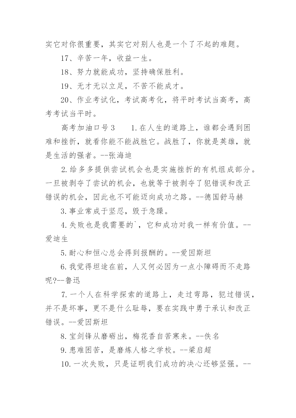 高考加油口号关于高考加油口号(精选160句)在学习、工作乃至生活中,大家都经常接触到口号吧,口号一般简短有力,富节奏感,指示明确。其实很多朋友都不太清楚什么样的口号才是好的口号,下面是小编整理的关于高考加油口号(精选160句),仅供参考,大家一起来看看吧。高考加油口号11、高考的意义是在于你真正投入的过程。请务必坚持信念,守得云开见月明!祝你们成功!2、同学们,这一百天,凝结着亲人期待的目光,凝结着十多年求学的汗水。同学们,为了我们高考的辉煌,我们再战一百天,百日努力,创造奇迹,三年不飞,一飞冲天,三年不鸣,一鸣惊人。让这一百天,成为我们最难忘,最珍贵的青春记忆。加油!3、百日竞渡,我们一直乘风破浪;十年磨剑,我们在此崭露锋芒!最后一百天,是可以创造奇迹的一百天;是改变人生的一百天。笑战高考是我们不懈的追求,苦战人生是我们无悔的选择。4、时光如箭,转眼距离高考只剩百日。面对百日时光,我们要用百分之百的努力取得百分之百的成功,成就百分之百优秀的自我!5、也许几张试卷不能否认你的青春,但它可以肯定你的付出。你努力与否,高考都会给你答案。加油少年,致敬高考!6、他们黑着脸做了坏人,被我们暗地里埋怨,可他们所做的一切,都是为了我们有一个更加明亮的未来。7、100天的拼搏可以创造奇迹,100天的奋斗足以铸就辉煌!十年寒窗苦读效三皇五帝逐群雄;一朝金榜题名成八斗奇才傲天下。我坚持!我自律!我胜利!8、十二年的坚持,十二年的拼搏,十二年的汗水,十二年的梦想。奋战最后一百天,让青春无悔;奋战最后一百天,让人生增光。9、相信你一定有信心,有能力,用自己惊人的毅力和意志,以锲而不舍的进取精神和顽强拼搏的战斗精神,实现自己的伟大梦想,考上你梦寐以求的大学,走上一条成功的道路。10、更科学的规划,会让你抢在时间前面,占得先机;更有效的落实,会帮助你们把每一分、每一秒都发挥出最大的价值。11、临渊羡鱼不如归而结网,从今天起,从现在起,拿起书本,那是你通向名校的阶梯。相濡以沫,相呴以湿,何若相忘于江湖;我们定会鲲鹏展翅,龙游四海。12、久有凌云志,此志可问天,心慕象牙塔,魂系梦亦牵,百万学子竞渡,扁扁小舟心几叶,风急浪无边。遂了心愿,何惜衣带宽,胜勇敢更坚,是好汉,一十二年将去,弹指一挥间,可上清华揽月,可上北大摘星,世上无难事,只要肯登攀。13、同学们,在学习生活中,也许还有荒漠沼泽,也许还有雨雪风霜,对于坚强的信念,艰辛也是一道绚丽的风光。14、你是父母的希望,也是教师、国家、社会的希望。你是有责任的,你应当承担起你的责任,你能做到。15、你,和大家一起,背上知识的行囊,带着青春的骄傲,即将走向年轻的战场。在这里,你以笔为刃,为自己战斗。在这里,你将给自己的努力,画上一个圆满的句号。16、唯有努力拼搏,才能不负青春。道阻且长,行则必至。同学们,隔空相见,我们一起呐喊:高考,加油!17、孩子,爸妈知道每年高考出分的时候,哭一批笑一批,只有上过大学的才知道,四年后的风骚,谁的天下,都别说得太早。18、狭路相逢勇者胜,希望你们拿出自信和亮剑精神,微笑着走向战场,超越自我、成就自我,去迎接属于自己的“高光时刻”!19、我们要坚持,要执着,要以高昂的斗志,百倍的信心,扎实的基础给自己一个自信的笑容!此情此景,有两种人必然成功,一种是自律的人,一种是自学能力强的人。20、我们的行为不断地重复之后,慢慢就变成了我们的习气,习气不断强化之后,就变成了我们的性格。21、海阔凭鱼跃,天高任鸟飞,又到高考时,千万别紧张。放松心态,沉着应对;冷静分析,机智灵活;先易后难,用心答题;步步为营,心气平和;发挥才智,如鱼得水。愿各位学子高考步步顺利,考出好成绩!22、我坚信,即便高考是座独木桥,我们凭借自己的努力,也一定能走在前排;我坚信,只要付出,就有收获,辛苦的汗水定能浇灌出累累的硕果;我坚信,皇天不负有心人,必胜的信念定能让我们赢得这场没有硝烟的`战争。来吧,成功属于爱拼搏的我们!23、我们看到,你也很努力,也很辛苦,但是这个世界没有成功,一切都等于零,读书的苦和累,比起现实生活的曲折残酷来说,不值一提。24、为了这次高考,我们历炼、准备了整整12年。12个春秋,流了多少汗水,花了多少精力,苦炼过硬的本领,为的是高考战场上能过关斩将,势如破竹夺桂冠!25、书山路漫漫,以勤奋为首,学海苦茫茫,须刻苦当先。你们要珍惜现在的条件,乘着网络的快车,充实自我,发展自己。26、同学们,一定要记住:无论什么时候开始,重要的是开始之后就不要停止;无论什么时候结束,重要的是结束之后就不要悔恨。27、最后100天,让我们信心满怀,自律自强,勤学苦练,百炼成钢,共待六月齐展笑颜!28、高考,便是老师父母口中“光明前途的出口”,而为了光明的前途,我们必须寒窗苦读十二年,肆意播洒汗水,收获无尽成