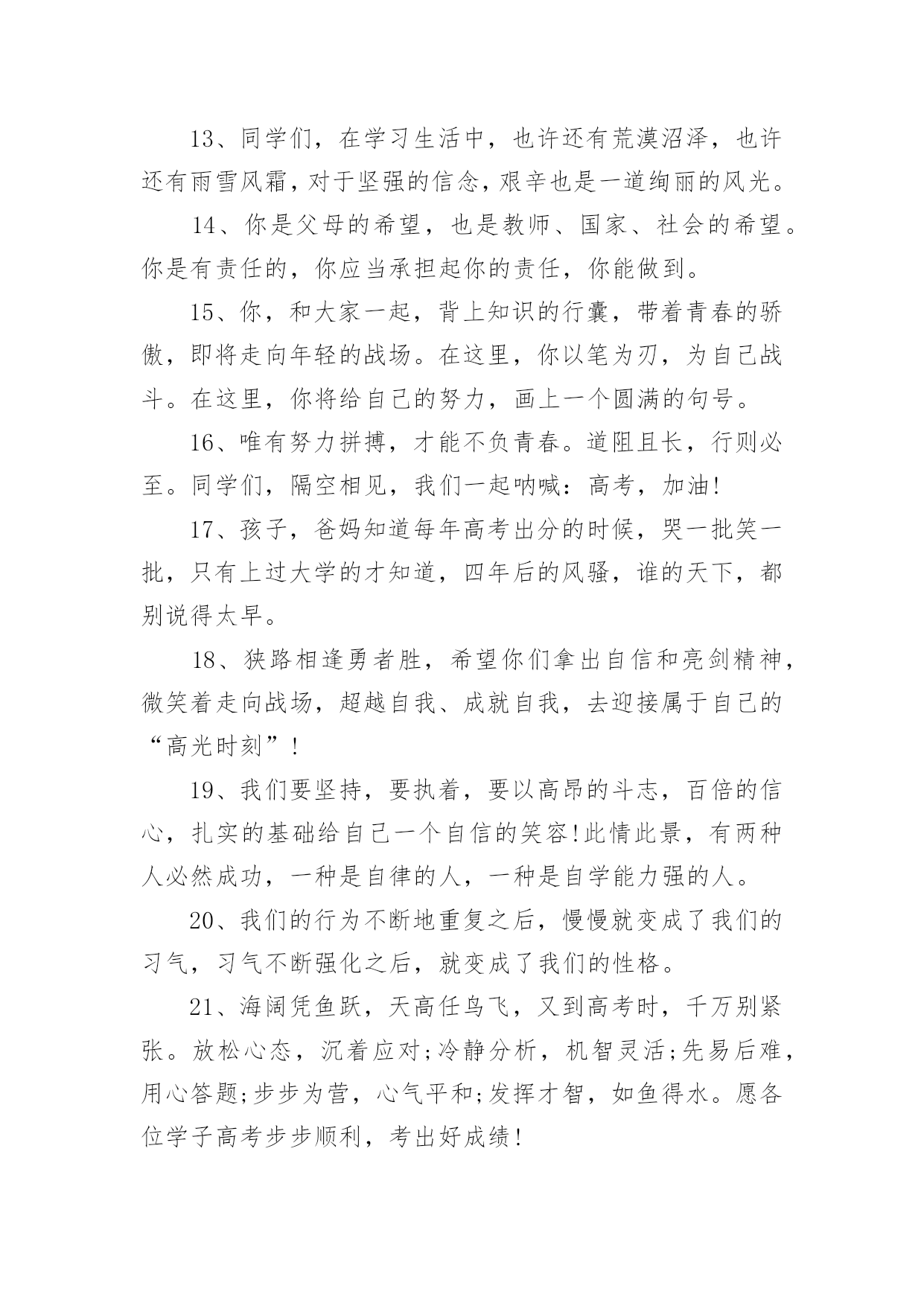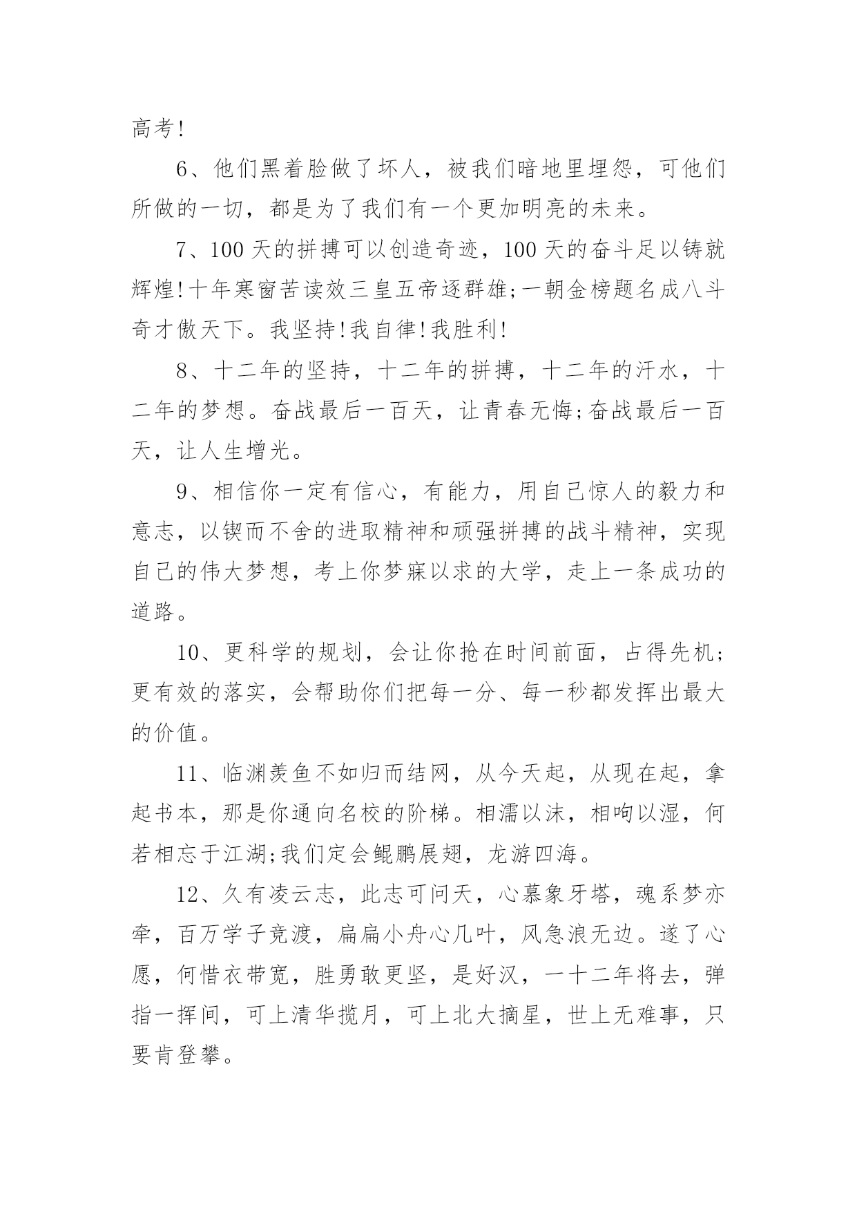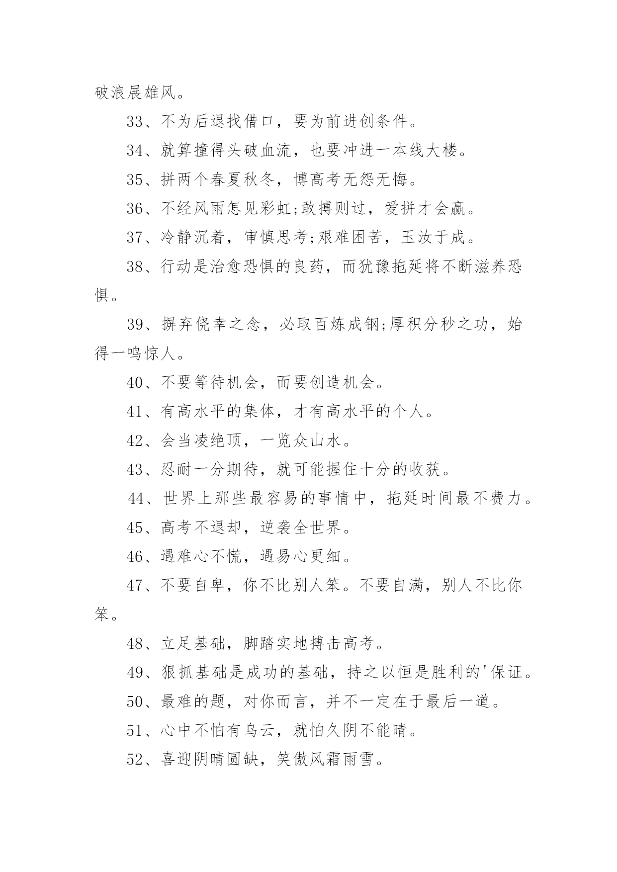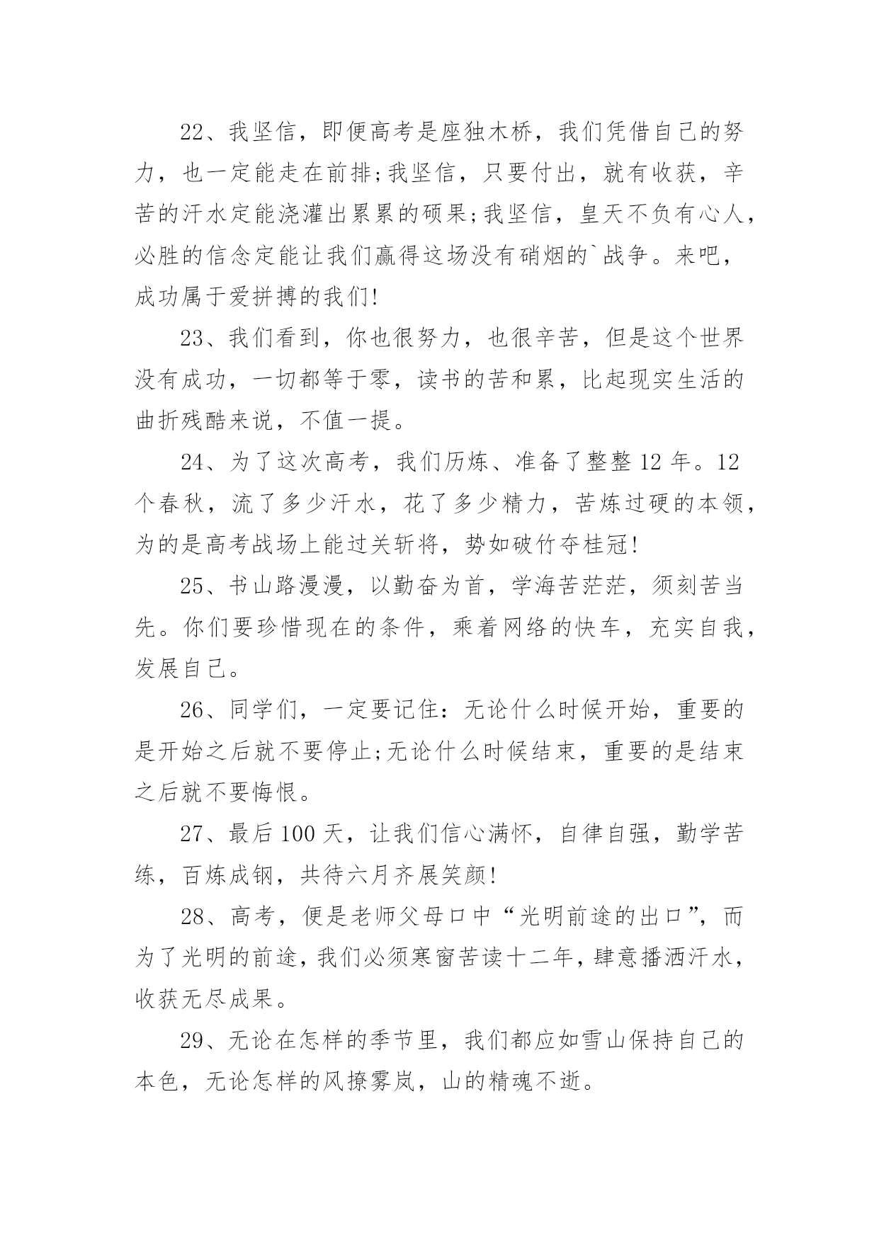 高考加油口号关于高考加油口号(精选160句)在学习、工作乃至生活中,大家都经常接触到口号吧,口号一般简短有力,富节奏感,指示明确。其实很多朋友都不太清楚什么样的口号才是好的口号,下面是小编整理的关于高考加油口号(精选160句),仅供参考,大家一起来看看吧。高考加油口号11、高考的意义是在于你真正投入的过程。请务必坚持信念,守得云开见月明!祝你们成功!2、同学们,这一百天,凝结着亲人期待的目光,凝结着十多年求学的汗水。同学们,为了我们高考的辉煌,我们再战一百天,百日努力,创造奇迹,三年不飞,一飞冲天,三年不鸣,一鸣惊人。让这一百天,成为我们最难忘,最珍贵的青春记忆。加油!3、百日竞渡,我们一直乘风破浪;十年磨剑,我们在此崭露锋芒!最后一百天,是可以创造奇迹的一百天;是改变人生的一百天。笑战高考是我们不懈的追求,苦战人生是我们无悔的选择。4、时光如箭,转眼距离高考只剩百日。面对百日时光,我们要用百分之百的努力取得百分之百的成功,成就百分之百优秀的自我!5、也许几张试卷不能否认你的青春,但它可以肯定你的付出。你努力与否,高考都会给你答案。加油少年,致敬高考!6、他们黑着脸做了坏人,被我们暗地里埋怨,可他们所做的一切,都是为了我们有一个更加明亮的未来。7、100天的拼搏可以创造奇迹,100天的奋斗足以铸就辉煌!十年寒窗苦读效三皇五帝逐群雄;一朝金榜题名成八斗奇才傲天下。我坚持!我自律!我胜利!8、十二年的坚持,十二年的拼搏,十二年的汗水,十二年的梦想。奋战最后一百天,让青春无悔;奋战最后一百天,让人生增光。9、相信你一定有信心,有能力,用自己惊人的毅力和意志,以锲而不舍的进取精神和顽强拼搏的战斗精神,实现自己的伟大梦想,考上你梦寐以求的大学,走上一条成功的道路。10、更科学的规划,会让你抢在时间前面,占得先机;更有效的落实,会帮助你们把每一分、每一秒都发挥出最大的价值。11、临渊羡鱼不如归而结网,从今天起,从现在起,拿起书本,那是你通向名校的阶梯。相濡以沫,相呴以湿,何若相忘于江湖;我们定会鲲鹏展翅,龙游四海。12、久有凌云志,此志可问天,心慕象牙塔,魂系梦亦牵,百万学子竞渡,扁扁小舟心几叶,风急浪无边。遂了心愿,何惜衣带宽,胜勇敢更坚,是好汉,一十二年将去,弹指一挥间,可上清华揽月,可上北大摘星,世上无难事,只要肯登攀。13、同学们,在学习生活中,也许还有荒漠沼泽,也许还有雨雪风霜,对于坚强的信念,艰辛也是一道绚丽的风光。14、你是父母的希望,也是教师、国家、社会的希望。你是有责任的,你应当承担起你的责任,你能做到。15、你,和大家一起,背上知识的行囊,带着青春的骄傲,即将走向年轻的战场。在这里,你以笔为刃,为自己战斗。在这里,你将给自己的努力,画上一个圆满的句号。16、唯有努力拼搏,才能不负青春。道阻且长,行则必至。同学们,隔空相见,我们一起呐喊:高考,加油!17、孩子,爸妈知道每年高考出分的时候,哭一批笑一批,只有上过大学的才知道,四年后的风骚,谁的天下,都别说得太早。18、狭路相逢勇者胜,希望你们拿出自信和亮剑精神,微笑着走向战场,超越自我、成就自我,去迎接属于自己的“高光时刻”!19、我们要坚持,要执着,要以高昂的斗志,百倍的信心,扎实的基础给自己一个自信的笑容!此情此景,有两种人必然成功,一种是自律的人,一种是自学能力强的人。20、我们的行为不断地重复之后,慢慢就变成了我们的习气,习气不断强化之后,就变成了我们的性格。21、海阔凭鱼跃,天高任鸟飞,又到高考时,千万别紧张。放松心态,沉着应对;冷静分析,机智灵活;先易后难,用心答题;步步为营,心气平和;发挥才智,如鱼得水。愿各位学子高考步步顺利,考出好成绩!22、我坚信,即便高考是座独木桥,我们凭借自己的努力,也一定能走在前排;我坚信,只要付出,就有收获,辛苦的汗水定能浇灌出累累的硕果;我坚信,皇天不负有心人,必胜的信念定能让我们赢得这场没有硝烟的`战争。来吧,成功属于爱拼搏的我们!23、我们看到,你也很努力,也很辛苦,但是这个世界没有成功,一切都等于零,读书的苦和累,比起现实生活的曲折残酷来说,不值一提。24、为了这次高考,我们历炼、准备了整整12年。12个春秋,流了多少汗水,花了多少精力,苦炼过硬的本领,为的是高考战场上能过关斩将,势如破竹夺桂冠!25、书山路漫漫,以勤奋为首,学海苦茫茫,须刻苦当先。你们要珍惜现在的条件,乘着网络的快车,充实自我,发展自己。26、同学们,一定要记住:无论什么时候开始,重要的是开始之后就不要停止;无论什么时候结束,重要的是结束之后就不要悔恨。27、最后100天,让我们信心满怀,自律自强,勤学苦练,百炼成钢,共待六月齐展笑颜!28、高考,便是老师父母口中“光明前途的出口”,而为了光明的前途,我们必须寒窗苦读十二年,肆意播洒汗水,收获无尽成