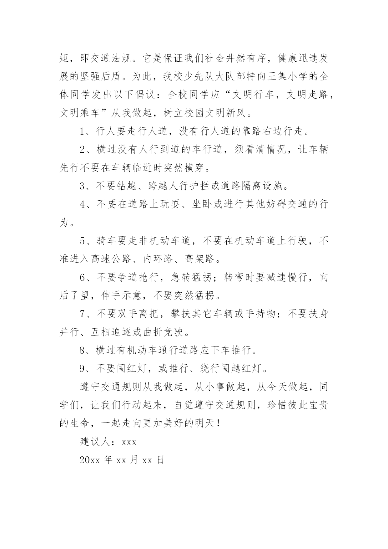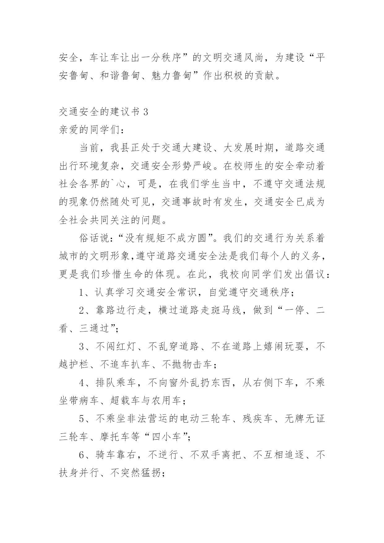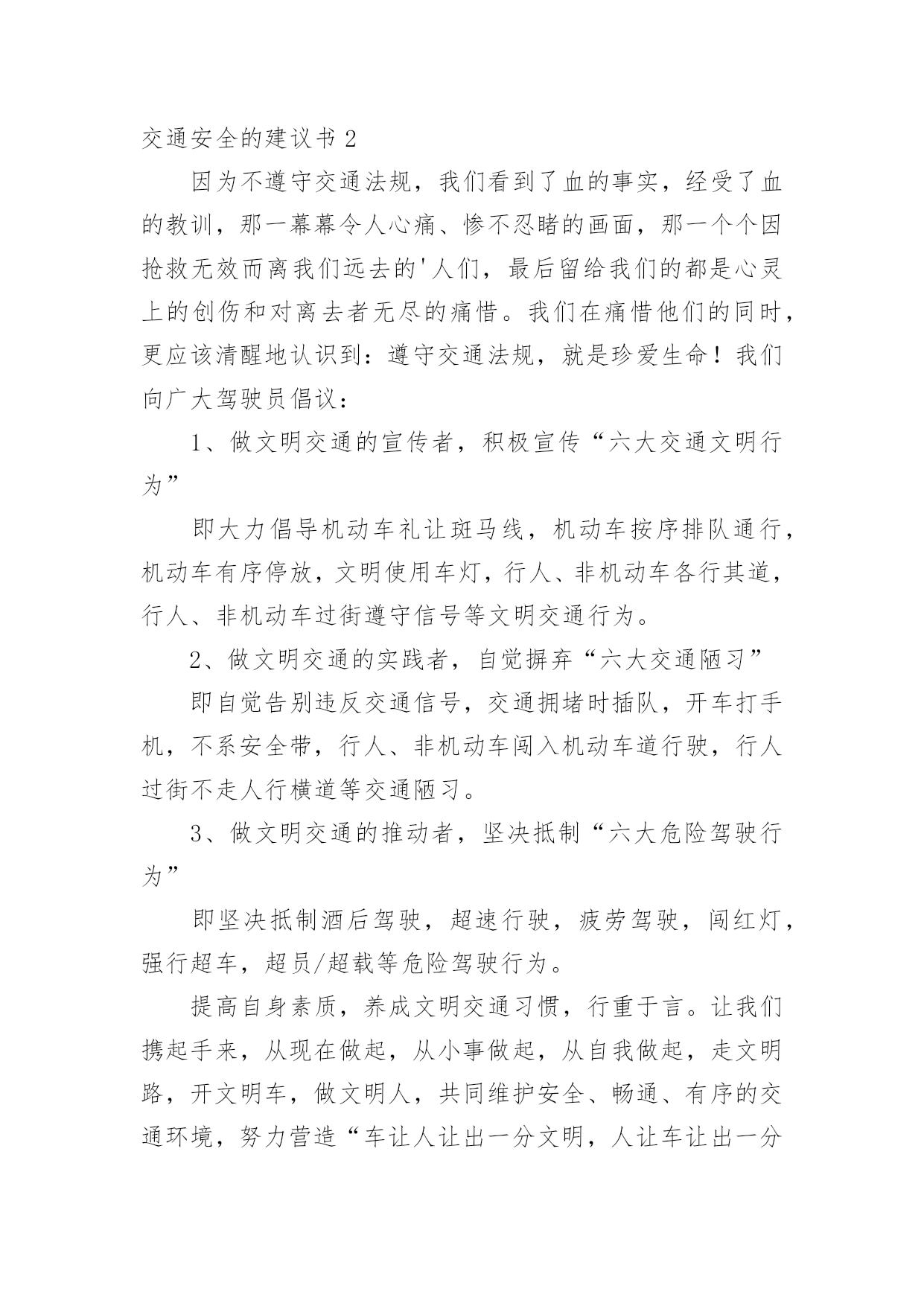 交通安全的建议书在不断进步的时代,能够利用到建议书的场合越来越多,使用正确的写作思路书写建议书会更加事半功倍。你写建议书时总是没有新意?以下是小编精心整理的交通安全的建议书,仅供参考,希望能够帮助到大家。交通安全的建议书1各位同学:你们好!我们生活在这样一个喧嚣繁华的城市里,我们每天来往于生活区、教学区和其他场所之间,在那行人车辆拥挤的街道上,你是否看到了潜藏在我们每日行走的交通路线上的危险呢?因为不遵守交通法规,我们看到了血的事实,经受了血的教训,那一幕幕令人心痛、惨不忍睹的`画面,那一个个因抢救无效而离我们远去的人们,最后留给我们的都是心灵上的创伤和对离去者无尽的痛惜。我们在痛惜他们的同时,更应该清醒地认识到:遵守交通法规,就是珍爱生命!下面这组数字让人确信,“车祸猛于虎”决不是危言耸听,交通事故就在你我身边。20xx年全国共发生道路交通事故567753起,造成99217人死亡,451810人受伤,直接经济损失27亿元。俗话说得好:”无规矩不成方圆”。因此,凡是在马路上进行与交通有关的活动的人都不能随心所欲,都必须严守规矩,即交通法规。它是保证我们社会井然有序,健康迅速发展的坚强后盾。为此,我校少先队大队部特向王集小学的全体同学发出以下倡议:全校同学应“文明行车,文明走路,文明乘车”从我做起,树立校园文明新风。1、行人要走行人道,没有行人道的靠路右边行走。2、横过没有人行到道的车行道,须看清情况,让车辆先行不要在车辆临近时突然横穿。3、不要钻越、跨越人行护拦或道路隔离设施。4、不要在道路上玩耍、坐卧或进行其他妨碍交通的行为。5、骑车要走非机动车道,不要在机动车道上行驶,不准进入高速公路、内环路、高架路。6、不要争道抢行,急转猛拐;转弯时要减速慢行,向后了望,伸手示意,不要突然猛拐。7、不要双手离把,攀扶其它车辆或手持物;不要扶身并行、互相追逐或曲折竞驶。8、横过有机动车通行道路应下车推行。9、不要闯红灯,或推行、绕行闯越红灯。遵守交通规则从我做起,从小事做起,从今天做起,同学们,让我们行动起来,自觉遵守交通规则,珍惜彼此宝贵的生命,一起走向更加美好的明天!建议人:xxx20xx年xx月xx日交通安全的建议书2因为不遵守交通法规,我们看到了血的事实,经受了血的教训,那一幕幕令人心痛、惨不忍睹的画面,那一个个因抢救无效而离我们远去的'人们,最后留给我们的都是心灵上的创伤和对离去者无尽的痛惜。我们在痛惜他们的同时,更应该清醒地认识到:遵守交通法规,就是珍爱生命!我们向广大驾驶员倡议:1、做文明交通的宣传者,积极宣传“六大交通文明行为”即大力倡导机动车礼让斑马线,机动车按序排队通行,机动车有序停放,文明使用车灯,行人、非机动车各行其道,行人、非机动车过街遵守信号等文明交通行为。2、做文明交通的实践者,自觉摒弃“六大交通陋习”即自觉告别违反交通信号,交通拥堵时插队,开车打手机,不系安全带,行人、非机动车闯入机动车道行驶,行人过街不走人行横道等交通陋习。3、做文明交通的推动者,坚决抵制“六大危险驾驶行为”即坚决抵制酒后驾驶,超速行驶,疲劳驾驶,闯红灯,强行超车,超员/超载等危险驾驶行为。提高自身素质,养成文明交通习惯,行重于言。让我们携起手来,从现在做起,从小事做起,从自我做起,走文明路,开文明车,做文明人,共同维护安全、畅通、有序的交通环境,努力营造“车让人让出一分文明,人让车让出一分安全,车让车让出一分秩序”的文明交通风尚,为建设“平安鲁甸、和谐鲁甸、魅力鲁甸”作出积极的贡献。交通安全的建议书3亲爱的同学们:当前,我县正处于交通大建设、大发展时期,道路交通出行环境复杂,交通安全形势严峻。在校师生的安全牵动着社会各界的`心,可是,在我们学生当中,不遵守交通法规的现象仍然随处可见,交通事故时有发生,交通安全已成为全社会共同关注的问题。俗话说:“没有规矩不成方圆”。我们的交通行为关系着城市的文明形象,遵守道路交通安全法是我们每个人的义务,更是我们珍惜生命的体现。在此,我校向同学们发出倡议:1、认真学习交通安全常识,自觉遵守交通秩序;2、靠路边行走,横过道路走斑马线,做到“一停、二看、三通过”;3、不闯红灯、不乱穿道路、不在道路上嬉闹玩耍,不越护栏、不追车扒车、不抛物击车;4、排队乘车,不向窗外乱扔东西,从右侧下车,不乘坐带病车、超载车与农用车;5、不乘坐非法营运的电动三轮车、残疾车、无牌无证三轮车、摩托车等“四小车”;6、骑车靠右,不逆行、不双手离把、不互相追逐、不扶身并行、不突然猛拐;7、遇交通违法行为及时纠正,遇交通事故主动报警;8、主动宣传交通安全法规,积极参加交通安全社会公益活动。同学们,让我们从现在做起,从自己做起,共同创造一个更加安全、与谐、有序的交通环境。让我们高高兴兴出门,平平安安回家!