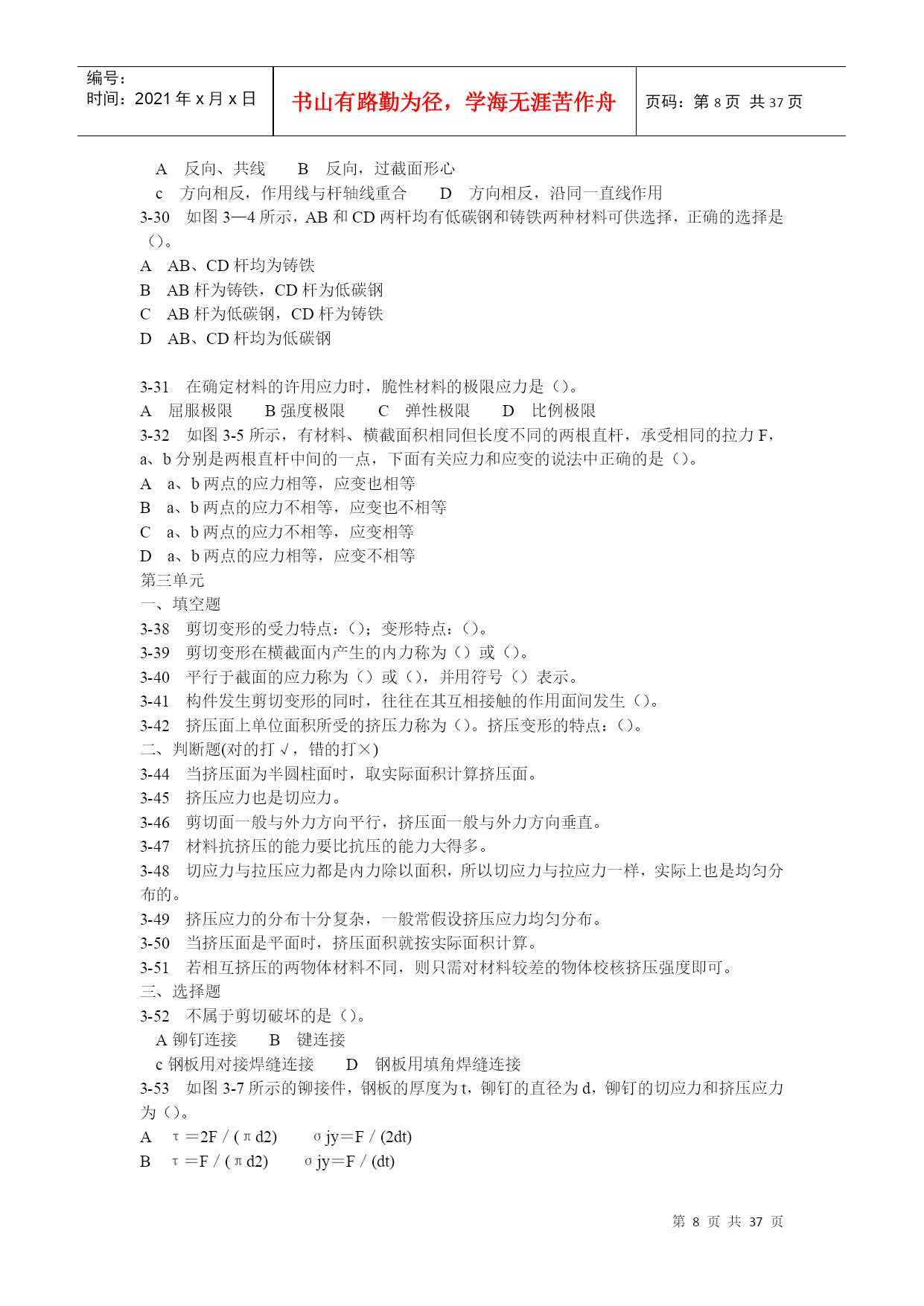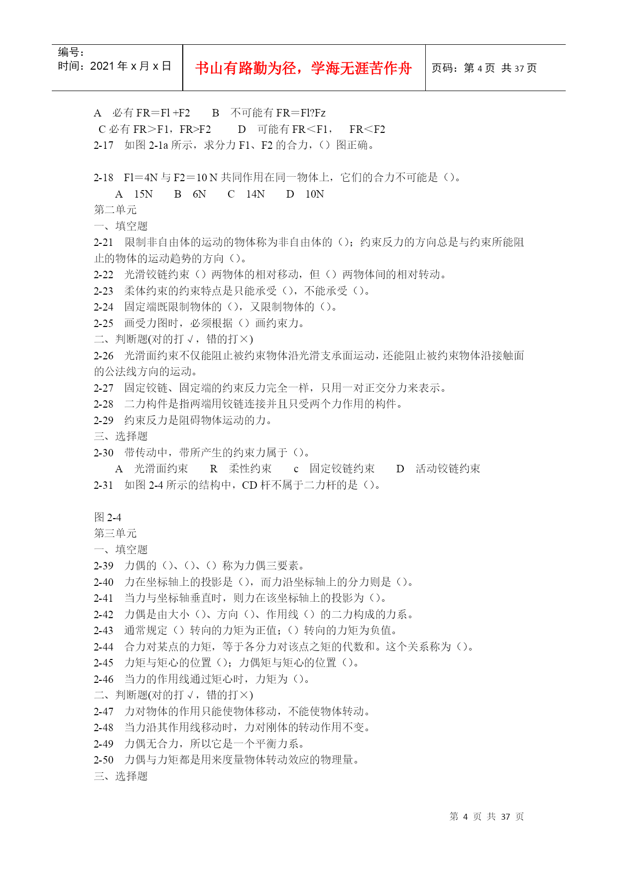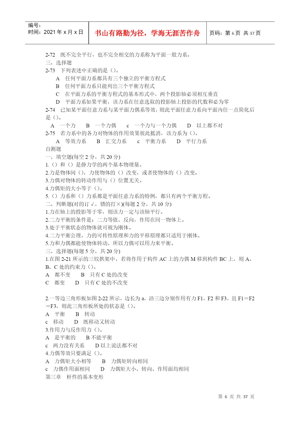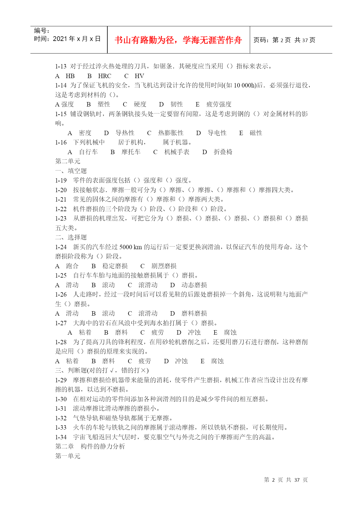 编号:时间:2021年x月x日书山有路勤为径,学海无涯苦作舟页码:第PAGE37页共NUMPAGES37页第PAGE\*MERGEFORMAT37页共NUMPAGES\*MERGEFORMAT37页绪论一、选择题1机械基础是一门机械专业的基础课。A必修的B综合的C理论的D选修的2常用的机械设备和工程部件都是由许多组成的。A零件B构件C钢件D合金钢3工程力学为分析构件的、刚度和稳定性提供了基本理论与方法。A强度B寿命C受力D机械性能4机器由若干组成。A零件B部件C传动机构D齿轮5自行车的传动机构有。A1个(链传动)B2个(链传动和棘轮机构)C3个(链传动、棘轮机构、前后轴承)D4个(链传动、棘轮机构、前后轴承、脚踏板)6本课程包括的内容有等多方面的内容。A工程力学B工程力学、机械工程材料c工程力学、机械零件与传动D工程力学、机械工程材料、机械零件与传动第一章机械概述第一单元一、填空题1-1机械由部分、部分、分组成。1-2构件是指相互之间能作相对()的单元。1-3零件是机械系统的()单元。1-4机构是人工的构件组合,各部分之间具有确定的()。1-5金属材料包括()性能、()性能、()性能和()性能。1-6化学性能包括()性、()性和()性。1-7力学性能包括()、()、()、()和()强度。1-8工艺性能包括()性、()性或()性和()。二、选择题1-9下列机件中()属于构件,()属于零件。A自行车前后轮整体B自行车车架C钢圈D链条1-10汽车中()是原动机部分,()是执行部分,()是传动部分,()是操纵部分或控制部分。A方向盘D变速箱C车轮D内燃机1-11金属材料在静载荷作用下抵抗破坏的能力称为()。A塑性B硬度C强度D刚度1-12硬度是衡量金属材料软硬的一个指标,它常用三种表示方法,其中()应用最广。AHBBHRCCHV1-13对于经过淬火热处理的刀具,如锯条.其硬度应当采用()指标来表示。AHBBHRCCHV1-14为了保证飞机的安全,当飞机达到设计允许的使用时间(如10000h)后.必须强行退役,这是考虑到材料的()。A强度B塑性C硬度D韧性E疲劳强度1-15铺设钢轨时,两条钢轨接头处一定要留有间隙,这是考虑到钢的()对金属材料的影响。A密度D导热性C热膨胀性D导电性E磁性1-16下列机械中居于机构,属于机器。A自行车B摩托车C机械手表D折叠椅第二单元一、填空题1-19零件的表面强度包括()强度和()强度。1-20按接触状态.摩擦一般可分为()摩擦、()摩擦、()摩擦和()摩擦四大类。1-21常见的固体之间的摩擦有()摩擦和()摩擦两大类。1-22机件磨损的三个阶段为()阶段、()阶段和()阶段。1-23从磨损的机理出发,可把它分为()磨损、()磨损、()磨损、()磨损和()磨损五大类。二、选择题1-24新买的汽车经过5000km的运行后一定要更换润滑油,以保证汽车的使用寿命,这个磨损阶段称为()阶段。A跑合B稳定磨损C剧烈磨损1-25自行车车胎与地面的接触磨损属于()磨损。A滑动B滚动C滚滑动D动态磨损1-26人走路时,经过一段时间后可以看见鞋的后跟处磨损掉一个斜角,这说明鞋与地面产生()磨损。A滑动B滚动C滚滑动D磨料磨损1-27大海中的岩石在风浪中受到海水拍打属于()磨损。A粘着B磨料C疲劳D冲蚀E腐蚀1-28为了提高刀具的锋利程度,在用砂轮机磨削之后,还要用磨刀石进行磨削,这种磨削是应用()磨损的原理来实现的。A粘着B磨料C疲劳D冲蚀E腐蚀三、判断题(对的打√,错的打×)1-29摩擦和磨损给机器带来能量的消耗,使零件产生磨损,机械工作者应当设计出没有摩擦的机器,以达到不磨损。1-30在相对运动的零件间添加各种润滑剂的目的是减少零件间的相互磨损。1-31滚动摩擦比滑动摩擦的磨损小。1-32气垫导轨和磁垫导轨都属于无摩擦。1-33火车的车轮与铁轨之间的摩擦属于滚动摩擦,所以铁轨不磨损,可长期使用。1-34宇宙飞船返回大气层时,要克服空气与外壳之间的干摩擦而产生的高温。第二章构件的静力分析第一单元一、填空题2—1力的()、()、()称为力的三要素,所以说力是()。2—2所谓刚体是指在力的作用下()的物体。2—3作用在刚体上的力可沿其作用线任意移动,而()力对刚体的作用效果。2—4力对物体的作用效果一般分为()效应和()效应。静力学主要研究力对刚体的()效应。二、判断题(对的打√,错的打M)2-5如果物体相对于地面保持静止或匀速运动状态,则物体处于平衡。2-6物体的平衡是绝对的平衡。2-7加减平衡力系公理和力的可移性原理适