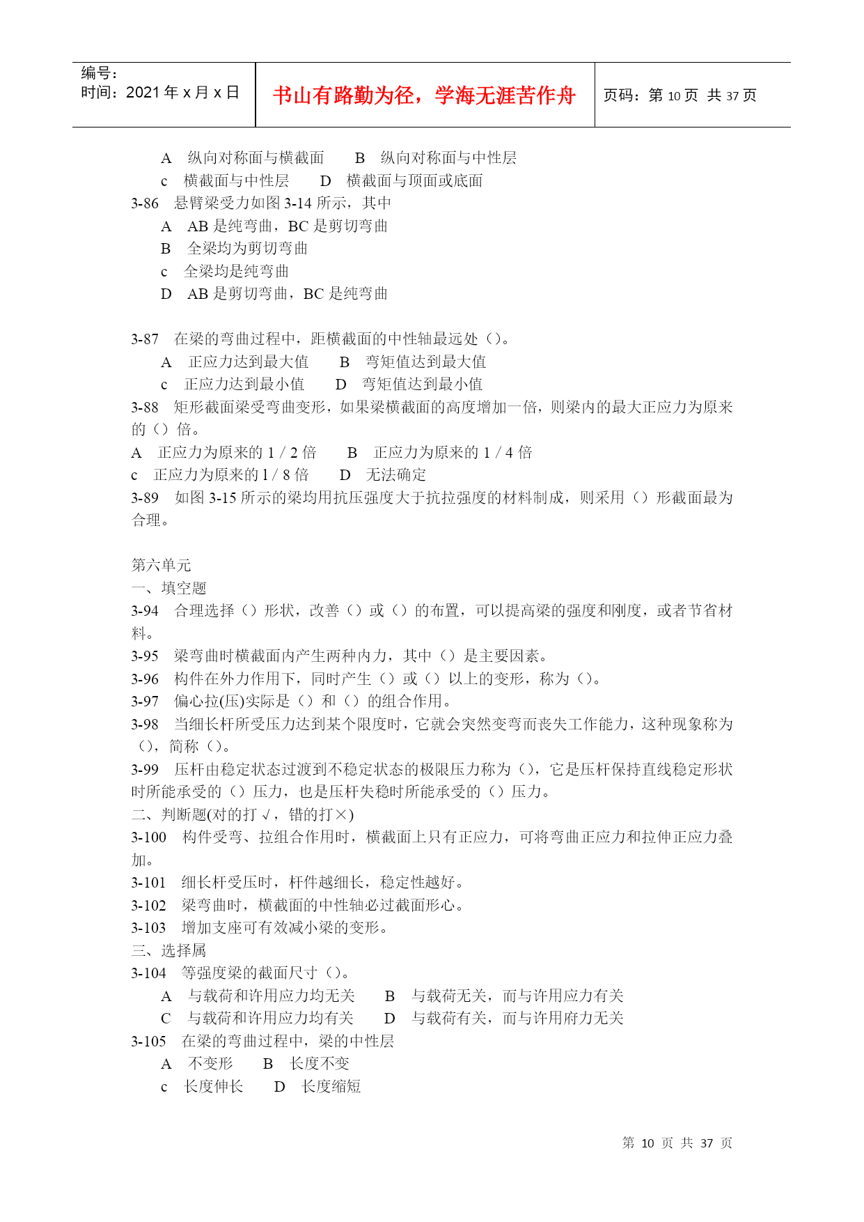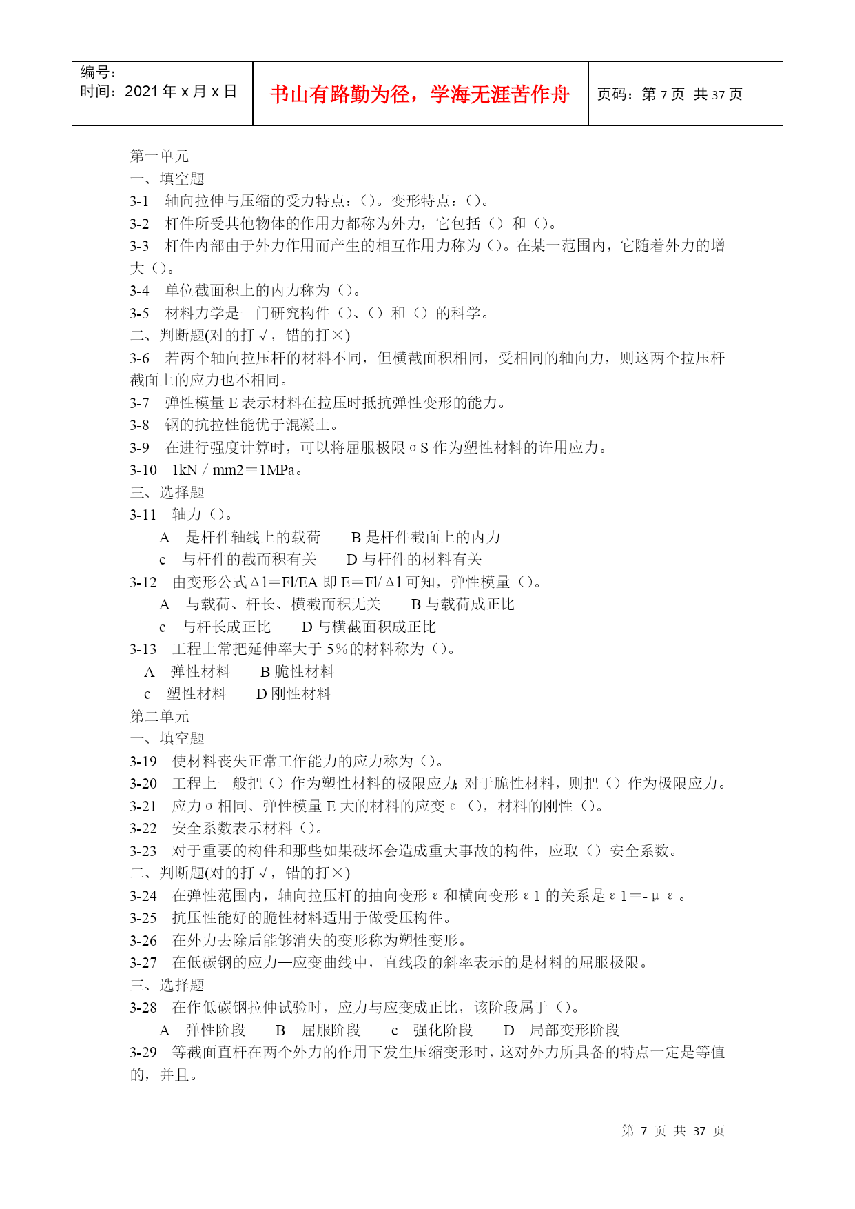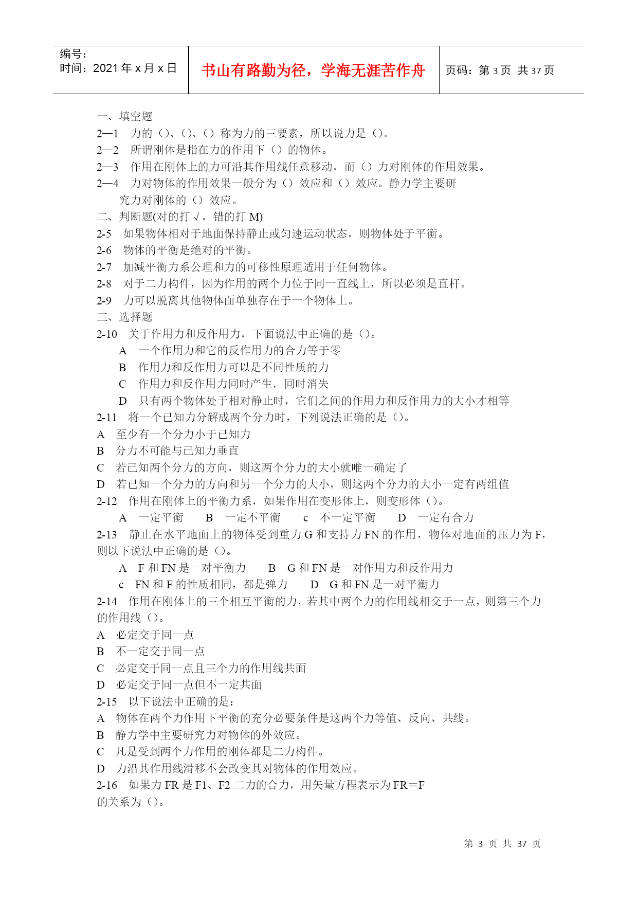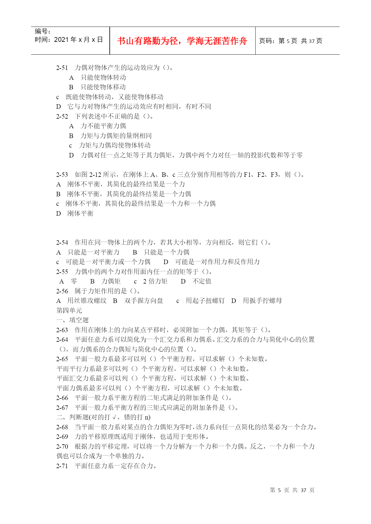 编号:时间:2021年x月x日书山有路勤为径,学海无涯苦作舟页码:第PAGE37页共NUMPAGES37页第PAGE\*MERGEFORMAT37页共NUMPAGES\*MERGEFORMAT37页绪论一、选择题1机械基础是一门机械专业的基础课。A必修的B综合的C理论的D选修的2常用的机械设备和工程部件都是由许多组成的。A零件B构件C钢件D合金钢3工程力学为分析构件的、刚度和稳定性提供了基本理论与方法。A强度B寿命C受力D机械性能4机器由若干组成。A零件B部件C传动机构D齿轮5自行车的传动机构有。A1个(链传动)B2个(链传动和棘轮机构)C3个(链传动、棘轮机构、前后轴承)D4个(链传动、棘轮机构、前后轴承、脚踏板)6本课程包括的内容有等多方面的内容。A工程力学B工程力学、机械工程材料c工程力学、机械零件与传动D工程力学、机械工程材料、机械零件与传动第一章机械概述第一单元一、填空题1-1机械由部分、部分、分组成。1-2构件是指相互之间能作相对()的单元。1-3零件是机械系统的()单元。1-4机构是人工的构件组合,各部分之间具有确定的()。1-5金属材料包括()性能、()性能、()性能和()性能。1-6化学性能包括()性、()性和()性。1-7力学性能包括()、()、()、()和()强度。1-8工艺性能包括()性、()性或()性和()。二、选择题1-9下列机件中()属于构件,()属于零件。A自行车前后轮整体B自行车车架C钢圈D链条1-10汽车中()是原动机部分,()是执行部分,()是传动部分,()是操纵部分或控制部分。A方向盘D变速箱C车轮D内燃机1-11金属材料在静载荷作用下抵抗破坏的能力称为()。A塑性B硬度C强度D刚度1-12硬度是衡量金属材料软硬的一个指标,它常用三种表示方法,其中()应用最广。AHBBHRCCHV1-13对于经过淬火热处理的刀具,如锯条.其硬度应当采用()指标来表示。AHBBHRCCHV1-14为了保证飞机的安全,当飞机达到设计允许的使用时间(如10000h)后.必须强行退役,这是考虑到材料的()。A强度B塑性C硬度D韧性E疲劳强度1-15铺设钢轨时,两条钢轨接头处一定要留有间隙,这是考虑到钢的()对金属材料的影响。A密度D导热性C热膨胀性D导电性E磁性1-16下列机械中居于机构,属于机器。A自行车B摩托车C机械手表D折叠椅第二单元一、填空题1-19零件的表面强度包括()强度和()强度。1-20按接触状态.摩擦一般可分为()摩擦、()摩擦、()摩擦和()摩擦四大类。1-21常见的固体之间的摩擦有()摩擦和()摩擦两大类。1-22机件磨损的三个阶段为()阶段、()阶段和()阶段。1-23从磨损的机理出发,可把它分为()磨损、()磨损、()磨损、()磨损和()磨损五大类。二、选择题1-24新买的汽车经过5000km的运行后一定要更换润滑油,以保证汽车的使用寿命,这个磨损阶段称为()阶段。A跑合B稳定磨损C剧烈磨损1-25自行车车胎与地面的接触磨损属于()磨损。A滑动B滚动C滚滑动D动态磨损1-26人走路时,经过一段时间后可以看见鞋的后跟处磨损掉一个斜角,这说明鞋与地面产生()磨损。A滑动B滚动C滚滑动D磨料磨损1-27大海中的岩石在风浪中受到海水拍打属于()磨损。A粘着B磨料C疲劳D冲蚀E腐蚀1-28为了提高刀具的锋利程度,在用砂轮机磨削之后,还要用磨刀石进行磨削,这种磨削是应用()磨损的原理来实现的。A粘着B磨料C疲劳D冲蚀E腐蚀三、判断题(对的打√,错的打×)1-29摩擦和磨损给机器带来能量的消耗,使零件产生磨损,机械工作者应当设计出没有摩擦的机器,以达到不磨损。1-30在相对运动的零件间添加各种润滑剂的目的是减少零件间的相互磨损。1-31滚动摩擦比滑动摩擦的磨损小。1-32气垫导轨和磁垫导轨都属于无摩擦。1-33火车的车轮与铁轨之间的摩擦属于滚动摩擦,所以铁轨不磨损,可长期使用。1-34宇宙飞船返回大气层时,要克服空气与外壳之间的干摩擦而产生的高温。第二章构件的静力分析第一单元一、填空题2—1力的()、()、()称为力的三要素,所以说力是()。2—2所谓刚体是指在力的作用下()的物体。2—3作用在刚体上的力可沿其作用线任意移动,而()力对刚体的作用效果。2—4力对物体的作用效果一般分为()效应和()效应。静力学主要研究力对刚体的()效应。二、判断题(对的打√,错的打M)2-5如果物体相对于地面保持静止或匀速运动状态,则物体处于平衡。2-6物体的平衡是绝对的平衡。2-7加减平衡力系公理和力的可移性原理适