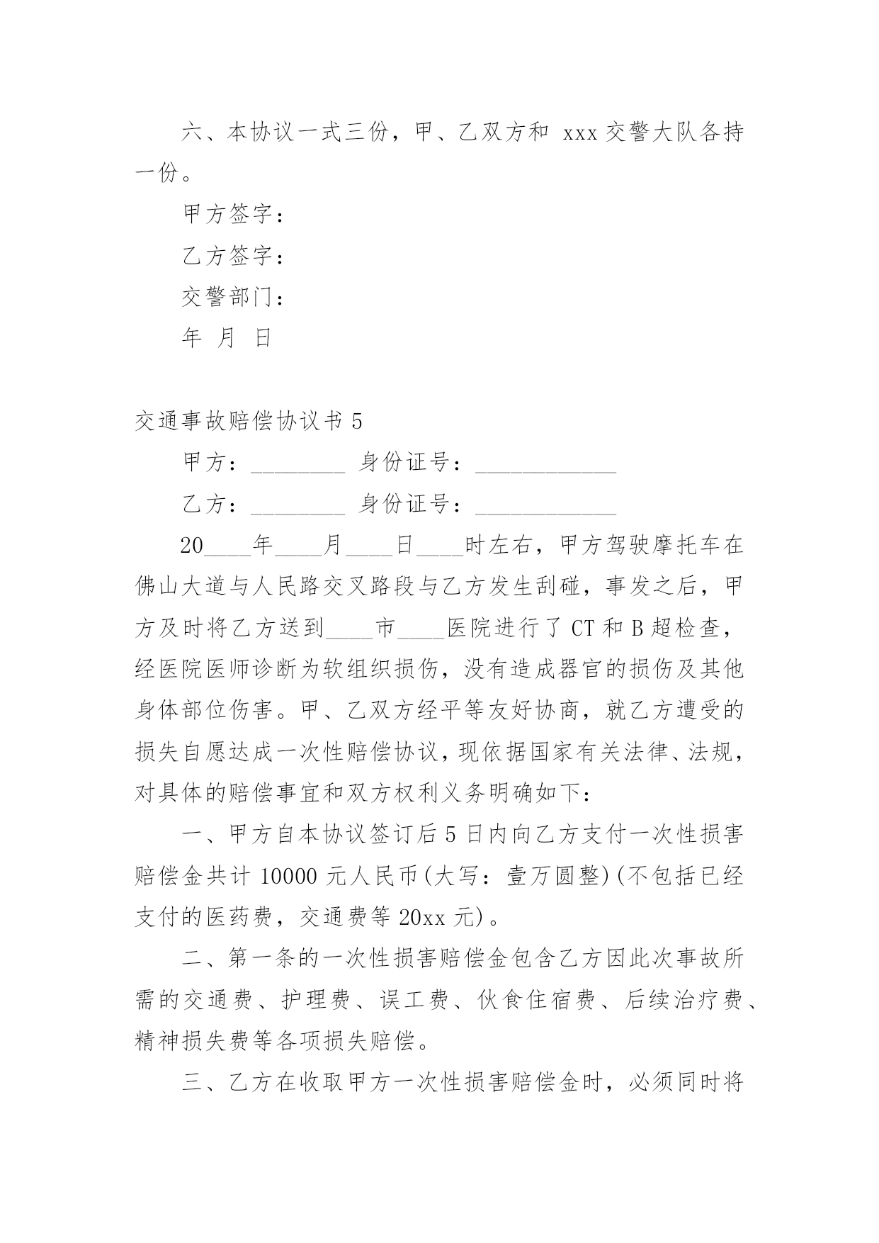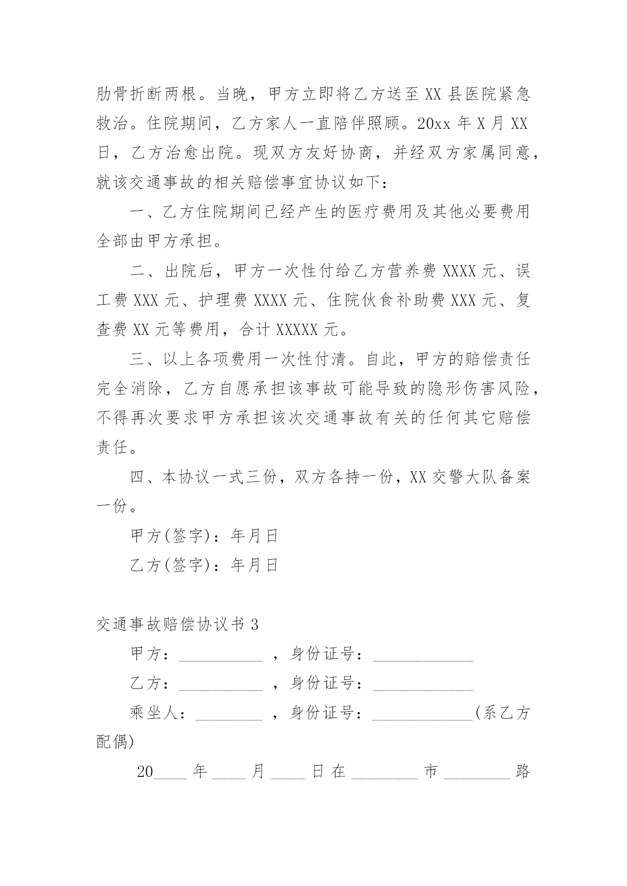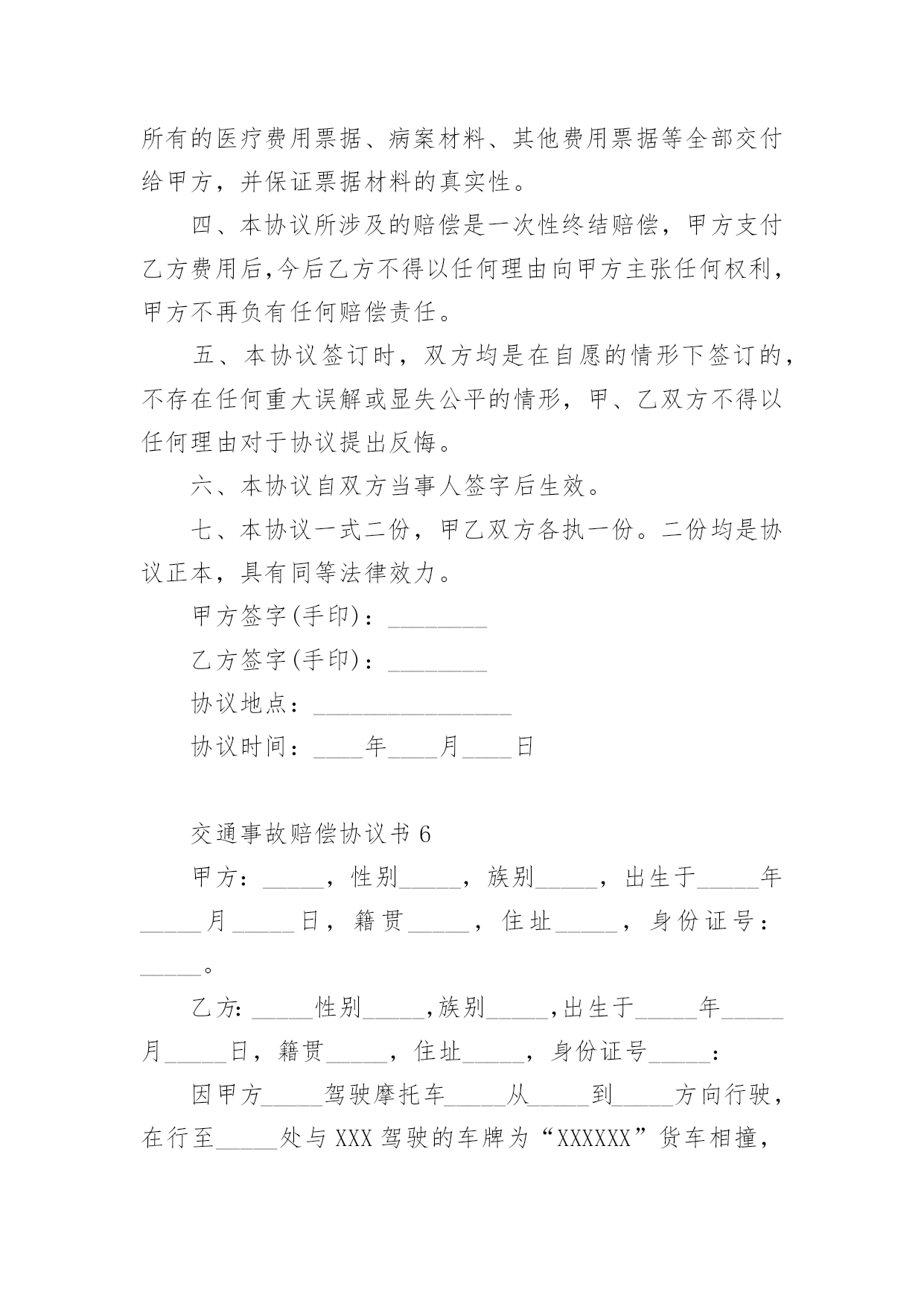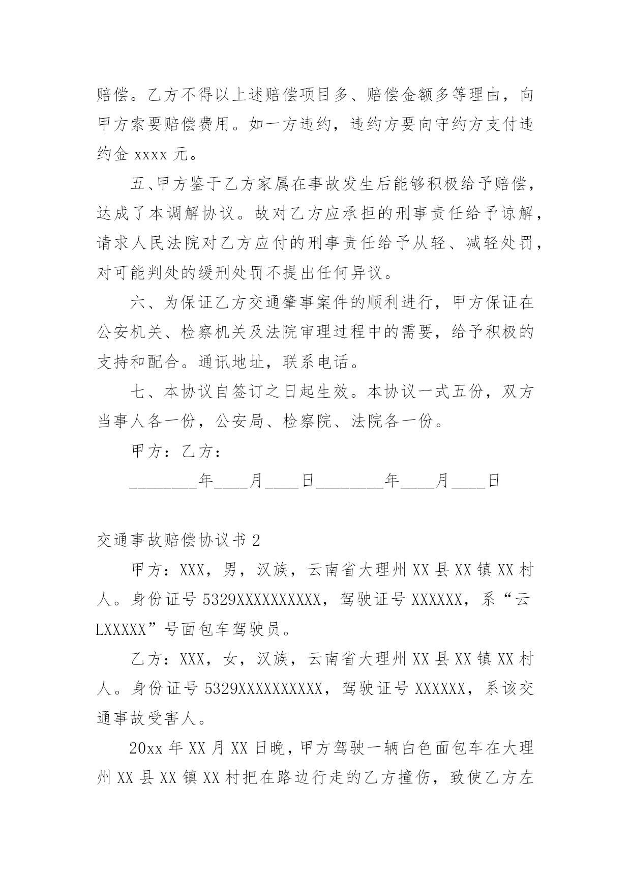 交通事故赔偿协议书在学习、工作生活中,协议书与我们的生活息息相关,签订协议书可以解决现实生活中的纠纷。我们该怎么拟定协议书呢?下面是小编帮大家整理的交通事故赔偿协议书,仅供参考,希望能够帮助到大家。交通事故赔偿协议书1甲方:乙方:甲、乙双方就________年____月____日因乙方驾车发生交通事故将甲方致伤一事,在平等自愿、协商一致的基础上,达成以下调解意见:一、因乙方驾车致甲方脚部之损伤,甲方经在人民医院治疗,已痊愈出院。二、根据最高人民法院《关于审理人身损害赔偿案件若干问题的解释》之规定,乙方应赔偿甲方各项损失医疗费、护理费、交通费、住院伙食补助费、必要的营养费、残疾赔偿金、康复费、后续治疗费等本次因乙方交通肇事甲方造成的一切经济损失共计xxxx元人民币。三、乙方在本协议签订之日起日内,一次性向甲方全部支付。四、甲方收到乙方的上述人身损害赔偿费用后,不得以赔偿项目缺失、身体伤害严重、后续治疗发生其它并发症等等理由,向乙方继续索要赔偿或者向人民法院提起诉讼索取赔偿。乙方不得以上述赔偿项目多、赔偿金额多等理由,向甲方索要赔偿费用。如一方违约,违约方要向守约方支付违约金xxxx元。五、甲方鉴于乙方家属在事故发生后能够积极给予赔偿,达成了本调解协议。故对乙方应承担的刑事责任给予谅解,请求人民法院对乙方应付的刑事责任给予从轻、减轻处罚,对可能判处的缓刑处罚不提出任何异议。六、为保证乙方交通肇事案件的顺利进行,甲方保证在公安机关、检察机关及法院审理过程中的需要,给予积极的支持和配合。通讯地址,联系电话。七、本协议自签订之日起生效。本协议一式五份,双方当事人各一份,公安局、检察院、法院各一份。甲方:乙方:________年____月____日________年____月____日交通事故赔偿协议书2甲方:XXX,男,汉族,云南省大理州XX县XX镇XX村人。身份证号5329XXXXXXXXXX,驾驶证号XXXXXX,系“云LXXXXX”号面包车驾驶员。乙方:XXX,女,汉族,云南省大理州XX县XX镇XX村人。身份证号5329XXXXXXXXXX,驾驶证号XXXXXX,系该交通事故受害人。20xx年XX月XX日晚,甲方驾驶一辆白色面包车在大理州XX县XX镇XX村把在路边行走的乙方撞伤,致使乙方左肋骨折断两根。当晚,甲方立即将乙方送至XX县医院紧急救治。住院期间,乙方家人一直陪伴照顾。20xx年X月XX日,乙方治愈出院。现双方友好协商,并经双方家属同意,就该交通事故的相关赔偿事宜协议如下:一、乙方住院期间已经产生的医疗费用及其他必要费用全部由甲方承担。二、出院后,甲方一次性付给乙方营养费XXXX元、误工费XXX元、护理费XXXX元、住院伙食补助费XXX元、复查费XX元等费用,合计XXXXX元。三、以上各项费用一次性付清。自此,甲方的赔偿责任完全消除,乙方自愿承担该事故可能导致的隐形伤害风险,不得再次要求甲方承担该次交通事故有关的任何其它赔偿责任。四、本协议一式三份,双方各持一份,XX交警大队备案一份。甲方(签字):年月日乙方(签字):年月日交通事故赔偿协议书3甲方:__________,身份证号:____________乙方:__________,身份证号:____________乘坐人:________,身份证号:____________(系乙方配偶)20____年____月____日在________市________路________门前发生,事故中甲方驾驶陕轿车由北向南行驶,乙方驾驶两轮摩托车由南向北行驶,不慎发生轻微碰撞,造成双方车辆受损,无人员受伤,现双方就本次充分协商后达成以下协议内容:一、甲、乙双方在此次事故中未造成人员伤害,互不追究责任;二、乙方乘坐人在事故中受到惊吓,因其怀孕,甲、乙双方立即将其送往医院,检查后无任何伤情,且胎儿完好,乘坐人遂自行放弃住院观察机会,在本协议签订后乙方乘坐人再出现任何问题均不得追究甲、乙双方任何责任;三、由甲方一次性支付乙方乘坐人医院检查费、交通费等共计____________元人民币(大写________________________);四、甲、乙双方在本次事故中造成车损由双方各自承担,互不追究;五、本协议内容真实有效,双方签定后即生效,此事故即一次性了解,今后双方(包括乘坐人)互不追究由此引起的一切责任;六、本协议一式三份,甲、乙(包括乘坐人)双方各执一份,交警部门存档一份。协议是自愿达成调解凭证,一经签定后不得反悔。我们上述协议完全真实、合法,如果有虚假愿意承担法律责任。甲方:________乙方:________乙方乘坐人:________见证人:________协调地址:____________20____年____月____日交通事故赔偿协议书4甲方:xxx,男,身份证号