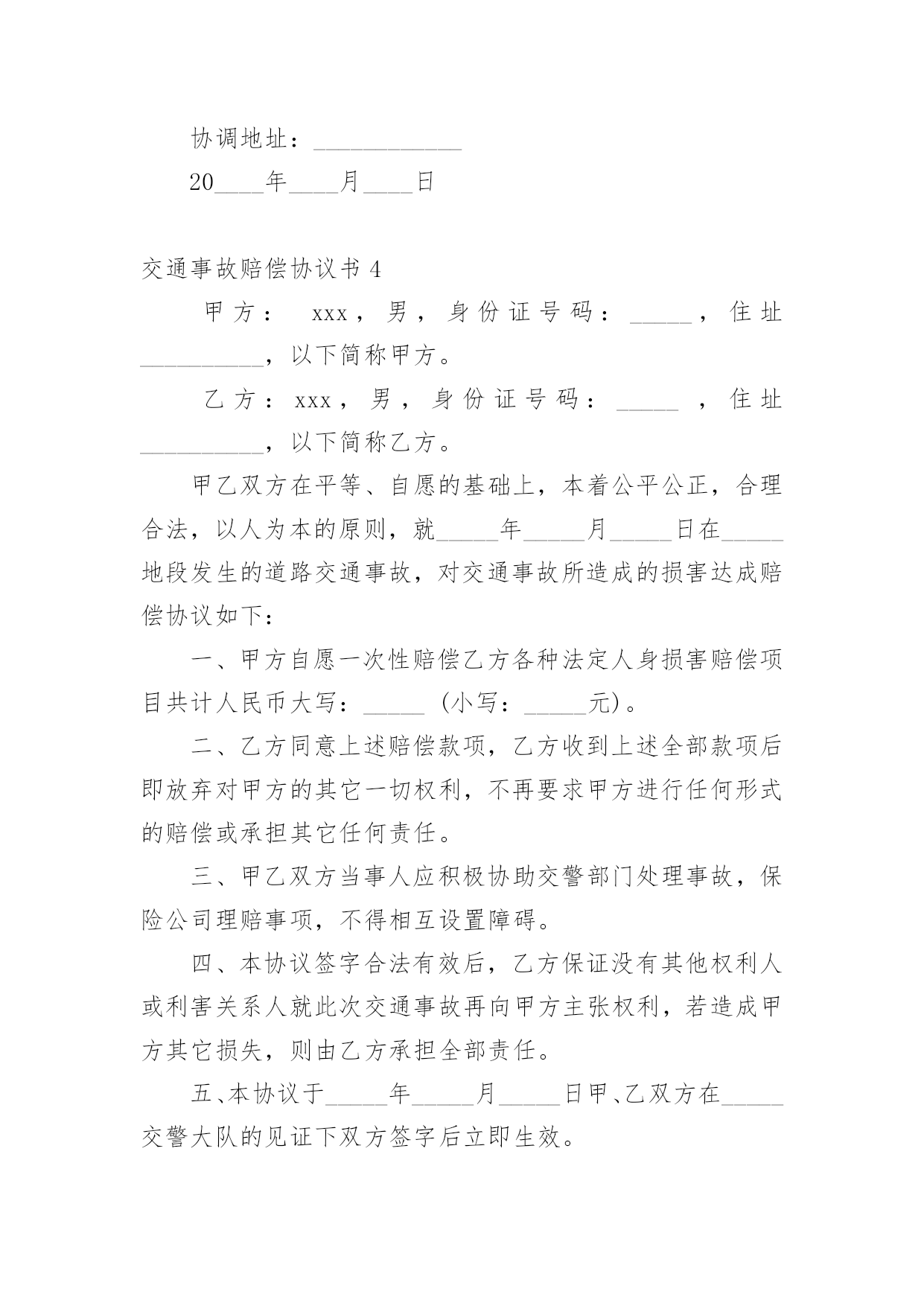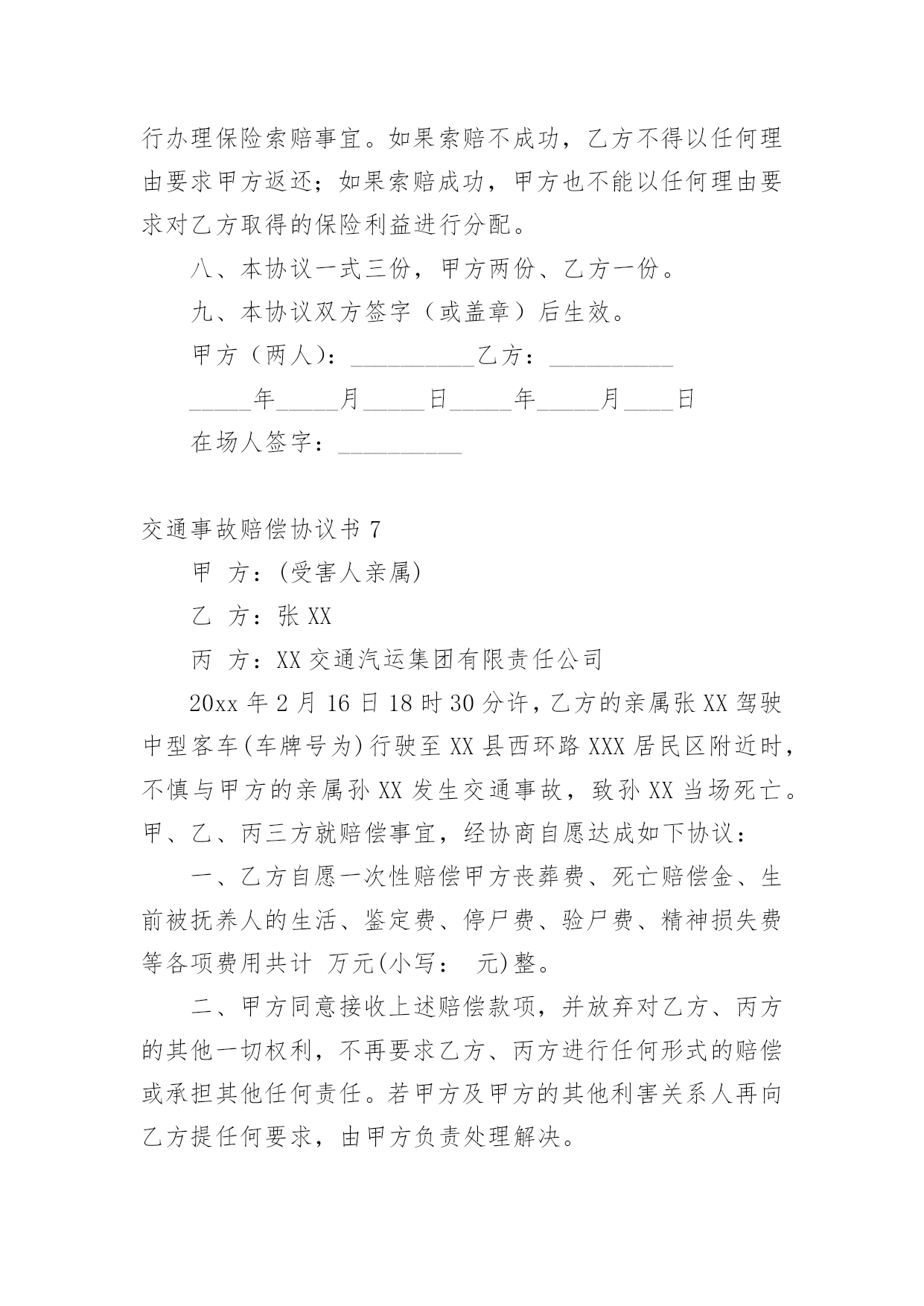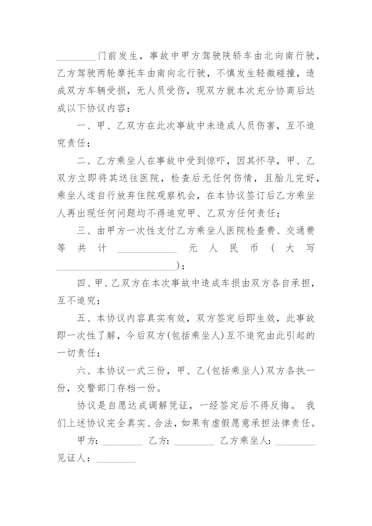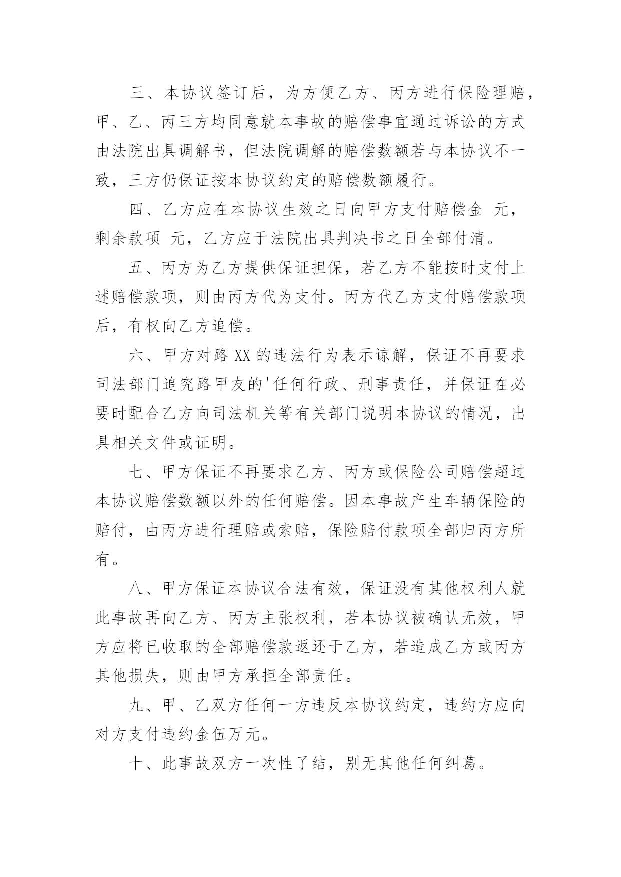 交通事故赔偿协议书在学习、工作生活中,协议书与我们的生活息息相关,签订协议书可以解决现实生活中的纠纷。我们该怎么拟定协议书呢?下面是小编帮大家整理的交通事故赔偿协议书,仅供参考,希望能够帮助到大家。交通事故赔偿协议书1甲方:乙方:甲、乙双方就________年____月____日因乙方驾车发生交通事故将甲方致伤一事,在平等自愿、协商一致的基础上,达成以下调解意见:一、因乙方驾车致甲方脚部之损伤,甲方经在人民医院治疗,已痊愈出院。二、根据最高人民法院《关于审理人身损害赔偿案件若干问题的解释》之规定,乙方应赔偿甲方各项损失医疗费、护理费、交通费、住院伙食补助费、必要的营养费、残疾赔偿金、康复费、后续治疗费等本次因乙方交通肇事甲方造成的一切经济损失共计xxxx元人民币。三、乙方在本协议签订之日起日内,一次性向甲方全部支付。四、甲方收到乙方的上述人身损害赔偿费用后,不得以赔偿项目缺失、身体伤害严重、后续治疗发生其它并发症等等理由,向乙方继续索要赔偿或者向人民法院提起诉讼索取赔偿。乙方不得以上述赔偿项目多、赔偿金额多等理由,向甲方索要赔偿费用。如一方违约,违约方要向守约方支付违约金xxxx元。五、甲方鉴于乙方家属在事故发生后能够积极给予赔偿,达成了本调解协议。故对乙方应承担的刑事责任给予谅解,请求人民法院对乙方应付的刑事责任给予从轻、减轻处罚,对可能判处的缓刑处罚不提出任何异议。六、为保证乙方交通肇事案件的顺利进行,甲方保证在公安机关、检察机关及法院审理过程中的需要,给予积极的支持和配合。通讯地址,联系电话。七、本协议自签订之日起生效。本协议一式五份,双方当事人各一份,公安局、检察院、法院各一份。甲方:乙方:________年____月____日________年____月____日交通事故赔偿协议书2甲方:XXX,男,汉族,云南省大理州XX县XX镇XX村人。身份证号5329XXXXXXXXXX,驾驶证号XXXXXX,系“云LXXXXX”号面包车驾驶员。乙方:XXX,女,汉族,云南省大理州XX县XX镇XX村人。身份证号5329XXXXXXXXXX,驾驶证号XXXXXX,系该交通事故受害人。20xx年XX月XX日晚,甲方驾驶一辆白色面包车在大理州XX县XX镇XX村把在路边行走的乙方撞伤,致使乙方左肋骨折断两根。当晚,甲方立即将乙方送至XX县医院紧急救治。住院期间,乙方家人一直陪伴照顾。20xx年X月XX日,乙方治愈出院。现双方友好协商,并经双方家属同意,就该交通事故的相关赔偿事宜协议如下:一、乙方住院期间已经产生的医疗费用及其他必要费用全部由甲方承担。二、出院后,甲方一次性付给乙方营养费XXXX元、误工费XXX元、护理费XXXX元、住院伙食补助费XXX元、复查费XX元等费用,合计XXXXX元。三、以上各项费用一次性付清。自此,甲方的赔偿责任完全消除,乙方自愿承担该事故可能导致的隐形伤害风险,不得再次要求甲方承担该次交通事故有关的任何其它赔偿责任。四、本协议一式三份,双方各持一份,XX交警大队备案一份。甲方(签字):年月日乙方(签字):年月日交通事故赔偿协议书3甲方:__________,身份证号:____________乙方:__________,身份证号:____________乘坐人:________,身份证号:____________(系乙方配偶)20____年____月____日在________市________路________门前发生,事故中甲方驾驶陕轿车由北向南行驶,乙方驾驶两轮摩托车由南向北行驶,不慎发生轻微碰撞,造成双方车辆受损,无人员受伤,现双方就本次充分协商后达成以下协议内容:一、甲、乙双方在此次事故中未造成人员伤害,互不追究责任;二、乙方乘坐人在事故中受到惊吓,因其怀孕,甲、乙双方立即将其送往医院,检查后无任何伤情,且胎儿完好,乘坐人遂自行放弃住院观察机会,在本协议签订后乙方乘坐人再出现任何问题均不得追究甲、乙双方任何责任;三、由甲方一次性支付乙方乘坐人医院检查费、交通费等共计____________元人民币(大写________________________);四、甲、乙双方在本次事故中造成车损由双方各自承担,互不追究;五、本协议内容真实有效,双方签定后即生效,此事故即一次性了解,今后双方(包括乘坐人)互不追究由此引起的一切责任;六、本协议一式三份,甲、乙(包括乘坐人)双方各执一份,交警部门存档一份。协议是自愿达成调解凭证,一经签定后不得反悔。我们上述协议完全真实、合法,如果有虚假愿意承担法律责任。甲方:________乙方:________乙方乘坐人:________见证人:________协调地址:____________20____年____月____日交通事故赔偿协议书4甲方:xxx,男,身份证号