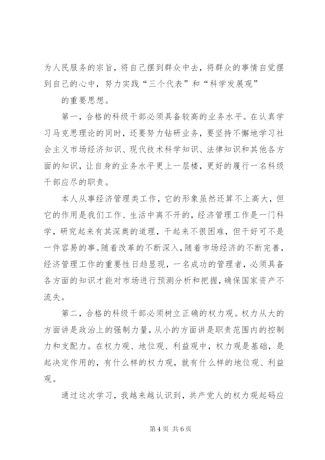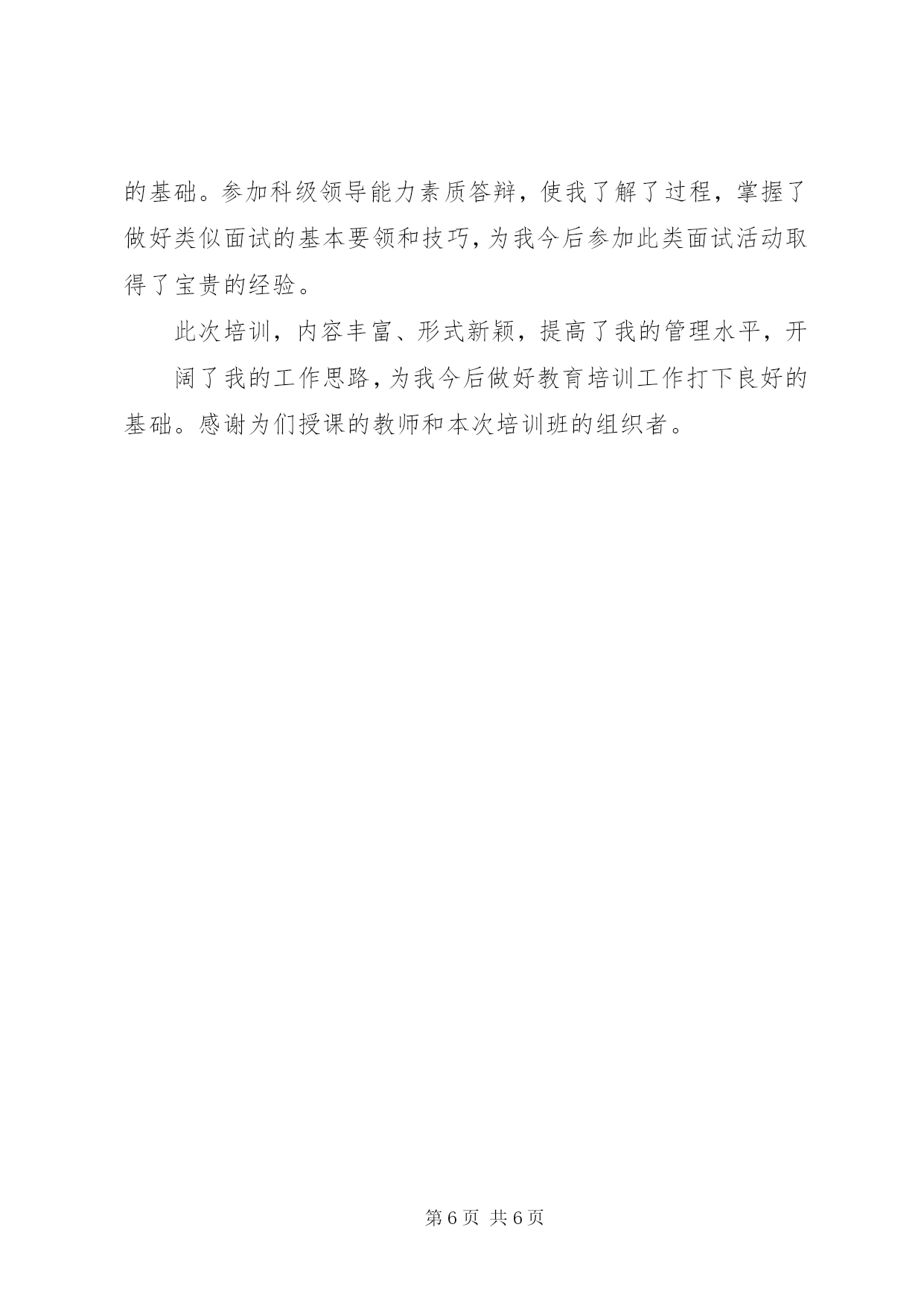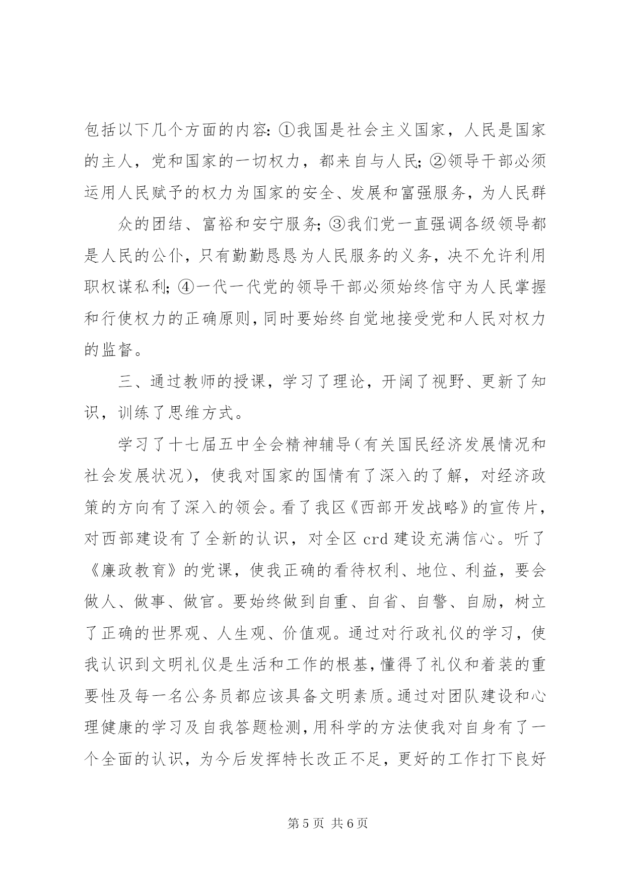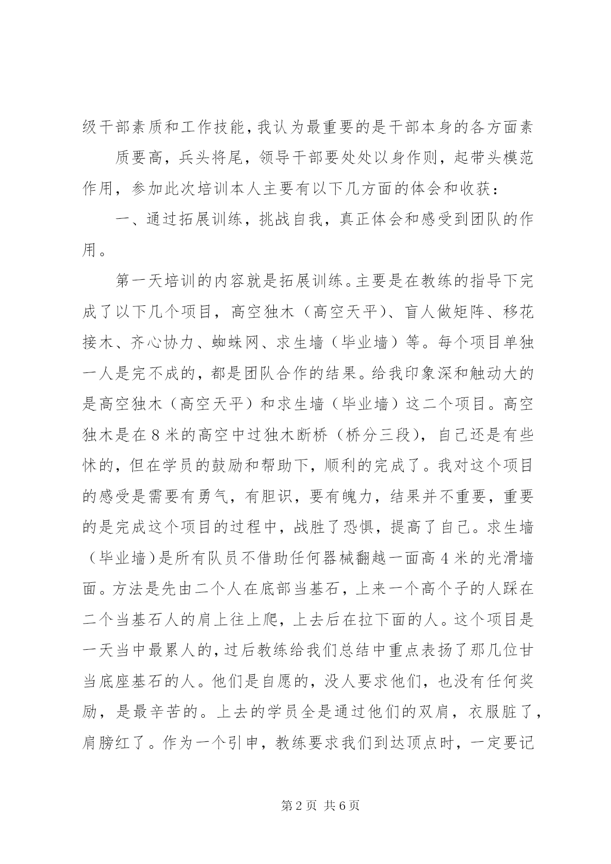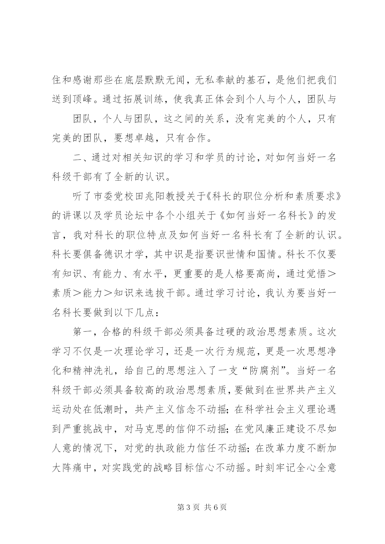 第PAGE\*Arabic\*MERGEFORMAT6页共NUMPAGES\*MERGEFORMAT6页科级公务员培训心得体会科级公务员任职培训学习心得体会9月日-日,我有幸参加了由中共XX市委组织部和XX市人力资源和社会保障局共同组织的第九期科级公务员任职培训班。本次培训学习的主要内容为:科学发展观、科级领导干部能力建设、公务员职业道德、公共部门人力资源管理、政策法规、依法行政、加快行政管理体制改革,建设服务型政府、行政决策的科学化、民主化、规范化等以及专家的专题讲座。通过**天的学习生活,让我结交了许多新朋友,接受了许多新观念、新思维,开阔了新视野,掌握了新知识和新技能,自我感觉有了一个质的提升。同时也感觉这次培训班组织的非常严谨、认真、有序、务实,俱备四个特点:一是授课教师水平高。有市区党校的专家、教授,有党政机关的一把手;二是课程安排非常合理、实用。有廉政教育的,有干部心理的,有行政礼仪的,有公文写作的,还有团队建设的,都是一名科级干部应该掌握的相关知识;三是形式新颖,效果突出。有授课、有讨论,有面试,有拓展,有交流,便于学员理解、消化、吸收。四是管理严格。实行百分考核,考勤登记,保证学员按时听课,用心听课。参加此次培训本人主要有几下几方面的体会和收获:由于自己任职时间不长,在管理下属方法和艺术、领导者协调关系的方法和艺术还有待于在实际工作中提高。但如何提高科级干部素质和工作技能,我认为最重要的是干部本身的各方面素质要高,兵头将尾,领导干部要处处以身作则,起带头模范作用,参加此次培训本人主要有以下几方面的体会和收获:一、通过拓展训练,挑战自我,真正体会和感受到团队的作用。第一天培训的内容就是拓展训练。主要是在教练的指导下完成了以下几个项目,高空独木(高空天平)、盲人做矩阵、移花接木、齐心协力、蜘蛛网、求生墙(毕业墙)等。每个项目单独一人是完不成的,都是团队合作的结果。给我印象深和触动大的是高空独木(高空天平)和求生墙(毕业墙)这二个项目。高空独木是在8米的高空中过独木断桥(桥分三段),自己还是有些怵的,但在学员的鼓励和帮助下,顺利的完成了。我对这个项目的感受是需要有勇气,有胆识,要有魄力,结果并不重要,重要的是完成这个项目的过程中,战胜了恐惧,提高了自己。求生墙(毕业墙)是所有队员不借助任何器械翻越一面高4米的光滑墙面。方法是先由二个人在底部当基石,上来一个高个子的人踩在二个当基石人的肩上往上爬,上去后在拉下面的人。这个项目是一天当中最累人的,过后教练给我们总结中重点表扬了那几位甘当底座基石的人。他们是自愿的,没人要求他们,也没有任何奖励,是最辛苦的。上去的学员全是通过他们的双肩,衣服脏了,肩膀红了。作为一个引申,教练要求我们到达顶点时,一定要记住和感谢那些在底层默默无闻,无私奉献的基石,是他们把我们送到顶峰。通过拓展训练,使我真正体会到个人与个人,团队与团队,个人与团队,这之间的关系,没有完美的个人,只有完美的团队,要想卓越,只有合作。二、通过对相关知识的学习和学员的讨论,对如何当好一名科级干部有了全新的认识。听了市委党校田兆阳教授关于《科长的职位分析和素质要求》的讲课以及学员论坛中各个小组关于《如何当好一名科长》的发言,我对科长的职位特点及如何当好一名科长有了全新的认识。科长要俱备德识才学,其中识是指要识世情和国情。科长不仅要有知识、有能力、有水平,更重要的是人格要高尚,通过觉悟>素质>能力>知识来选拔干部。通过学习讨论,我认为要当好一名科长要做到以下几点:第一,合格的科级干部必须具备过硬的政治思想素质。这次学习不仅是一次理论学习,还是一次行为规范,更是一次思想净化和精神洗礼,给自己的思想注入了一支“防腐剂”。当好一名科级干部必须具备较高的政治思想素质,要做到在世界共产主义运动处在低潮时,共产主义信念不动摇;在科学社会主义理论遇到严重挑战中,对马克思的信仰不动摇;在党风廉正建设不尽如人意的情况下,对党的执政能力信任不动摇;在改革力度不断加大阵痛中,对实践党的战略目标信心不动摇。时刻牢记全心全意为人民服务的宗旨,将自己摆到群众中去,将群众的事情自觉摆到自己的心中,努力实践“三个代表”和“科学发展观”的重要思想。第一,合格的科级干部必须具备较高的业务水平。在认真学习马克思理论的同时,还要努力钻研业务,要坚持不懈地学习社会主义市场经济知识、现代技术科学知识、法律知识和其他各方面的知识,让自身的业务水平更上一层楼,更好的履行一名科级干部应尽的职责。本人从事经济管理类工作,它的形象虽然还算不上高大,但它的作用是我们工作、生活中离不开的,经济管理工作是一门科学,研究起来有其深奥的道理,干起来不很困难,但干好可不是一件容易的事。随着改革的不断深入,随着市场经济的不断完善,经济管理工作的重要性日趋显现,一
