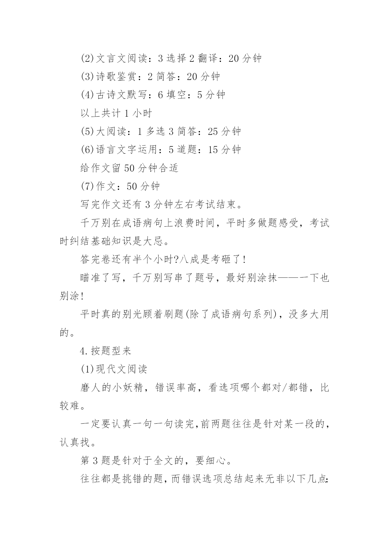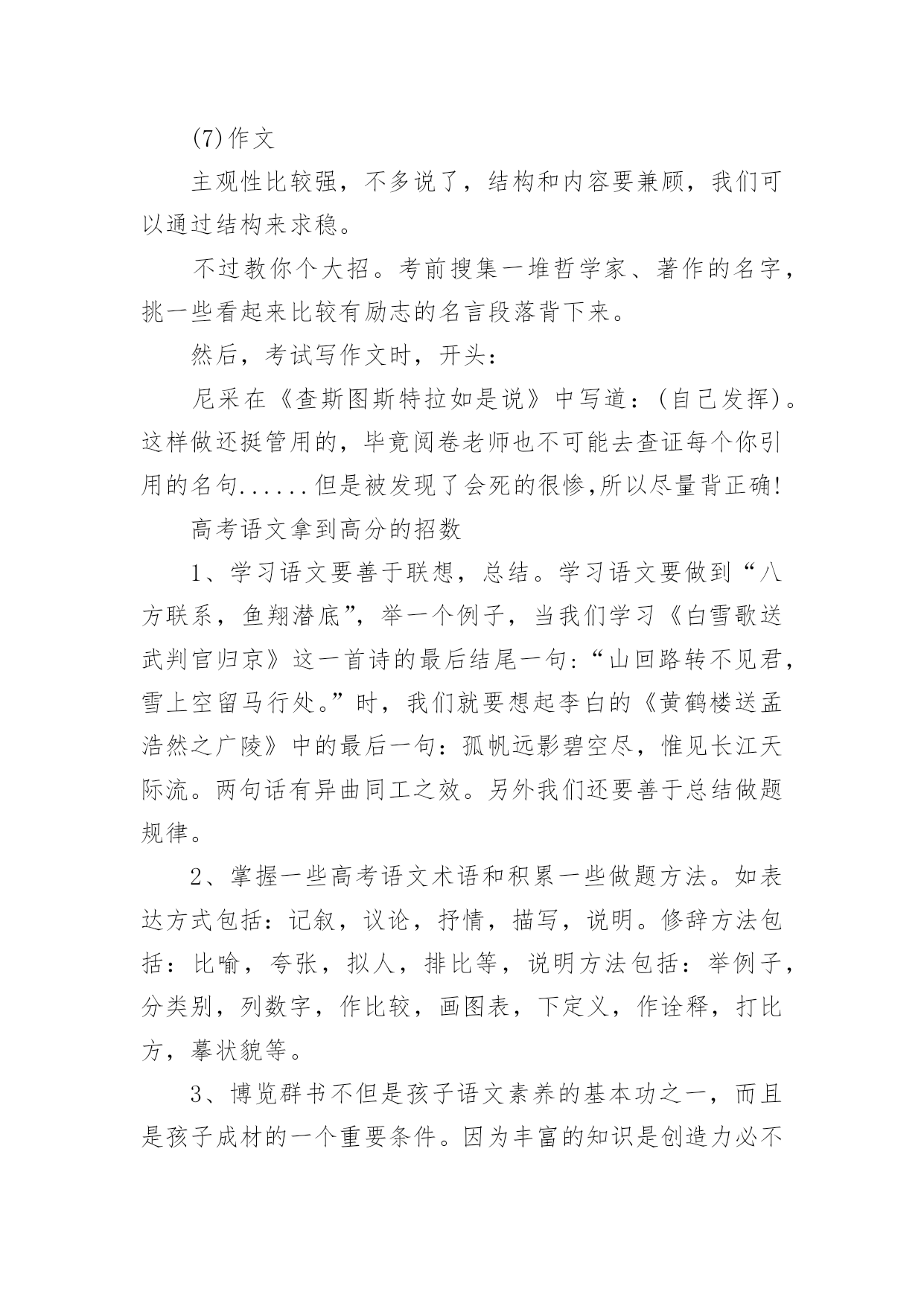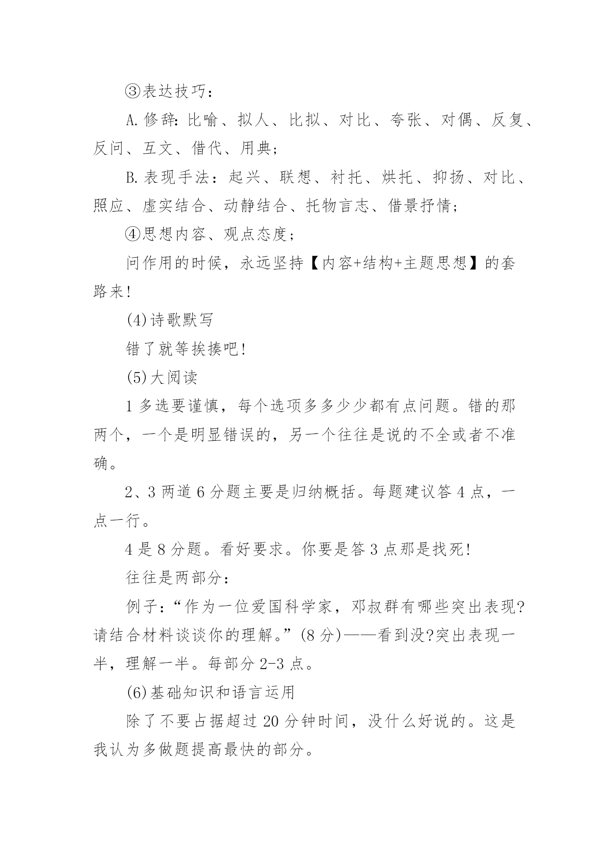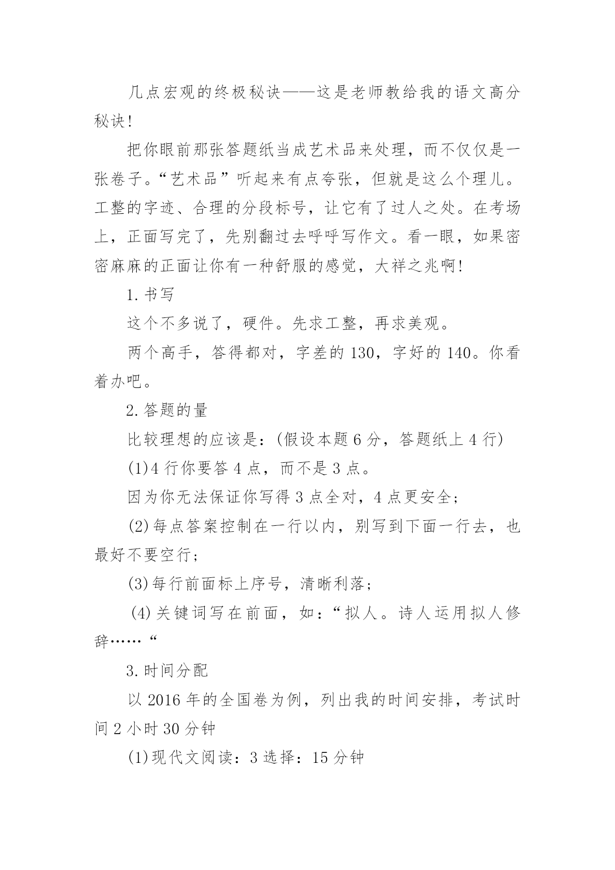 高考语文如何拿高分总是有学生想要知道高考语文有没有什么拿高分的特殊技巧,如果说没有呢其实在语文中还是有一定的投机取巧方法,但是几乎都是看运气的,所以小编觉得还是踏实的学才能更扎实。下面是小编精心整理的高考语文如何拿高分,欢迎阅读与收藏。高考语文如何拿高分?先说几个误区:误区1:“语文主要是靠平常的积累,没什么取巧的方法。”语文的确和积累有关,不过文化素养和考试成绩是两码事。既然考试是一张试卷,那么一定有技巧可以让你呈现得更好。误区2:“高三阶段想提升语文成绩,既缓慢又浪费精力。”那是你的方法不对。坦白讲,试卷上除了作文之外,能显示你素养的东西几乎为零。大部分还是应试的策略。想提高成绩,就得掌握答题的方法。有了你自己的一套策略之后,成绩的提升应该还是比较明显的。选择题拿不准的有多少,阅读有哪道题自己的答案有两点重合了,作文是否合自己的胃口,文言文有没有读不懂的语句...高手出了考场之后,对自己这次120+,130+还是能冲击140,是有基本认识的。几点宏观的终极秘诀——这是老师教给我的语文高分秘诀!把你眼前那张答题纸当成艺术品来处理,而不仅仅是一张卷子。“艺术品”听起来有点夸张,但就是这么个理儿。工整的字迹、合理的分段标号,让它有了过人之处。在考场上,正面写完了,先别翻过去呼呼写作文。看一眼,如果密密麻麻的正面让你有一种舒服的感觉,大祥之兆啊!1.书写这个不多说了,硬件。先求工整,再求美观。两个高手,答得都对,字差的130,字好的140。你看着办吧。2.答题的量比较理想的应该是:(假设本题6分,答题纸上4行)(1)4行你要答4点,而不是3点。因为你无法保证你写得3点全对,4点更安全;(2)每点答案控制在一行以内,别写到下面一行去,也最好不要空行;(3)每行前面标上序号,清晰利落;(4)关键词写在前面,如:“拟人。诗人运用拟人修辞……“3.时间分配以2016年的全国卷为例,列出我的时间安排,考试时间2小时30分钟(1)现代文阅读:3选择:15分钟(2)文言文阅读:3选择2翻译:20分钟(3)诗歌鉴赏:2简答:20分钟(4)古诗文默写:6填空:5分钟以上共计1小时(5)大阅读:1多选3简答:25分钟(6)语言文字运用:5道题:15分钟给作文留50分钟合适(7)作文:50分钟写完作文还有3分钟左右考试结束。千万别在成语病句上浪费时间,平时多做题感受,考试时纠结基础知识是大忌。答完卷还有半个小时?八成是考砸了!瞄准了写,千万别写串了题号,最好别涂抹——一下也别涂!平时真的别光顾着刷题(除了成语病句系列),没多大用的。4.按题型来(1)现代文阅读磨人的小妖精,错误率高,看选项哪个都对/都错,比较难。一定要认真一句一句读完,前两题往往是针对某一段的,认真找。第3题是针对于全文的,要细心。往往都是挑错的题,而错误选项总结起来无非以下几点:①背离原文,曲解观点;②过于武断,夸大其词;③不明关系,强拉因果;④东拉西扯,张冠李戴;⑤混淆已知和未知;⑥置否为肯,置肯为否;⑦节外生枝,无中生有;⑧主次不分,本末倒置。(2)文言文阅读一定要把文言文看懂!有一句两句意思不懂没关系(当然,不懂的句子往往会让你翻译…),一定要把整篇文章的意思看懂!选择题1,加点词解释不正确的,往往是词性错了。选择题2,表现人物特征的比较简单。选择题3,不能说明,按照(1)题的分析方法去看。翻译必须直译,每个词都翻出来。主语通常是省略的,但要用括号补出来。使动意动要翻译出来。(3)诗歌鉴赏分点,怎么分上文写得很清楚了。无非是4种题:①鉴赏形象(人物形象,景物形象,事物形象):特征+身份②鉴赏语言(炼字、赏句、语言风格):字句含义+修辞+表达手法+营造意境+作者感情③表达技巧:A.修辞:比喻、拟人、比拟、对比、夸张、对偶、反复、反问、互文、借代、用典;B.表现手法:起兴、联想、衬托、烘托、抑扬、对比、照应、虚实结合、动静结合、托物言志、借景抒情;④思想内容、观点态度;问作用的时候,永远坚持【内容+结构+主题思想】的套路来!(4)诗歌默写错了就等挨揍吧!(5)大阅读1多选要谨慎,每个选项多多少少都有点问题。错的那两个,一个是明显错误的,另一个往往是说的不全或者不准确。2、3两道6分题主要是归纳概括。每题建议答4点,一点一行。4是8分题。看好要求。你要是答3点那是找死!往往是两部分:例子:“作为一位爱国科学家,邓叔群有哪些突出表现?请结合材料谈谈你的理解。”(8分)——看到没?突出表现一半,理解一半。每部分2-3点。(6)基础知识和语言运用除了不要占据超过20分钟时间,没什么好说的。这是我认为多做题提高最快的部分。(7)作文主观性比较强,不多说了,结构和内容要兼顾,我们可以通过结构来求稳。不过教你个大招。考前搜集一堆哲学家、著作的名字,挑一些看起来比较有励志的名言段落背下来。然后