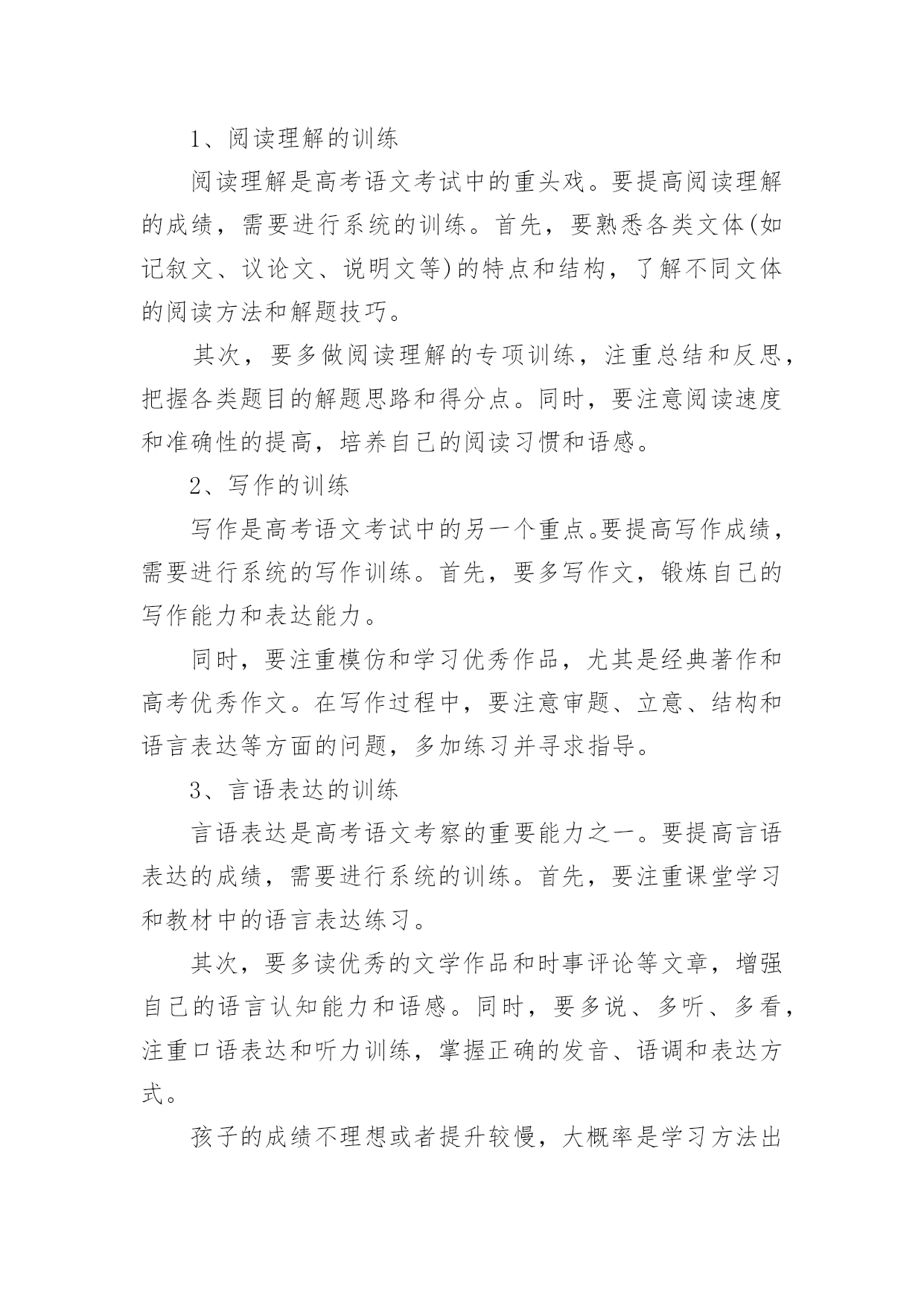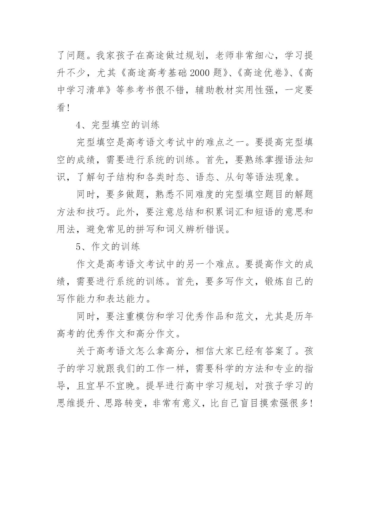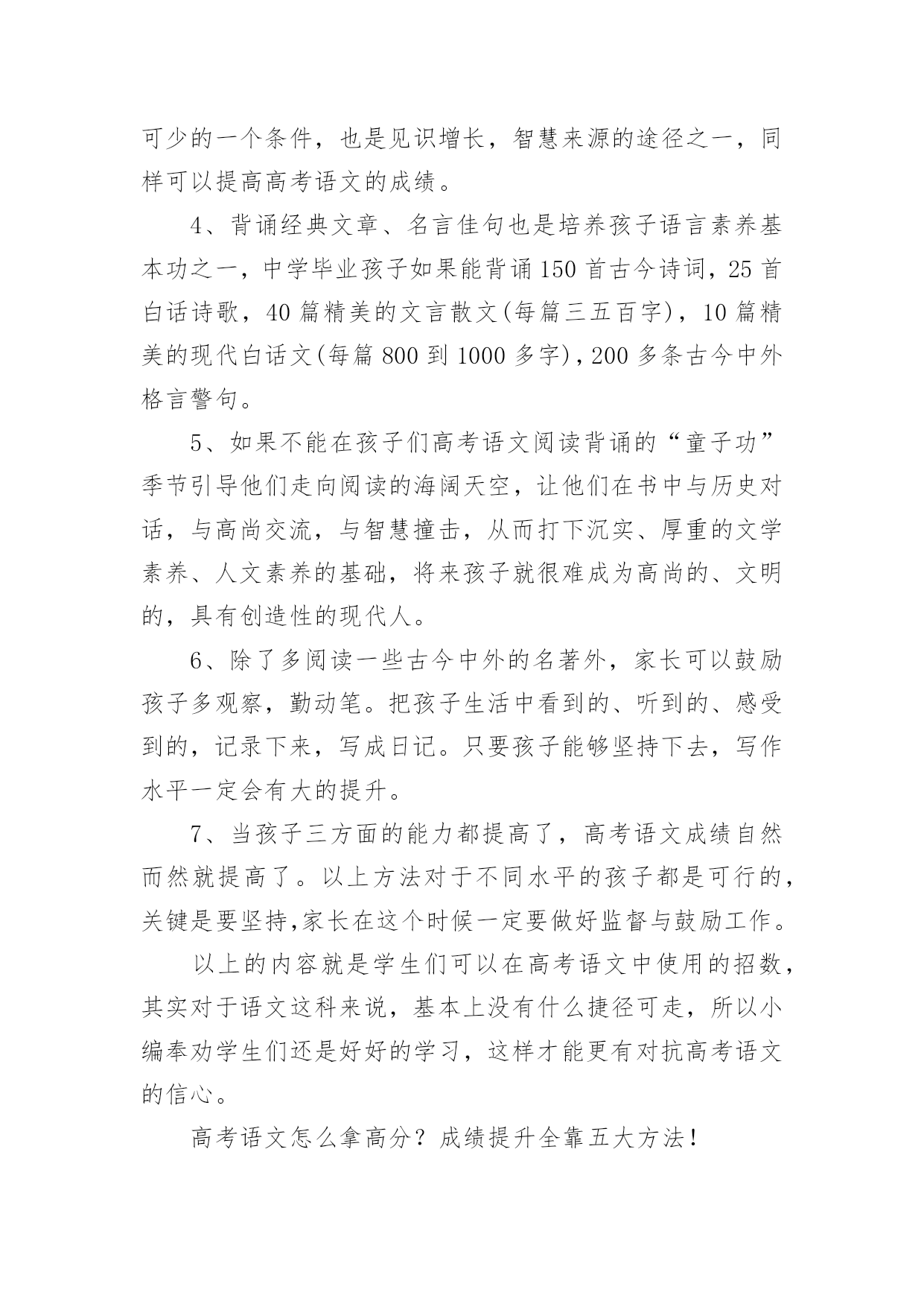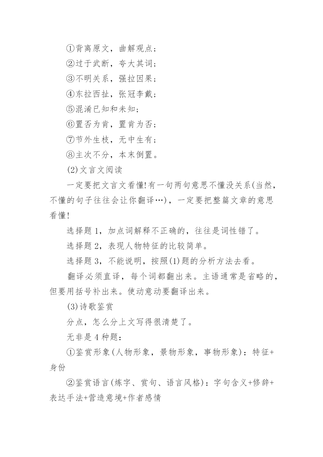 高考语文如何拿高分总是有学生想要知道高考语文有没有什么拿高分的特殊技巧,如果说没有呢其实在语文中还是有一定的投机取巧方法,但是几乎都是看运气的,所以小编觉得还是踏实的学才能更扎实。下面是小编精心整理的高考语文如何拿高分,欢迎阅读与收藏。高考语文如何拿高分?先说几个误区:误区1:“语文主要是靠平常的积累,没什么取巧的方法。”语文的确和积累有关,不过文化素养和考试成绩是两码事。既然考试是一张试卷,那么一定有技巧可以让你呈现得更好。误区2:“高三阶段想提升语文成绩,既缓慢又浪费精力。”那是你的方法不对。坦白讲,试卷上除了作文之外,能显示你素养的东西几乎为零。大部分还是应试的策略。想提高成绩,就得掌握答题的方法。有了你自己的一套策略之后,成绩的提升应该还是比较明显的。选择题拿不准的有多少,阅读有哪道题自己的答案有两点重合了,作文是否合自己的胃口,文言文有没有读不懂的语句...高手出了考场之后,对自己这次120+,130+还是能冲击140,是有基本认识的。几点宏观的终极秘诀——这是老师教给我的语文高分秘诀!把你眼前那张答题纸当成艺术品来处理,而不仅仅是一张卷子。“艺术品”听起来有点夸张,但就是这么个理儿。工整的字迹、合理的分段标号,让它有了过人之处。在考场上,正面写完了,先别翻过去呼呼写作文。看一眼,如果密密麻麻的正面让你有一种舒服的感觉,大祥之兆啊!1.书写这个不多说了,硬件。先求工整,再求美观。两个高手,答得都对,字差的130,字好的140。你看着办吧。2.答题的量比较理想的应该是:(假设本题6分,答题纸上4行)(1)4行你要答4点,而不是3点。因为你无法保证你写得3点全对,4点更安全;(2)每点答案控制在一行以内,别写到下面一行去,也最好不要空行;(3)每行前面标上序号,清晰利落;(4)关键词写在前面,如:“拟人。诗人运用拟人修辞……“3.时间分配以2016年的全国卷为例,列出我的时间安排,考试时间2小时30分钟(1)现代文阅读:3选择:15分钟(2)文言文阅读:3选择2翻译:20分钟(3)诗歌鉴赏:2简答:20分钟(4)古诗文默写:6填空:5分钟以上共计1小时(5)大阅读:1多选3简答:25分钟(6)语言文字运用:5道题:15分钟给作文留50分钟合适(7)作文:50分钟写完作文还有3分钟左右考试结束。千万别在成语病句上浪费时间,平时多做题感受,考试时纠结基础知识是大忌。答完卷还有半个小时?八成是考砸了!瞄准了写,千万别写串了题号,最好别涂抹——一下也别涂!平时真的别光顾着刷题(除了成语病句系列),没多大用的。4.按题型来(1)现代文阅读磨人的小妖精,错误率高,看选项哪个都对/都错,比较难。一定要认真一句一句读完,前两题往往是针对某一段的,认真找。第3题是针对于全文的,要细心。往往都是挑错的题,而错误选项总结起来无非以下几点:①背离原文,曲解观点;②过于武断,夸大其词;③不明关系,强拉因果;④东拉西扯,张冠李戴;⑤混淆已知和未知;⑥置否为肯,置肯为否;⑦节外生枝,无中生有;⑧主次不分,本末倒置。(2)文言文阅读一定要把文言文看懂!有一句两句意思不懂没关系(当然,不懂的句子往往会让你翻译…),一定要把整篇文章的意思看懂!选择题1,加点词解释不正确的,往往是词性错了。选择题2,表现人物特征的比较简单。选择题3,不能说明,按照(1)题的分析方法去看。翻译必须直译,每个词都翻出来。主语通常是省略的,但要用括号补出来。使动意动要翻译出来。(3)诗歌鉴赏分点,怎么分上文写得很清楚了。无非是4种题:①鉴赏形象(人物形象,景物形象,事物形象):特征+身份②鉴赏语言(炼字、赏句、语言风格):字句含义+修辞+表达手法+营造意境+作者感情③表达技巧:A.修辞:比喻、拟人、比拟、对比、夸张、对偶、反复、反问、互文、借代、用典;B.表现手法:起兴、联想、衬托、烘托、抑扬、对比、照应、虚实结合、动静结合、托物言志、借景抒情;④思想内容、观点态度;问作用的时候,永远坚持【内容+结构+主题思想】的套路来!(4)诗歌默写错了就等挨揍吧!(5)大阅读1多选要谨慎,每个选项多多少少都有点问题。错的那两个,一个是明显错误的,另一个往往是说的不全或者不准确。2、3两道6分题主要是归纳概括。每题建议答4点,一点一行。4是8分题。看好要求。你要是答3点那是找死!往往是两部分:例子:“作为一位爱国科学家,邓叔群有哪些突出表现?请结合材料谈谈你的理解。”(8分)——看到没?突出表现一半,理解一半。每部分2-3点。(6)基础知识和语言运用除了不要占据超过20分钟时间,没什么好说的。这是我认为多做题提高最快的部分。(7)作文主观性比较强,不多说了,结构和内容要兼顾,我们可以通过结构来求稳。不过教你个大招。考前搜集一堆哲学家、著作的名字,挑一些看起来比较有励志的名言段落背下来。然后
