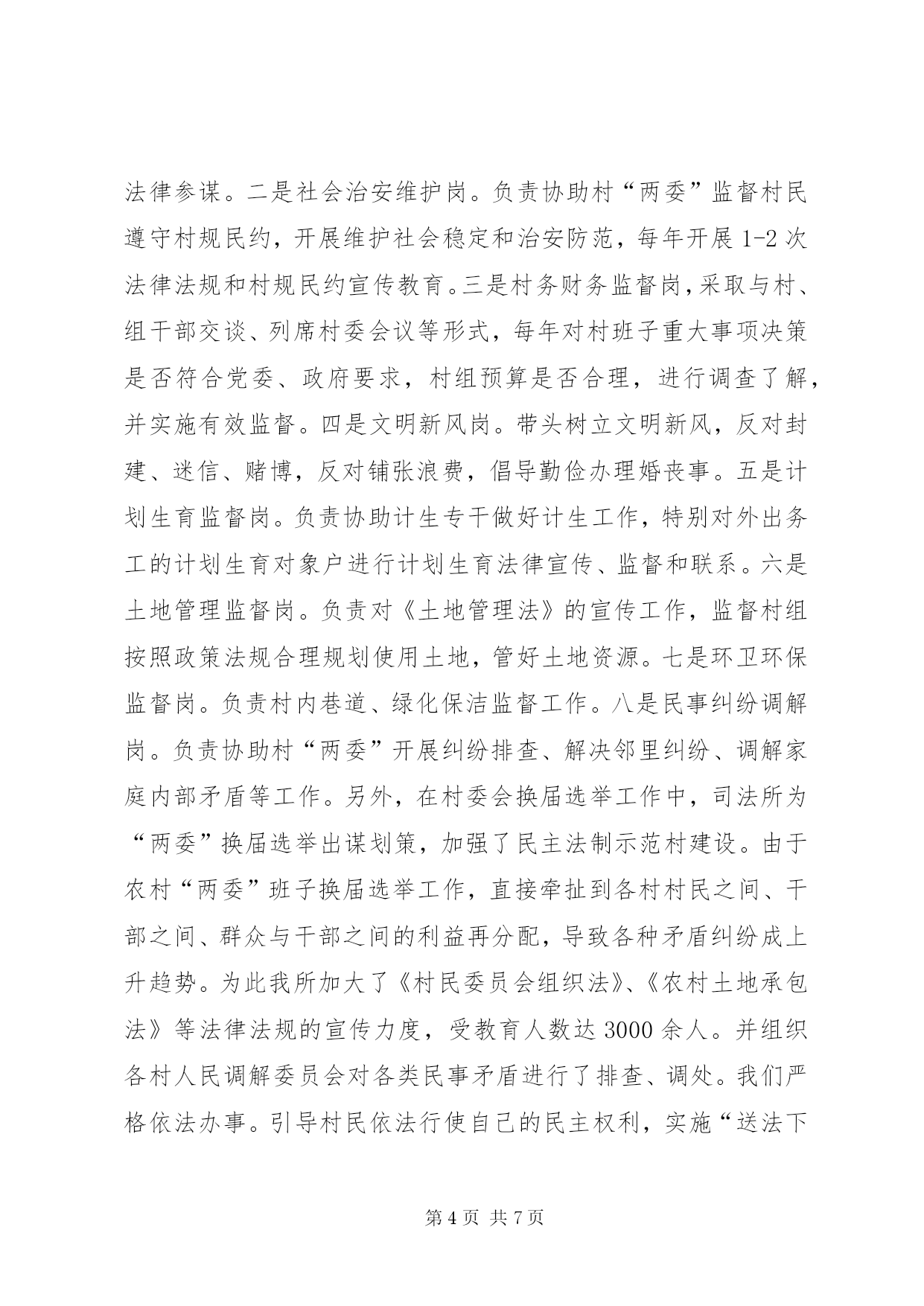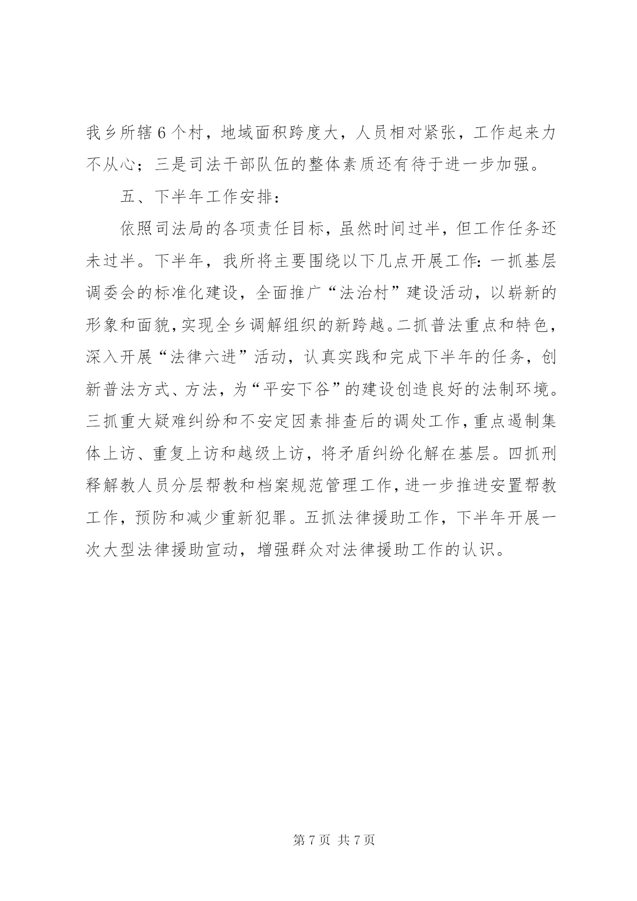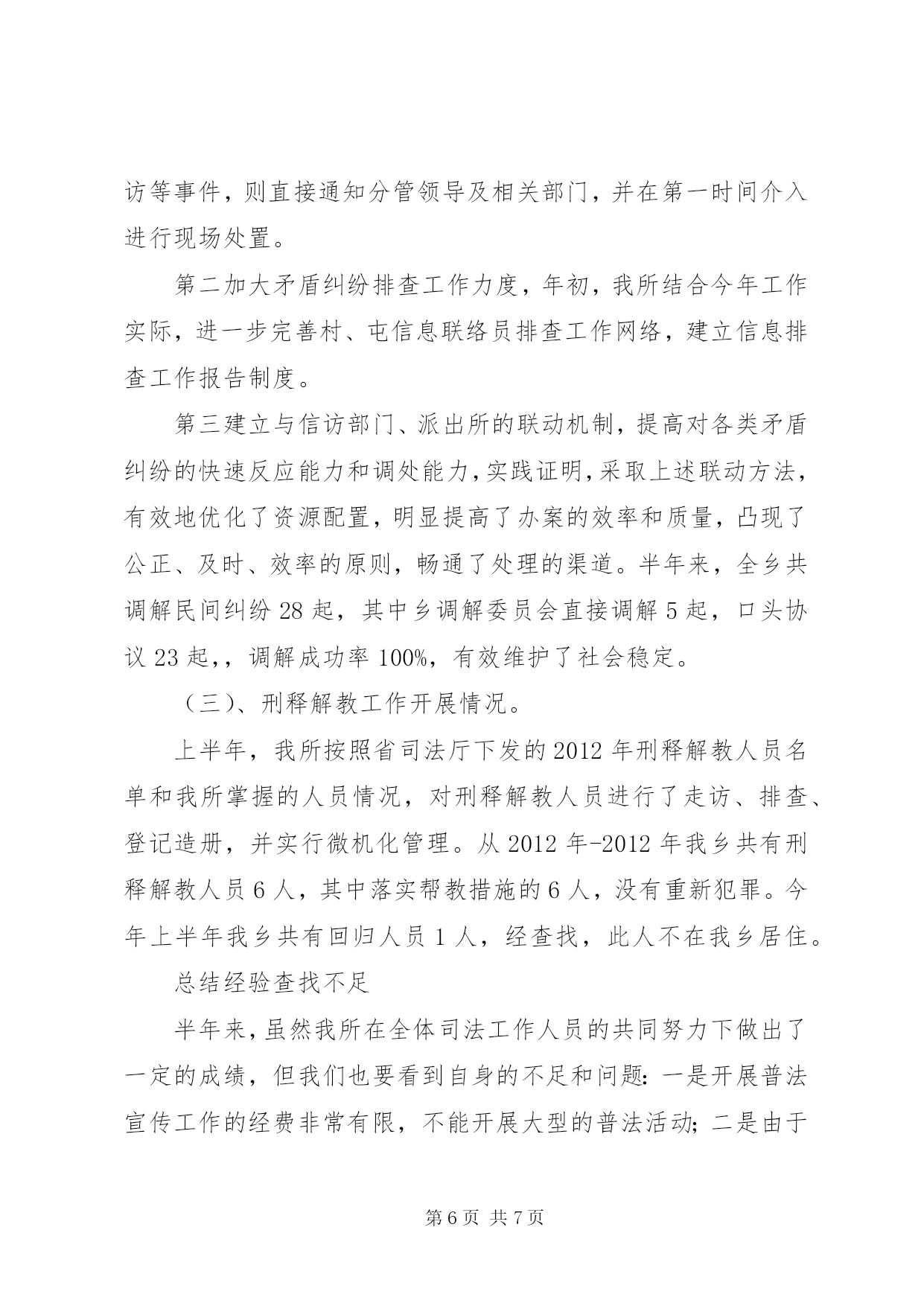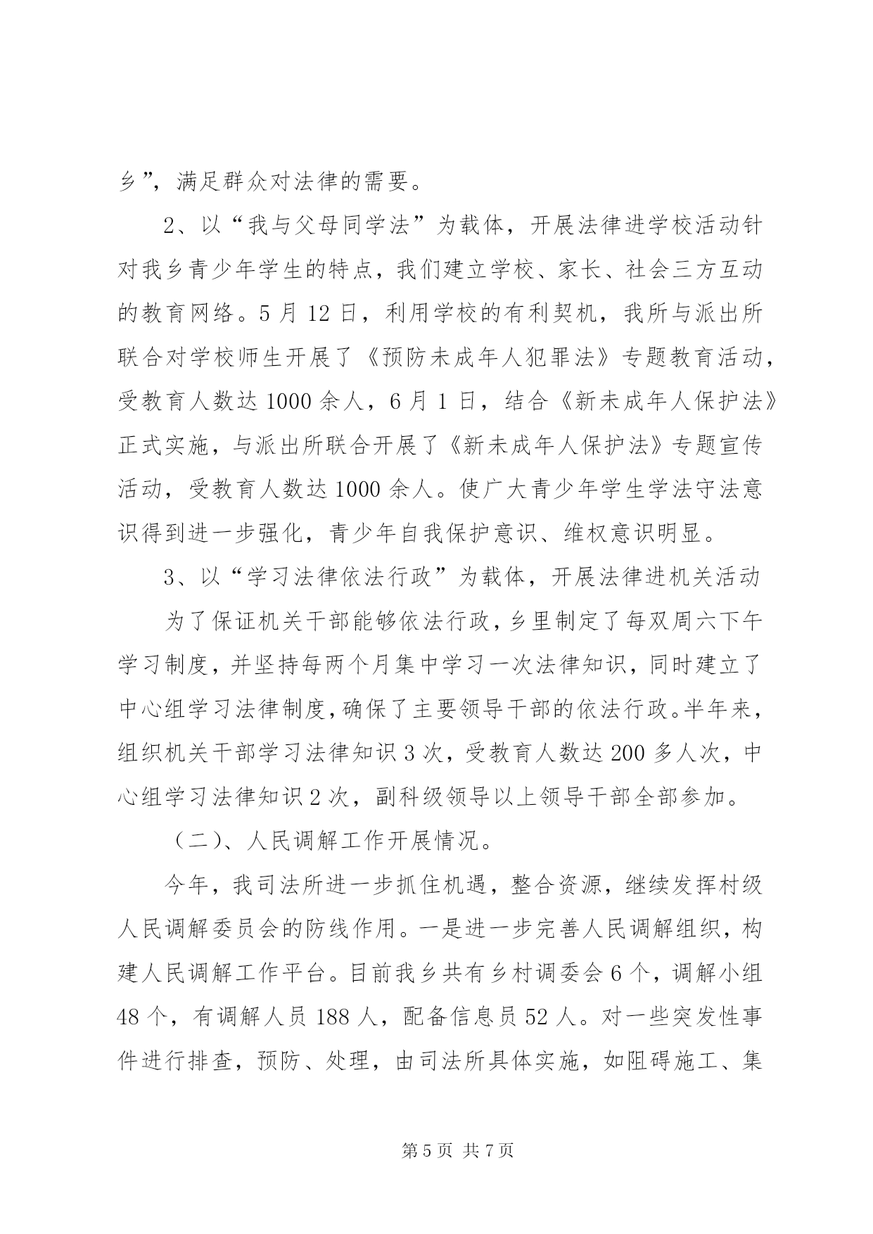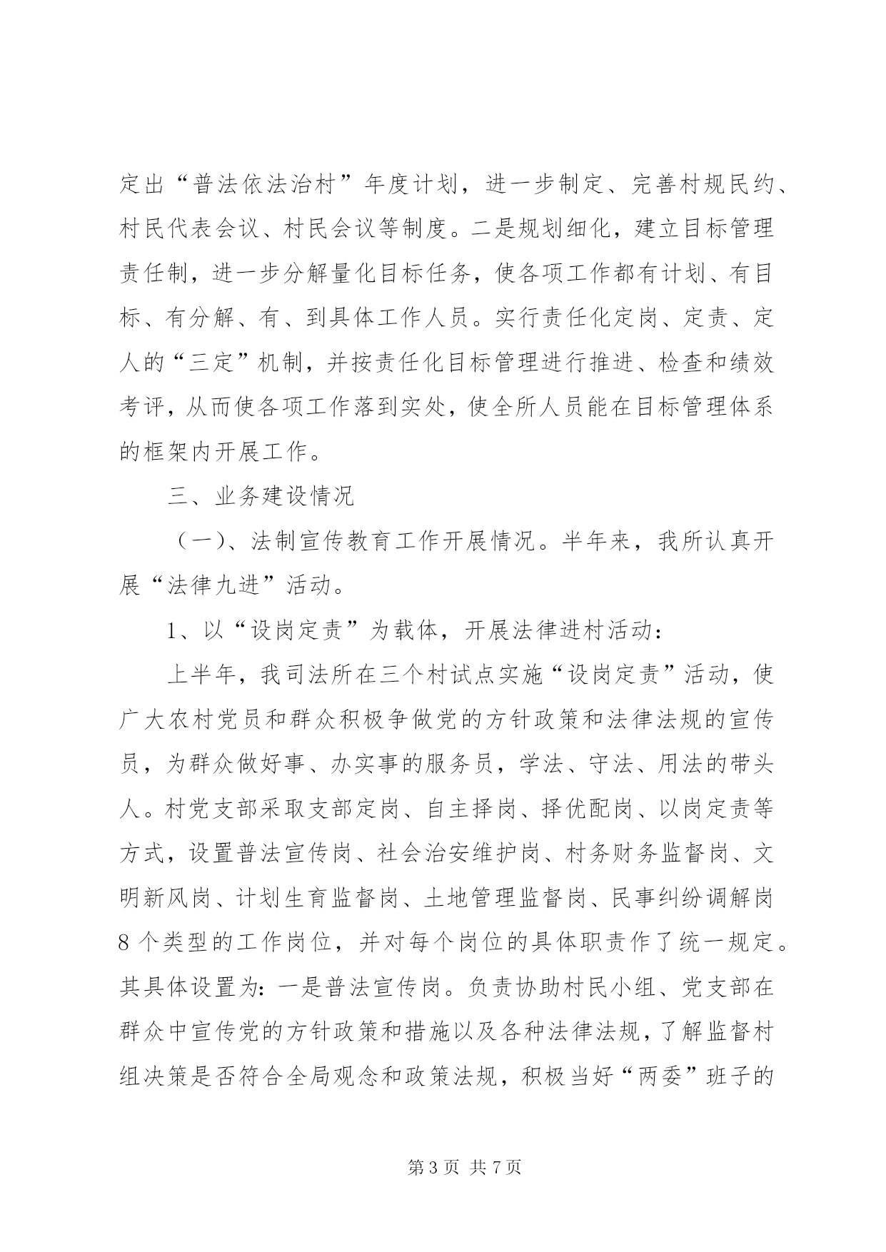 第PAGE\*Arabic\*MERGEFORMAT7页共NUMPAGES\*MERGEFORMAT7页司法所半年工作总结今年上半年,我所在司法局的正确领导下,在乡党委、政府的大力支持下,以邓小平理论和“xxxx”重要思想为指导,全面落实科学发展观,牢固树立社会主义法治理念,认真贯彻党的十九届九中全会精神,坚持用科学发展观统领司法行政工作,以服务于全乡经济工作大局为主线,把发展作为第一要务,与时俱进,以维护和保障社会稳定为核心,以强化队伍建设为基础,努力探索新时期司法行政工作的新特点、新方法、新措施,开创司法行政工作的新局面。全力为我乡经济建设、政治建设、文化建设、社会建设社会主义和谐社会和社会主义新农村建设做出了贡献。一、队伍建设工作:半年来,我所为进一步加强队伍建设,集中解决突出存在的问题,全面提高队伍素质,把司法行政队伍建设成政治坚定、业务精通、作风优良、执法公正的队伍,更好地担负起党和人民赋予的神圣职责,主要抓以下几方面工作:1、加强政治思想教育。坚持政治建警,保持思想教育的经常性、系统性、针对性和有效性是强化队伍建设的根本。针对干部队伍的思想现状和所面临的形势与任务,有效发挥思想政治工作疏导人、凝聚人、激励人的作用,充分调动干警的主观能动性和创造性,积极探索新形势下政治思想工作的新思路和新方法,并在全乡法律服务部门广泛开展了以“双争”为载体的“行风建设”活动。2、抓好两个教育,一是深入持久地开展宗旨教育,使广大干警增强群众观念、牢固树立全心全意为人民服务的思想,从思想上解决好“为谁执法、为谁掌权、为谁服务”的问题,以公正、高效、廉洁、文明的执法形象,进一步密切与人民群众的关系,真正地建立一支人民满意的司法行政队伍。二是深入持久地开展廉政教育,使干警树立公正司法、清正廉明的职业意识,解决好人民群众反映较多的突出问题。从而切实增强干警的政治意识、大局意识、群众意识和责任意识。3、加强业务素质培训。我所把法律知识、法律业务技能和科学文化知识培训有机结合起来,坚持例会、集中学习和自学制度,继续开展“社会主义法治理念”教育和开展“创新服务理念、提高服务效能”专项学习教育活动。半年来,我所组织集中学习5次,集中、自学笔记字数均达4000余字,在法治理念教育活动中,认真开展自查整改,对梳理出的问题,逐条制定整改措施,群众办事“门难进、脸难看、事难办”的现象明显改善,使司法队伍在群众中建立了良好的形象。二、目标量化管理情况我所围绕今年局下发的《关于司法所目标量化考核办法》的目标和任务,进一步明确责任,狠抓目标管理各项措施的落实,确保各项任务目标的顺利实现。一是各村委会根据本村实际,制定出“普法依法治村”年度计划,进一步制定、完善村规民约、村民代表会议、村民会议等制度。二是规划细化,建立目标管理责任制,进一步分解量化目标任务,使各项工作都有计划、有目标、有分解、有、到具体工作人员。实行责任化定岗、定责、定人的“三定”机制,并按责任化目标管理进行推进、检查和绩效考评,从而使各项工作落到实处,使全所人员能在目标管理体系的框架内开展工作。三、业务建设情况(一)、法制宣传教育工作开展情况。半年来,我所认真开展“法律九进”活动。1、以“设岗定责”为载体,开展法律进村活动:上半年,我司法所在三个村试点实施“设岗定责”活动,使广大农村党员和群众积极争做党的方针政策和法律法规的宣传员,为群众做好事、办实事的服务员,学法、守法、用法的带头人。村党支部采取支部定岗、自主择岗、择优配岗、以岗定责等方式,设置普法宣传岗、社会治安维护岗、村务财务监督岗、文明新风岗、计划生育监督岗、土地管理监督岗、民事纠纷调解岗8个类型的工作岗位,并对每个岗位的具体职责作了统一规定。其具体设置为:一是普法宣传岗。负责协助村民小组、党支部在群众中宣传党的方针政策和措施以及各种法律法规,了解监督村组决策是否符合全局观念和政策法规,积极当好“两委”班子的法律参谋。二是社会治安维护岗。负责协助村“两委”监督村民遵守村规民约,开展维护社会稳定和治安防范,每年开展1-2次法律法规和村规民约宣传教育。三是村务财务监督岗,采取与村、组干部交谈、列席村委会议等形式,每年对村班子重大事项决策是否符合党委、政府要求,村组预算是否合理,进行调查了解,并实施有效监督。四是文明新风岗。带头树立文明新风,反对封建、迷信、赌博,反对铺张浪费,倡导勤俭办理婚丧事。五是计划生育监督岗。负责协助计生专干做好计生工作,特别对外出务工的计划生育对象户进行计划生育法律宣传、监督和联系。六是土地管理监督岗。负责对《土地管理法》的宣传工作,监督村组按照政策法规合理规划使用土地,管好土地资源。七是环卫环保监督岗。负责村内巷道、绿化保洁监督工作。八是民事纠纷调解岗。负责协助村“两委”开展纠纷排查、解决邻