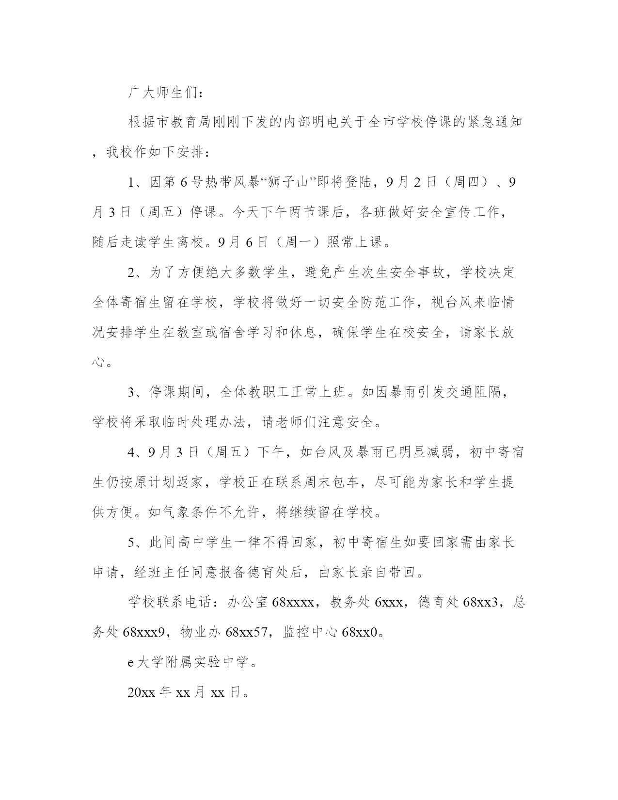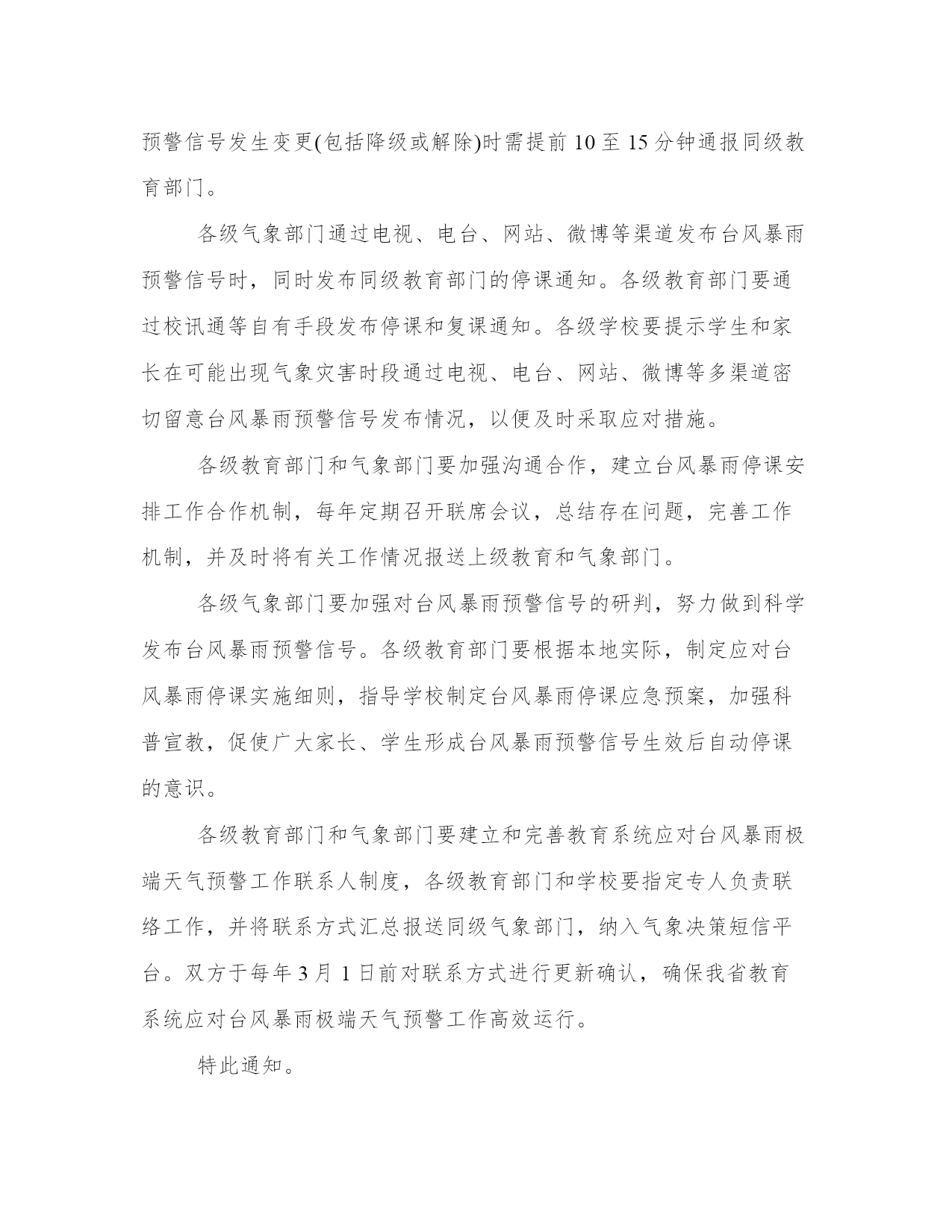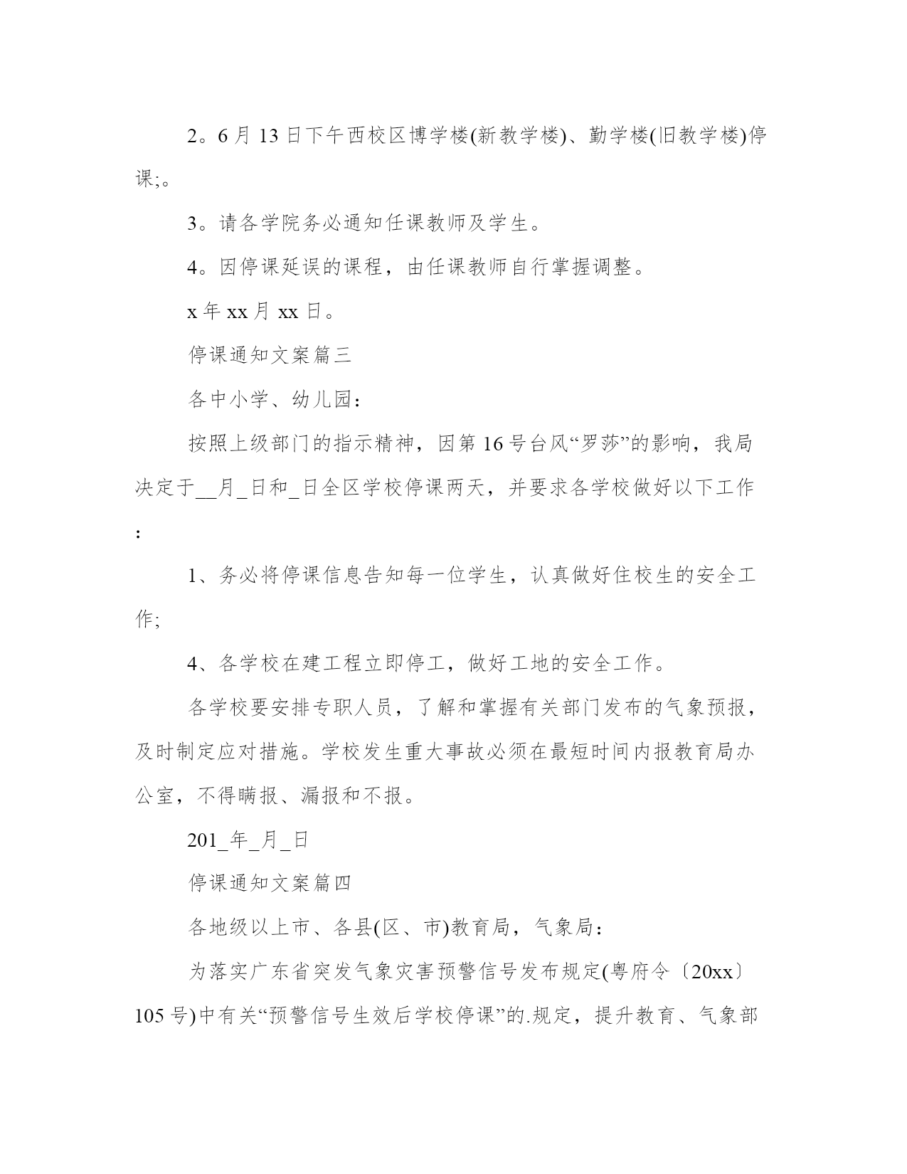 停课通知文案(通用13篇)每个人都曾试图在平淡的学习、工作和生活中写一篇文章。写作是培养人的观察、联想、想象、思维和记忆的重要手段。相信许多人会觉得范文很难写?这里我整理了一些优秀的范文,希望对大家有所帮助,下面我们就来了解一下吧。停课通知文案篇一尊敬的家长:由于___月___日幼儿园组织元旦亲子同乐活动,因此当天的兴趣班课程暂停,相关兴趣班结束时间推迟一周,具体调整如下:20___年___月___日结束:武术启蒙二班、武术初级二班、美术启蒙三班。20___年___月___日结束:国际象棋初级三班、中国舞启蒙新生班。______幼儿园。20___年___月___日。停课通知文案篇二各教学单位:全国大学英语四、六级考试将于二〇xx年六月十三日举行,为确保我校考点考试工作的顺利进行,现将有关停课安排通知如下:2。6月13日下午西校区博学楼(新教学楼)、勤学楼(旧教学楼)停课;。3。请各学院务必通知任课教师及学生。4。因停课延误的课程,由任课教师自行掌握调整。x年xx月xx日。停课通知文案篇三各中小学、幼儿园:按照上级部门的指示精神,因第16号台风“罗莎”的影响,我局决定于__月_日和_日全区学校停课两天,并要求各学校做好以下工作:1、务必将停课信息告知每一位学生,认真做好住校生的安全工作;4、各学校在建工程立即停工,做好工地的安全工作。各学校要安排专职人员,了解和掌握有关部门发布的气象预报,及时制定应对措施。学校发生重大事故必须在最短时间内报教育局办公室,不得瞒报、漏报和不报。201_年_月_日停课通知文案篇四各地级以上市、各县(区、市)教育局,气象局:为落实广东省突发气象灾害预警信号发布规定(粤府令〔20xx〕105号)中有关“预警信号生效后学校停课”的.规定,提升教育、气象部门在台风、暴雨等恶劣天气下部署停课工作联动水平,省教育厅、省气象局坚持以人为本、保障学生生命安全的原则,制定以下工作机制:各级教育、气象部门明确以气象部门发布的台风黄色、橙色、红色预警信号和暴雨红色预警信号(以下统称“台风暴雨预警信号”)为停课信号。台风暴雨预警信号发布遵循“属地管理”原则,各地级以上市、县(区、市)气象部门发布了台风暴雨预警信号,对应区域内(见附件)所有托儿所、幼儿园、中小学校、中等职业学校(以下统称“学校”)停课。本通知不适用于发布台风暴雨预警信号后的统一考试安排。各级气象部门在发布台风黄色预警信号2小时前,向同级教育部门发出“台风黄色预警信号特别报告”,告知预计将会在2小时后发布台风黄色预警信号,提醒教育部门做好停课准备;在正式发布台风黄色预警信号前10至15分钟通报同级教育部门;发布台风黄色预警信号后,当预警信号发生变更(包括升级、降级或解除)时需提前10至15分钟通报同级教育部门。各级气象部门尽可能在发布暴雨红色预警信号30分钟前,通报同级教育部门,提醒教育部门做好停课准备;在正式发布暴雨红色预警信号前10至15分钟通报同级教育部门;发布暴雨红色预警信号后,当预警信号发生变更(包括降级或解除)时需提前10至15分钟通报同级教育部门。各级气象部门通过电视、电台、网站、微博等渠道发布台风暴雨预警信号时,同时发布同级教育部门的停课通知。各级教育部门要通过校讯通等自有手段发布停课和复课通知。各级学校要提示学生和家长在可能出现气象灾害时段通过电视、电台、网站、微博等多渠道密切留意台风暴雨预警信号发布情况,以便及时采取应对措施。各级教育部门和气象部门要加强沟通合作,建立台风暴雨停课安排工作合作机制,每年定期召开联席会议,总结存在问题,完善工作机制,并及时将有关工作情况报送上级教育和气象部门。各级气象部门要加强对台风暴雨预警信号的研判,努力做到科学发布台风暴雨预警信号。各级教育部门要根据本地实际,制定应对台风暴雨停课实施细则,指导学校制定台风暴雨停课应急预案,加强科普宣教,促使广大家长、学生形成台风暴雨预警信号生效后自动停课的意识。各级教育部门和气象部门要建立和完善教育系统应对台风暴雨极端天气预警工作联系人制度,各级教育部门和学校要指定专人负责联络工作,并将联系方式汇总报送同级气象部门,纳入气象决策短信平台。双方于每年3月1日前对联系方式进行更新确认,确保我省教育系统应对台风暴雨极端天气预警工作高效运行。xxx。20xx年x月x日。停课通知文案篇五各地级以上市、各县(区、市)教育局,气象局:为落实广东省突发气象灾害预警信号发布规定(粤府令〔20xx〕105号)中有关“预警信号生效后学校停课”的规定,提升教育、气象部门在台风、暴雨等恶劣天气下部署停课工作联动水平,省教育厅、省气象局坚持以人为本、保障学生生命安全的原则,制定以下工作机制:各级教育、气象部门明确以气象部门