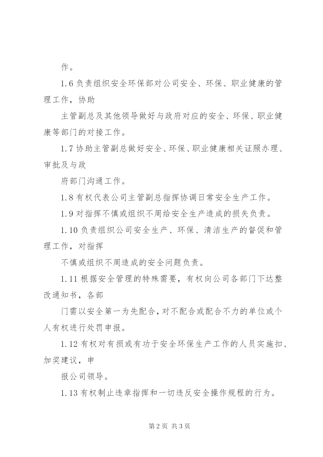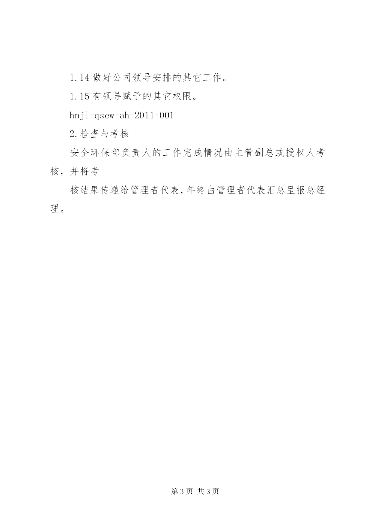 第PAGE\*Arabic\*MERGEFORMAT3页共NUMPAGES\*MERGEFORMAT3页安全环保部部门职责hnjl-qsew-ah-2011-001海南金路水泥集团有限公司安全环保部部门负责人岗位职责1.职责与权限1.1在公司主管副总的领导下,负责公司安全、环保、职业健康及体系管理工作,并对本部门工作进行总负责。1.2负责组织建立健全公司安全、环保、职业健康管理体系,组织制订本部门的管理方针、目标,并对运行负责。1.3负责公司安全、环保、职业健康相关计划的管理,根据公司安全生产情况,及时上报年度、月度安全相关费用及采购相应物件计划。1.4在主管副总的领导下,领导公司安全生产管理工作,及时督促其它生产、管理部门落实安全隐患整改计划和完成签订的安全生产目标。1.5负责对生产部门安全及文明生产进行考核,并做好信息沟通与交流工作。1.6负责组织安全环保部对公司安全、环保、职业健康的管理工作,协助主管副总及其他领导做好与政府对应的安全、环保、职业健康等部门的对接工作。1.7协助主管副总做好安全、环保、职业健康相关证照办理、审批及与政府部门沟通工作。1.8有权代表公司主管副总指挥协调日常安全生产工作。1.9对指挥不慎或组织不周给安全生产造成的损失负责。1.10负责组织公司安全生产、环保、清洁生产的督促和管理工作,对指挥不慎或组织不周造成的安全问题负责。1.11根据安全管理的特殊需要,有权向公司各部门下达整改通知书,各部门需以安全第一为先配合,对不配合或配合不力的单位或个人有权进行处罚申报。1.12有权对有损或有功于安全环保生产工作的人员实施扣、加奖建议,申报公司领导。1.13有权制止违章指挥和一切违反安全操作规程的行为。1.14做好公司领导安排的其它工作。1.15有领导赋予的其它权限。hnjl-qsew-ah-2011-0012.检查与考核安全环保部负责人的工作完成情况由主管副总或授权人考核,并将考核结果传递给管理者代表,年终由管理者代表汇总呈报总经理。