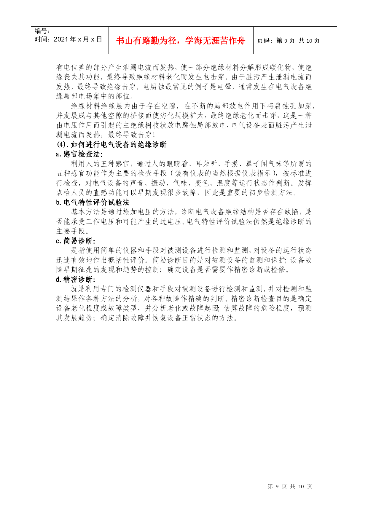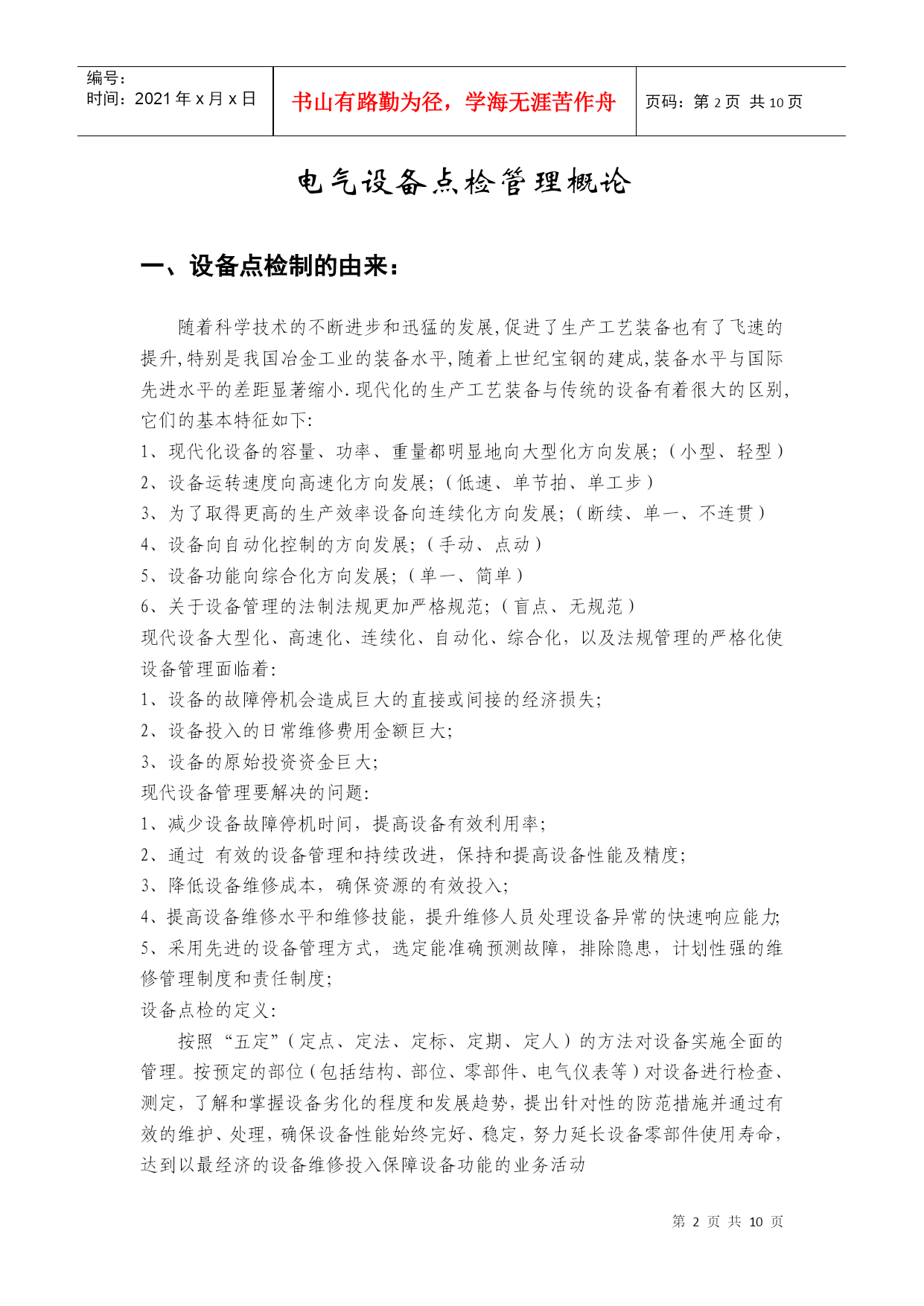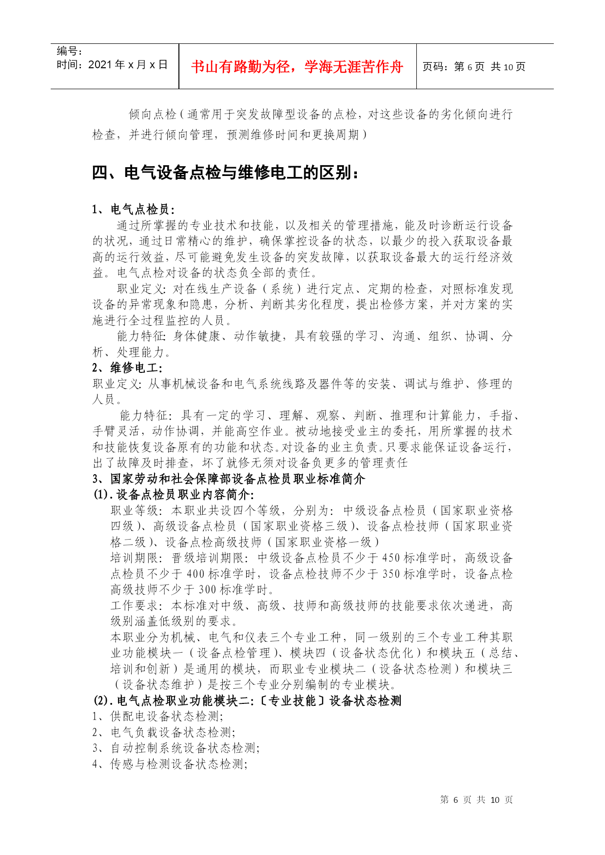 编号:时间:2021年x月x日书山有路勤为径,学海无涯苦作舟页码:第PAGE10页共NUMPAGES10页第PAGE\*MERGEFORMAT10页共NUMPAGES\*MERGEFORMAT10页HYPERLINK""HYPERLINK""更多企业学院:《中小企业管理全能版》183套讲座+89700份资料《总经理、高层管理》49套讲座+16388份资料《中层管理学院》46套讲座+6020份资料《国学智慧、易经》46套讲座《人力资源学院》56套讲座+27123份资料《各阶段员工培训学院》77套讲座+324份资料《员工管理企业学院》67套讲座+8720份资料《工厂生产管理学院》52套讲座+13920份资料《财务管理学院》53套讲座+17945份资料《销售经理学院》56套讲座+14350份资料《销售人员培训学院》72套讲座+4879份资料电气设备点检管理概论一、设备点检制的由来:随着科学技术的不断进步和迅猛的发展,促进了生产工艺装备也有了飞速的提升,特别是我国冶金工业的装备水平,随着上世纪宝钢的建成,装备水平与国际先进水平的差距显著缩小.现代化的生产工艺装备与传统的设备有着很大的区别,它们的基本特征如下:1、现代化设备的容量、功率、重量都明显地向大型化方向发展;(小型、轻型)2、设备运转速度向高速化方向发展;(低速、单节拍、单工步)3、为了取得更高的生产效率设备向连续化方向发展;(断续、单一、不连贯)4、设备向自动化控制的方向发展;(手动、点动)5、设备功能向综合化方向发展;(单一、简单)6、关于设备管理的法制法规更加严格规范;(盲点、无规范)现代设备大型化、高速化、连续化、自动化、综合化,以及法规管理的严格化使设备管理面临着:1、设备的故障停机会造成巨大的直接或间接的经济损失;2、设备投入的日常维修费用金额巨大;3、设备的原始投资资金巨大;现代设备管理要解决的问题:1、减少设备故障停机时间,提高设备有效利用率;2、通过有效的设备管理和持续改进,保持和提高设备性能及精度;3、降低设备维修成本,确保资源的有效投入;4、提高设备维修水平和维修技能,提升维修人员处理设备异常的快速响应能力;5、采用先进的设备管理方式,选定能准确预测故障,排除隐患,计划性强的维修管理制度和责任制度;设备点检的定义:按照“五定”(定点、定法、定标、定期、定人)的方法对设备实施全面的管理。按预定的部位(包括结构、部位、零部件、电气仪表等)对设备进行检查、测定,了解和掌握设备劣化的程度和发展趋势,提出针对性的防范措施并通过有效的维护、处理,确保设备性能始终完好、稳定,努力延长设备零部件使用寿命,达到以最经济的设备维修投入保障设备功能的业务活动设备点检制的定义:是一种以点检业务为核心的设备管理体制。是确保设备可靠性、维护性、经济性,并使之达到最佳化的一种,综合性的全员参与的设备维修管理(TPM)基本制度。点检制的特点:1、操作人员参与日常设备点检维护,是全员设备维修管理的重要组成;2、由专门的点检员队伍分区域负责,既从事实际的设备点检业务,又承担设备的全部管理职能;3、依据科学的点检基准,业务流程,合理的分工职责及可靠的组织体制;4、掌握先进完善的仪器、仪表及检测手段,具备必要的办公条件和维修设施的保障;5、以作业长制和全员设备维修体制为依托的制度支撑;设备定修制的简介:定修:所谓定修是指凡是必须在主作业线设备停产条件下或对主作业线生产有重大影响的一种计划检修模式。定修模型:就是各生产线的定修组合,按照能源介质平衡、物流平衡、生产平衡及检修人员平衡,设定各次定修的周期和时间的标准化模式,称之为定修模型。二、点检规程标准体系:设备维护和修理主要依据维修技术标准。它是根据设备设计制造的原始数据制订的维修标准。标准把设备的主要运动部位和易磨损部位,画出简图,标明部位名称、材质及各相关联部位的尺寸、配合公差、允许极限磨损量,还规定重点点检项目、方法、周期和更换周期。设备维修管理的四大标准:点检标准;给油脂标准;维修作业标准;维修技术标准。维修技术标准是基础,是编制其他标准的重要依据。1、维修技术标准:包括了通用维修技术标准和专用维修技术标准。通用维修技术标准规定了用于许多通用设备的标准零部件的普通标准值,而专用维修技术标准则规定了专用设备的固有的维修标准。维修技术标准主要包括了以下三方面的内容:1、主要设备装置、零部件的性能、构造(简明示意图)材质等;2、主要设备装置、零部件的维修特性(劣化倾向);3、主要设备装置、零部件的维修技术管理值2、点检标准:根据设备装置各部位的结构特点,按照“五定”的原则,详细规定了进行设