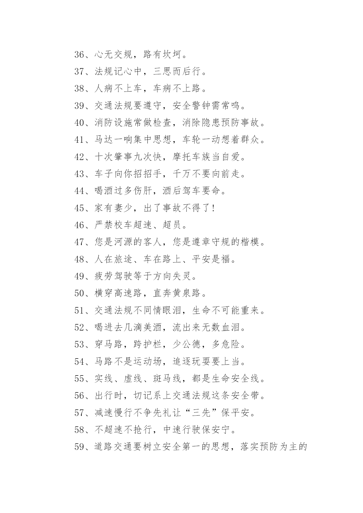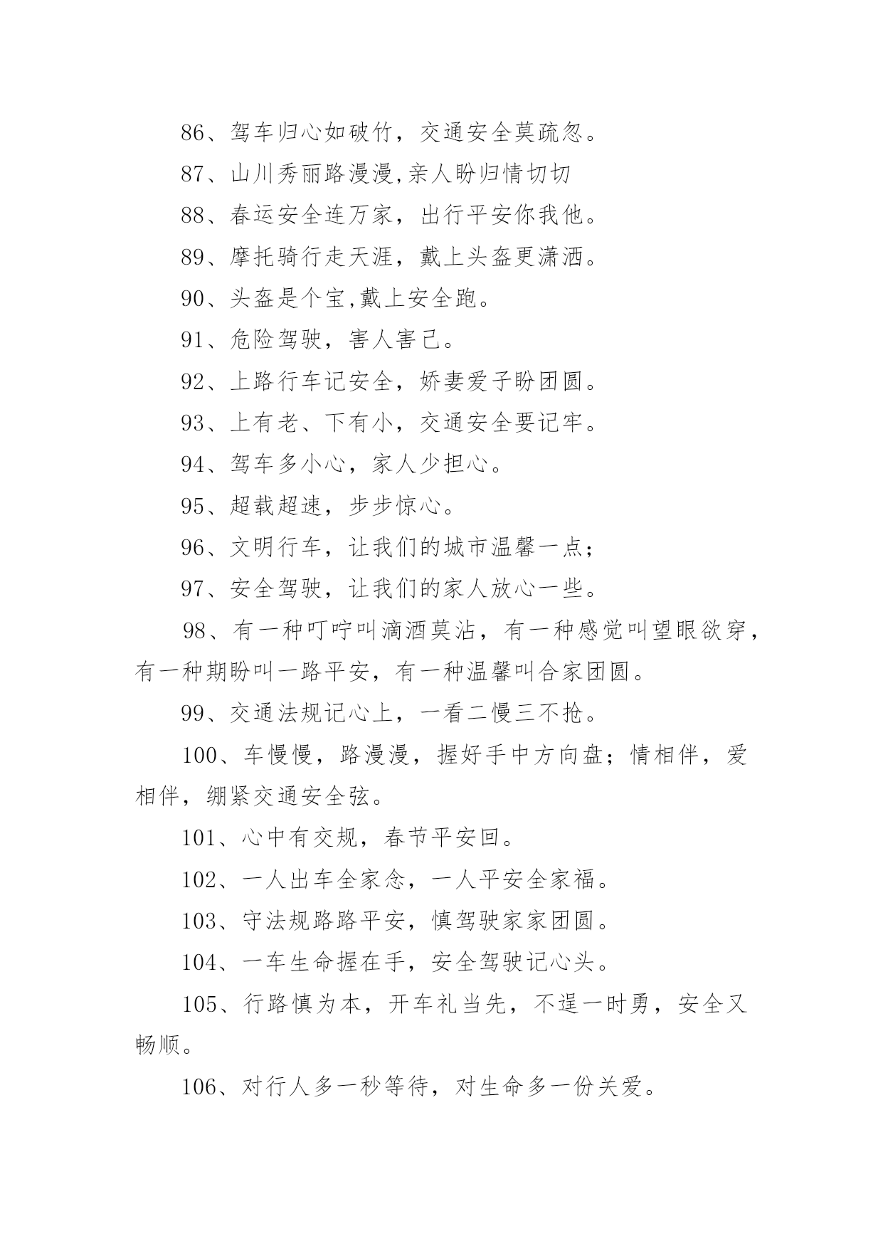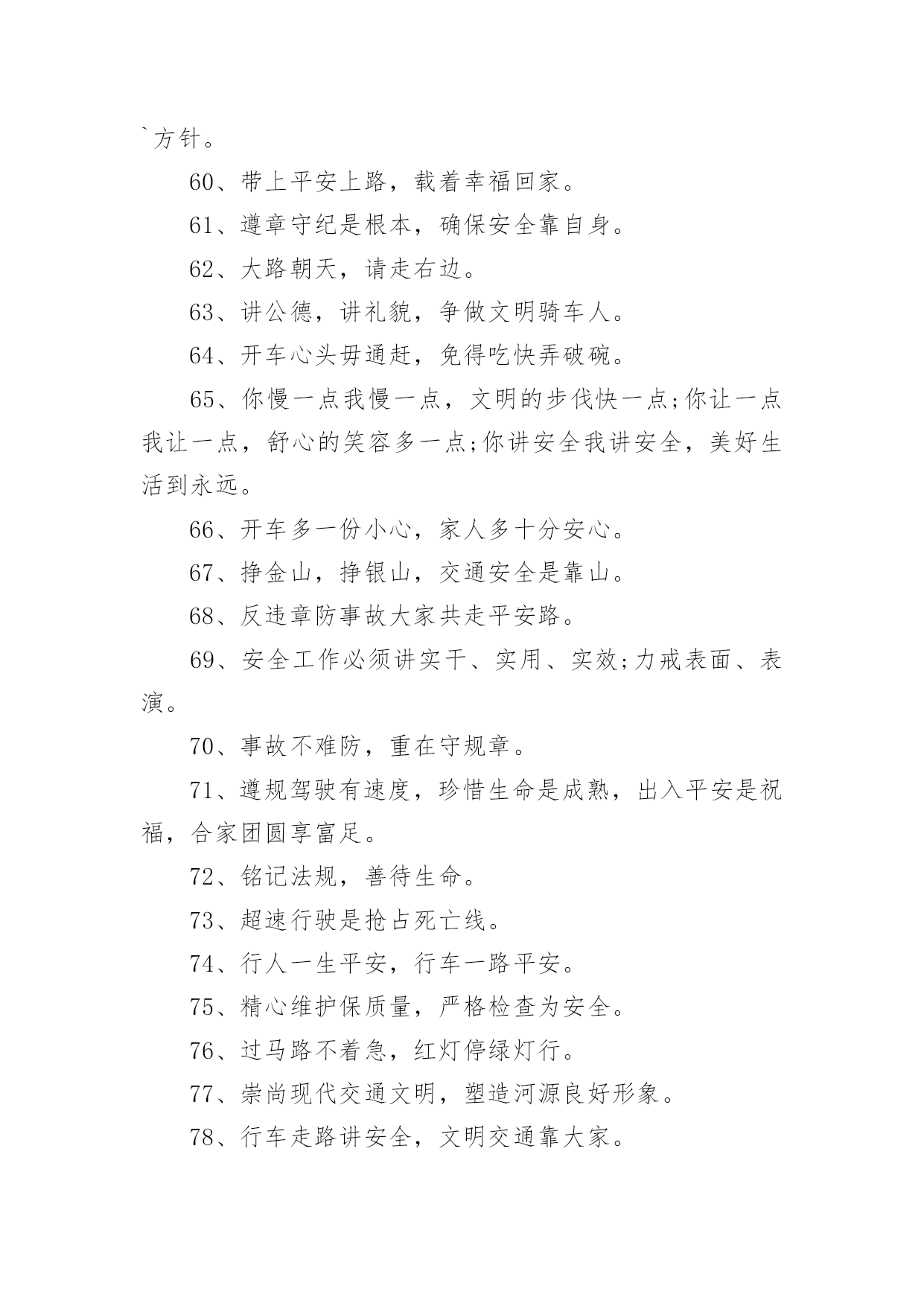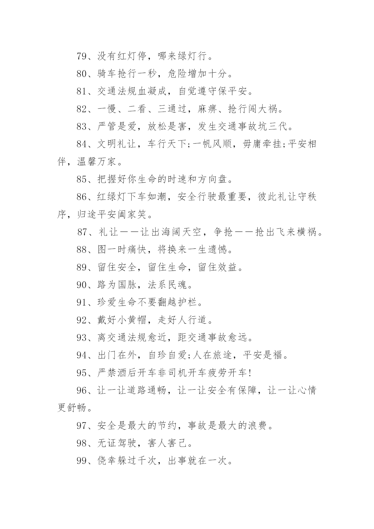 交通安全宣传的标语有关交通安全宣传的标语在平平淡淡的日常中,大家都接触过很多优秀的标语吧,标语是一种最经济、最有效的宣传、鼓动口号。那么什么样的标语才更具感染力呢?以下是小编为大家收集的有关交通安全宣传的标语,欢迎阅读,希望大家能够喜欢。有关交通安全宣传的标语11、谨慎驾驶,遵守交规,确保安全。2、享有交通权利时莫忘履行交通义务。3、道路连着你我他,安全系着千万家。4、严守交通法规,呵护自己和他人的生命了。5、拼装车报废车实行强制报废。6、居安思危危自小,有备无患患可除。7、珍爱生命、创建平安校园。8、路路无“违”,天天平安。9、维护城市交通秩序,争做河源文明市民。10、走上人行横道线,生命安全有保障。11、眼睛中藏不住一粒沙子,开车时来不得半点马虎。12、有一种叮咛叫滴酒莫沾,有一种感觉叫望眼欲穿,有一种期盼叫一路平安,有一种温馨叫合家团圆。13、道路交通安全法,伴您平安万里行。14、上班安全,下班安心,安全一生,幸福一世。15、三躲不如一停。16、十次肇事九次快,莫和死神去比赛。17、酒后驾车,生命打折。18、手持方向盘,心记万里路。19、彼此让一让,安全有保障。20、要做英雄人,不开“英雄”车。21、明责任、严纪律、互监督、重奖罚。22、你不争我不争,交通事故不发生。23、交通法规是您生命之友!24、树立交通文明意识,自觉维护交通秩序。25、创造良好交通环境。26、事故这个魔鬼,总是紧跟在心存侥幸者身后寸步不离。27、文明驾驶保安全,幸福祥和人欢乐。28、道路连着你我他安全系着千万家。29、尽职尽责、力戒违章、努力工作,确保安全。30、一家头顶一个天,一人出车一家牵,一路谨慎一路安,一人安全一家欢。31、良药苦口利于病,交通规则利于行。32、多一分麻痹,多一分危险。33、安全与遵章同在,事故与违规相随。34、讲究职业道德,保障交通安全。35、超载超速,危机四伏。36、心无交规,路有坎坷。37、法规记心中,三思而后行。38、人病不上车,车病不上路。39、交通法规要遵守,安全警钟需常鸣。40、消防设施常做检查,消除隐患预防事故。41、马达一响集中思想,车轮一动想着群众。42、十次肇事九次快,摩托车族当自爱。43、车子向你招招手,千万不要向前走。44、喝酒过多伤肝,酒后驾车要命。45、家有妻少,出了事故不得了!46、严禁校车超速、超员。47、您是河源的客人,您是遵章守规的楷模。48、人在旅途、车在路上、平安是福。49、疲劳驾驶等于方向失灵。50、横穿高速路,直奔黄泉路。51、交通法规不同情眼泪,生命不可能重来。52、喝进去几滴美酒,流出来无数血泪。53、穿马路,跨护栏,少公德,多危险。54、马路不是运动场,追逐玩耍要上当。55、实线、虚线、斑马线,都是生命安全线。56、出行时,切记系上交通法规这条安全带。57、减速慢行不争先礼让“三先”保平安。58、不超速不抢行,中速行驶保安宁。59、道路交通要树立安全第一的思想,落实预防为主的`方针。60、带上平安上路,载着幸福回家。61、遵章守纪是根本,确保安全靠自身。62、大路朝天,请走右边。63、讲公德,讲礼貌,争做文明骑车人。64、开车心头毋通赶,免得吃快弄破碗。65、你慢一点我慢一点,文明的步伐快一点;你让一点我让一点,舒心的笑容多一点;你讲安全我讲安全,美好生活到永远。66、开车多一份小心,家人多十分安心。67、挣金山,挣银山,交通安全是靠山。68、反违章防事故大家共走平安路。69、安全工作必须讲实干、实用、实效;力戒表面、表演。70、事故不难防,重在守规章。71、遵规驾驶有速度,珍惜生命是成熟,出入平安是祝福,合家团圆享富足。72、铭记法规,善待生命。73、超速行驶是抢占死亡线。74、行人一生平安,行车一路平安。75、精心维护保质量,严格检查为安全。76、过马路不着急,红灯停绿灯行。77、崇尚现代交通文明,塑造河源良好形象。78、行车走路讲安全,文明交通靠大家。79、没有红灯停,哪来绿灯行。80、骑车抢行一秒,危险增加十分。81、交通法规血凝成,自觉遵守保平安。82、一慢、二看、三通过,麻痹、抢行闯大祸。83、严管是爱,放松是害,发生交通事故坑三代。84、文明礼让,车行天下;一帆风顺,毋庸牵挂;平安相伴,温馨万家。85、把握好你生命的时速和方向盘。86、红绿灯下车如潮,安全行驶最重要,彼此礼让守秩序,归途平安阖家笑。87、礼让――让出海阔天空,争抢――抢出飞来横祸。88、图一时痛快,将换来一生遗憾。89、留住安全,留住生命,留住效益。90、路为国脉,法系民魂。91、珍爱生命不要翻越护栏。92、戴好小黄帽,走好人行道。93、离交通法规愈近,距交通事故愈远。94、出门在外,自珍自爱;人在旅途,平安是福。95、严禁酒后开车非司机开车疲劳开车!96、让一让道路通畅,让一让安全有保障