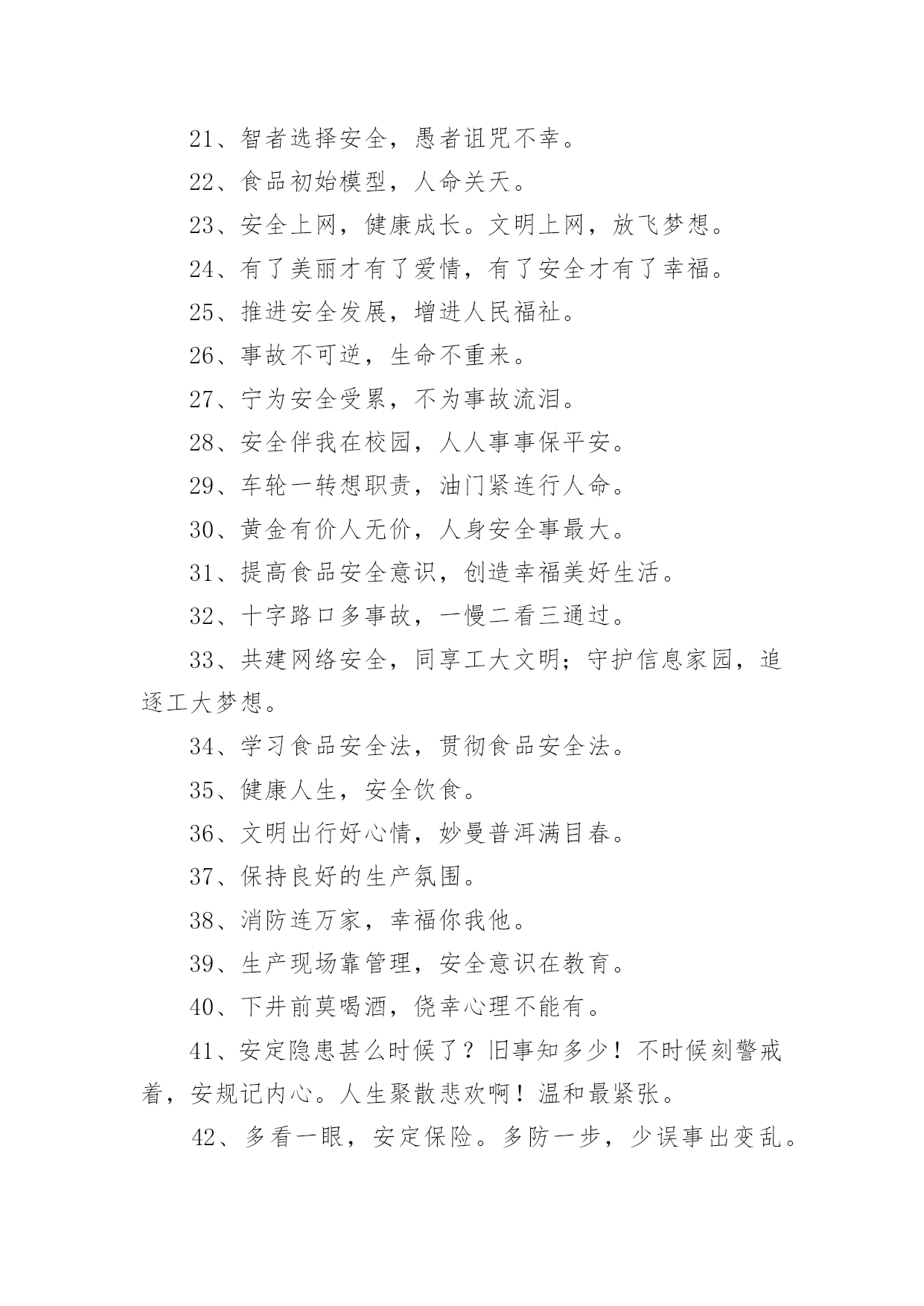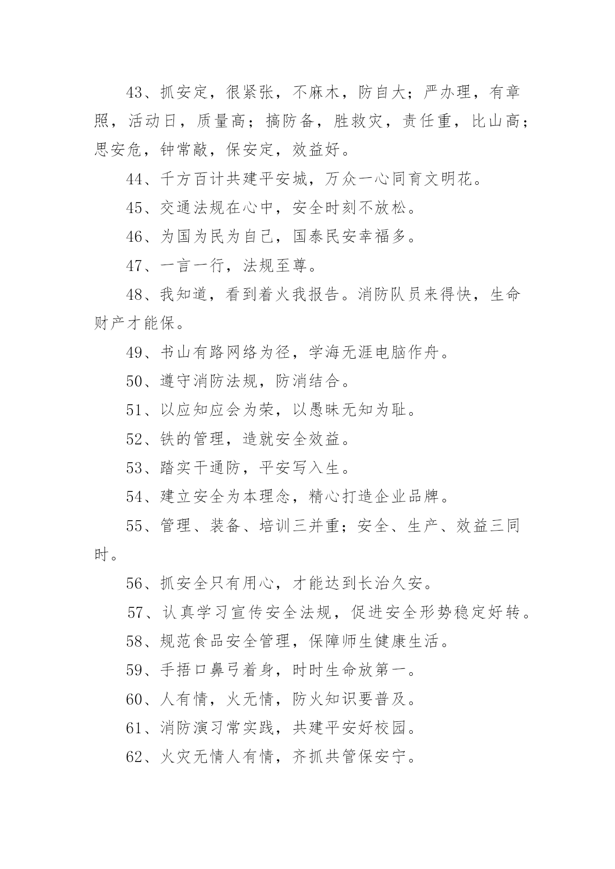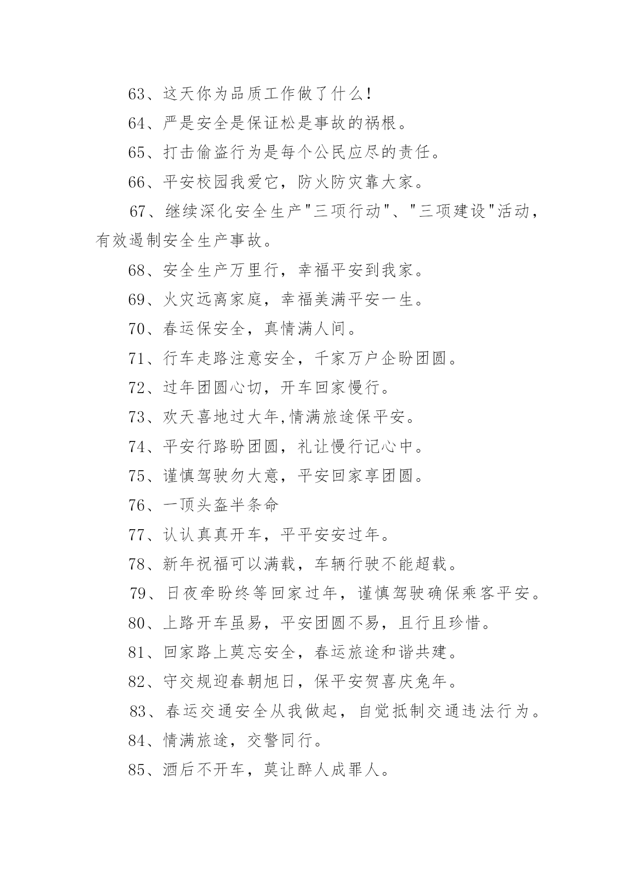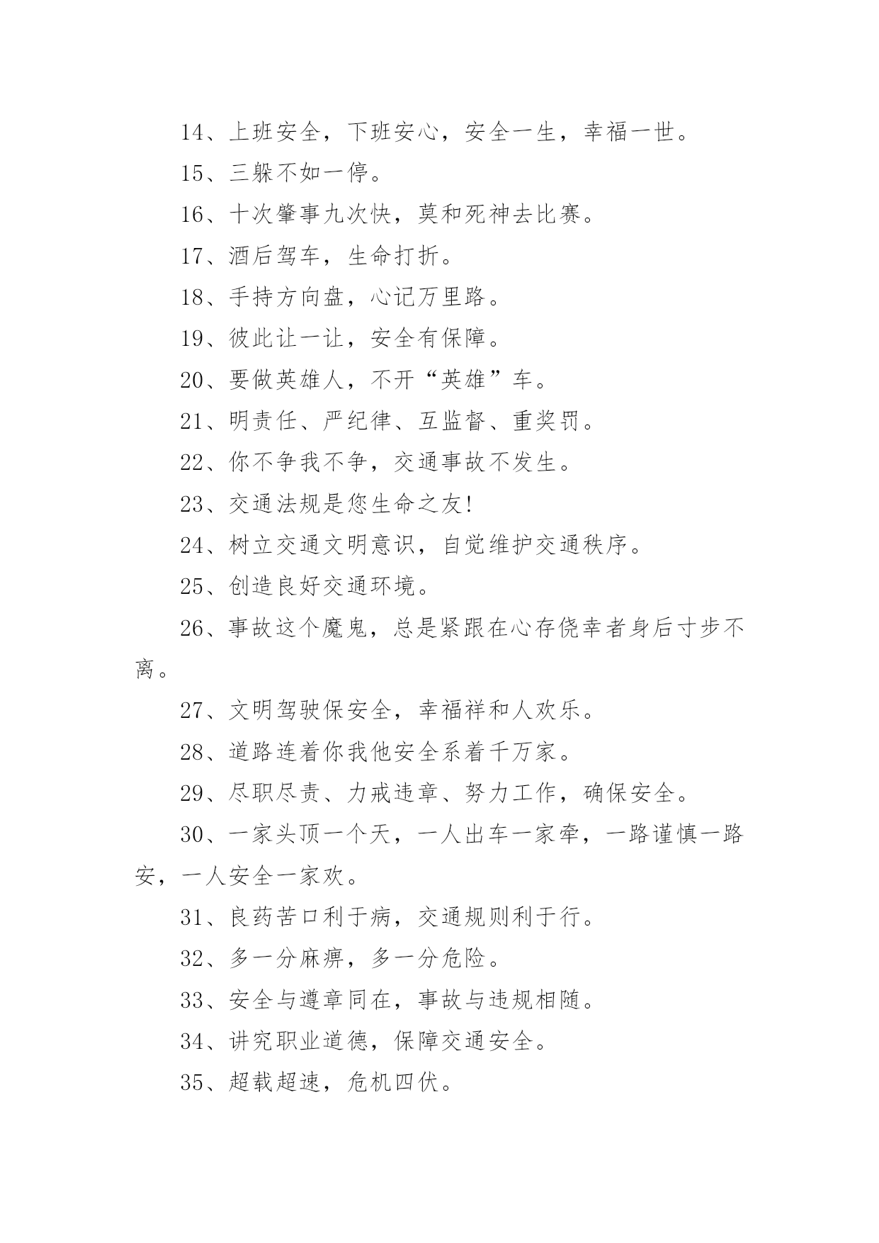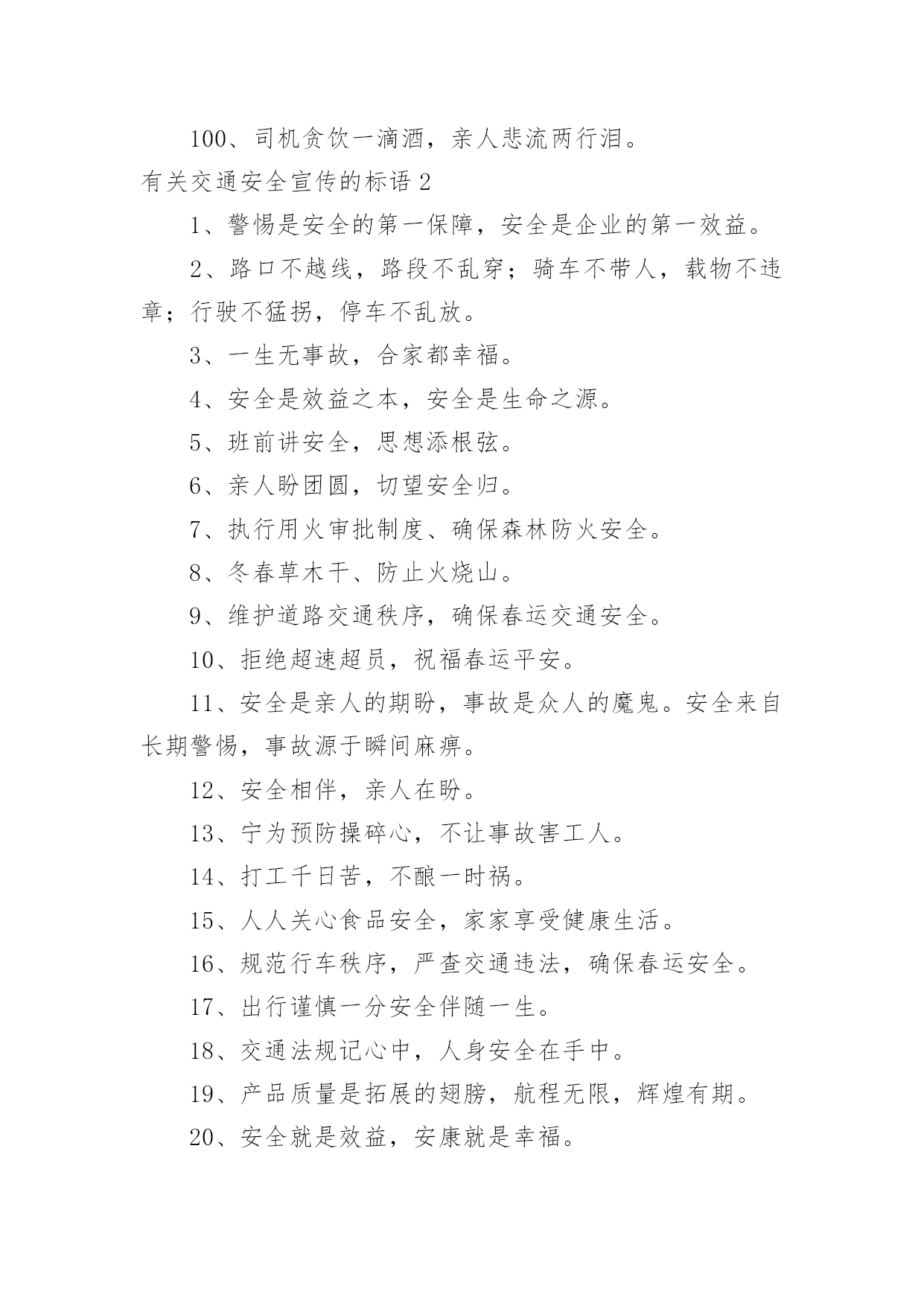 交通安全宣传的标语有关交通安全宣传的标语在平平淡淡的日常中,大家都接触过很多优秀的标语吧,标语是一种最经济、最有效的宣传、鼓动口号。那么什么样的标语才更具感染力呢?以下是小编为大家收集的有关交通安全宣传的标语,欢迎阅读,希望大家能够喜欢。有关交通安全宣传的标语11、谨慎驾驶,遵守交规,确保安全。2、享有交通权利时莫忘履行交通义务。3、道路连着你我他,安全系着千万家。4、严守交通法规,呵护自己和他人的生命了。5、拼装车报废车实行强制报废。6、居安思危危自小,有备无患患可除。7、珍爱生命、创建平安校园。8、路路无“违”,天天平安。9、维护城市交通秩序,争做河源文明市民。10、走上人行横道线,生命安全有保障。11、眼睛中藏不住一粒沙子,开车时来不得半点马虎。12、有一种叮咛叫滴酒莫沾,有一种感觉叫望眼欲穿,有一种期盼叫一路平安,有一种温馨叫合家团圆。13、道路交通安全法,伴您平安万里行。14、上班安全,下班安心,安全一生,幸福一世。15、三躲不如一停。16、十次肇事九次快,莫和死神去比赛。17、酒后驾车,生命打折。18、手持方向盘,心记万里路。19、彼此让一让,安全有保障。20、要做英雄人,不开“英雄”车。21、明责任、严纪律、互监督、重奖罚。22、你不争我不争,交通事故不发生。23、交通法规是您生命之友!24、树立交通文明意识,自觉维护交通秩序。25、创造良好交通环境。26、事故这个魔鬼,总是紧跟在心存侥幸者身后寸步不离。27、文明驾驶保安全,幸福祥和人欢乐。28、道路连着你我他安全系着千万家。29、尽职尽责、力戒违章、努力工作,确保安全。30、一家头顶一个天,一人出车一家牵,一路谨慎一路安,一人安全一家欢。31、良药苦口利于病,交通规则利于行。32、多一分麻痹,多一分危险。33、安全与遵章同在,事故与违规相随。34、讲究职业道德,保障交通安全。35、超载超速,危机四伏。36、心无交规,路有坎坷。37、法规记心中,三思而后行。38、人病不上车,车病不上路。39、交通法规要遵守,安全警钟需常鸣。40、消防设施常做检查,消除隐患预防事故。41、马达一响集中思想,车轮一动想着群众。42、十次肇事九次快,摩托车族当自爱。43、车子向你招招手,千万不要向前走。44、喝酒过多伤肝,酒后驾车要命。45、家有妻少,出了事故不得了!46、严禁校车超速、超员。47、您是河源的客人,您是遵章守规的楷模。48、人在旅途、车在路上、平安是福。49、疲劳驾驶等于方向失灵。50、横穿高速路,直奔黄泉路。51、交通法规不同情眼泪,生命不可能重来。52、喝进去几滴美酒,流出来无数血泪。53、穿马路,跨护栏,少公德,多危险。54、马路不是运动场,追逐玩耍要上当。55、实线、虚线、斑马线,都是生命安全线。56、出行时,切记系上交通法规这条安全带。57、减速慢行不争先礼让“三先”保平安。58、不超速不抢行,中速行驶保安宁。59、道路交通要树立安全第一的思想,落实预防为主的`方针。60、带上平安上路,载着幸福回家。61、遵章守纪是根本,确保安全靠自身。62、大路朝天,请走右边。63、讲公德,讲礼貌,争做文明骑车人。64、开车心头毋通赶,免得吃快弄破碗。65、你慢一点我慢一点,文明的步伐快一点;你让一点我让一点,舒心的笑容多一点;你讲安全我讲安全,美好生活到永远。66、开车多一份小心,家人多十分安心。67、挣金山,挣银山,交通安全是靠山。68、反违章防事故大家共走平安路。69、安全工作必须讲实干、实用、实效;力戒表面、表演。70、事故不难防,重在守规章。71、遵规驾驶有速度,珍惜生命是成熟,出入平安是祝福,合家团圆享富足。72、铭记法规,善待生命。73、超速行驶是抢占死亡线。74、行人一生平安,行车一路平安。75、精心维护保质量,严格检查为安全。76、过马路不着急,红灯停绿灯行。77、崇尚现代交通文明,塑造河源良好形象。78、行车走路讲安全,文明交通靠大家。79、没有红灯停,哪来绿灯行。80、骑车抢行一秒,危险增加十分。81、交通法规血凝成,自觉遵守保平安。82、一慢、二看、三通过,麻痹、抢行闯大祸。83、严管是爱,放松是害,发生交通事故坑三代。84、文明礼让,车行天下;一帆风顺,毋庸牵挂;平安相伴,温馨万家。85、把握好你生命的时速和方向盘。86、红绿灯下车如潮,安全行驶最重要,彼此礼让守秩序,归途平安阖家笑。87、礼让――让出海阔天空,争抢――抢出飞来横祸。88、图一时痛快,将换来一生遗憾。89、留住安全,留住生命,留住效益。90、路为国脉,法系民魂。91、珍爱生命不要翻越护栏。92、戴好小黄帽,走好人行道。93、离交通法规愈近,距交通事故愈远。94、出门在外,自珍自爱;人在旅途,平安是福。95、严禁酒后开车非司机开车疲劳开车!96、让一让道路通畅,让一让安全有保障