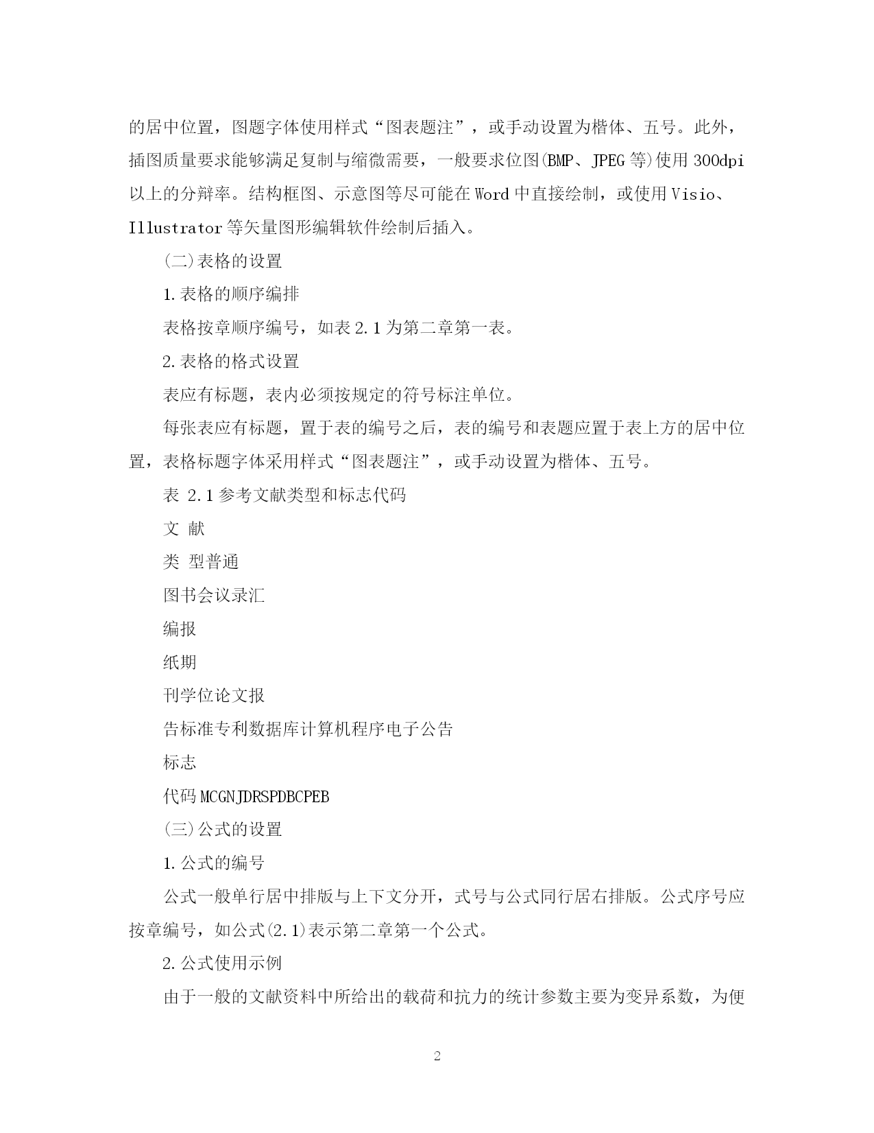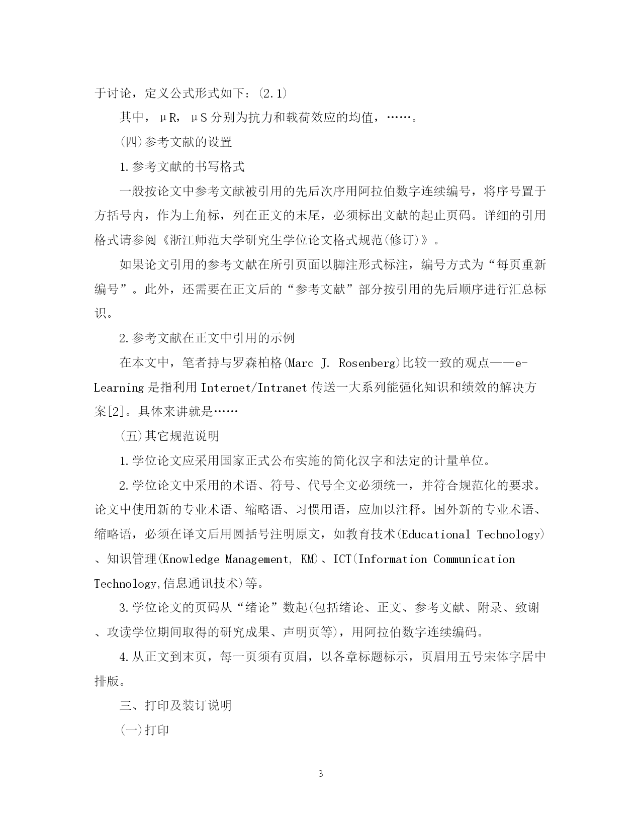 此资料由网络收集而来,如有侵权请告知上传者立即删除。资料共分享,我们负责传递知识。PAGEPAGE4研究生毕业论文基本格式要求一、论文格式基本要求1.各级标题的格式设置(1)各级标题的样式选择论文中的一级标题,请选择论文模板中的样式“标题1”;论文中的二级标题,请选择论文模板中的样式“标题2”;论文中的三级标题,请选择论文模板中的样式“标题3”;论文中的四级标题,请选择论文模板中的样式“标题4”;(2)文理科各级标题的编排方式文科学位论文的章节标题标号一般多采用以“一、(一)1.(1)”等数字依次编排。理工科学位论文的章节标题标号一般多按如下方式编排:一级标号:123……二级标号:1.11.21.3……三级标号:1.1.11.1.21.1.3……四级标号:1.1.1.11.1.1.21.1.1.3……本模板以文科学位论文要求进行编排,请研究生在编辑自己的学位论文中依据所在学科选择相应的标题编排方式。2.正文的格式设置采用小四号宋体字。正文是硕士学位论文的主体,要着重反映研究生自己的工作,要突出新的见解,例如新思想、新观点、新规律、新研究方法、新结果等。二、图表等元素的设置说明(一)插图的设置1.插图的格式图号按章顺序编号,如图2.1为第二章第一图。图的编号和图题应置于图下方的居中位置,图题字体使用样式“图表题注”,或手动设置为楷体、五号。此外,插图质量要求能够满足复制与缩微需要,一般要求位图(BMP、JPEG等)使用300dpi以上的分辩率。结构框图、示意图等尽可能在Word中直接绘制,或使用Visio、Illustrator等矢量图形编辑软件绘制后插入。(二)表格的设置1.表格的顺序编排表格按章顺序编号,如表2.1为第二章第一表。2.表格的格式设置表应有标题,表内必须按规定的符号标注单位。每张表应有标题,置于表的编号之后,表的编号和表题应置于表上方的居中位置,表格标题字体采用样式“图表题注”,或手动设置为楷体、五号。表2.1参考文献类型和标志代码文献类型普通图书会议录汇编报纸期刊学位论文报告标准专利数据库计算机程序电子公告标志代码MCGNJDRSPDBCPEB(三)公式的设置1.公式的编号公式一般单行居中排版与上下文分开,式号与公式同行居右排版。公式序号应按章编号,如公式(2.1)表示第二章第一个公式。2.公式使用示例由于一般的文献资料中所给出的载荷和抗力的统计参数主要为变异系数,为便于讨论,定义公式形式如下:(2.1)其中,μR,μS分别为抗力和载荷效应的均值,……。(四)参考文献的设置1.参考文献的书写格式一般按论文中参考文献被引用的先后次序用阿拉伯数字连续编号,将序号置于方括号内,作为上角标,列在正文的末尾,必须标出文献的起止页码。详细的引用格式请参阅《浙江师范大学研究生学位论文格式规范(修订)》。如果论文引用的参考文献在所引页面以脚注形式标注,编号方式为“每页重新编号”。此外,还需要在正文后的“参考文献”部分按引用的先后顺序进行汇总标识。2.参考文献在正文中引用的示例在本文中,笔者持与罗森柏格(MarcJ.Rosenberg)比较一致的观点——e-Learning是指利用Internet/Intranet传送一大系列能强化知识和绩效的解决方案[2]。具体来讲就是……(五)其它规范说明1.学位论文应采用国家正式公布实施的简化汉字和法定的计量单位。2.学位论文中采用的术语、符号、代号全文必须统一,并符合规范化的要求。论文中使用新的专业术语、缩略语、习惯用语,应加以注释。国外新的专业术语、缩略语,必须在译文后用圆括号注明原文,如教育技术(EducationalTechnology)、知识管理(KnowledgeManagement,KM)、ICT(InformationCommunicationTechnology,信息通讯技术)等。3.学位论文的页码从“绪论”数起(包括绪论、正文、参考文献、附录、致谢、攻读学位期间取得的研究成果、声明页等),用阿拉伯数字连续编码。4.从正文到末页,每一页须有页眉,以各章标题标示,页眉用五号宋体字居中排版。三、打印及装订说明(一)打印研究生学位论文内容一律采用计算机编辑,用A4规格白纸输出,其中:封面、扉页单独打印,须按照相应的模板打印至特定纸质,均采用单面打印;中文摘要单独打印,如果有多页,双面打印;英文摘要单独打印,如果有多页,双面打印;目录单独打印,如果是多页,双面打印;正文开始到致谢结束,采用双面打印。(二)装订用研究生学院规定的统一封面线装成册,学位论文页面四周应留足空白边缘,以便装订、复制和读者批注。参考文献[1]阮高峰,徐