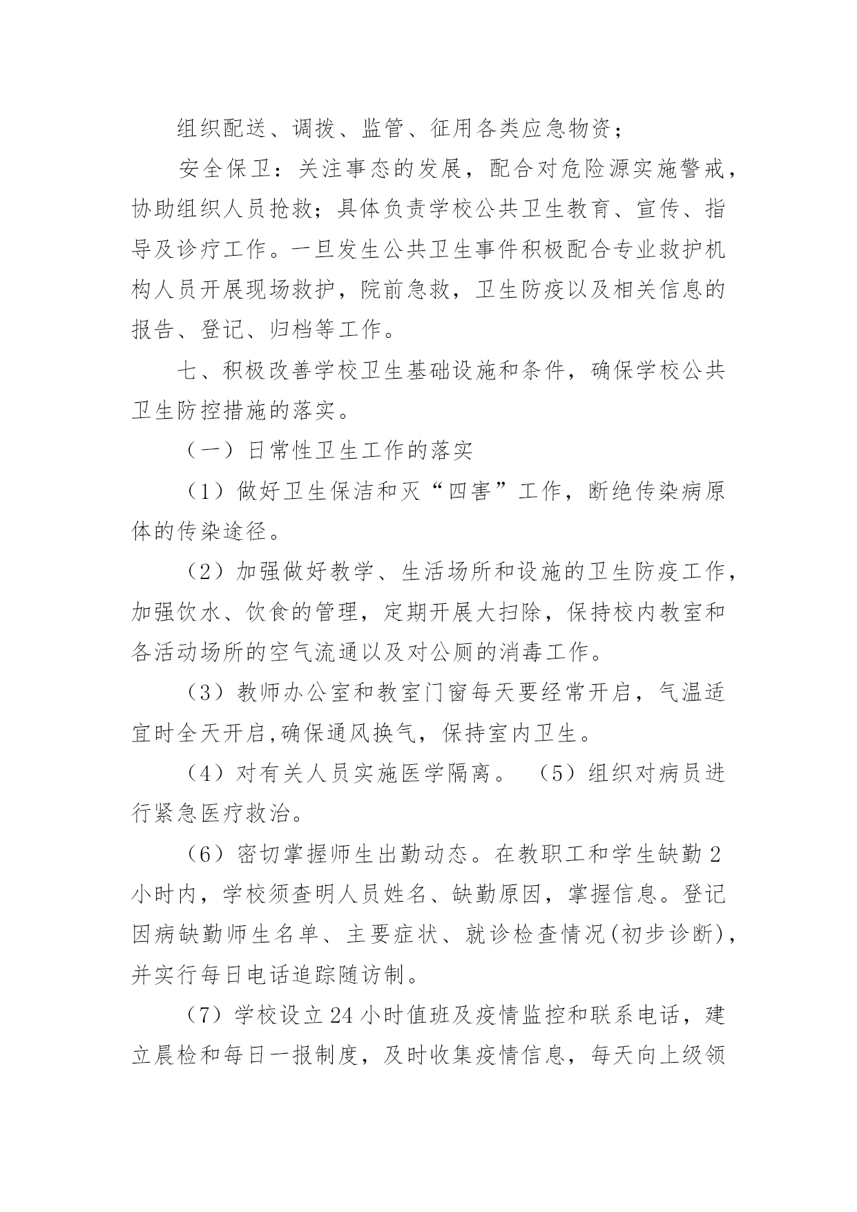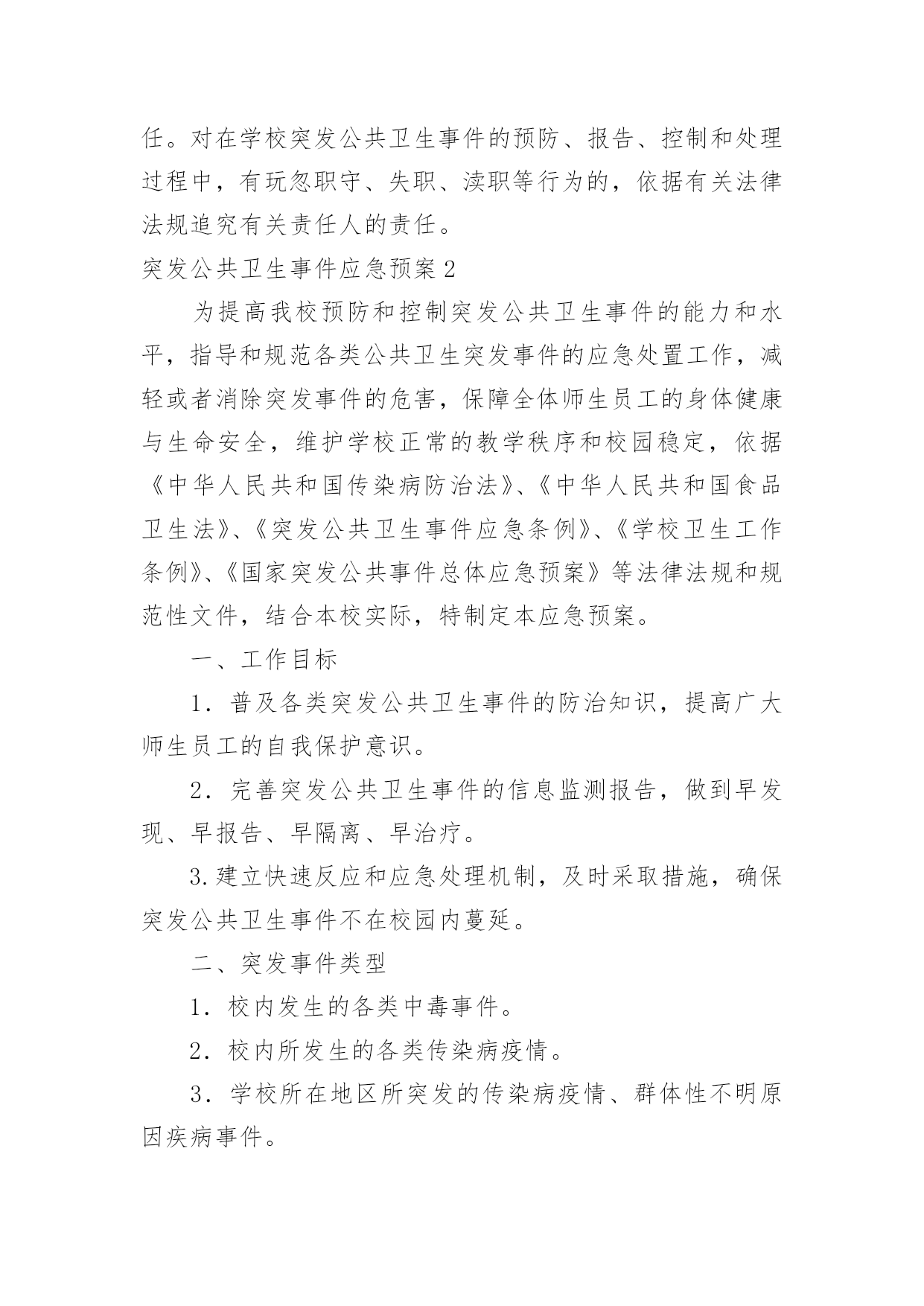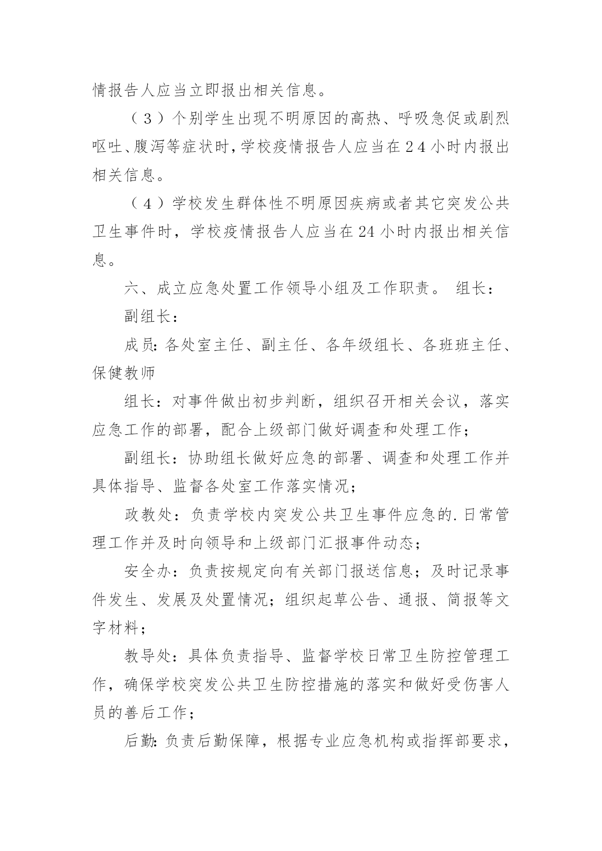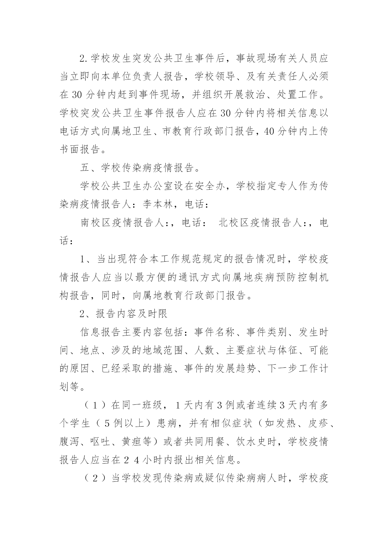 突发公共卫生事件应急预案突发公共卫生事件应急预案在平时的学习、工作或生活中,有时会突发一些难以预料的事件,为了降低事故造成的危害,通常需要预先编制一份完整的应急预案。写应急预案需要注意哪些格式呢?下面是小编为大家收集的突发公共卫生事件应急预案,欢迎阅读,希望大家能够喜欢。突发公共卫生事件应急预案1为有效预防、及时控制和消除学校突发公共卫生事件的危害,保障师生身体健康和生命安全,保障学校的正常教学秩序,维护社会的稳定,根据《传染病防治法》、《突发公共卫生事件应急条例》和《突发公共卫生事件应急办法》等法律法规的规定,结合我校工作实际,制定本预案。一、提高认识,加强领导。学校人群高度密集,是传染病容易传播的地方,从保障师生身体健康和生命安全,维护社会稳定的大局出发,学校全体教职工应充分认识学校公共突发事件防控工作的重要性,积极配合卫生监督机构和疾病预防控制机构督促、检查,认真落实责任制。二、切实做好传染病的宣传工作。通过健康教育课、墙报、专题知识讲座、给家长一封信等途径对全校师生、家长进行传染病的教育宣传工作,帮助师生掌握公共卫生基本知识和技能。三、建立疫情监测制度:学校要建立完善的学生晨检、因病缺勤病因追查与登记制度。1、晨检:晨检应在学校疫情报告员的指导下进行,由班主任或班级卫生员对早晨到校的每个学生进行观察、询问,了解学生出勤、健康状况。发现学生有传染病早期症状(如发热、皮疹、腹泻、呕吐、黄疸等)以及疑似传染病病人时,应当及时告知学校疫情报告人,学校疫情报告人要进行进一步排查,以确保做到对病人的早发现、早报告,并做好相应的表格填写。2、因病缺勤:班主任应当密切关注本班学生的出勤情况,对于因病缺勤的学生,应当了解学生的患病情况和可能的病因,如有怀疑,要每天下午放学前填好因病缺勤表格,报告给学校疫情报告人。学校疫情报告人接到报告后应及时追查学生的患病情况和可能的病因,以做到对病人的早发现。四、学校建立传染病疫情报告管理制度,实行责任制。1.本着“先控制、后处置、救人第一、减少损失”及“早发现、早报告、早控制、早治疗、早处理”的原则,果断处置,积极抢救,严防次生衍生事故发生。学校指定专人作为传染病疫情报告人:负责具体传染病报告工作,并由校长主管,确保传染病报告管理工作的落实。并且建立由学生到教师、到学校疫情报告人、到学校领导的传染病疫情发现、信息登记与报告制度。2.学校发生突发公共卫生事件后,事故现场有关人员应当立即向本单位负责人报告,学校领导、及有关责任人必须在30分钟内赶到事件现场,并组织开展救治、处置工作。学校突发公共卫生事件报告人应在30分钟内将相关信息以电话方式向属地卫生、市教育行政部门报告,40分钟内上传书面报告。五、学校传染病疫情报告。学校公共卫生办公室设在安全办,学校指定专人作为传染病疫情报告人:李本林,电话:南校区疫情报告人:,电话:北校区疫情报告人:,电话:1、当出现符合本工作规范规定的报告情况时,学校疫情报告人应当以最方便的通讯方式向属地疾病预防控制机构报告,同时,向属地教育行政部门报告。2、报告内容及时限信息报告主要内容包括:事件名称、事件类别、发生时间、地点、涉及的地域范围、人数、主要症状与体征、可能的原因、已经采取的措施、事件的发展趋势、下一步工作计划等。(1)在同一班级,1天内有3例或者连续3天内有多个学生(5例以上)患病,并有相似症状(如发热、皮疹、腹泻、呕吐、黄疸等)或者共同用餐、饮水史时,学校疫情报告人应当在24小时内报出相关信息。(2)当学校发现传染病或疑似传染病病人时,学校疫情报告人应当立即报出相关信息。(3)个别学生出现不明原因的高热、呼吸急促或剧烈呕吐、腹泻等症状时,学校疫情报告人应当在24小时内报出相关信息。(4)学校发生群体性不明原因疾病或者其它突发公共卫生事件时,学校疫情报告人应当在24小时内报出相关信息。六、成立应急处置工作领导小组及工作职责。组长:副组长:成员:各处室主任、副主任、各年级组长、各班班主任、保健教师组长:对事件做出初步判断,组织召开相关会议,落实应急工作的部署,配合上级部门做好调查和处理工作;副组长:协助组长做好应急的部署、调查和处理工作并具体指导、监督各处室工作落实情况;政教处:负责学校内突发公共卫生事件应急的.日常管理工作并及时向领导和上级部门汇报事件动态;安全办:负责按规定向有关部门报送信息;及时记录事件发生、发展及处置情况;组织起草公告、通报、简报等文字材料;教导处:具体负责指导、监督学校日常卫生防控管理工作,确保学校突发公共卫生防控措施的落实和做好受伤害人员的善后工作;后勤:负责后勤保障,根据专业应急机构或指挥部要求,组织配送、调拨、监管、征用各类应急物资;安全保卫:关注事态的发展,配合对危险源实施警戒,协助组织人员抢救;具体负责学校公共卫生教育、宣传