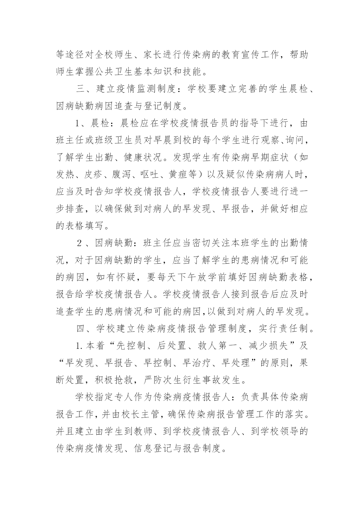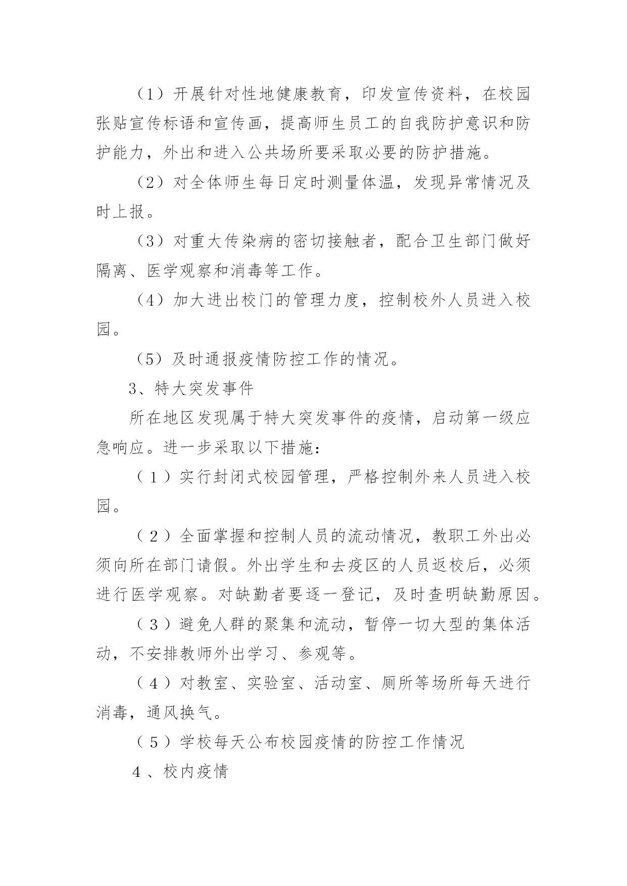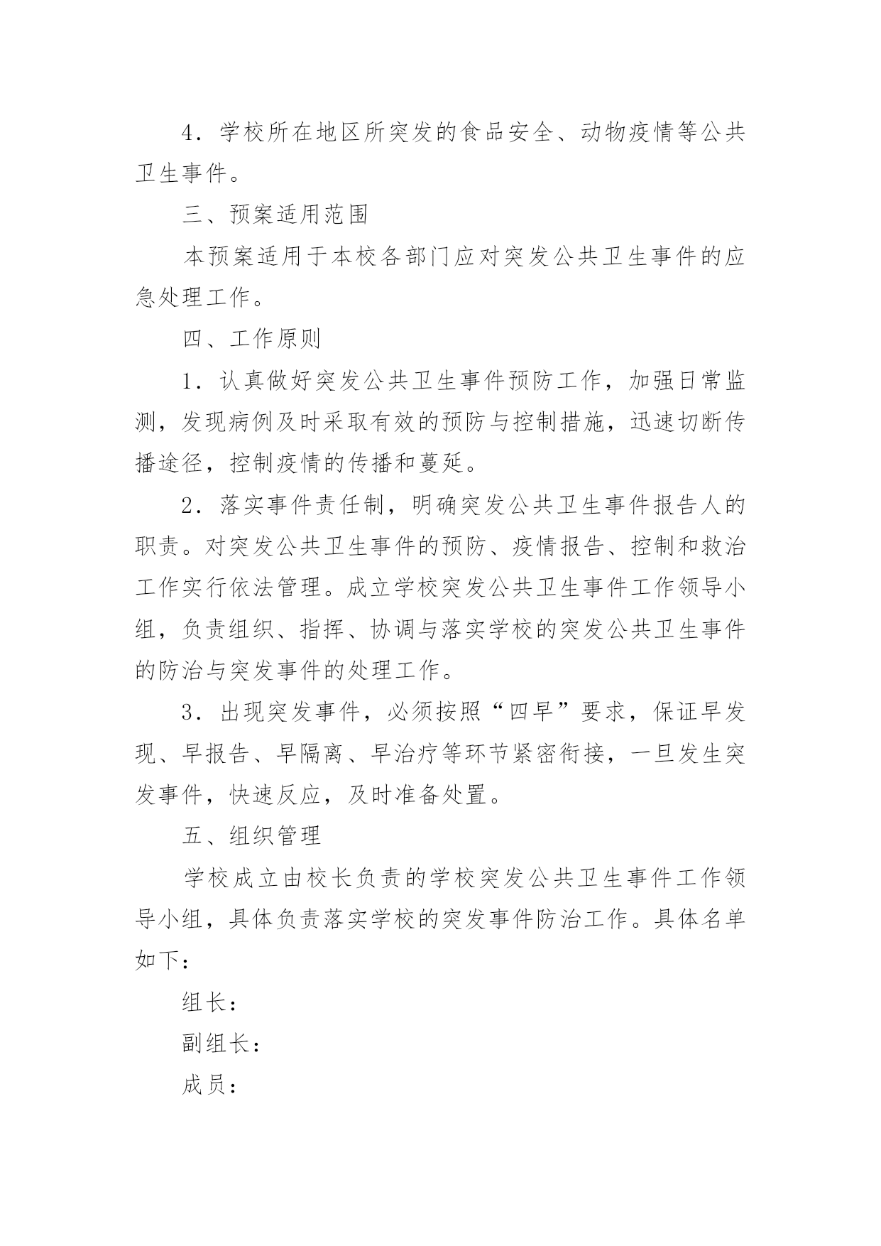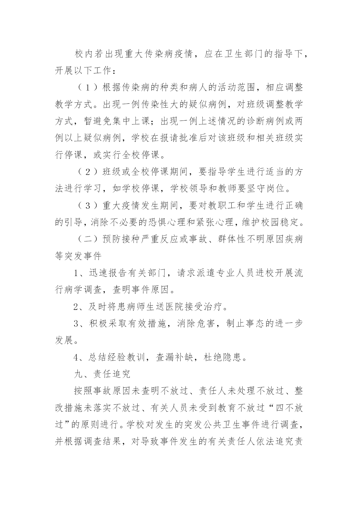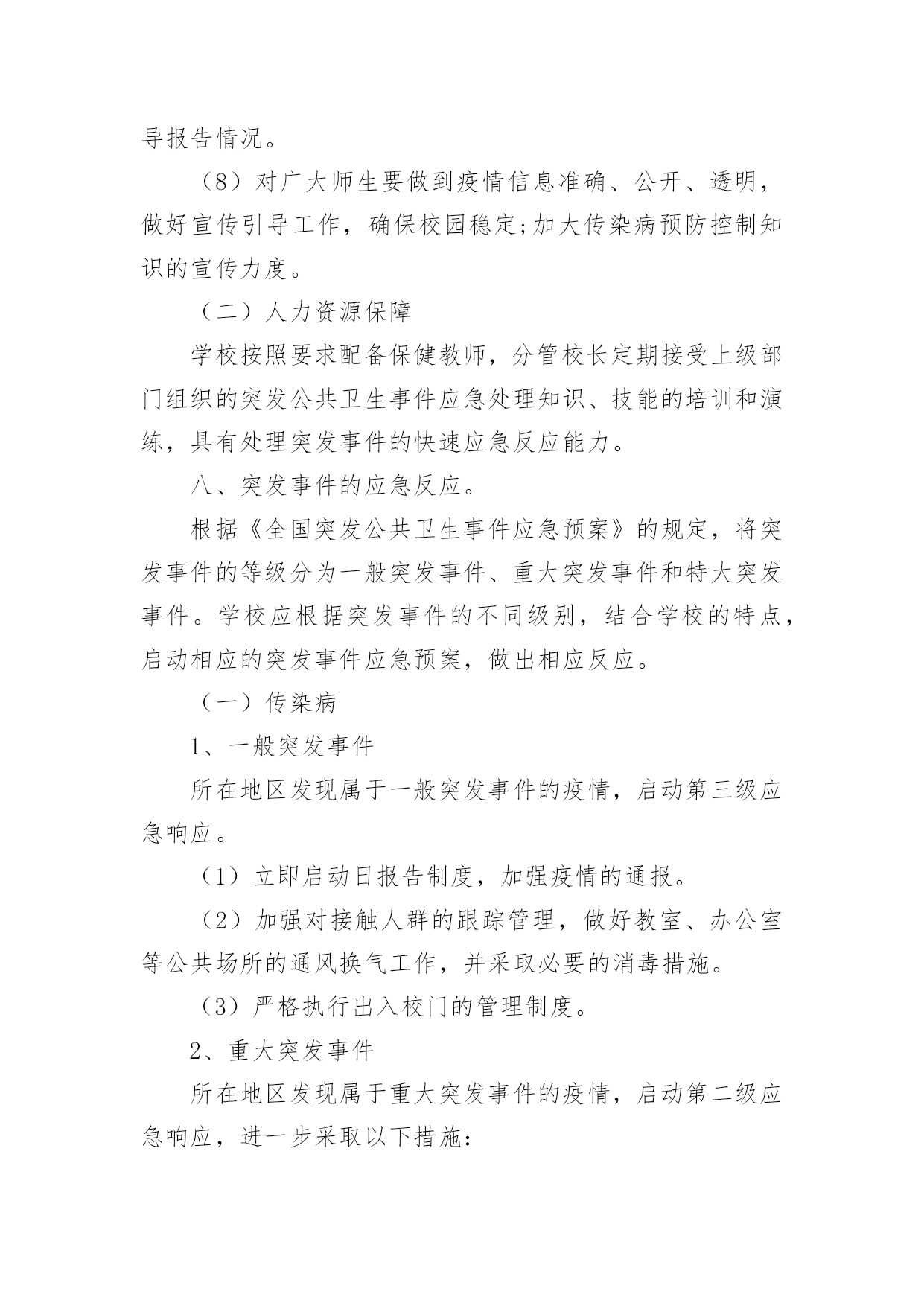 突发公共卫生事件应急预案突发公共卫生事件应急预案在平时的学习、工作或生活中,有时会突发一些难以预料的事件,为了降低事故造成的危害,通常需要预先编制一份完整的应急预案。写应急预案需要注意哪些格式呢?下面是小编为大家收集的突发公共卫生事件应急预案,欢迎阅读,希望大家能够喜欢。突发公共卫生事件应急预案1为有效预防、及时控制和消除学校突发公共卫生事件的危害,保障师生身体健康和生命安全,保障学校的正常教学秩序,维护社会的稳定,根据《传染病防治法》、《突发公共卫生事件应急条例》和《突发公共卫生事件应急办法》等法律法规的规定,结合我校工作实际,制定本预案。一、提高认识,加强领导。学校人群高度密集,是传染病容易传播的地方,从保障师生身体健康和生命安全,维护社会稳定的大局出发,学校全体教职工应充分认识学校公共突发事件防控工作的重要性,积极配合卫生监督机构和疾病预防控制机构督促、检查,认真落实责任制。二、切实做好传染病的宣传工作。通过健康教育课、墙报、专题知识讲座、给家长一封信等途径对全校师生、家长进行传染病的教育宣传工作,帮助师生掌握公共卫生基本知识和技能。三、建立疫情监测制度:学校要建立完善的学生晨检、因病缺勤病因追查与登记制度。1、晨检:晨检应在学校疫情报告员的指导下进行,由班主任或班级卫生员对早晨到校的每个学生进行观察、询问,了解学生出勤、健康状况。发现学生有传染病早期症状(如发热、皮疹、腹泻、呕吐、黄疸等)以及疑似传染病病人时,应当及时告知学校疫情报告人,学校疫情报告人要进行进一步排查,以确保做到对病人的早发现、早报告,并做好相应的表格填写。2、因病缺勤:班主任应当密切关注本班学生的出勤情况,对于因病缺勤的学生,应当了解学生的患病情况和可能的病因,如有怀疑,要每天下午放学前填好因病缺勤表格,报告给学校疫情报告人。学校疫情报告人接到报告后应及时追查学生的患病情况和可能的病因,以做到对病人的早发现。四、学校建立传染病疫情报告管理制度,实行责任制。1.本着“先控制、后处置、救人第一、减少损失”及“早发现、早报告、早控制、早治疗、早处理”的原则,果断处置,积极抢救,严防次生衍生事故发生。学校指定专人作为传染病疫情报告人:负责具体传染病报告工作,并由校长主管,确保传染病报告管理工作的落实。并且建立由学生到教师、到学校疫情报告人、到学校领导的传染病疫情发现、信息登记与报告制度。2.学校发生突发公共卫生事件后,事故现场有关人员应当立即向本单位负责人报告,学校领导、及有关责任人必须在30分钟内赶到事件现场,并组织开展救治、处置工作。学校突发公共卫生事件报告人应在30分钟内将相关信息以电话方式向属地卫生、市教育行政部门报告,40分钟内上传书面报告。五、学校传染病疫情报告。学校公共卫生办公室设在安全办,学校指定专人作为传染病疫情报告人:李本林,电话:南校区疫情报告人:,电话:北校区疫情报告人:,电话:1、当出现符合本工作规范规定的报告情况时,学校疫情报告人应当以最方便的通讯方式向属地疾病预防控制机构报告,同时,向属地教育行政部门报告。2、报告内容及时限信息报告主要内容包括:事件名称、事件类别、发生时间、地点、涉及的地域范围、人数、主要症状与体征、可能的原因、已经采取的措施、事件的发展趋势、下一步工作计划等。(1)在同一班级,1天内有3例或者连续3天内有多个学生(5例以上)患病,并有相似症状(如发热、皮疹、腹泻、呕吐、黄疸等)或者共同用餐、饮水史时,学校疫情报告人应当在24小时内报出相关信息。(2)当学校发现传染病或疑似传染病病人时,学校疫情报告人应当立即报出相关信息。(3)个别学生出现不明原因的高热、呼吸急促或剧烈呕吐、腹泻等症状时,学校疫情报告人应当在24小时内报出相关信息。(4)学校发生群体性不明原因疾病或者其它突发公共卫生事件时,学校疫情报告人应当在24小时内报出相关信息。六、成立应急处置工作领导小组及工作职责。组长:副组长:成员:各处室主任、副主任、各年级组长、各班班主任、保健教师组长:对事件做出初步判断,组织召开相关会议,落实应急工作的部署,配合上级部门做好调查和处理工作;副组长:协助组长做好应急的部署、调查和处理工作并具体指导、监督各处室工作落实情况;政教处:负责学校内突发公共卫生事件应急的.日常管理工作并及时向领导和上级部门汇报事件动态;安全办:负责按规定向有关部门报送信息;及时记录事件发生、发展及处置情况;组织起草公告、通报、简报等文字材料;教导处:具体负责指导、监督学校日常卫生防控管理工作,确保学校突发公共卫生防控措施的落实和做好受伤害人员的善后工作;后勤:负责后勤保障,根据专业应急机构或指挥部要求,组织配送、调拨、监管、征用各类应急物资;安全保卫:关注事态的发展,配合对危险源实施警戒,协助组织人员抢救;具体负责学校公共卫生教育、宣传