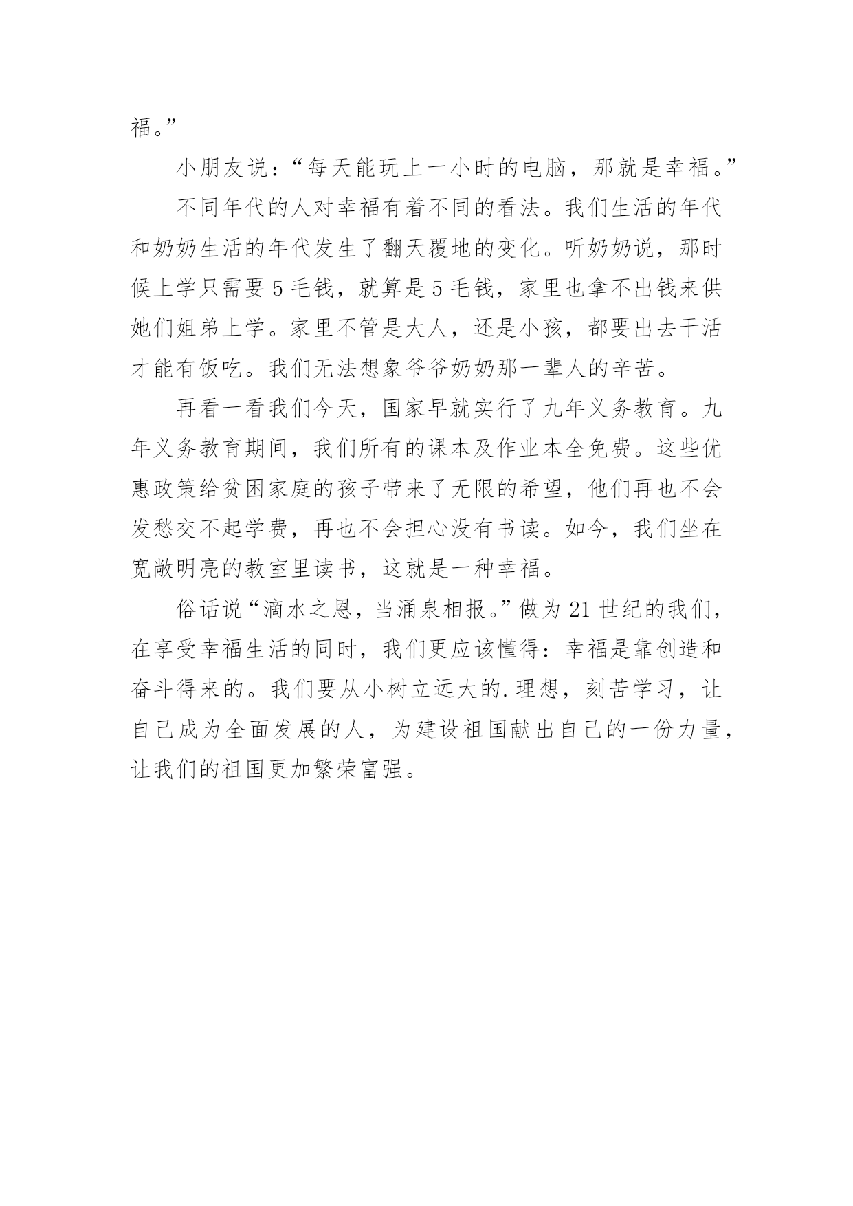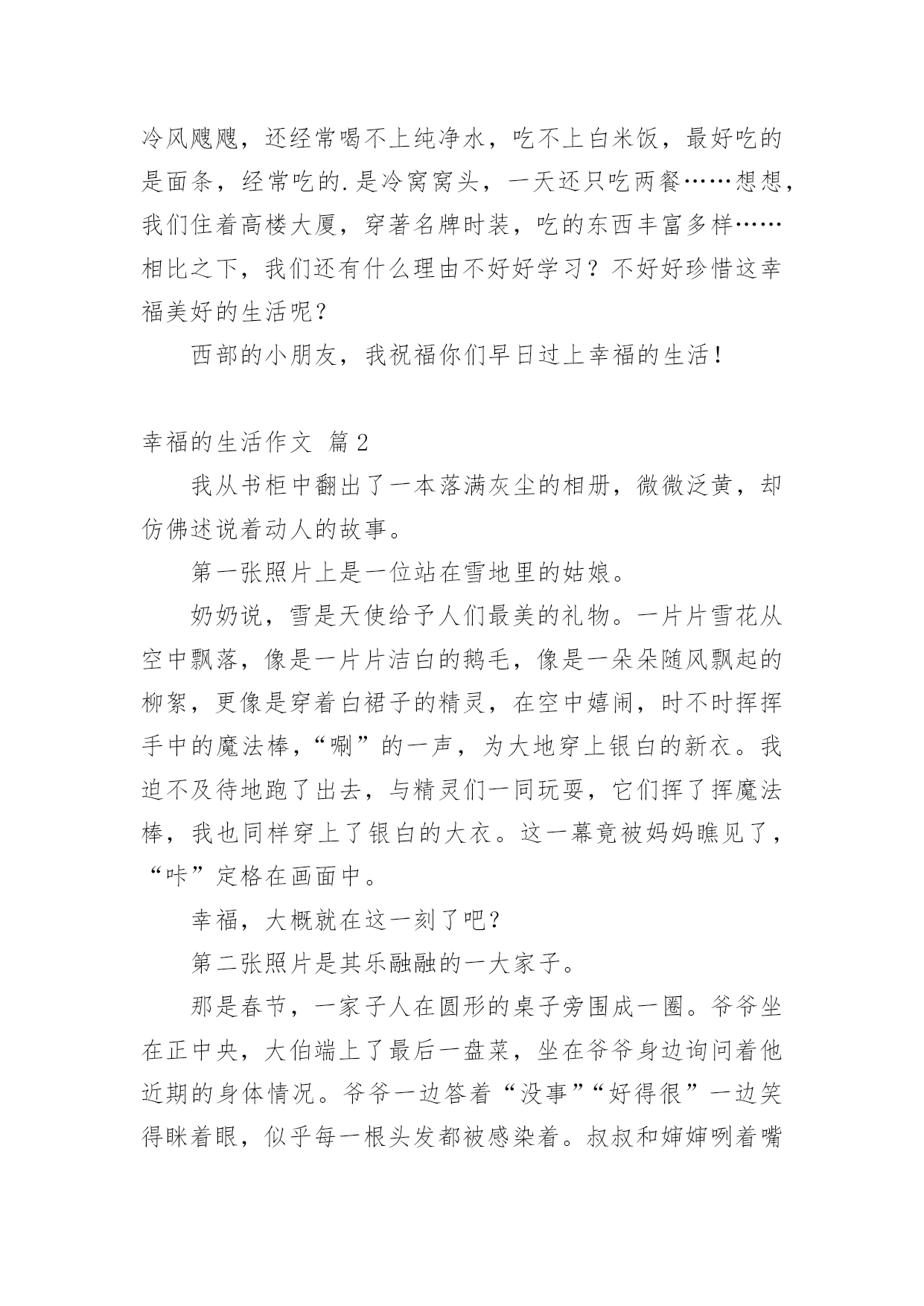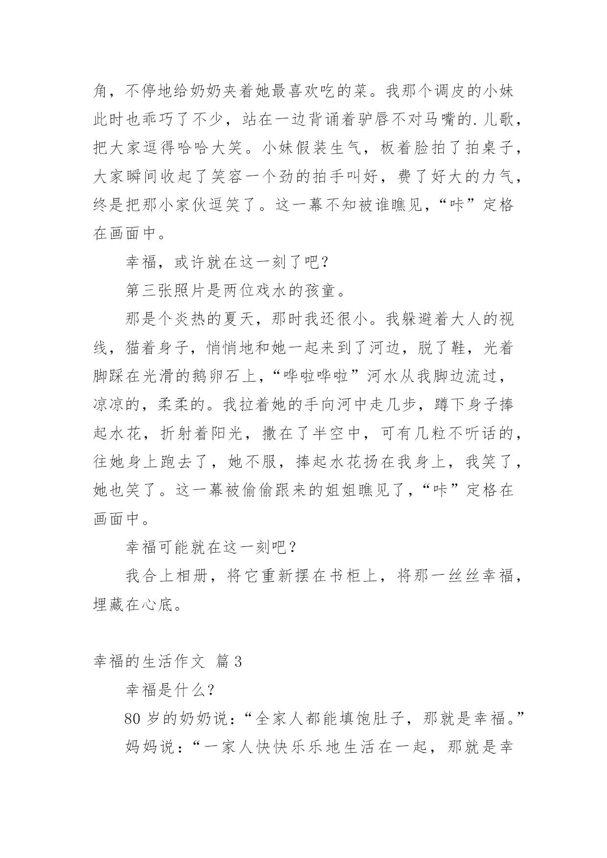 幸福的生活作文幸福的生活作文3篇[荐]无论是在学校还是在社会中,大家都有写作文的经历,对作文很是熟悉吧,作文是人们以书面形式表情达意的言语活动。你写作文时总是无从下笔?下面是小编为大家整理的幸福的生活作文4篇,仅供参考,希望能够帮助到大家。幸福的生活作文篇1我们人类,共处一个地球,却有的人过着幸福的生活,而有的人却生活在贫困之中。西部的小朋友,我在电视里、报纸上看到你们的生活与我们比起来,真是有天壤之别。你们的教室低矮而昏暗,有的是危房,你们上课用的课桌竟然是用几块砖头加一块板块,你们没有漂亮的书包,你们没有健全的图书室、实验室等,但是在这样艰苦的条件下,你们没有屈服,没有放松学习,而且考出了优异的成绩,真是令人敬佩。想想我们,有漂亮的教学楼和教室,有新课桌椅,有新书包,每天,家长还给零用钱买零食……可是,我们并不珍惜,在新课桌椅上乱画,追追打打,放松学习,成绩平平……我知道,在你们那里还有重男轻女的现象存在,女孩经常被家长以各种借口而放弃学业,小小年纪就背井离乡去外面打工赚钱。但在我们这里,男孩与女孩都是平等的。你们住的房子都是低矮的茅草屋或泥墙屋,到了冬天就冷风飕飕,还经常喝不上纯净水,吃不上白米饭,最好吃的是面条,经常吃的.是冷窝窝头,一天还只吃两餐……想想,我们住着高楼大厦,穿著名牌时装,吃的东西丰富多样……相比之下,我们还有什么理由不好好学习?不好好珍惜这幸福美好的生活呢?西部的小朋友,我祝福你们早日过上幸福的生活!幸福的生活作文篇2我从书柜中翻出了一本落满灰尘的相册,微微泛黄,却仿佛述说着动人的故事。第一张照片上是一位站在雪地里的姑娘。奶奶说,雪是天使给予人们最美的礼物。一片片雪花从空中飘落,像是一片片洁白的鹅毛,像是一朵朵随风飘起的柳絮,更像是穿着白裙子的精灵,在空中嬉闹,时不时挥挥手中的魔法棒,“唰”的一声,为大地穿上银白的新衣。我迫不及待地跑了出去,与精灵们一同玩耍,它们挥了挥魔法棒,我也同样穿上了银白的大衣。这一幕竟被妈妈瞧见了,“咔”定格在画面中。幸福,大概就在这一刻了吧?第二张照片是其乐融融的一大家子。那是春节,一家子人在圆形的桌子旁围成一圈。爷爷坐在正中央,大伯端上了最后一盘菜,坐在爷爷身边询问着他近期的身体情况。爷爷一边答着“没事”“好得很”一边笑得眯着眼,似乎每一根头发都被感染着。叔叔和婶婶咧着嘴角,不停地给奶奶夹着她最喜欢吃的菜。我那个调皮的小妹此时也乖巧了不少,站在一边背诵着驴唇不对马嘴的.儿歌,把大家逗得哈哈大笑。小妹假装生气,板着脸拍了拍桌子,大家瞬间收起了笑容一个劲的拍手叫好,费了好大的力气,终是把那小家伙逗笑了。这一幕不知被谁瞧见,“咔”定格在画面中。幸福,或许就在这一刻了吧?第三张照片是两位戏水的孩童。那是个炎热的夏天,那时我还很小。我躲避着大人的视线,猫着身子,悄悄地和她一起来到了河边,脱了鞋,光着脚踩在光滑的鹅卵石上,“哗啦哗啦”河水从我脚边流过,凉凉的,柔柔的。我拉着她的手向河中走几步,蹲下身子捧起水花,折射着阳光,撒在了半空中,可有几粒不听话的,往她身上跑去了,她不服,捧起水花扬在我身上,我笑了,她也笑了。这一幕被偷偷跟来的姐姐瞧见了,“咔”定格在画面中。幸福可能就在这一刻吧?我合上相册,将它重新摆在书柜上,将那一丝丝幸福,埋藏在心底。幸福的生活作文篇3幸福是什么?80岁的奶奶说:“全家人都能填饱肚子,那就是幸福。”妈妈说:“一家人快快乐乐地生活在一起,那就是幸福。”小朋友说:“每天能玩上一小时的电脑,那就是幸福。”不同年代的人对幸福有着不同的看法。我们生活的年代和奶奶生活的年代发生了翻天覆地的变化。听奶奶说,那时候上学只需要5毛钱,就算是5毛钱,家里也拿不出钱来供她们姐弟上学。家里不管是大人,还是小孩,都要出去干活才能有饭吃。我们无法想象爷爷奶奶那一辈人的辛苦。再看一看我们今天,国家早就实行了九年义务教育。九年义务教育期间,我们所有的课本及作业本全免费。这些优惠政策给贫困家庭的孩子带来了无限的希望,他们再也不会发愁交不起学费,再也不会担心没有书读。如今,我们坐在宽敞明亮的教室里读书,这就是一种幸福。俗话说“滴水之恩,当涌泉相报。”做为21世纪的我们,在享受幸福生活的同时,我们更应该懂得:幸福是靠创造和奋斗得来的。我们要从小树立远大的.理想,刻苦学习,让自己成为全面发展的人,为建设祖国献出自己的一份力量,让我们的祖国更加繁荣富强。