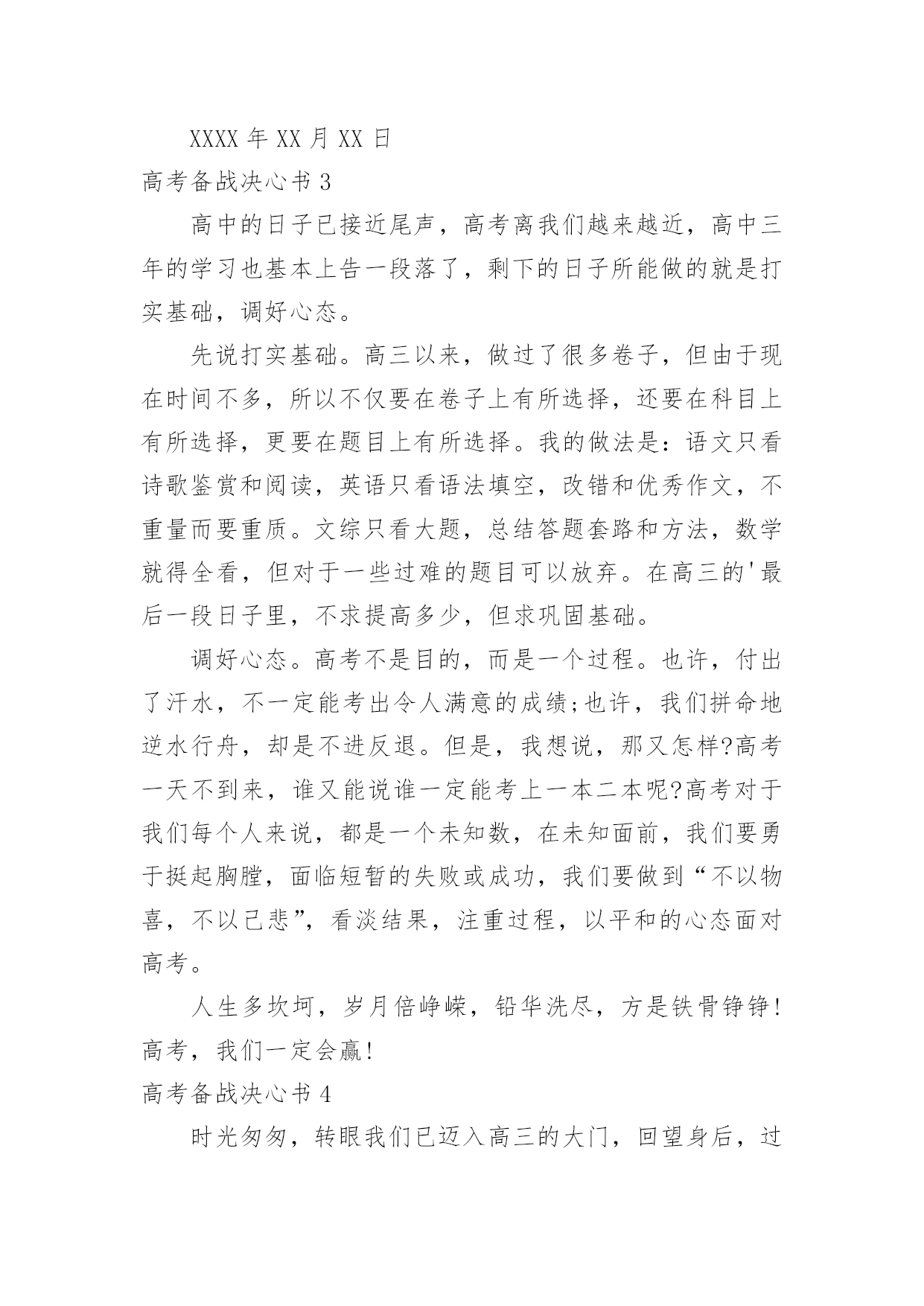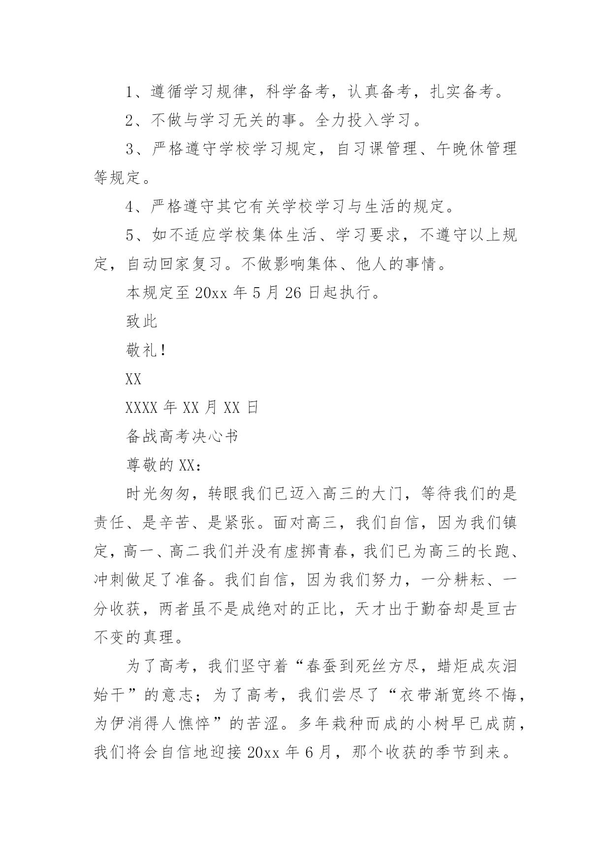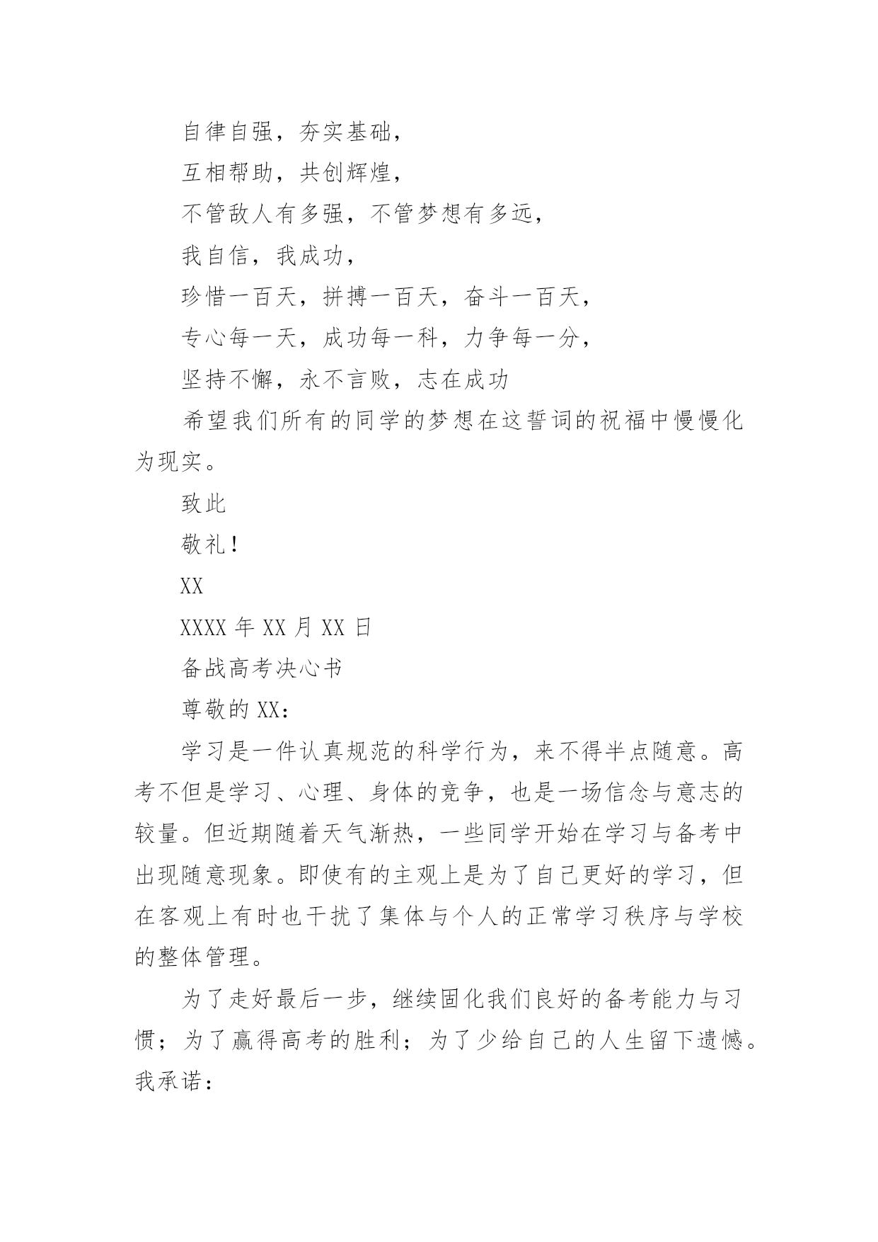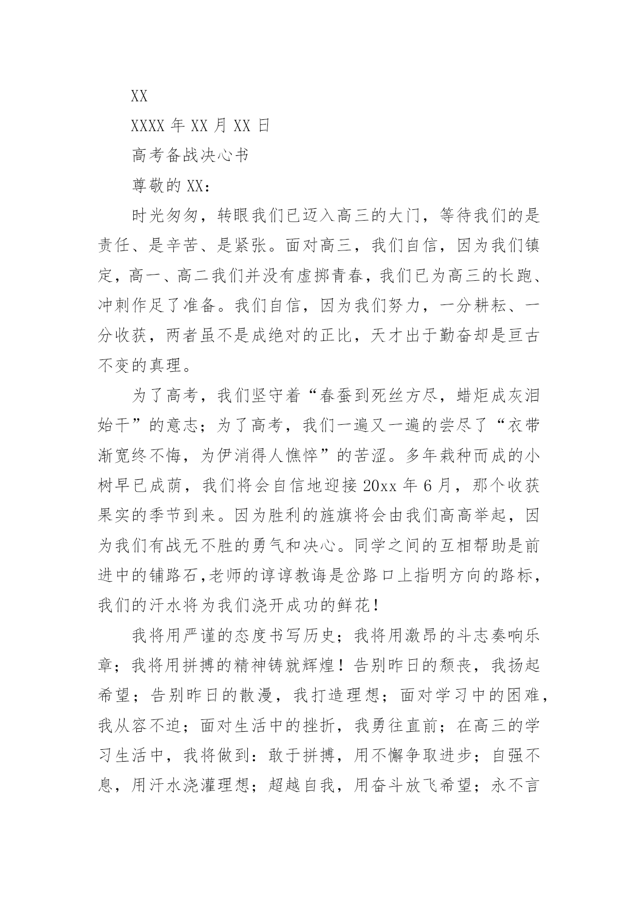 高考备战决心书高考备战决心书高考备战决心书1路在自己脚下。奇迹由我们创造!所以,我们都不会畏惧于前方的几多艰险,不会轻言放弃早已植根于梦想。胸有凌云壮志,无高不可攀!现实是此岸,理想是彼岸,中间是湍急的河流,而行动则是架在河上的桥梁。所以,我们会用行动证明一切,用行动实践一切。我们会以饱满的精神,无限的激情,不屈的斗志,昂扬的自信,开启明天的辉煌。我们会微笑地面对每一个困难,永不言弃!我们会严于律己,宽于待人,愉快地生活学习!我们会团结友爱,互帮互助,帮助他人快乐自己!我们会慎思写行,循序渐进,一切井然有序!我们会总结过去,指导现在,引领光明的未来!阳光总在风雨后,没有人能随随便便成功。心若在,梦就在,天地之间远有真爱。八班是一个热情活泼、勤苦恒拼、勇于进取、友爱团结的集体。八班的每个同学都会在自信与汗水中实现自己的价值!我们振臂高呼,我们齐敲战鼓。我承诺:我将用严谨的.态度书写属于我自己的历史;我将用激昂的斗志奏响乐章;我将用拼搏的精神铸就辉煌!告别昨日的颓丧,我扬起希望;告别昨日的散漫,我打造理想;面对学习中的困难,我从容不迫;面对生活中的挫折,我勇往直前;在高三的学习生活中,我将做到:敢于拼搏,用不懈争取进步;自强不息,用汗水浇灌理想;超越自我,用奋斗放飞希望;永不言弃,用信念实现梦想。最终让我的青春绽放出最美丽的光芒!——一起上路,一起成功!高考备战决心书2高考备战决心书尊敬的XX:弹指一挥间,我们已经走过烂漫如花的高一,欢快如歌的高二。如今,我们已来到了激情如火的高三时节。我们可以大声地说:“我们高三了。”胸中有丘壑,壮志达青云。我们已不是轻言放弃的孩子。风风雨雨算不得什么,挫折当是小小的磨难,我们的心中在挥舞有力的拳头,我们的心底在为自己鼓气呐喊。是的,我们迎来了充满挑战,辛苦却又充实的一年。上届高三留下的成绩是可喜的,是辉煌的。高三5班,这个让我们仰望的称号,不仅闪烁着光芒,还代表着重任,我高三5班,必将会无愧于这个曾经震惊学校的名字。高三有数不清的作业,数不清的考试。不是为了谁,只为了心中的梦。成天的繁忙与大量的作业,我们不敢也不能懈怠。人们常说高三太累,太辛苦,但我们认为值,因为我们年轻,年轻就应该多流些汉,年轻就应该勇往直前;因为我们离梦越来越近了。每一天每一天的坚持,每一次每一次的冲锋,每一滴每一滴的汗水,积累成了最后成功的果实。同学们,让我们喝彩吧,为我们即将面对的高三而喝彩,不管有多苦,有多累,那都会是我们一生难忘的岁月,让我们一起奋斗,让我们一起拼搏,让我们一起坚持,迎接那个实现梦的六月。光阴荏苒,物换星移,两年的光阴在指尖悄然滑过。高中的岁月,只有200天了,我们站在人生的转折之处,如果以前学习不够努力,不够勤奋,不要再后悔,如果你为错过月亮而流泪,你也将错过群星了。未来的200天,时间紧张,任务艰巨,我们都希望过得充实,有收获,大家共同加油鼓励,拟对联于楼上:“有凌云之志,肯悬梁刺股,学海乘风舍我其谁;有踏实之心,能面壁绝偏,科场折桂非君莫属。”在剩余的日子里,我们好好努力,好好珍惜,如果现在还缺乏自信,缺乏勇气,那么在接下来的日子,每天对自己说:“我能行。”并努力尝试,努力改变。在高三的学海中,我们将荡起勤奋的划桨,扬起自信的风帆,在心灵灯塔的指引下,搏击风雨,渡过风暴,驶向学海的彼岸。在这里,请允许我表白我们共同的心声:人在高三,没有犹豫,没有彷徨,没有迷惘,没有悔恨,人在高三,我们坚韧,我们执着,我们奋斗,我们拼搏,一如既往地前进,只为坚守并实现心中那个美丽的梦。春寒陡峭中将有我们执着的追求,夏雨磅礴中将有我们跋涉的身影,秋风瑟瑟中将有我们勃发的激情,冬雪飘飞中将有我们坚定的足迹。我们心中的梦已变成了夜空下那颗最亮的星,指引着我们永不停息,昼夜赶路,风雨兼程。我们用智慧培育理想,我们用汗水浇灌希望,我们踏过书山坎坷,我们走过的每一步,都是成功的保障!我将带着从容的微笑,去赢得我志在必得得辉煌,一年拼搏,一朝圆梦,奋斗两百天,让飞翔的梦在六月张开翅膀,奋斗两百天,让雄心与智慧在六月闪耀。青春在拼搏中闪光,生命在奋斗中豪迈!苦战百日,终当凌绝顶;奋斗一程,破浪展雄风。我们可以错过太阳,可以错过月亮,甚至星星,但是我们不可以错过六月的一飞冲天,让世界看见我们的青春在飞扬。为了六月的灿烂,让我们奋勇向前,奋斗今天,梦圆明天!致此敬礼!XXXXXX年XX月XX日高考备战决心书尊敬的XX:时光匆匆,转眼我们已迈入高三的大门,等待我们的是责任、是辛苦、是紧张。面对高三,我们自信,因为我们镇定,高一、高二我们并没有虚掷青春,我们已为高三的长跑、冲刺作足了准备。我们自信,因为我们努力,一分耕耘、一分收获,两者虽不是成绝对的正比,天才出于勤奋却是亘古不变的真理。为了高考,我们坚守着“春蚕到死丝方尽,蜡炬成