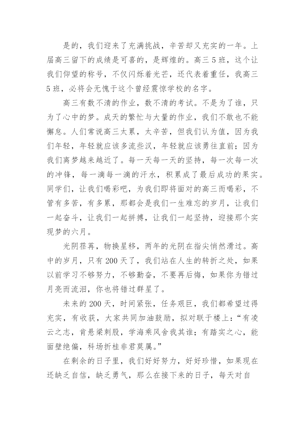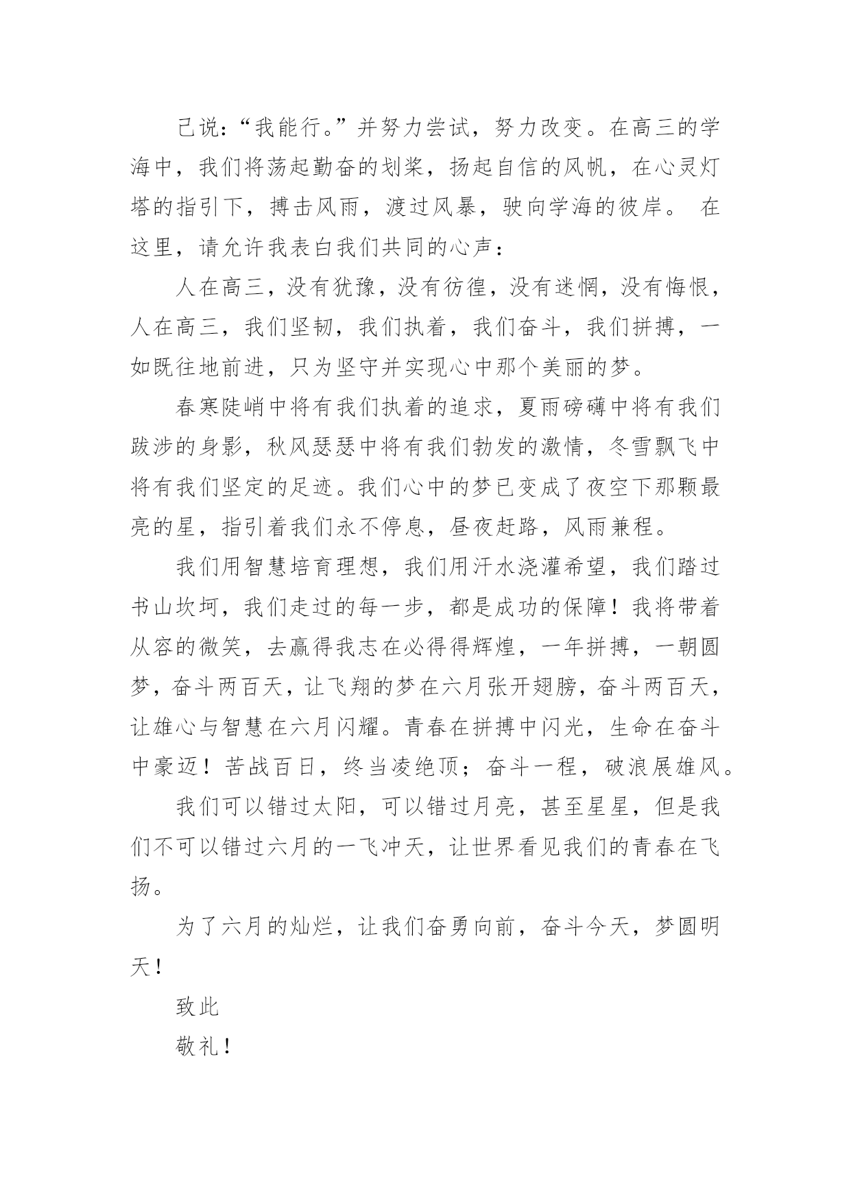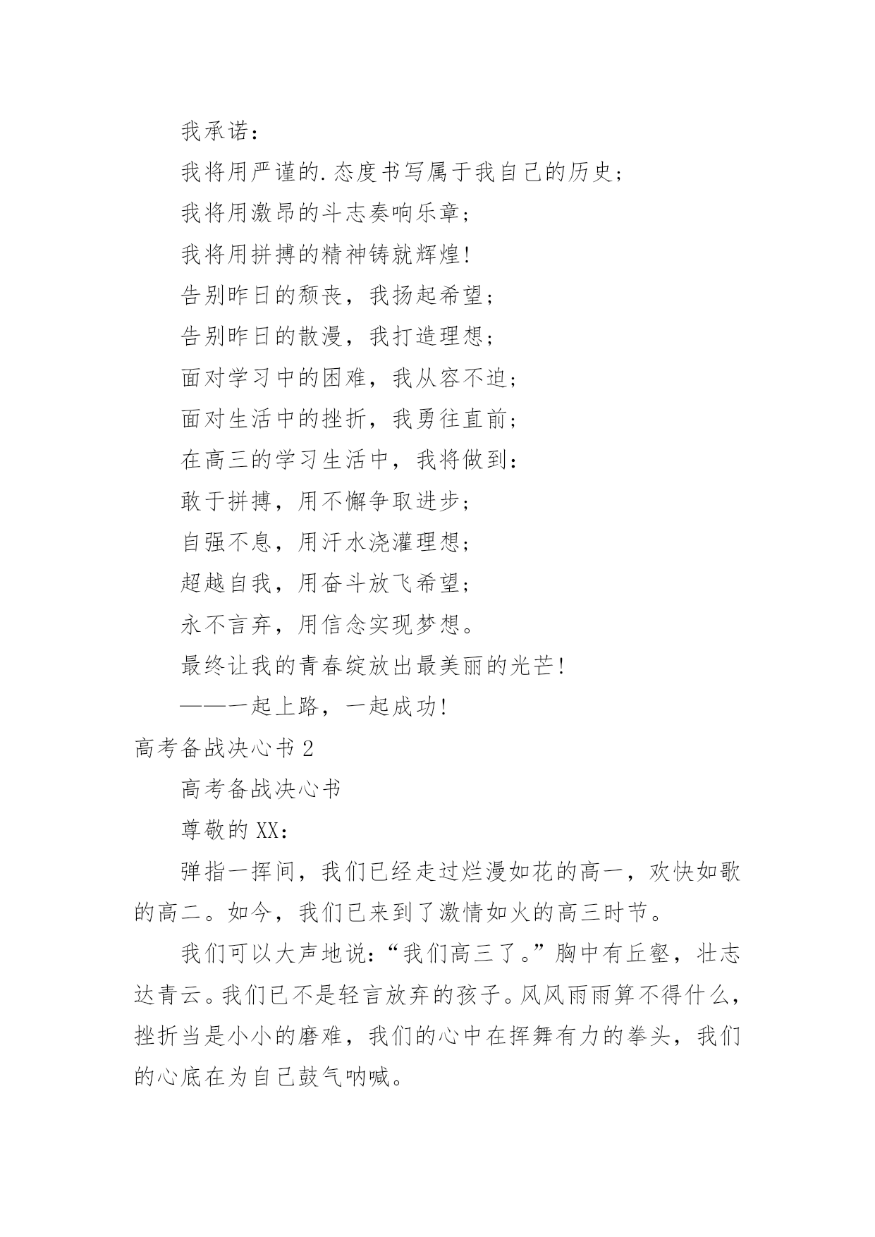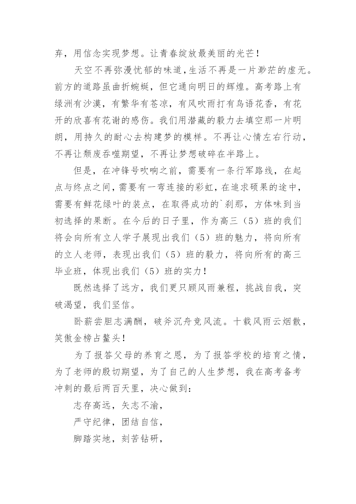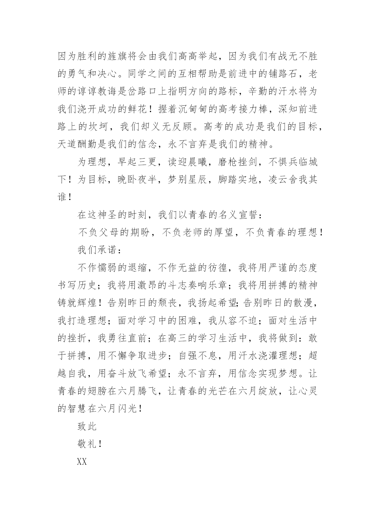 高考备战决心书高考备战决心书高考备战决心书1路在自己脚下。奇迹由我们创造!所以,我们都不会畏惧于前方的几多艰险,不会轻言放弃早已植根于梦想。胸有凌云壮志,无高不可攀!现实是此岸,理想是彼岸,中间是湍急的河流,而行动则是架在河上的桥梁。所以,我们会用行动证明一切,用行动实践一切。我们会以饱满的精神,无限的激情,不屈的斗志,昂扬的自信,开启明天的辉煌。我们会微笑地面对每一个困难,永不言弃!我们会严于律己,宽于待人,愉快地生活学习!我们会团结友爱,互帮互助,帮助他人快乐自己!我们会慎思写行,循序渐进,一切井然有序!我们会总结过去,指导现在,引领光明的未来!阳光总在风雨后,没有人能随随便便成功。心若在,梦就在,天地之间远有真爱。八班是一个热情活泼、勤苦恒拼、勇于进取、友爱团结的集体。八班的每个同学都会在自信与汗水中实现自己的价值!我们振臂高呼,我们齐敲战鼓。我承诺:我将用严谨的.态度书写属于我自己的历史;我将用激昂的斗志奏响乐章;我将用拼搏的精神铸就辉煌!告别昨日的颓丧,我扬起希望;告别昨日的散漫,我打造理想;面对学习中的困难,我从容不迫;面对生活中的挫折,我勇往直前;在高三的学习生活中,我将做到:敢于拼搏,用不懈争取进步;自强不息,用汗水浇灌理想;超越自我,用奋斗放飞希望;永不言弃,用信念实现梦想。最终让我的青春绽放出最美丽的光芒!——一起上路,一起成功!高考备战决心书2高考备战决心书尊敬的XX:弹指一挥间,我们已经走过烂漫如花的高一,欢快如歌的高二。如今,我们已来到了激情如火的高三时节。我们可以大声地说:“我们高三了。”胸中有丘壑,壮志达青云。我们已不是轻言放弃的孩子。风风雨雨算不得什么,挫折当是小小的磨难,我们的心中在挥舞有力的拳头,我们的心底在为自己鼓气呐喊。是的,我们迎来了充满挑战,辛苦却又充实的一年。上届高三留下的成绩是可喜的,是辉煌的。高三5班,这个让我们仰望的称号,不仅闪烁着光芒,还代表着重任,我高三5班,必将会无愧于这个曾经震惊学校的名字。高三有数不清的作业,数不清的考试。不是为了谁,只为了心中的梦。成天的繁忙与大量的作业,我们不敢也不能懈怠。人们常说高三太累,太辛苦,但我们认为值,因为我们年轻,年轻就应该多流些汉,年轻就应该勇往直前;因为我们离梦越来越近了。每一天每一天的坚持,每一次每一次的冲锋,每一滴每一滴的汗水,积累成了最后成功的果实。同学们,让我们喝彩吧,为我们即将面对的高三而喝彩,不管有多苦,有多累,那都会是我们一生难忘的岁月,让我们一起奋斗,让我们一起拼搏,让我们一起坚持,迎接那个实现梦的六月。光阴荏苒,物换星移,两年的光阴在指尖悄然滑过。高中的岁月,只有200天了,我们站在人生的转折之处,如果以前学习不够努力,不够勤奋,不要再后悔,如果你为错过月亮而流泪,你也将错过群星了。未来的200天,时间紧张,任务艰巨,我们都希望过得充实,有收获,大家共同加油鼓励,拟对联于楼上:“有凌云之志,肯悬梁刺股,学海乘风舍我其谁;有踏实之心,能面壁绝偏,科场折桂非君莫属。”在剩余的日子里,我们好好努力,好好珍惜,如果现在还缺乏自信,缺乏勇气,那么在接下来的日子,每天对自己说:“我能行。”并努力尝试,努力改变。在高三的学海中,我们将荡起勤奋的划桨,扬起自信的风帆,在心灵灯塔的指引下,搏击风雨,渡过风暴,驶向学海的彼岸。在这里,请允许我表白我们共同的心声:人在高三,没有犹豫,没有彷徨,没有迷惘,没有悔恨,人在高三,我们坚韧,我们执着,我们奋斗,我们拼搏,一如既往地前进,只为坚守并实现心中那个美丽的梦。春寒陡峭中将有我们执着的追求,夏雨磅礴中将有我们跋涉的身影,秋风瑟瑟中将有我们勃发的激情,冬雪飘飞中将有我们坚定的足迹。我们心中的梦已变成了夜空下那颗最亮的星,指引着我们永不停息,昼夜赶路,风雨兼程。我们用智慧培育理想,我们用汗水浇灌希望,我们踏过书山坎坷,我们走过的每一步,都是成功的保障!我将带着从容的微笑,去赢得我志在必得得辉煌,一年拼搏,一朝圆梦,奋斗两百天,让飞翔的梦在六月张开翅膀,奋斗两百天,让雄心与智慧在六月闪耀。青春在拼搏中闪光,生命在奋斗中豪迈!苦战百日,终当凌绝顶;奋斗一程,破浪展雄风。我们可以错过太阳,可以错过月亮,甚至星星,但是我们不可以错过六月的一飞冲天,让世界看见我们的青春在飞扬。为了六月的灿烂,让我们奋勇向前,奋斗今天,梦圆明天!致此敬礼!XXXXXX年XX月XX日高考备战决心书尊敬的XX:时光匆匆,转眼我们已迈入高三的大门,等待我们的是责任、是辛苦、是紧张。面对高三,我们自信,因为我们镇定,高一、高二我们并没有虚掷青春,我们已为高三的长跑、冲刺作足了准备。我们自信,因为我们努力,一分耕耘、一分收获,两者虽不是成绝对的正比,天才出于勤奋却是亘古不变的真理。为了高考,我们坚守着“春蚕到死丝方尽,蜡炬成