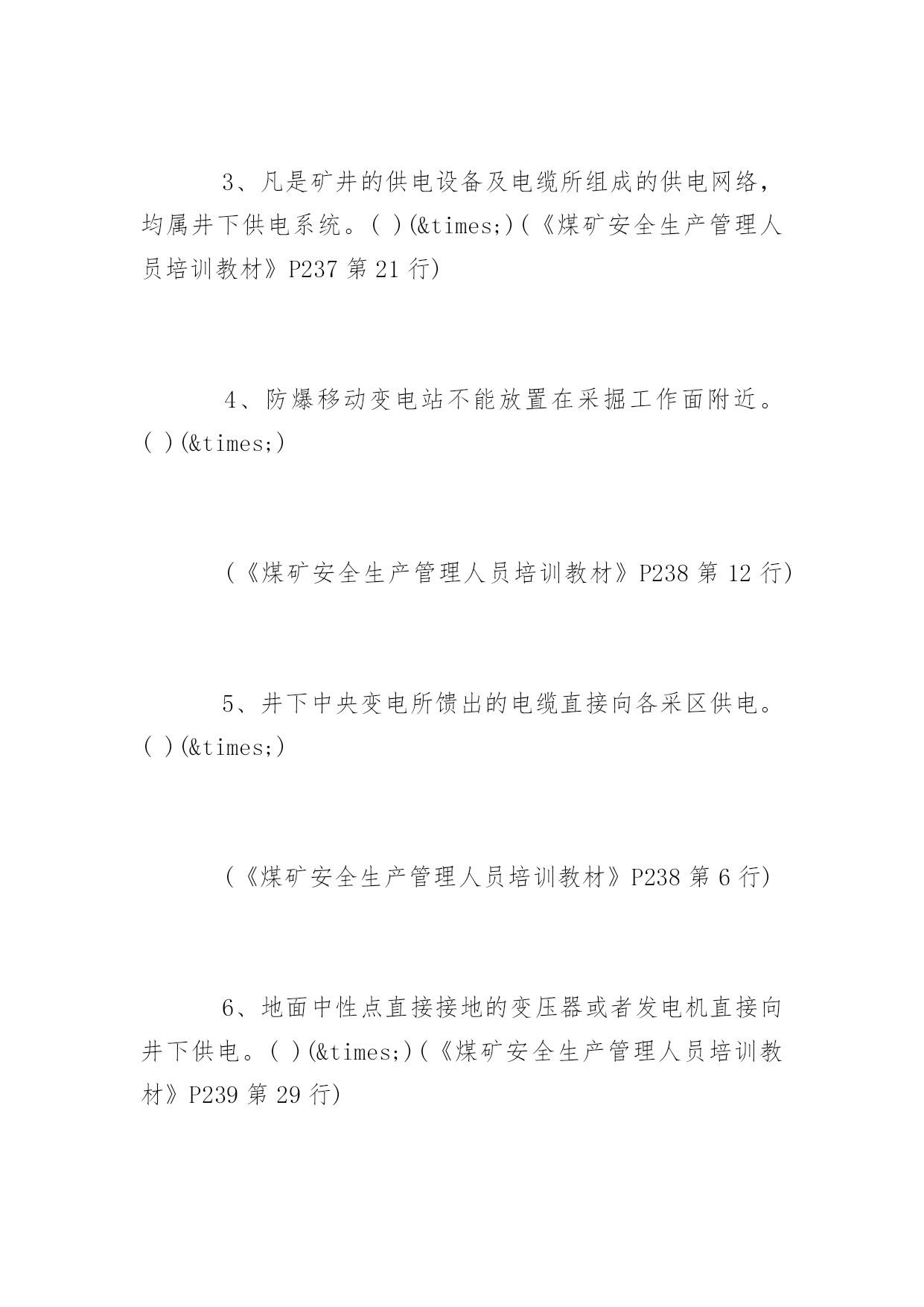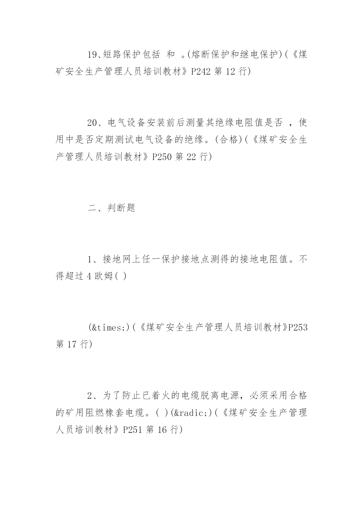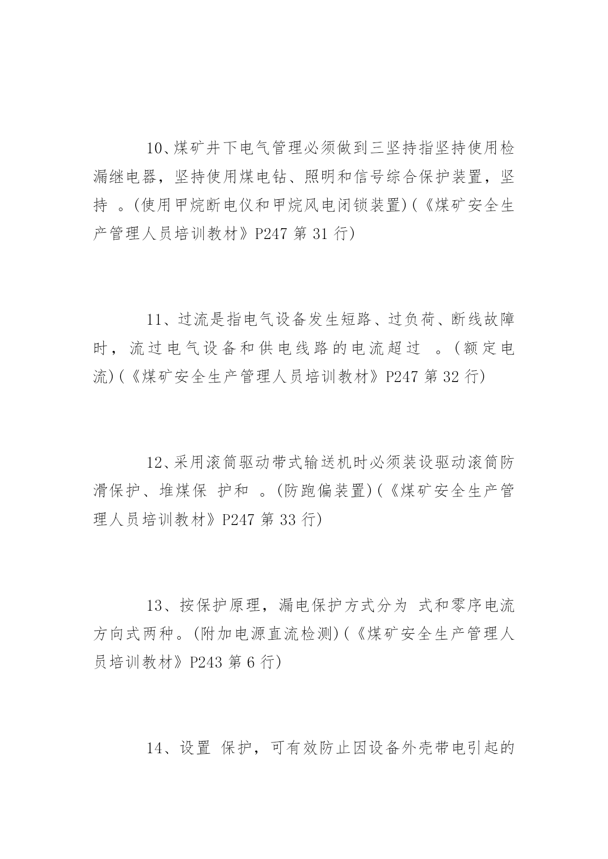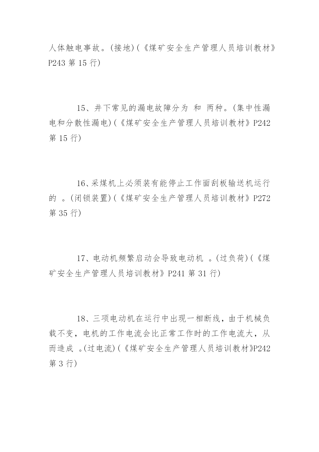 煤矿安全规程机电管理培训试题及答案2017煤矿安全规程机电管理培训试题及答案一、填空题1、供电电缆的下井方式有、和平硐开拓。(立井开拓、斜井开拓)(《煤矿安全生产管理人员培训教材》P239第1行)2、采取变电所是采取变电设备的。(电源)(《煤矿安全生产管理人员培训教材》P240第3行)3、向采煤、开拓、掘进工作面供电时,往往采用的供电方式。(移动变电站)(《煤矿安全生产管理人员培训教材》P240第32行)4、矿井电网保护两闭锁是指和。(风电闭锁和甲烷电闭锁)(《煤矿安全生产管理人员培训教材》P241第3行)5、矿用电气设备分为矿用和两类。(一般型和矿用防爆型)(《煤矿安全生产管理人员培训教材》P244第9行)6、煤矿井下电气管理“三无”指无、无、无。(无鸡爪子、无羊尾巴、无明接头)(《煤矿安全生产管理人员培训教材》P247第27行)7、煤矿井下电气管理四有指有过电流和漏电保护装置,有螺钉和弹簧垫,有密封圈和挡板,有。(接地装置)(《煤矿安全生产管理人员培训教材》P247第28行)8、煤矿井下电气管理两齐指,。(电缆悬挂整齐,设备硐室清洁整齐)(《煤矿安全生产管理人员培训教材》P247第29行)9、煤矿井下电气管理必须做到三全是指防护装置全、,图纸资料全。(绝缘用具全)(《煤矿安全生产管理人员培训教材》P247第30行)10、煤矿井下电气管理必须做到三坚持指坚持使用检漏继电器,坚持使用煤电钻、照明和信号综合保护装置,坚持。(使用甲烷断电仪和甲烷风电闭锁装置)(《煤矿安全生产管理人员培训教材》P247第31行)11、过流是指电气设备发生短路、过负荷、断线故障时,流过电气设备和供电线路的电流超过。(额定电流)(《煤矿安全生产管理人员培训教材》P247第32行)12、采用滚筒驱动带式输送机时必须装设驱动滚筒防滑保护、堆煤保护和。(防跑偏装置)(《煤矿安全生产管理人员培训教材》P247第33行)13、按保护原理,漏电保护方式分为式和零序电流方向式两种。(附加电源直流检测)(《煤矿安全生产管理人员培训教材》P243第6行)14、设置保护,可有效防止因设备外壳带电引起的人体触电事故。(接地)(《煤矿安全生产管理人员培训教材》P243第15行)15、井下常见的漏电故障分为和两种。(集中性漏电和分散性漏电)(《煤矿安全生产管理人员培训教材》P242第15行)16、采煤机上必须装有能停止工作面刮板输送机运行的。(闭锁装置)(《煤矿安全生产管理人员培训教材》P272第35行)17、电动机频繁启动会导致电动机。(过负荷)(《煤矿安全生产管理人员培训教材》P241第31行)18、三项电动机在运行中出现一相断线,由于机械负载不变,电机的工作电流会比正常工作时的工作电流大,从而造成。(过电流)(《煤矿安全生产管理人员培训教材》P242第3行)19、短路保护包括和。(熔断保护和继电保护)(《煤矿安全生产管理人员培训教材》P242第12行)20、电气设备安装前后测量其绝缘电阻值是否,使用中是否定期测试电气设备的绝缘。(合格)(《煤矿安全生产管理人员培训教材》P250第22行)二、判断题1、接地网上任一保护接地点测得的接地电阻值。不得超过4欧姆()(×)(《煤矿安全生产管理人员培训教材》P253第17行)2、为了防止已着火的电缆脱离电源,必须采用合格的矿用阻燃橡套电缆。()(√)(《煤矿安全生产管理人员培训教材》P251第16行)3、凡是矿井的供电设备及电缆所组成的供电网络,均属井下供电系统。()(×)(《煤矿安全生产管理人员培训教材》P237第21行)4、防爆移动变电站不能放置在采掘工作面附近。()(×)(《煤矿安全生产管理人员培训教材》P238第12行)5、井下中央变电所馈出的电缆直接向各采区供电。()(×)(《煤矿安全生产管理人员培训教材》P238第6行)6、地面中性点直接接地的变压器或者发电机直接向井下供电。()(×)(《煤矿安全生产管理人员培训教材》P239第29行)7、采煤工作面的低压配电,可根据采煤工作面的供电负荷的容量选择一台或两台移动变电站。()(√)(《煤矿安全生产管理人员培训教材》P240第34行)8、保证局部通风机的正常运转是决定掘进工作面安全生产的一个重要环节。()(√)(《煤矿安全生产管理人员培训教材》P241第10行)9、漏电只会导致人体触电,和引起瓦斯、煤尘爆炸没有关系。()(×)(《煤矿安全生产管理人员培训教材》P242第17行)10、电气设备和电缆长期过负荷可以避免漏电事故的发生。()(√)(《煤矿安全生产管理人