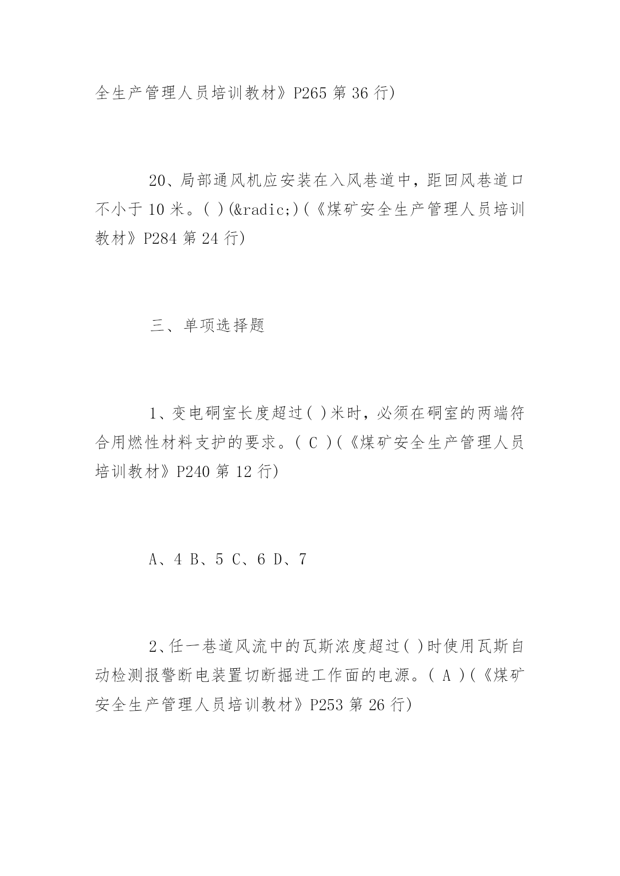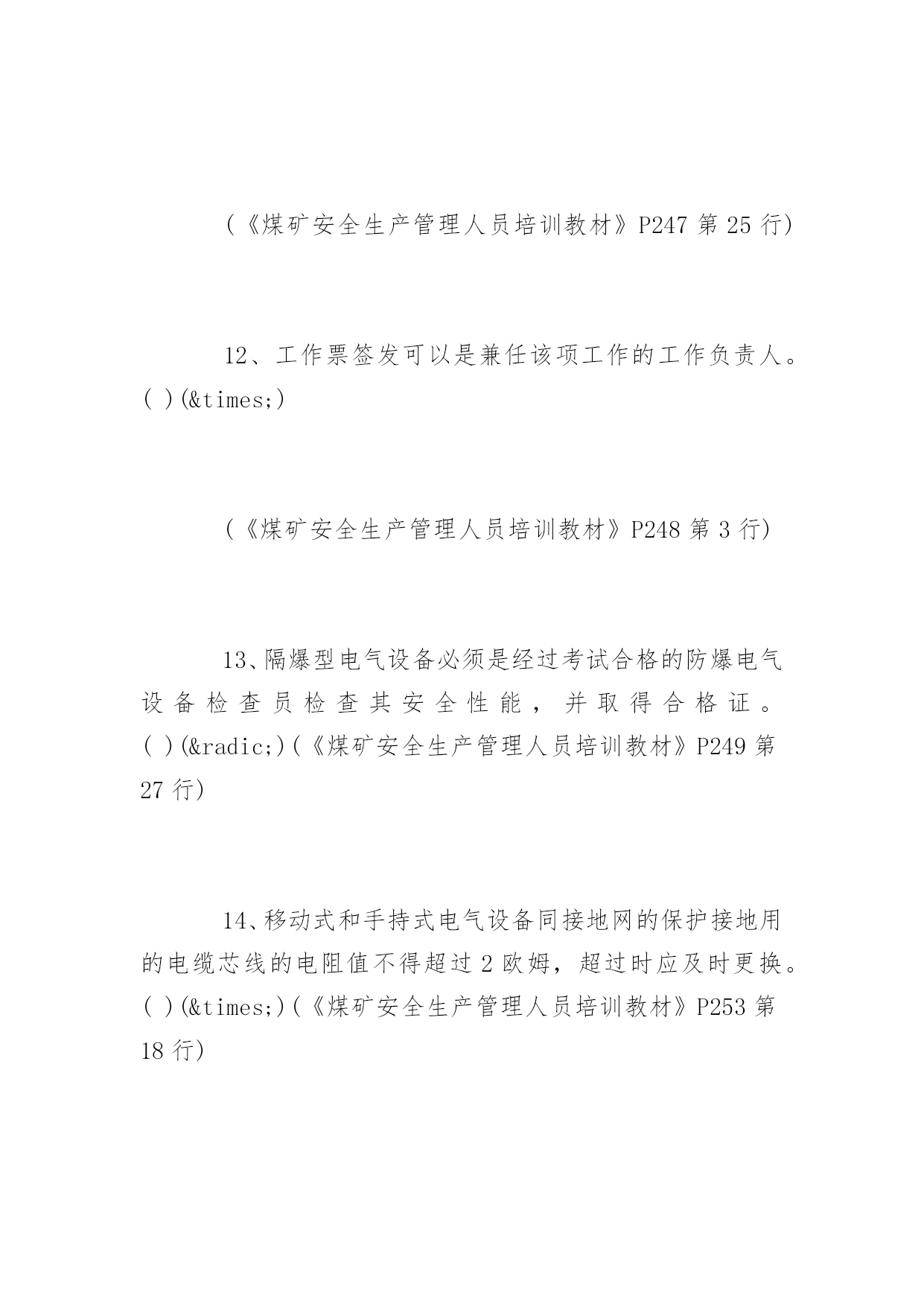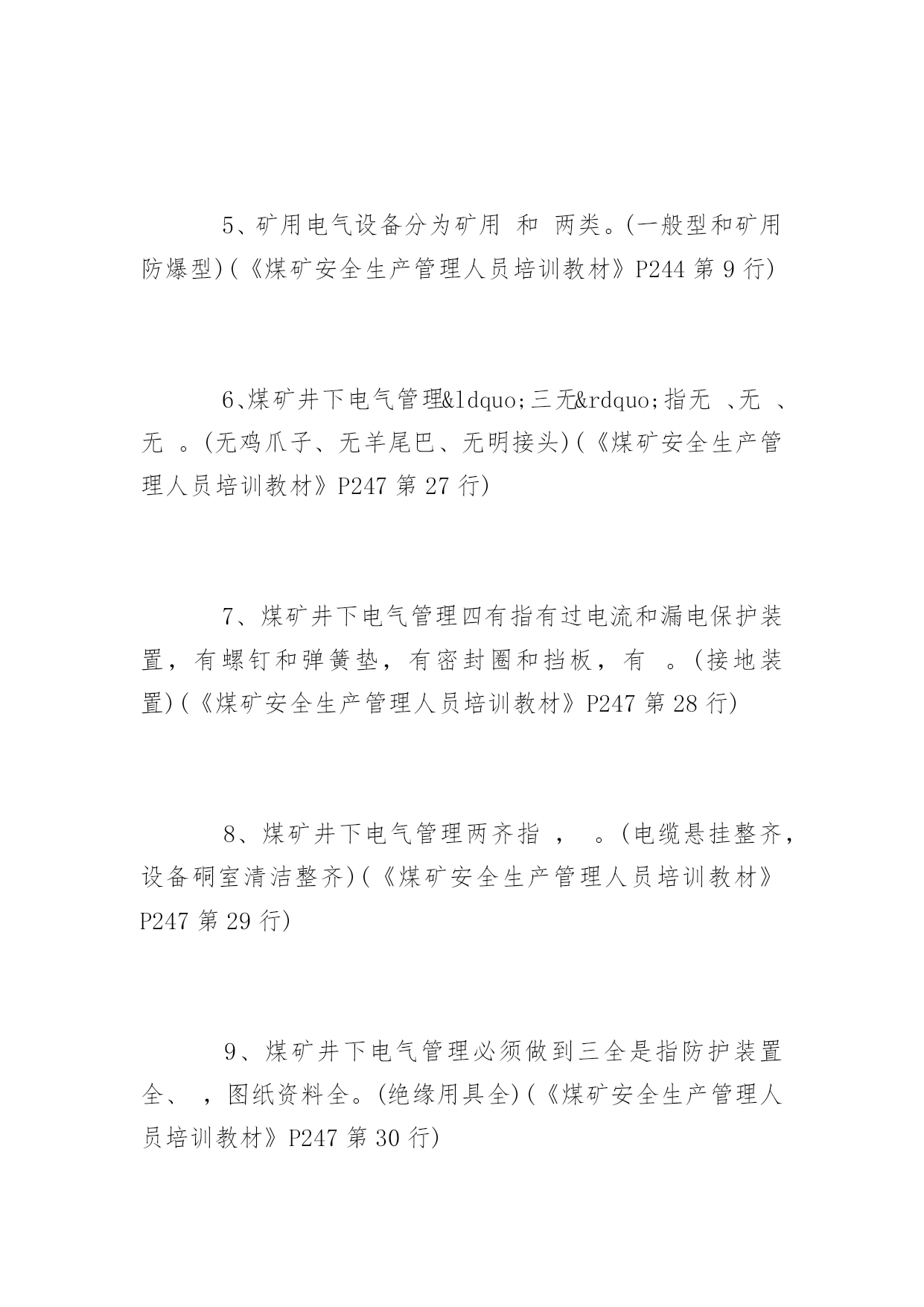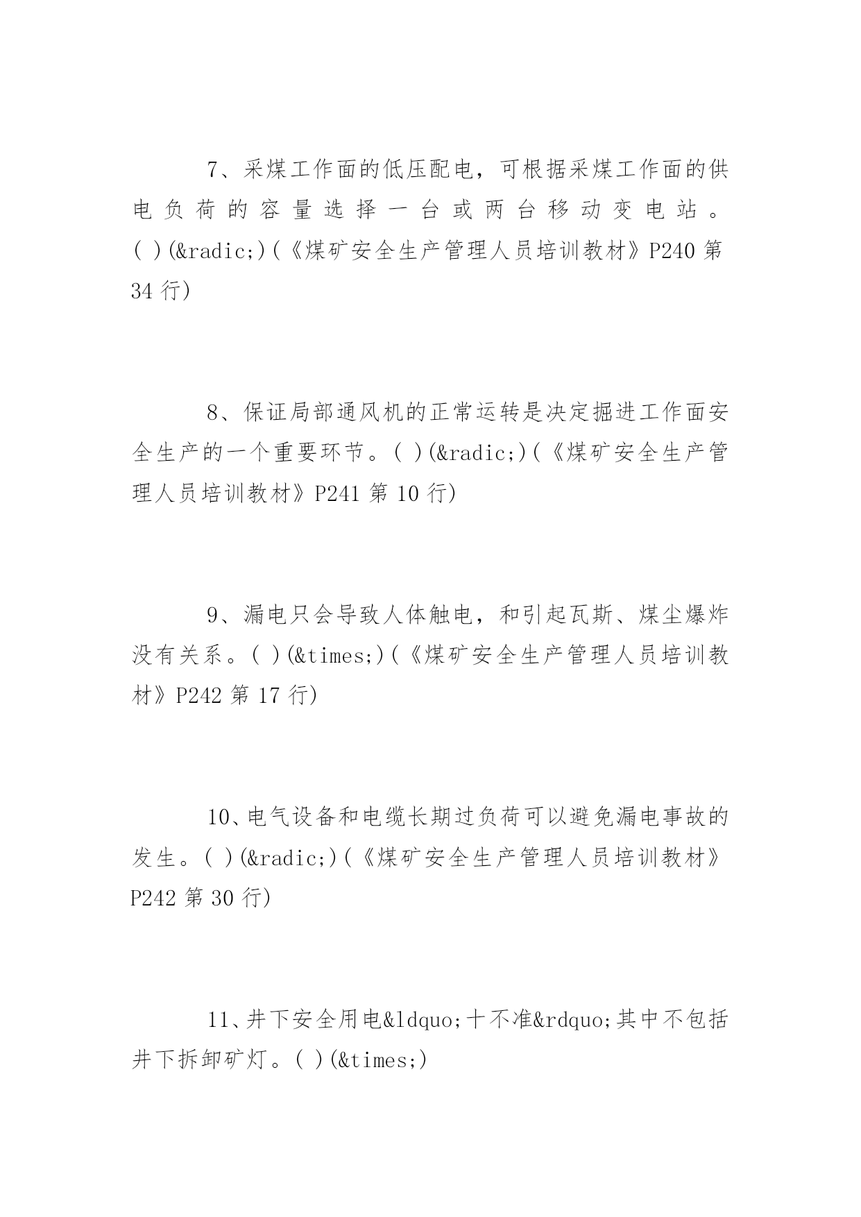 煤矿安全规程机电管理培训试题及答案2017煤矿安全规程机电管理培训试题及答案一、填空题1、供电电缆的下井方式有、和平硐开拓。(立井开拓、斜井开拓)(《煤矿安全生产管理人员培训教材》P239第1行)2、采取变电所是采取变电设备的。(电源)(《煤矿安全生产管理人员培训教材》P240第3行)3、向采煤、开拓、掘进工作面供电时,往往采用的供电方式。(移动变电站)(《煤矿安全生产管理人员培训教材》P240第32行)4、矿井电网保护两闭锁是指和。(风电闭锁和甲烷电闭锁)(《煤矿安全生产管理人员培训教材》P241第3行)5、矿用电气设备分为矿用和两类。(一般型和矿用防爆型)(《煤矿安全生产管理人员培训教材》P244第9行)6、煤矿井下电气管理“三无”指无、无、无。(无鸡爪子、无羊尾巴、无明接头)(《煤矿安全生产管理人员培训教材》P247第27行)7、煤矿井下电气管理四有指有过电流和漏电保护装置,有螺钉和弹簧垫,有密封圈和挡板,有。(接地装置)(《煤矿安全生产管理人员培训教材》P247第28行)8、煤矿井下电气管理两齐指,。(电缆悬挂整齐,设备硐室清洁整齐)(《煤矿安全生产管理人员培训教材》P247第29行)9、煤矿井下电气管理必须做到三全是指防护装置全、,图纸资料全。(绝缘用具全)(《煤矿安全生产管理人员培训教材》P247第30行)10、煤矿井下电气管理必须做到三坚持指坚持使用检漏继电器,坚持使用煤电钻、照明和信号综合保护装置,坚持。(使用甲烷断电仪和甲烷风电闭锁装置)(《煤矿安全生产管理人员培训教材》P247第31行)11、过流是指电气设备发生短路、过负荷、断线故障时,流过电气设备和供电线路的电流超过。(额定电流)(《煤矿安全生产管理人员培训教材》P247第32行)12、采用滚筒驱动带式输送机时必须装设驱动滚筒防滑保护、堆煤保护和。(防跑偏装置)(《煤矿安全生产管理人员培训教材》P247第33行)13、按保护原理,漏电保护方式分为式和零序电流方向式两种。(附加电源直流检测)(《煤矿安全生产管理人员培训教材》P243第6行)14、设置保护,可有效防止因设备外壳带电引起的人体触电事故。(接地)(《煤矿安全生产管理人员培训教材》P243第15行)15、井下常见的漏电故障分为和两种。(集中性漏电和分散性漏电)(《煤矿安全生产管理人员培训教材》P242第15行)16、采煤机上必须装有能停止工作面刮板输送机运行的。(闭锁装置)(《煤矿安全生产管理人员培训教材》P272第35行)17、电动机频繁启动会导致电动机。(过负荷)(《煤矿安全生产管理人员培训教材》P241第31行)18、三项电动机在运行中出现一相断线,由于机械负载不变,电机的工作电流会比正常工作时的工作电流大,从而造成。(过电流)(《煤矿安全生产管理人员培训教材》P242第3行)19、短路保护包括和。(熔断保护和继电保护)(《煤矿安全生产管理人员培训教材》P242第12行)20、电气设备安装前后测量其绝缘电阻值是否,使用中是否定期测试电气设备的绝缘。(合格)(《煤矿安全生产管理人员培训教材》P250第22行)二、判断题1、接地网上任一保护接地点测得的接地电阻值。不得超过4欧姆()(×)(《煤矿安全生产管理人员培训教材》P253第17行)2、为了防止已着火的电缆脱离电源,必须采用合格的矿用阻燃橡套电缆。()(√)(《煤矿安全生产管理人员培训教材》P251第16行)3、凡是矿井的供电设备及电缆所组成的供电网络,均属井下供电系统。()(×)(《煤矿安全生产管理人员培训教材》P237第21行)4、防爆移动变电站不能放置在采掘工作面附近。()(×)(《煤矿安全生产管理人员培训教材》P238第12行)5、井下中央变电所馈出的电缆直接向各采区供电。()(×)(《煤矿安全生产管理人员培训教材》P238第6行)6、地面中性点直接接地的变压器或者发电机直接向井下供电。()(×)(《煤矿安全生产管理人员培训教材》P239第29行)7、采煤工作面的低压配电,可根据采煤工作面的供电负荷的容量选择一台或两台移动变电站。()(√)(《煤矿安全生产管理人员培训教材》P240第34行)8、保证局部通风机的正常运转是决定掘进工作面安全生产的一个重要环节。()(√)(《煤矿安全生产管理人员培训教材》P241第10行)9、漏电只会导致人体触电,和引起瓦斯、煤尘爆炸没有关系。()(×)(《煤矿安全生产管理人员培训教材》P242第17行)10、电气设备和电缆长期过负荷可以避免漏电事故的发生。()(√)(《煤矿安全生产管理人