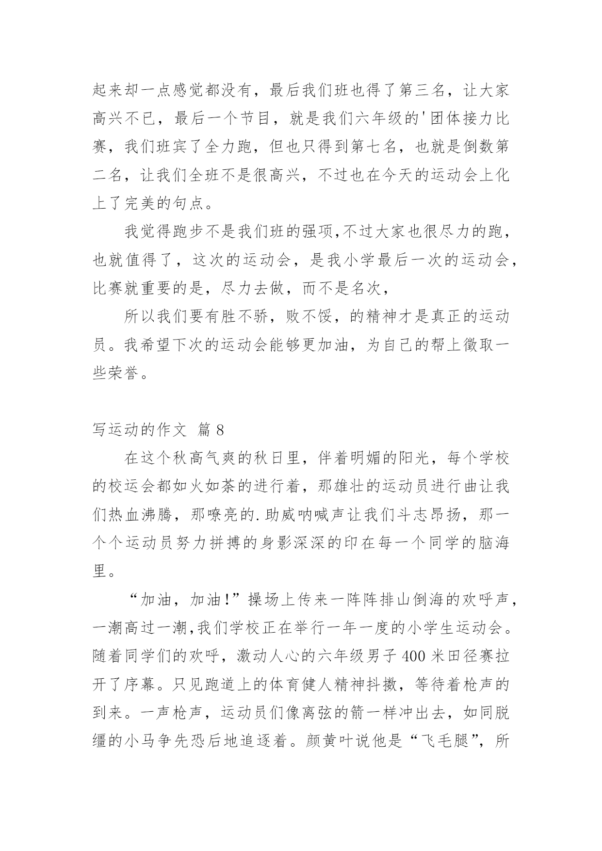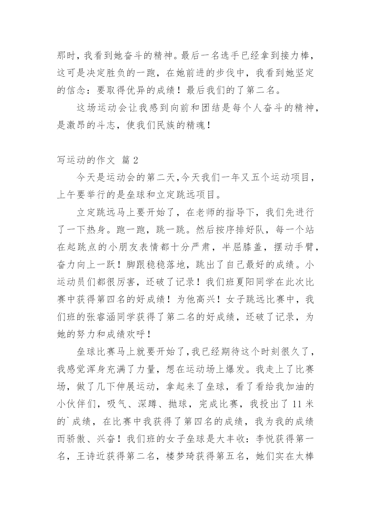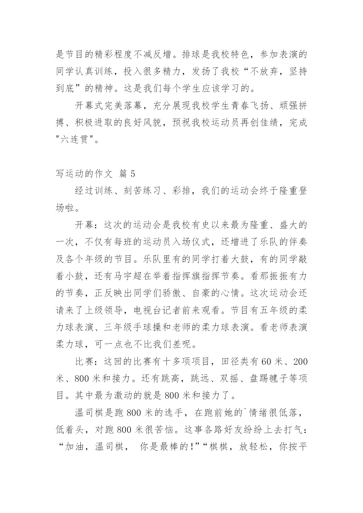 写运动的作文精选写运动的作文集锦八篇在平平淡淡的学习、工作、生活中,大家都写过作文,肯定对各类作文都很熟悉吧,写作文可以锻炼我们的独处习惯,让自己的心静下来,思考自己未来的方向。一篇什么样的作文才能称之为优秀作文呢?以下是小编整理的写运动的作文9篇,希望对大家有所帮助。写运动的作文篇1这次运动会让我深刻体验到各种感受!我参加了400米赛跑,起初我很紧张,同学们就鼓励我,慢慢平复我的恐惧心理。终于等到了这一刻,在裁判的一声令下,我听到了,我听到了:同学们在为我呐喊,为我加油。在这些呐喊与加油声中我努力向前冲,此刻我觉得向前是一种昂扬的姿态,是永不告败的精神,是催人奋进的号角。最终我却已失败告终,现在我想对那些对我鼓励的'人说声:“对不起!”同时我也很开心,因为我的朋友没有怪我,我太感谢她们了!之后又参加400米接力赛,我是第二棒,这项比赛最重要的是团队之间的合作。赛前下起了小雨,跑道上有点滑,但这并没有引起队员的抱怨。比赛开始了,第一棒已经跑了,在她跑的过程中,我看到她努力拼搏的精神;她把接力棒交到我手中,我不顾一切向前冲,把接力棒交到第三人手中;那时,我看到她奋斗的精神。最后一名选手已经拿到接力棒,这可是决定胜负的一跑,在她前进的步伐中,我看到她坚定的信念:要取得优异的成绩!最后我们的了第二名。这场运动会让我感到向前和团结是每个人奋斗的精神,是激昂的斗志,使我们民族的精魂!写运动的作文篇2今天是运动会的第二天,今天我们一年又五个运动项目,上午要举行的是垒球和立定跳远项目。立定跳远马上要开始了,在老师的指导下,我们先进行了一下热身。跑一跑,跳一跳。然后按序排好队,每一个站在起跳点的小朋友表情都十分严肃,半屈膝盖,摆动手臂,奋力向上一跃!脚跟稳稳落地,跳出了自己最好的成绩。小运动员们都很厉害,还破了记录!我们班夏阳同学在此次比赛中获得第四名的好成绩!为他高兴!女子跳远比赛中,我们班的张睿涵同学获得了第二名的好成绩,还破了记录,为她的努力和成绩欢呼!垒球比赛马上就要开始了,我已经期待这个时刻很久了,我感觉浑身充满了力量,想在运动场上爆发。我走上了比赛场,做了几下伸展运动,拿起来了垒球,看了看给我加油的小伙伴们,吸气、深蹲、抛球,完成比赛,我投出了11米的`成绩,在比赛中我获得了第四名的成绩,我为我的成绩而骄傲、兴奋!我们班的女子垒球是大丰收:李悦获得第一名,王诗近获得第二名,楼梦琦获得第五名,她们实在太棒啦!上午的比赛,我们班很不错,下午的比赛也让我们努力向前,争取做到更高、更快、更强!作文写运动的作文篇3“加油!加油!”,“加油,就快到了”一声声加油是谁在喊呢?原来是学校开展一年一度的运动会呀!那一声声加油声,像高音炮一样,叫喊声响彻了整个校园的角落。这不,轮到我们五年级用筷子夹乒乓球了。只听见一声枪响。我班运动员用筷子夹上了那光滑的玻璃珠似的乒乓球。全身心的投入准备中。吕欣悦上场后,看样子有些紧张,我在心里暗暗为她加油:“加油啊,乒乓球千万不要掉啊”吕欣悦目光随着乒乓球。乒乓球像在溜冰一样,在筷子上左右摇摆。马上跨障碍物了。吕欣悦轻轻抬起脚,才没让乒乓球掉下来。跨过障碍物后,就快速向前走,乒乓球调皮的溜了下去。我有些急了,大声为她加油:“快点,快点,加油啊!”吕欣悦听到加油声,赶紧捡起乒乓球。就这样一个又一个,我们赢得了全场观众的喝彩。筷子夹乒乓球比赛结束了。50米接力赛又来了。我不是运动员,但是我还是卖力的尾班上运动员加油。我们班一开始就稳操胜券。运动健儿跃跃欲试。跑起来如流星闪电般。我们班不知怎么地到中间时。连续掉了两次棒。看的我心急如焚。心想这次肯定落后了。惹得我们这些啦啦队激动的`啊:“加油,加油啊!”只见阙龙一接棒后,他不管不顾。像一匹脱缰的野马纵情奔跑在一望无际的草原。可是,最后我们还是输了。但是我们都觉得重在参与。我们很高兴。最后,我们欢声笑语的送走了运动会。我期望想下次运动会早点到来。同学们,你们说呢?写运动的作文篇4秋云成团天气凉,草木摇落露为霜。某区届中小学生田径运动会开幕式体育场隆重举行。我校共50名学生参加“表演,40名学生参加素质操,30名学生为运动员。激情四射的音乐声响起,穿着明黄色服装的同学们开始表演。同学手中的排球仿佛有灵性一样,无论是发球、颠球,蹦跳,还是变换队形,与同学配合默契。尤其合作对打时,排球在空中缤纷翻腾,十分精彩。结束时,领导们由衷地鼓掌,掌声洪亮。接着便是素质操比赛。队伍前的.女生笑容可掬、热情洋溢,全队动作整齐如一比划间有一定力度。黄色的上衣,白色的短裤,在秋风中与这绿茵茵的草地形成一幅色彩分明的画。老师对同学大为赞赏。他说,本次开幕式表演与上次最大的不同的是,人数从原来的两百缩减到现在的八十人,但是节目的精彩程度不减反增。排球是我校特色,参加表演的同学认真训练,投入很多精力