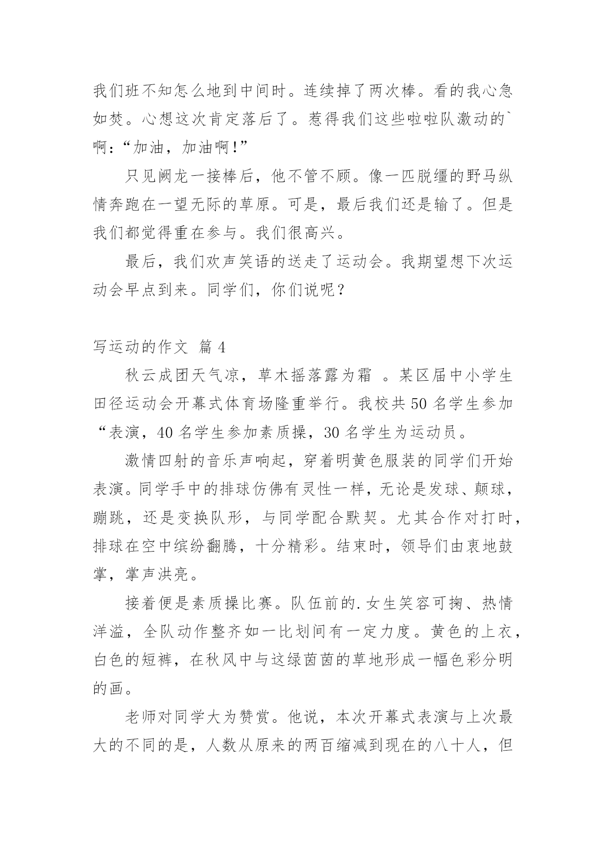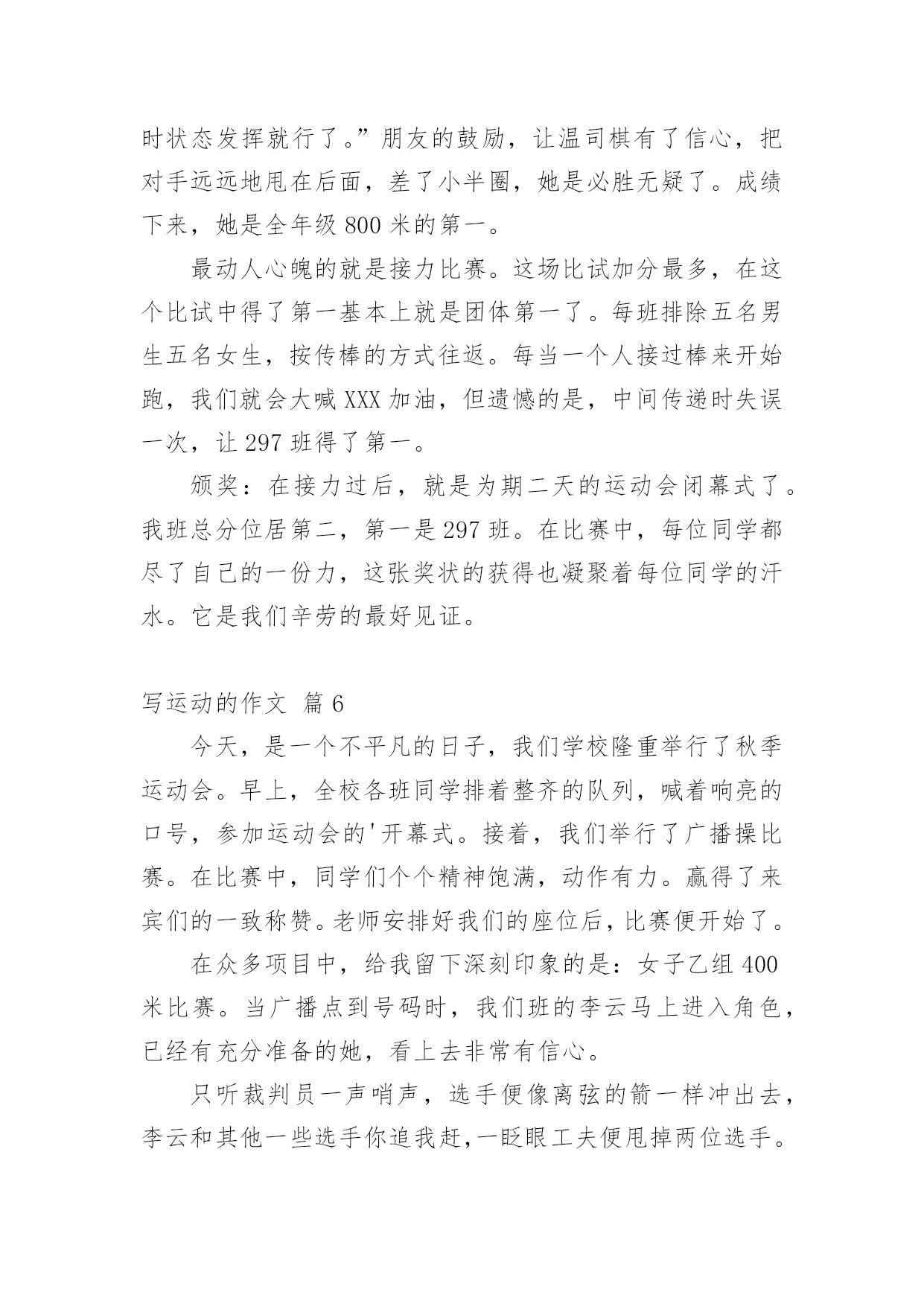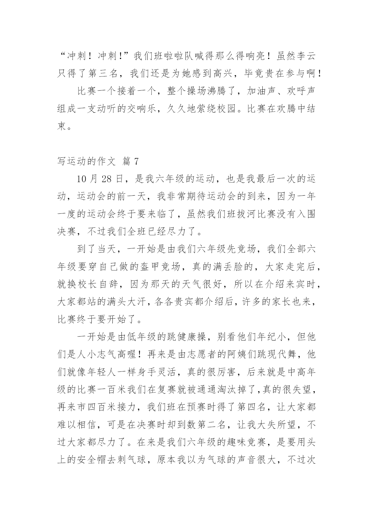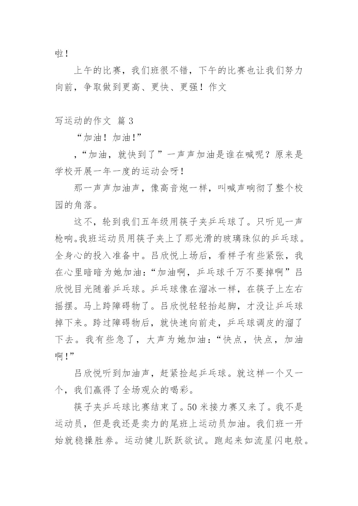 写运动的作文精选写运动的作文集锦八篇在平平淡淡的学习、工作、生活中,大家都写过作文,肯定对各类作文都很熟悉吧,写作文可以锻炼我们的独处习惯,让自己的心静下来,思考自己未来的方向。一篇什么样的作文才能称之为优秀作文呢?以下是小编整理的写运动的作文9篇,希望对大家有所帮助。写运动的作文篇1这次运动会让我深刻体验到各种感受!我参加了400米赛跑,起初我很紧张,同学们就鼓励我,慢慢平复我的恐惧心理。终于等到了这一刻,在裁判的一声令下,我听到了,我听到了:同学们在为我呐喊,为我加油。在这些呐喊与加油声中我努力向前冲,此刻我觉得向前是一种昂扬的姿态,是永不告败的精神,是催人奋进的号角。最终我却已失败告终,现在我想对那些对我鼓励的'人说声:“对不起!”同时我也很开心,因为我的朋友没有怪我,我太感谢她们了!之后又参加400米接力赛,我是第二棒,这项比赛最重要的是团队之间的合作。赛前下起了小雨,跑道上有点滑,但这并没有引起队员的抱怨。比赛开始了,第一棒已经跑了,在她跑的过程中,我看到她努力拼搏的精神;她把接力棒交到我手中,我不顾一切向前冲,把接力棒交到第三人手中;那时,我看到她奋斗的精神。最后一名选手已经拿到接力棒,这可是决定胜负的一跑,在她前进的步伐中,我看到她坚定的信念:要取得优异的成绩!最后我们的了第二名。这场运动会让我感到向前和团结是每个人奋斗的精神,是激昂的斗志,使我们民族的精魂!写运动的作文篇2今天是运动会的第二天,今天我们一年又五个运动项目,上午要举行的是垒球和立定跳远项目。立定跳远马上要开始了,在老师的指导下,我们先进行了一下热身。跑一跑,跳一跳。然后按序排好队,每一个站在起跳点的小朋友表情都十分严肃,半屈膝盖,摆动手臂,奋力向上一跃!脚跟稳稳落地,跳出了自己最好的成绩。小运动员们都很厉害,还破了记录!我们班夏阳同学在此次比赛中获得第四名的好成绩!为他高兴!女子跳远比赛中,我们班的张睿涵同学获得了第二名的好成绩,还破了记录,为她的努力和成绩欢呼!垒球比赛马上就要开始了,我已经期待这个时刻很久了,我感觉浑身充满了力量,想在运动场上爆发。我走上了比赛场,做了几下伸展运动,拿起来了垒球,看了看给我加油的小伙伴们,吸气、深蹲、抛球,完成比赛,我投出了11米的`成绩,在比赛中我获得了第四名的成绩,我为我的成绩而骄傲、兴奋!我们班的女子垒球是大丰收:李悦获得第一名,王诗近获得第二名,楼梦琦获得第五名,她们实在太棒啦!上午的比赛,我们班很不错,下午的比赛也让我们努力向前,争取做到更高、更快、更强!作文写运动的作文篇3“加油!加油!”,“加油,就快到了”一声声加油是谁在喊呢?原来是学校开展一年一度的运动会呀!那一声声加油声,像高音炮一样,叫喊声响彻了整个校园的角落。这不,轮到我们五年级用筷子夹乒乓球了。只听见一声枪响。我班运动员用筷子夹上了那光滑的玻璃珠似的乒乓球。全身心的投入准备中。吕欣悦上场后,看样子有些紧张,我在心里暗暗为她加油:“加油啊,乒乓球千万不要掉啊”吕欣悦目光随着乒乓球。乒乓球像在溜冰一样,在筷子上左右摇摆。马上跨障碍物了。吕欣悦轻轻抬起脚,才没让乒乓球掉下来。跨过障碍物后,就快速向前走,乒乓球调皮的溜了下去。我有些急了,大声为她加油:“快点,快点,加油啊!”吕欣悦听到加油声,赶紧捡起乒乓球。就这样一个又一个,我们赢得了全场观众的喝彩。筷子夹乒乓球比赛结束了。50米接力赛又来了。我不是运动员,但是我还是卖力的尾班上运动员加油。我们班一开始就稳操胜券。运动健儿跃跃欲试。跑起来如流星闪电般。我们班不知怎么地到中间时。连续掉了两次棒。看的我心急如焚。心想这次肯定落后了。惹得我们这些啦啦队激动的`啊:“加油,加油啊!”只见阙龙一接棒后,他不管不顾。像一匹脱缰的野马纵情奔跑在一望无际的草原。可是,最后我们还是输了。但是我们都觉得重在参与。我们很高兴。最后,我们欢声笑语的送走了运动会。我期望想下次运动会早点到来。同学们,你们说呢?写运动的作文篇4秋云成团天气凉,草木摇落露为霜。某区届中小学生田径运动会开幕式体育场隆重举行。我校共50名学生参加“表演,40名学生参加素质操,30名学生为运动员。激情四射的音乐声响起,穿着明黄色服装的同学们开始表演。同学手中的排球仿佛有灵性一样,无论是发球、颠球,蹦跳,还是变换队形,与同学配合默契。尤其合作对打时,排球在空中缤纷翻腾,十分精彩。结束时,领导们由衷地鼓掌,掌声洪亮。接着便是素质操比赛。队伍前的.女生笑容可掬、热情洋溢,全队动作整齐如一比划间有一定力度。黄色的上衣,白色的短裤,在秋风中与这绿茵茵的草地形成一幅色彩分明的画。老师对同学大为赞赏。他说,本次开幕式表演与上次最大的不同的是,人数从原来的两百缩减到现在的八十人,但是节目的精彩程度不减反增。排球是我校特色,参加表演的同学认真训练,投入很多精力