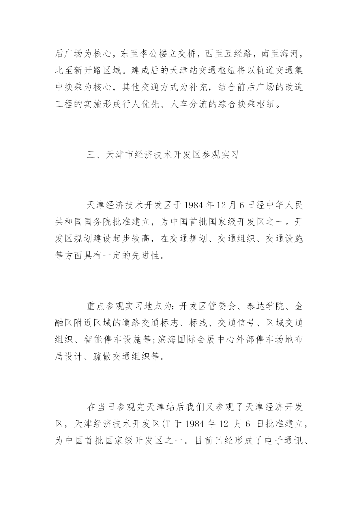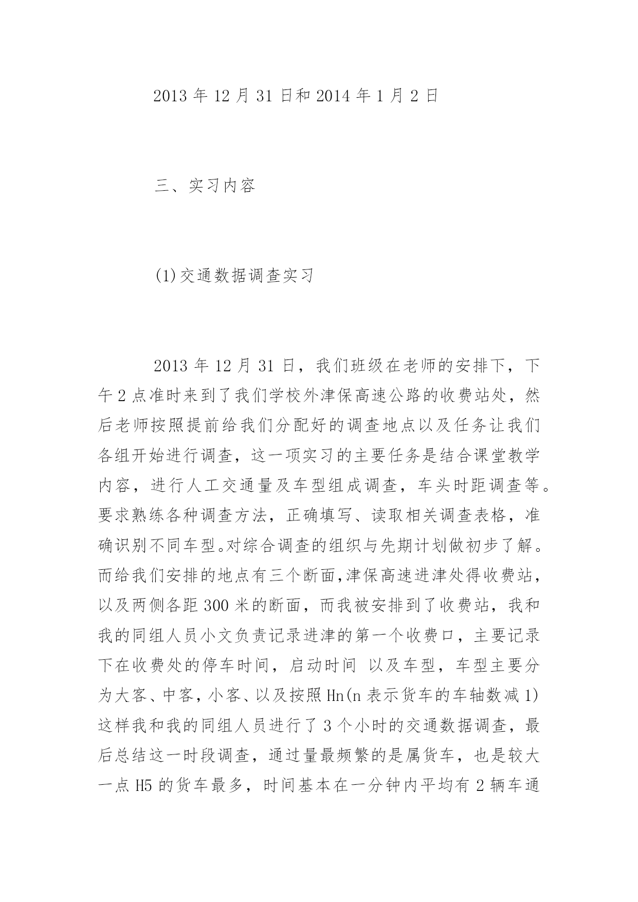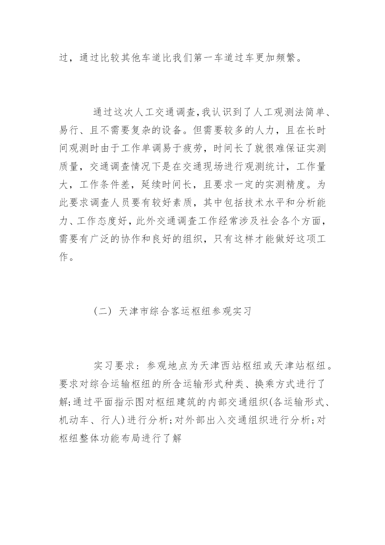 交通工程认识实习报告交通工程认识实习报告交通工程认识实习报告,下面小编为你整理推荐交通工程专业学生的实习报告,欢迎阅读参考。交通工程认识实习报告【1】XXX实习报告姓名:学号:专业:班级:指导老师:实习单位:实习时间:X年X月X日——X年X月X日一、实习目的为了让我们更好的理解运用课本上学到的东西,提前实践专业知识,交通运输和交通工程专业的同学在老师的指导下进行了一次城市交通的认识实习,通过对交通量的实地调查和参观城市综合客运枢纽,以及城市经济技术开发区的实习,加强我们对专业的认识,同时也加强我们的专业兴趣,为以后的学习增加动力,更好的掌握专业知识。二、实习时间2013年12月31日和2014年1月2日三、实习内容(1)交通数据调查实习2013年12月31日,我们班级在老师的安排下,下午2点准时来到了我们学校外津保高速公路的收费站处,然后老师按照提前给我们分配好的调查地点以及任务让我们各组开始进行调查,这一项实习的主要任务是结合课堂教学内容,进行人工交通量及车型组成调查,车头时距调查等。要求熟练各种调查方法,正确填写、读取相关调查表格,准确识别不同车型。对综合调查的组织与先期计划做初步了解。而给我们安排的地点有三个断面,津保高速进津处得收费站,以及两侧各距300米的断面,而我被安排到了收费站,我和我的同组人员小文负责记录进津的第一个收费口,主要记录下在收费处的停车时间,启动时间以及车型,车型主要分为大客、中客,小客、以及按照Hn(n表示货车的车轴数减1)这样我和我的同组人员进行了3个小时的交通数据调查,最后总结这一时段调查,通过量最频繁的是属货车,也是较大一点H5的货车最多,时间基本在一分钟内平均有2辆车通过,通过比较其他车道比我们第一车道过车更加频繁。通过这次人工交通调查,我认识到了人工观测法简单、易行、且不需要复杂的设备。但需要较多的人力,且在长时间观测时由于工作单调易于疲劳,时间长了就很难保证实测质量,交通调查情况下是在交通现场进行观测统计,工作量大,工作条件差,延续时间长,且要求一定的实测精度。为此要求调查人员要有较好素质,其中包括技术水平和分析能力、工作态度好,此外交通调查工作经常涉及社会各个方面,需要有广泛的协作和良好的组织,只有这样才能做好这项工作。(二)天津市综合客运枢纽参观实习实习要求:参观地点为天津西站枢纽或天津站枢纽。要求对综合运输枢纽的所含运输形式种类、换乘方式进行了解;通过平面指示图对枢纽建筑的内部交通组织(各运输形式、机动车、行人)进行分析;对外部出入交通组织进行分析;对枢纽整体功能布局进行了解2014年1月2日早晨我们开始了天津市综合客运枢纽参观,首先做649公交车到刘园站下车,然后转坐地铁来到了天津站。天津站位于天津城市中心,地处和平、河东与河北三区交界处,商圈环抱,紧临海河,是天津市最主要的交通枢纽。天津站建成后的站房整体通透流畅,功能齐全、高效、便捷、智能化,充分体现了现代铁路建筑的内在品质。站房包括城际北站房、高架候车室、地下进站厅、无站台柱雨棚及高站台、东西侧旅客地道、东西侧行包通道、既有南站房,总建筑面积达20万平方米。城际北站房首层为进站中央大厅,二层直通高架候车室;屋面结构采用大跨钢网架,外檐装修采用新型石材和玻璃幕墙;东西方向呈单边内凹亚铃状,总建筑面积2.67万平方米。高架候车大厅最大跨度为54米。地下进站厅位于地下一层,建筑面积1.24万平方米。东、西旅客出站地道位于地下进站大厅东、西两侧,宽度达到18米。无站台柱雨棚覆盖全部站台,南北方向共5跨,总建筑面积达80850平方米。天津站场总规模为10台18线,自北向南依次为京津城际车场,4台7线;津秦高速车场,3台6线;普速车场,3台5线。按照天津市总体规划,地铁2、3、9号线将引入天津站,分别位于城际站房地下二、三、四层;天津站外围,南北广场改造景观,东侧重建李公楼立交桥,西侧新建五经路地道,站场中部新建南北广场联系通道,形成围绕新客站的环形交通疏解通道。客流乘降采用天津站交通枢纽是集普速铁路、京津城际轨道交通、津秦客运专线、地下直径线、城市轨道交通、公共交通以及其他交通方式为一体的大型综合交通枢纽,天津站交通枢纽站房形象设计方案几经优化。在建的涉及十几个工程子项目,几十个专业,功能复杂、接口繁多,是目前国内最大且复杂的综合交通枢纽之一。主要分为前广场工程、后广场工程枢纽和周边市政交通工程。其中,后广场工程包括:轨道换乘中心、新建铁路站房工程、公交中心、停车楼等,新建铁路站房计划2008年交付使用;市政交通工程包括:李公楼立交桥、五经路地道、海河东路隧道等,形成一个环形交通疏解通道。天津站换乘交通枢纽地下部分共有四层:地下一层配合市政开发为