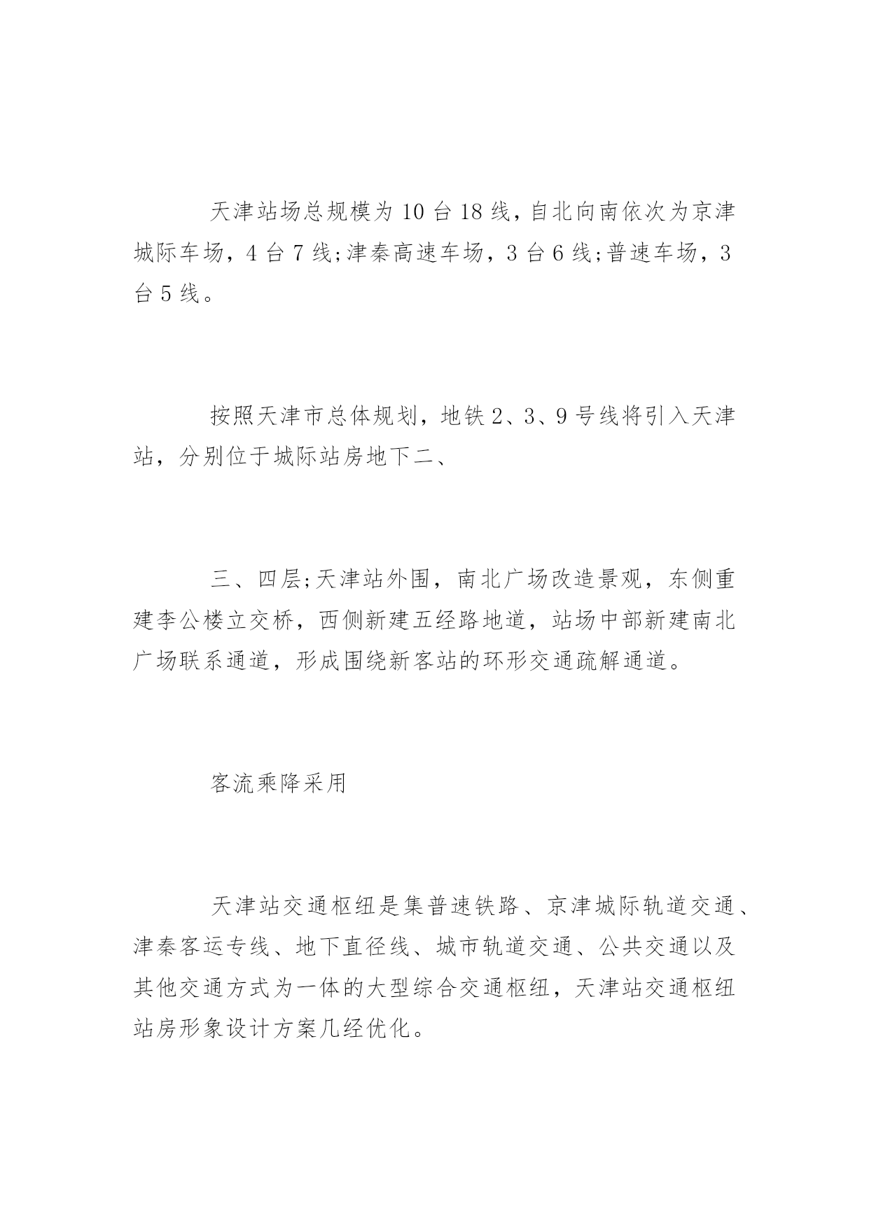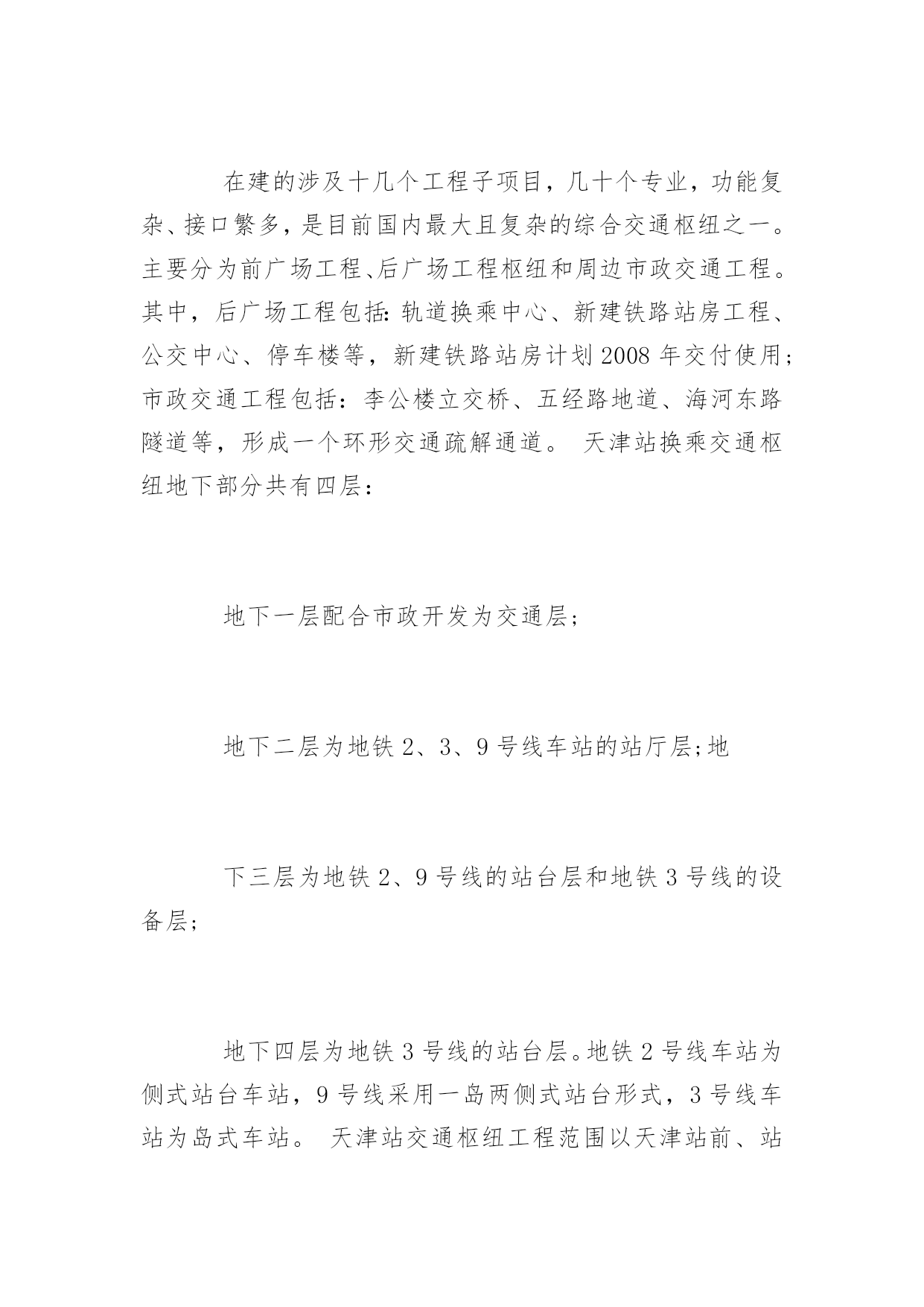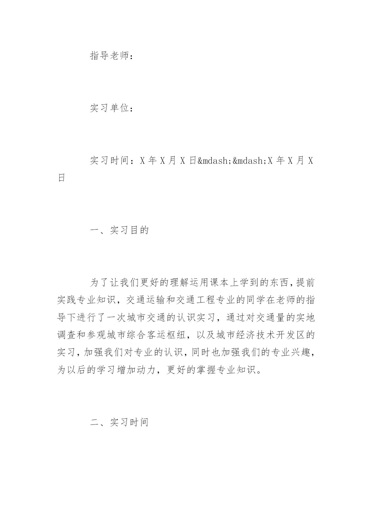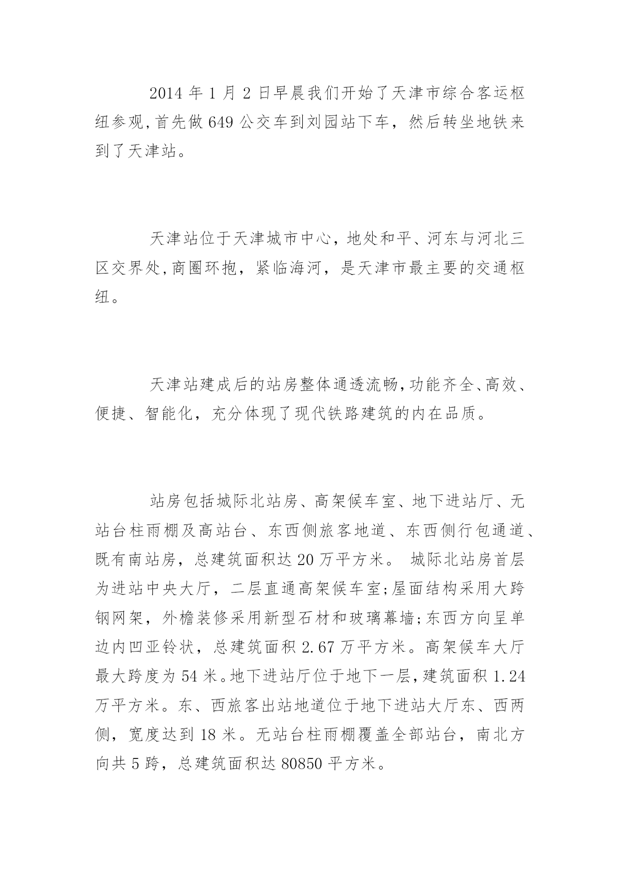 交通工程认识实习报告交通工程认识实习报告交通工程认识实习报告,下面小编为你整理推荐交通工程专业学生的实习报告,欢迎阅读参考。交通工程认识实习报告【1】XXX实习报告姓名:学号:专业:班级:指导老师:实习单位:实习时间:X年X月X日——X年X月X日一、实习目的为了让我们更好的理解运用课本上学到的东西,提前实践专业知识,交通运输和交通工程专业的同学在老师的指导下进行了一次城市交通的认识实习,通过对交通量的实地调查和参观城市综合客运枢纽,以及城市经济技术开发区的实习,加强我们对专业的认识,同时也加强我们的专业兴趣,为以后的学习增加动力,更好的掌握专业知识。二、实习时间2013年12月31日和2014年1月2日三、实习内容(1)交通数据调查实习2013年12月31日,我们班级在老师的安排下,下午2点准时来到了我们学校外津保高速公路的收费站处,然后老师按照提前给我们分配好的调查地点以及任务让我们各组开始进行调查,这一项实习的主要任务是结合课堂教学内容,进行人工交通量及车型组成调查,车头时距调查等。要求熟练各种调查方法,正确填写、读取相关调查表格,准确识别不同车型。对综合调查的组织与先期计划做初步了解。而给我们安排的地点有三个断面,津保高速进津处得收费站,以及两侧各距300米的断面,而我被安排到了收费站,我和我的同组人员小文负责记录进津的第一个收费口,主要记录下在收费处的停车时间,启动时间以及车型,车型主要分为大客、中客,小客、以及按照Hn(n表示货车的车轴数减1)这样我和我的同组人员进行了3个小时的交通数据调查,最后总结这一时段调查,通过量最频繁的是属货车,也是较大一点H5的货车最多,时间基本在一分钟内平均有2辆车通过,通过比较其他车道比我们第一车道过车更加频繁。通过这次人工交通调查,我认识到了人工观测法简单、易行、且不需要复杂的设备。但需要较多的人力,且在长时间观测时由于工作单调易于疲劳,时间长了就很难保证实测质量,交通调查情况下是在交通现场进行观测统计,工作量大,工作条件差,延续时间长,且要求一定的实测精度。为此要求调查人员要有较好素质,其中包括技术水平和分析能力、工作态度好,此外交通调查工作经常涉及社会各个方面,需要有广泛的协作和良好的组织,只有这样才能做好这项工作。(二)天津市综合客运枢纽参观实习实习要求:参观地点为天津西站枢纽或天津站枢纽。要求对综合运输枢纽的所含运输形式种类、换乘方式进行了解;通过平面指示图对枢纽建筑的内部交通组织(各运输形式、机动车、行人)进行分析;对外部出入交通组织进行分析;对枢纽整体功能布局进行了解2014年1月2日早晨我们开始了天津市综合客运枢纽参观,首先做649公交车到刘园站下车,然后转坐地铁来到了天津站。天津站位于天津城市中心,地处和平、河东与河北三区交界处,商圈环抱,紧临海河,是天津市最主要的交通枢纽。天津站建成后的站房整体通透流畅,功能齐全、高效、便捷、智能化,充分体现了现代铁路建筑的内在品质。站房包括城际北站房、高架候车室、地下进站厅、无站台柱雨棚及高站台、东西侧旅客地道、东西侧行包通道、既有南站房,总建筑面积达20万平方米。城际北站房首层为进站中央大厅,二层直通高架候车室;屋面结构采用大跨钢网架,外檐装修采用新型石材和玻璃幕墙;东西方向呈单边内凹亚铃状,总建筑面积2.67万平方米。高架候车大厅最大跨度为54米。地下进站厅位于地下一层,建筑面积1.24万平方米。东、西旅客出站地道位于地下进站大厅东、西两侧,宽度达到18米。无站台柱雨棚覆盖全部站台,南北方向共5跨,总建筑面积达80850平方米。天津站场总规模为10台18线,自北向南依次为京津城际车场,4台7线;津秦高速车场,3台6线;普速车场,3台5线。按照天津市总体规划,地铁2、3、9号线将引入天津站,分别位于城际站房地下二、三、四层;天津站外围,南北广场改造景观,东侧重建李公楼立交桥,西侧新建五经路地道,站场中部新建南北广场联系通道,形成围绕新客站的环形交通疏解通道。客流乘降采用天津站交通枢纽是集普速铁路、京津城际轨道交通、津秦客运专线、地下直径线、城市轨道交通、公共交通以及其他交通方式为一体的大型综合交通枢纽,天津站交通枢纽站房形象设计方案几经优化。在建的涉及十几个工程子项目,几十个专业,功能复杂、接口繁多,是目前国内最大且复杂的综合交通枢纽之一。主要分为前广场工程、后广场工程枢纽和周边市政交通工程。其中,后广场工程包括:轨道换乘中心、新建铁路站房工程、公交中心、停车楼等,新建铁路站房计划2008年交付使用;市政交通工程包括:李公楼立交桥、五经路地道、海河东路隧道等,形成一个环形交通疏解通道。天津站换乘交通枢纽地下部分共有四层:地下一层配合市政开发为