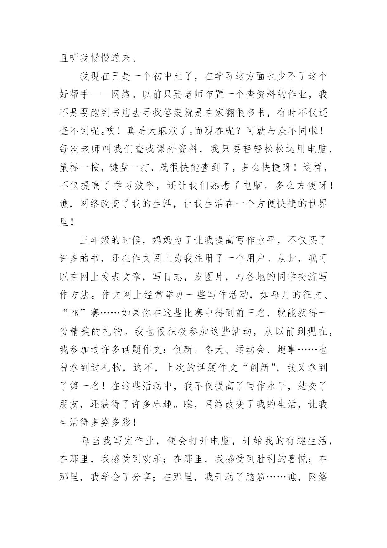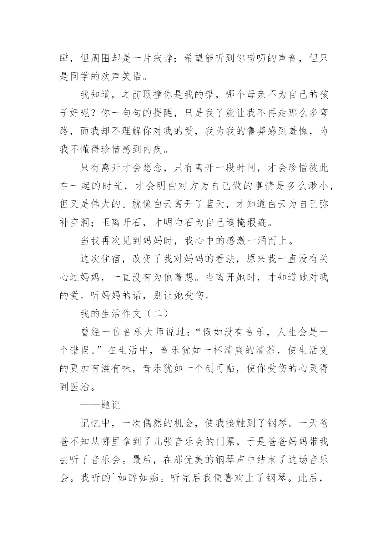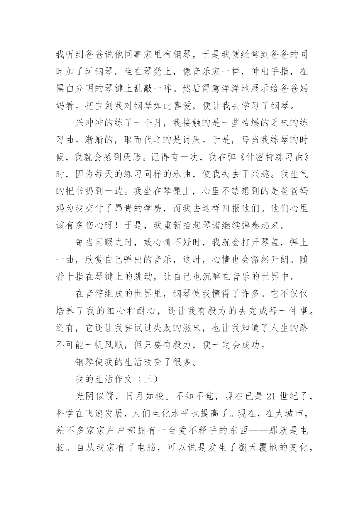 我的生活作文我的生活精选作文我的生活作文(一)今学期,我加入了住宿的行列。这是我第一次离开父母,独立生活。我感到既兴奋又好奇,因为终于不用听到妈妈的唠唠叨叨了。但好景不长,刚开始的宿舍生活给我带来了不少困难。每天都要自己洗衣服,当手浸泡在冰冷的水中时,我不禁打了个寒颤,接着这股儿冷劲儿蔓延到全身,那是透心的冷啊!我用手搓了搓衣服,手已变红、冻僵了。想起以前,每天早上,你总是起得早,为我洗衣服,而我却在暖和的被窝里呼呼大睡。现在想起来,觉得自己很自私,因为从来都不知道你洗衣服的辛苦。在住宿的第一天,我睡不着,我想起了你,想起了你那双长满茧而粗糙的手,一句又一句唠叨的话。你对我的学习唠叨,对我的生活更唠叨,而我从来没有在意过。而现在,离开了你,才发现那些唠叨都是你对我无微不至的爱,我却身在福中不知福。我不禁想起了你那温馨的目光,想起你教我坚毅地望着前路,叮嘱我跌倒了也不要放弃。每天,我都盼望着那一桌丰盛的晚餐,但等来的却是青瓜、肉片加白饭;希望穿上你亲手为我洗的衣服,但却时冷冰冰、湿淋淋的衣服;希望能与你此起彼伏的鼻鼾声一起入睡,但周围却是一片寂静;希望能听到你唠叨的声音,但只是同学的欢声笑语。我知道,之前顶撞你是我的错,哪个母亲不为自己的孩子好呢?你一句句的提醒,只是我了能让我不再走那么多弯路,而我却不理解你对我的爱,我为我的鲁莽感到羞愧,为我不懂得珍惜感到内疚。只有离开才会想念,只有离开一段时间,才会珍惜彼此在一起的时光,才会明白对方为自己做的事情是多么渺小,但又是伟大的。就像白云离开了蓝天,才知道白云为自己弥补空洞;玉离开石,才明白石为自己遮掩瑕疵。当我再次见到妈妈时,我心中的感激一涌而上。这次住宿,改变了我对妈妈的看法,原来我一直没有关心过妈妈,一直没有为他着想。当离开她时,才知道她对我的爱。听妈妈的话,别让她受伤。我的生活作文(二)曾经一位音乐大师说过:“假如没有音乐,人生会是一个错误。”在生活中,音乐犹如一杯清爽的清茶,使生活变的更加有滋有味,音乐犹如一个创可贴,使你受伤的心灵得到医治。——题记记忆中,一次偶然的机会,使我接触到了钢琴。一天爸爸不知从哪里拿到了几张音乐会的门票,于是爸爸妈妈带我去听了音乐会。最后,在那优美的钢琴声中结束了这场音乐会。我听的`如醉如痴。听完后我便喜欢上了钢琴。此后,我听到爸爸说他同事家里有钢琴,于是我便经常到爸爸的同时加了玩钢琴。坐在琴凳上,像音乐家一样,伸出手指,在黑白分明的琴键上乱敲一阵。然后得意洋洋地展示给爸爸妈妈看。把宝剑我对钢琴如此喜爱,便让我去学习了钢琴。兴冲冲的练了一个月,我接触的是一些枯燥的乏味的练习曲。渐渐的,取而代之的是讨厌。于是,每当我练琴的时候,我就会感到厌恶。记得有一次,我在弹《什密特练习曲》时,因为每天的练习同样的乐曲,使我失去了兴趣。我生气的把书扔到一边。我坐在琴凳上,心里不禁想到的是爸爸妈妈为我交付了昂贵的学费,而我去这样回报他们。他们心里该有多伤心呀!于是,我重新拾起琴谱继续弹奏起来。每当闲暇之时,或心情不好时,我就会打开琴盖,弹上一曲,欣赏自己弹出的音乐,这时,心情也会豁然开朗。随着十指在琴键上的跳动,让自己也沉醉在音乐的世界中。在音符组成的世界里,钢琴使我懂得了许多。它不仅仅培养了我的细心和耐心,还让我有毅力的去完成每一件事。还有,它还让我尝试过失败的滋味,也让我知道了人生的路不可能一帆风顺,但只要有毅力,便一定会成功。钢琴使我的生活改变了很多。我的生活作文(三)光阴似箭,日月如梭。不知不觉,现在已是21世纪了,科学在飞速发展,人们生化水平也提高了。现在,在大城市,差不多家家户户都拥有一台爱不释手的东西——那就是电脑。自从我家有了电脑,可以说是发生了翻天覆地的变化,且听我慢慢道来。我现在已是一个初中生了,在学习这方面也少不了这个好帮手——网络。以前只要老师布置一个查资料的作业,我不是要跑到书店去寻找答案就是在家翻很多书,有时不仅还查不到呢。唉!真是太麻烦了。而现在呢?可就与众不同啦!每次老师叫我们查找课外资料,我只要轻轻松松运用电脑,鼠标一按,键盘一打,就很快能查到了,多么快捷呀!这样,不仅提高了学习效率,还让我们熟悉了电脑。多么方便呀!瞧,网络改变了我的生活,让我生活在一个方便快捷的世界里!三年级的时候,妈妈为了让我提高写作水平,不仅买了许多的书,还在作文网上为我注册了一个用户。从此,我可以在网上发表文章,写日志,发图片,与各地的同学交流写作方法。作文网上经常举办一些写作活动,如每月的征文、“PK”赛……如果你在这些比赛中得到前三名,就能获得一份精美的礼物。我也很积极参加这些活动,从以前到现在,我参加过许多话题作文:创新、冬天、运动会、趣事……也曾拿到过礼物,这不,上次的话题作文“创新”,我又拿到了第一名!在这些活动中,我不仅提高了写作水平,结交