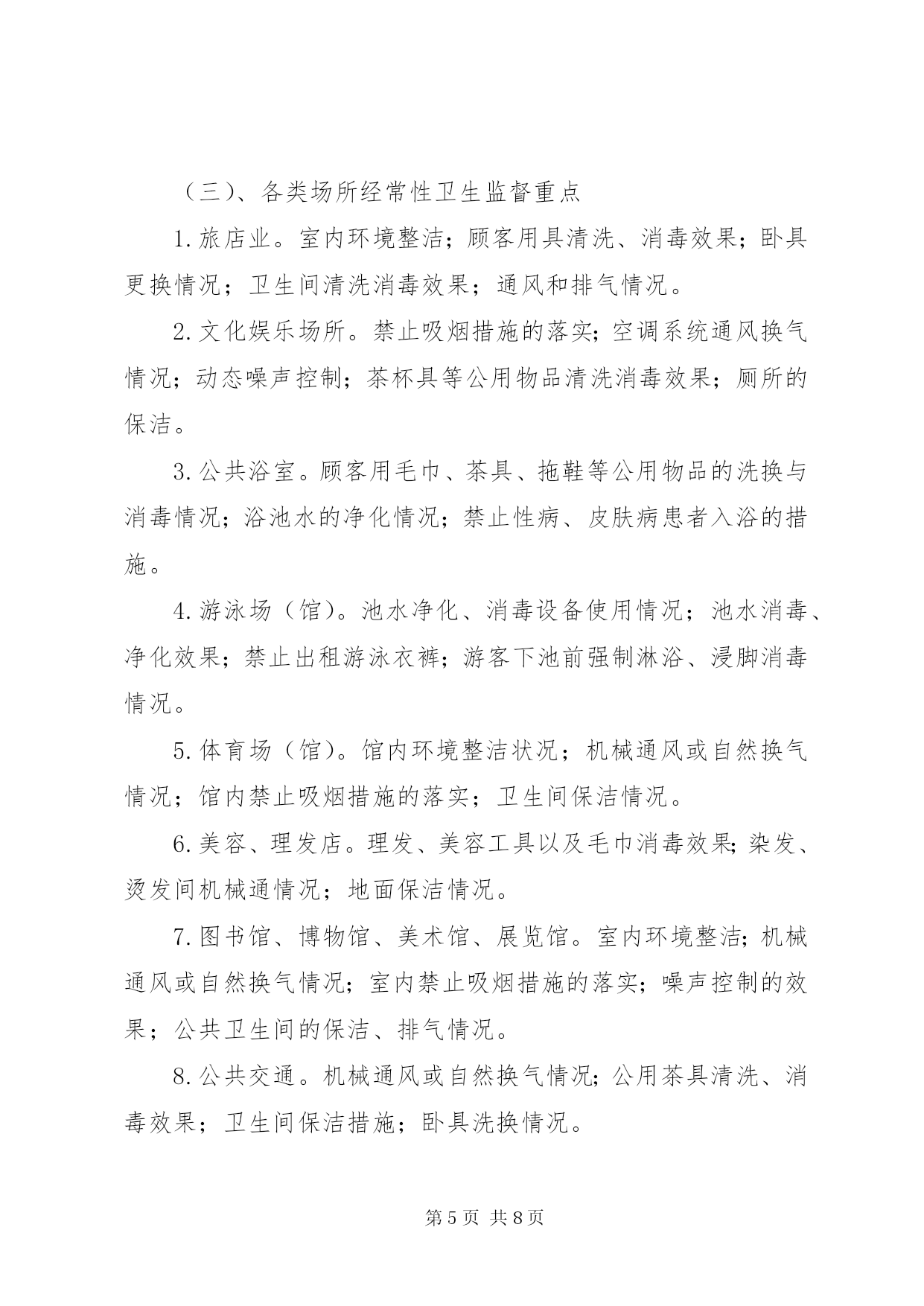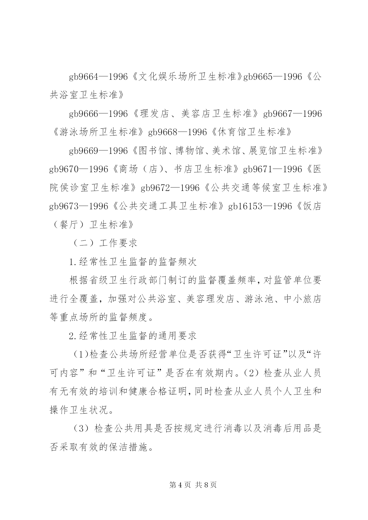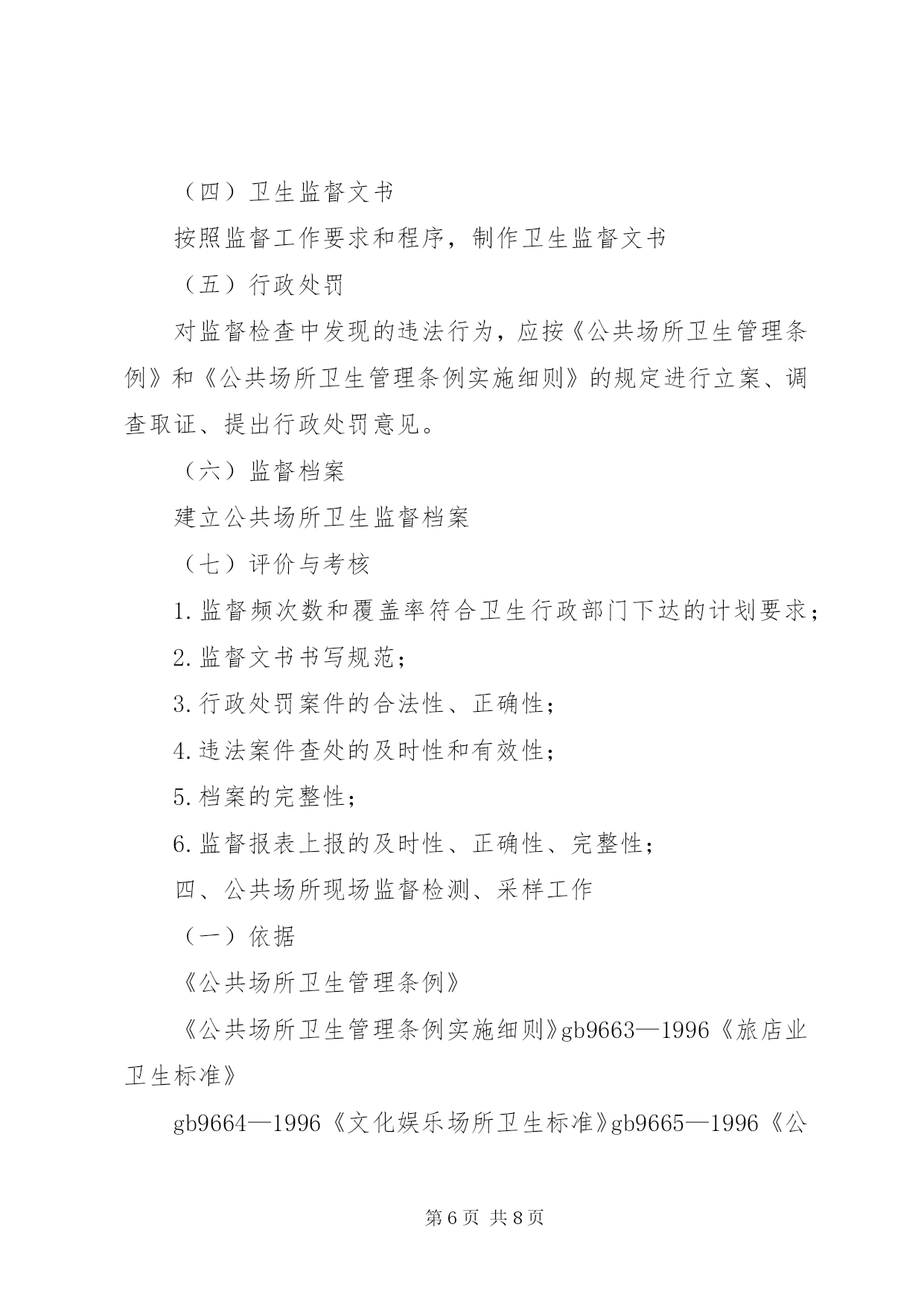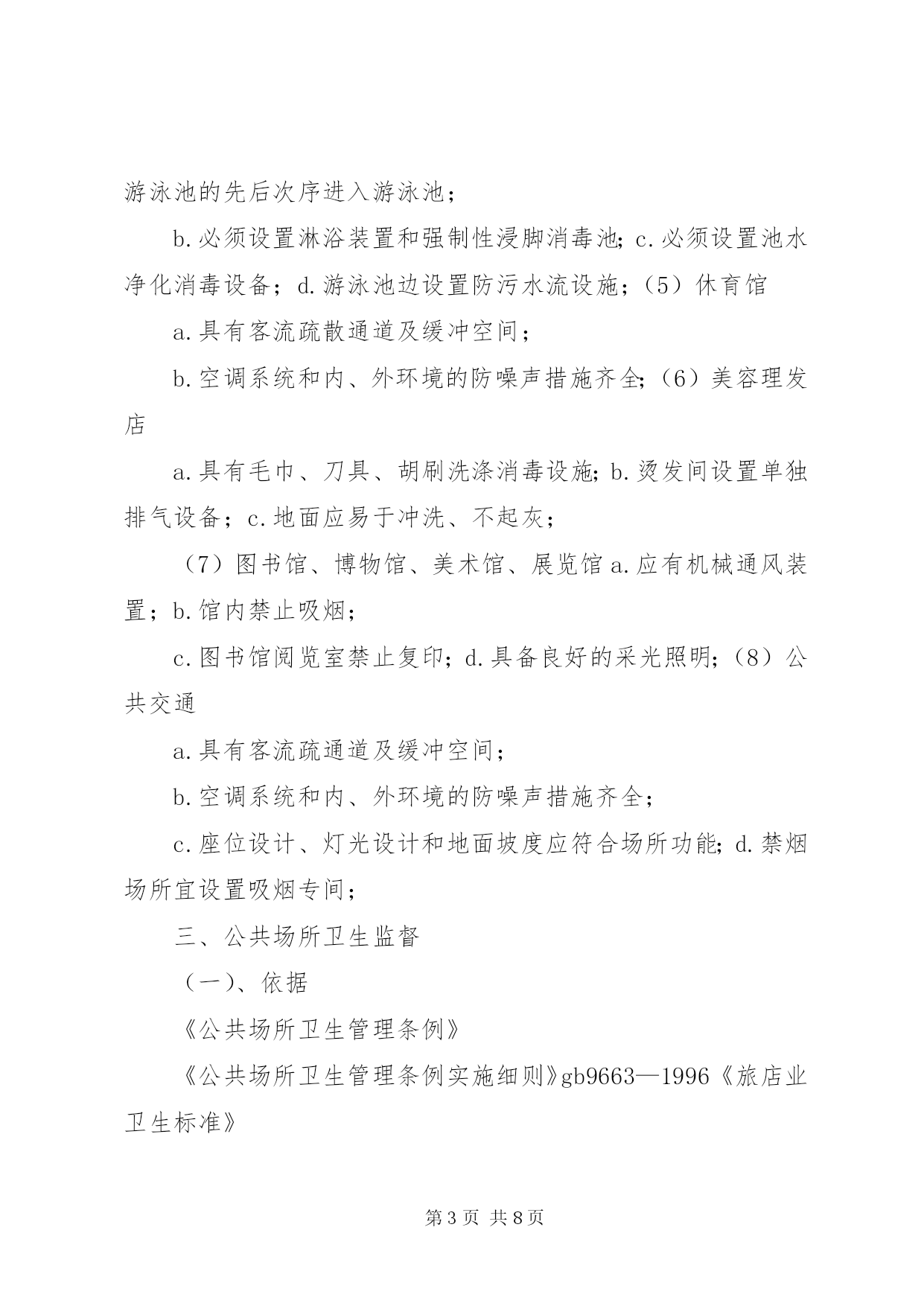 第PAGE\*Arabic\*MERGEFORMAT8页共NUMPAGES\*MERGEFORMAT8页公共场所卫生监督工作程序公共场所卫生监督2008-07-1810:47:14|分类:卫生监督|标签:|字号大中小订阅一、法律依据《公共场所卫生管理条例》《公共场所卫生管理条例实施细则》二、工作要求1.卫生许可证发放按照《公共场所卫生管理条例》及相关法律、法规的规定,对下列单位进行卫生许可审查,符合要求的,发给卫生许可证。a、宾馆、饭馆、旅馆、招待所、车马店、咖啡馆、酒吧、茶座。b.公共浴室、理发店,美容店。c.影剧院、录像厅(室)、游艺室、舞厅、音乐厅。d.体育场(馆)、游泳场(馆)、公园。e.展览馆、博物馆、美术馆、图书馆。f.商场、书店。g.侯诊室、侯车(机、船)室、公共交通工具。2.卫生许可证的复核和变更(1)卫生许可证每二年复核一次,经审核监测合格的加盖“审核章”。(2对变更单位字号,法定代表人(负责人)、经营范围的公共场所,经审核合格的,变更卫生许可证。3.公共场所许可通用要求(1)选址符合城市总体规划和功能分区要求,附近无污染源,通风日照良好;(2)内部布局合理,具有足够的符合场所性质的卫生设施和消毒设施;(3)二次供水系统符合卫生要求;(4)具有通风换气设施,新风量应满足有关卫生标准的规定;(5)微小气候、空气、采光、照明、噪声等卫生指标监测符合卫生标准;4.各类公共场所许可要求(1)旅店业a.设置清洗消毒专间,配置专用清洗消毒工具;b.客房的通风、采光和照明良好;c.旅店上、下水的设置及安装合理;d.锅炉、通风机、制冷机等房间的设置消烟、除尘、消音、防震设施。(2)文化娱乐场所a.具有客流疏散通道及缓冲空间;b.空调系统和内、外环境的防噪声措施齐全;c.座位设计、灯光设计和地面坡度应符合场所功能;d.禁烟场所宜设置吸烟专间;(3)公共浴室a.浴室需具备相应的更衣、淋浴等辅助房间;b.地面防滑、防渗;c.桑拿浴室必须配备浴池水净化消毒设施;d.浴室必须设置通风换气装置;(4)游泳场(馆)a.平面流程布局合理,保证游客按照更衣室、厕所、淋浴室、游泳池的先后次序进入游泳池;b.必须设置淋浴装置和强制性浸脚消毒池;c.必须设置池水净化消毒设备;d.游泳池边设置防污水流设施;(5)休育馆a.具有客流疏散通道及缓冲空间;b.空调系统和内、外环境的防噪声措施齐全;(6)美容理发店a.具有毛巾、刀具、胡刷洗涤消毒设施;b.烫发间设置单独排气设备;c.地面应易于冲洗、不起灰;(7)图书馆、博物馆、美术馆、展览馆a.应有机械通风装置;b.馆内禁止吸烟;c.图书馆阅览室禁止复印;d.具备良好的采光照明;(8)公共交通a.具有客流疏通道及缓冲空间;b.空调系统和内、外环境的防噪声措施齐全;c.座位设计、灯光设计和地面坡度应符合场所功能;d.禁烟场所宜设置吸烟专间;三、公共场所卫生监督(一)、依据《公共场所卫生管理条例》《公共场所卫生管理条例实施细则》gb9663—1996《旅店业卫生标准》gb9664—1996《文化娱乐场所卫生标准》gb9665—1996《公共浴室卫生标准》gb9666—1996《理发店、美容店卫生标准》gb9667—1996《游泳场所卫生标准》gb9668—1996《休育馆卫生标准》gb9669—1996《图书馆、博物馆、美术馆、展览馆卫生标准》gb9670—1996《商场(店)、书店卫生标准》gb9671—1996《医院侯诊室卫生标准》gb9672—1996《公共交通等候室卫生标准》gb9673—1996《公共交通工具卫生标准》gb16153—1996《饭店(餐厅)卫生标准》(二)工作要求1.经常性卫生监督的监督频次根据省级卫生行政部门制订的监督覆盖频率,对监管单位要进行全覆盖,加强对公共浴室、美容理发店、游泳池、中小旅店等重点场所的监督频度。2.经常性卫生监督的通用要求(1)检查公共场所经营单位是否获得“卫生许可证”以及“许可内容”和“卫生许可证”是否在有效期内。(2)检查从业人员有无有效的培训和健康合格证明,同时检查从业人员个人卫生和操作卫生状况。(3)检查公共用具是否按规定进行消毒以及消毒后用品是否采取有效的保洁措施。(三)、各类场所经常性卫生监督重点1.旅店业。室内环境整洁;顾客用具清洗、消毒效果;卧具更换情况;卫生间清洗消毒效果;通风和排气情况。2.文化娱乐场所。禁止吸烟措施的落实;空调系统通风换气情况;动态噪声控制;茶杯具等公用物品清洗消毒效果;厕所的保洁。3.公共浴室。顾客用毛巾、茶具、拖鞋等公用物品的洗换与消毒情况;浴池水的净化情况;禁止性病、皮肤病患者入浴的措施。4.游泳场(馆)。池水净化、消毒设备使用情况;池水消毒、净化效果;禁止出租游泳衣裤;游客下池前强制淋浴、浸
