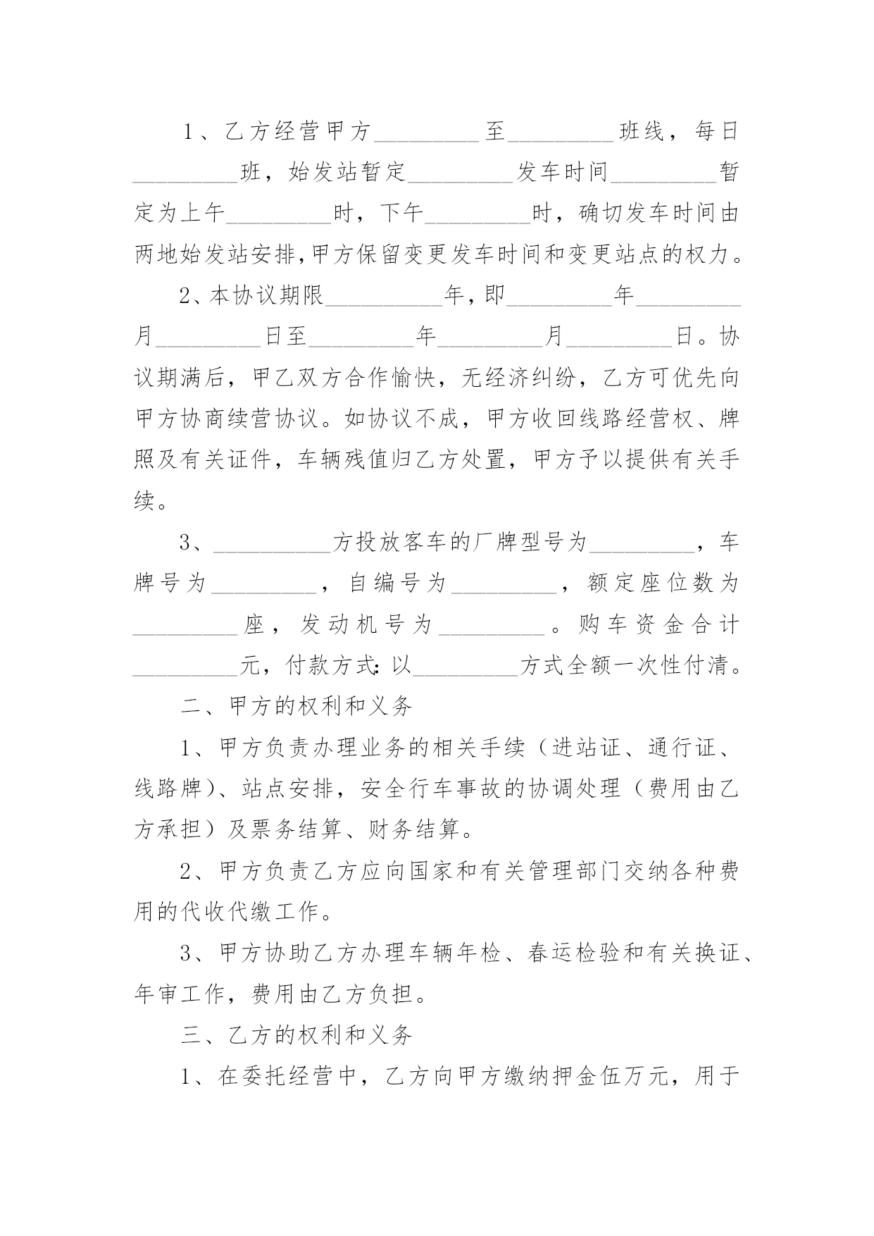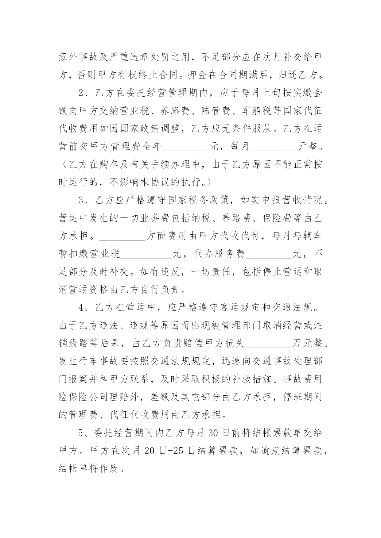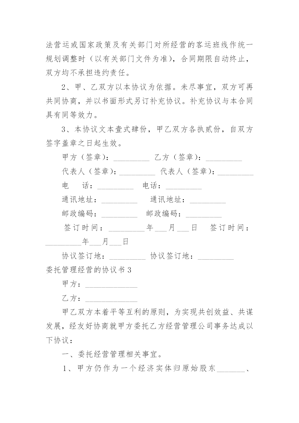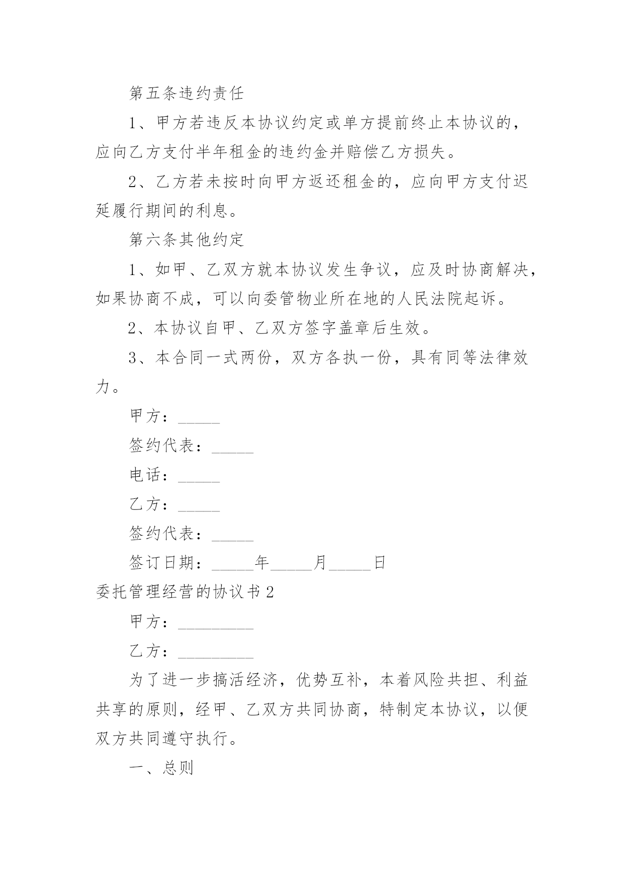 委托管理经营的协议书委托管理经营的协议书在日常生活和工作中,我们都跟协议有着直接或间接的联系,签订了协议就有了法律依靠。什么样的协议才是有效的呢?以下是小编收集整理的委托管理经营的协议书,仅供参考,希望能够帮助到大家。委托管理经营的协议书1甲方(委托方):_____公民身份号码:_____地址:_____乙方(受托方):_____住所地:_____为了保证市场经营效果、实现双赢,甲方同意将其商铺委托给乙方经营、管理。根据《中华人民共和国民法典》及相关法律、法规,为明确甲、乙双方的权利和义务,双方订立本协议并同意遵守以下条款:第一条委托经营管理物业(以下简称“委管物业”)1、甲方同意将其购买的号楼层号建筑面积为平方米的商铺,委托给乙方经营、管理,乙方负责商铺招商(即将商铺对外出租)及培育市场。2、委管物业的用途为:商业。如乙方以后改变委管物业用途,应事先征得甲方书面同意。第二条委托期限委托期限:___个月,自_____年___月___日起至_____年___月___日止。第三条租金及分配方式1、双方同意委管物业租金为元/平方米·月。2、分配方式:乙方按季度向甲方返还委管物业出租的全部租金,自年月日起每满三个月的十五个工作日内由乙方向甲方支付。3、乙方向甲方返还租金前,甲方应当开具发票,或委托乙方前往税务部门代开,产生应当由甲方承担的税费由乙方在返还给甲方的租金中扣除。第四条特别约定1、甲方不得干涉乙方的经营和管理,委管物业按乙方统一的经营管理模式经营;乙方有权决定包含委管物业在内的物业经营布局和宣传推广;乙方有权决定委管物业的`装修及装修管理。2、乙方和乙方人员应监督租户正常使用并爱护委管物业,防止不正常损坏(正常磨损除外)。因租户使用不当,导致物业出现损坏或发生故障或索赔,乙方应督促租户及时修复或赔偿。3、甲方保证委管物业不存在债权债务纠纷,若有债权债务纠纷而导致乙方或租户受到损失时,甲方应承担相应的赔偿责任。第五条违约责任1、甲方若违反本协议约定或单方提前终止本协议的,应向乙方支付半年租金的违约金并赔偿乙方损失。2、乙方若未按时向甲方返还租金的,应向甲方支付迟延履行期间的利息。第六条其他约定1、如甲、乙双方就本协议发生争议,应及时协商解决,如果协商不成,可以向委管物业所在地的人民法院起诉。2、本协议自甲、乙双方签字盖章后生效。3、本合同一式两份,双方各执一份,具有同等法律效力。甲方:_____签约代表:_____电话:_____乙方:_____签约代表:_____签订日期:_____年_____月_____日委托管理经营的协议书2甲方:_________乙方:_________为了进一步搞活经济,优势互补,本着风险共担、利益共享的原则,经甲、乙双方共同协商,特制定本协议,以便双方共同遵守执行。一、总则1、乙方经营甲方_________至_________班线,每日_________班,始发站暂定_________发车时间_________暂定为上午_________时,下午_________时,确切发车时间由两地始发站安排,甲方保留变更发车时间和变更站点的权力。2、本协议期限__________年,即_________年_________月_________日至_________年_________月_________日。协议期满后,甲乙双方合作愉快,无经济纠纷,乙方可优先向甲方协商续营协议。如协议不成,甲方收回线路经营权、牌照及有关证件,车辆残值归乙方处置,甲方予以提供有关手续。3、__________方投放客车的厂牌型号为_________,车牌号为_________,自编号为_________,额定座位数为_________座,发动机号为_________。购车资金合计_________元,付款方式:以_________方式全额一次性付清。二、甲方的权利和义务1、甲方负责办理业务的相关手续(进站证、通行证、线路牌)、站点安排,安全行车事故的协调处理(费用由乙方承担)及票务结算、财务结算。2、甲方负责乙方应向国家和有关管理部门交纳各种费用的代收代缴工作。3、甲方协助乙方办理车辆年检、春运检验和有关换证、年审工作,费用由乙方负担。三、乙方的权利和义务1、在委托经营中,乙方向甲方缴纳押金伍万元,用于意外事故及严重违章处罚之用,不足部分应在次月补交给甲方,否则甲方有权终止合同。押金在合同期满后,归还乙方。2、乙方在委托经营管理期内,应于每月上旬按实缴金额向甲方交纳营业税、养路费、陆管费、车船税等国家代征代收费用如因国家政策调整,乙方应无条件服从。乙方在运营前交甲方管理费全年_________元,每月_________元整。(乙方在购车及有关手续办理中,由于乙方原因不能正常按时运行的,不影响本协议的执行。)3、乙方应严格遵守