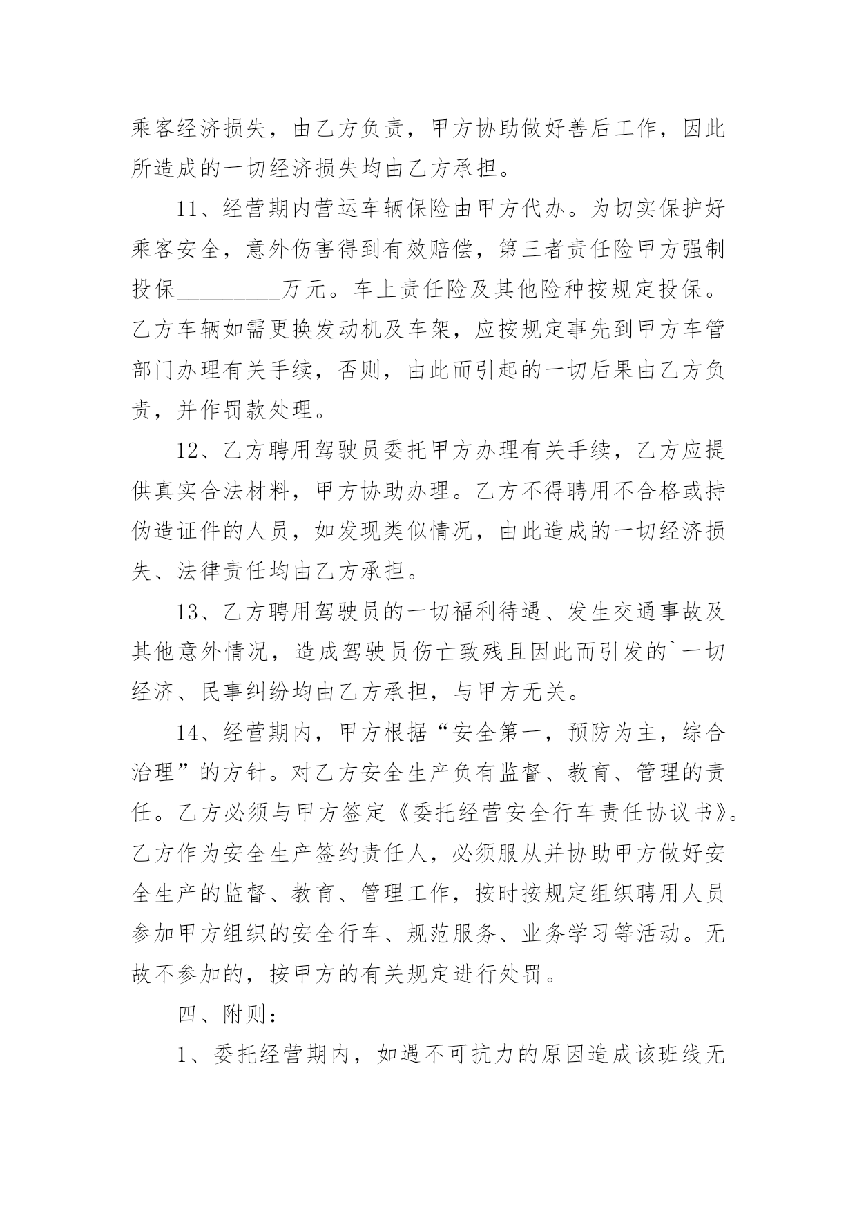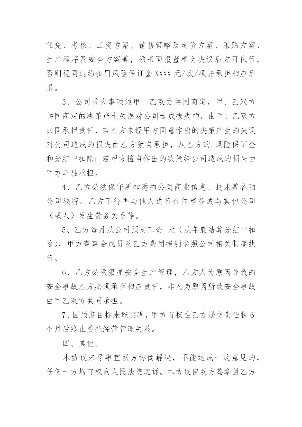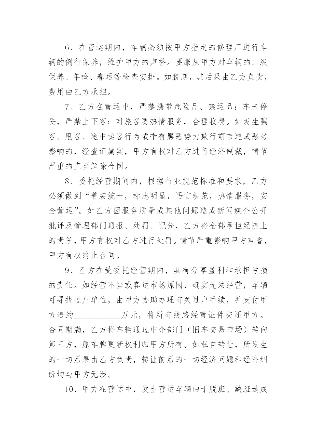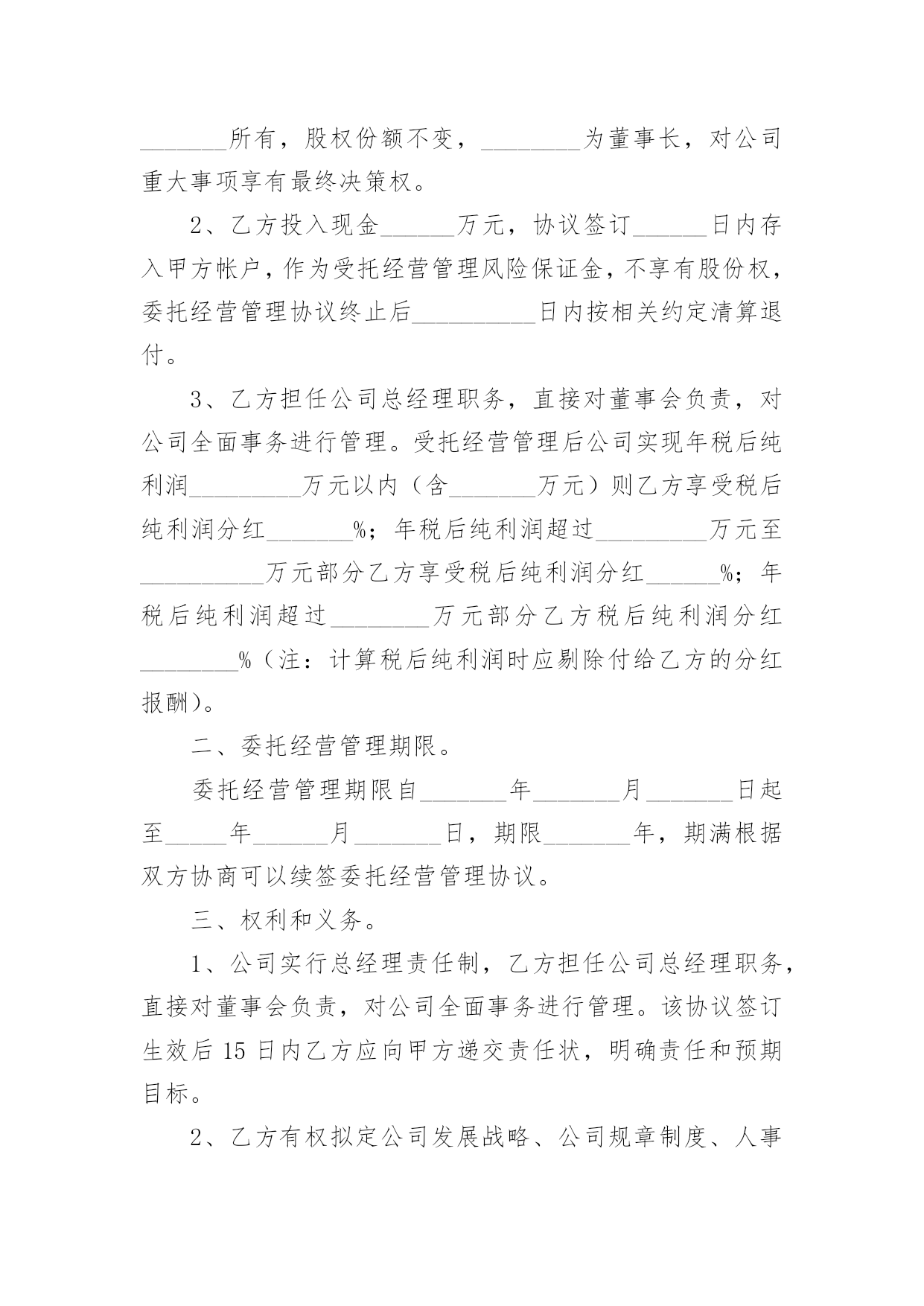 委托管理经营的协议书委托管理经营的协议书在日常生活和工作中,我们都跟协议有着直接或间接的联系,签订了协议就有了法律依靠。什么样的协议才是有效的呢?以下是小编收集整理的委托管理经营的协议书,仅供参考,希望能够帮助到大家。委托管理经营的协议书1甲方(委托方):_____公民身份号码:_____地址:_____乙方(受托方):_____住所地:_____为了保证市场经营效果、实现双赢,甲方同意将其商铺委托给乙方经营、管理。根据《中华人民共和国民法典》及相关法律、法规,为明确甲、乙双方的权利和义务,双方订立本协议并同意遵守以下条款:第一条委托经营管理物业(以下简称“委管物业”)1、甲方同意将其购买的号楼层号建筑面积为平方米的商铺,委托给乙方经营、管理,乙方负责商铺招商(即将商铺对外出租)及培育市场。2、委管物业的用途为:商业。如乙方以后改变委管物业用途,应事先征得甲方书面同意。第二条委托期限委托期限:___个月,自_____年___月___日起至_____年___月___日止。第三条租金及分配方式1、双方同意委管物业租金为元/平方米·月。2、分配方式:乙方按季度向甲方返还委管物业出租的全部租金,自年月日起每满三个月的十五个工作日内由乙方向甲方支付。3、乙方向甲方返还租金前,甲方应当开具发票,或委托乙方前往税务部门代开,产生应当由甲方承担的税费由乙方在返还给甲方的租金中扣除。第四条特别约定1、甲方不得干涉乙方的经营和管理,委管物业按乙方统一的经营管理模式经营;乙方有权决定包含委管物业在内的物业经营布局和宣传推广;乙方有权决定委管物业的`装修及装修管理。2、乙方和乙方人员应监督租户正常使用并爱护委管物业,防止不正常损坏(正常磨损除外)。因租户使用不当,导致物业出现损坏或发生故障或索赔,乙方应督促租户及时修复或赔偿。3、甲方保证委管物业不存在债权债务纠纷,若有债权债务纠纷而导致乙方或租户受到损失时,甲方应承担相应的赔偿责任。第五条违约责任1、甲方若违反本协议约定或单方提前终止本协议的,应向乙方支付半年租金的违约金并赔偿乙方损失。2、乙方若未按时向甲方返还租金的,应向甲方支付迟延履行期间的利息。第六条其他约定1、如甲、乙双方就本协议发生争议,应及时协商解决,如果协商不成,可以向委管物业所在地的人民法院起诉。2、本协议自甲、乙双方签字盖章后生效。3、本合同一式两份,双方各执一份,具有同等法律效力。甲方:_____签约代表:_____电话:_____乙方:_____签约代表:_____签订日期:_____年_____月_____日委托管理经营的协议书2甲方:_________乙方:_________为了进一步搞活经济,优势互补,本着风险共担、利益共享的原则,经甲、乙双方共同协商,特制定本协议,以便双方共同遵守执行。一、总则1、乙方经营甲方_________至_________班线,每日_________班,始发站暂定_________发车时间_________暂定为上午_________时,下午_________时,确切发车时间由两地始发站安排,甲方保留变更发车时间和变更站点的权力。2、本协议期限__________年,即_________年_________月_________日至_________年_________月_________日。协议期满后,甲乙双方合作愉快,无经济纠纷,乙方可优先向甲方协商续营协议。如协议不成,甲方收回线路经营权、牌照及有关证件,车辆残值归乙方处置,甲方予以提供有关手续。3、__________方投放客车的厂牌型号为_________,车牌号为_________,自编号为_________,额定座位数为_________座,发动机号为_________。购车资金合计_________元,付款方式:以_________方式全额一次性付清。二、甲方的权利和义务1、甲方负责办理业务的相关手续(进站证、通行证、线路牌)、站点安排,安全行车事故的协调处理(费用由乙方承担)及票务结算、财务结算。2、甲方负责乙方应向国家和有关管理部门交纳各种费用的代收代缴工作。3、甲方协助乙方办理车辆年检、春运检验和有关换证、年审工作,费用由乙方负担。三、乙方的权利和义务1、在委托经营中,乙方向甲方缴纳押金伍万元,用于意外事故及严重违章处罚之用,不足部分应在次月补交给甲方,否则甲方有权终止合同。押金在合同期满后,归还乙方。2、乙方在委托经营管理期内,应于每月上旬按实缴金额向甲方交纳营业税、养路费、陆管费、车船税等国家代征代收费用如因国家政策调整,乙方应无条件服从。乙方在运营前交甲方管理费全年_________元,每月_________元整。(乙方在购车及有关手续办理中,由于乙方原因不能正常按时运行的,不影响本协议的执行。)3、乙方应严格遵守