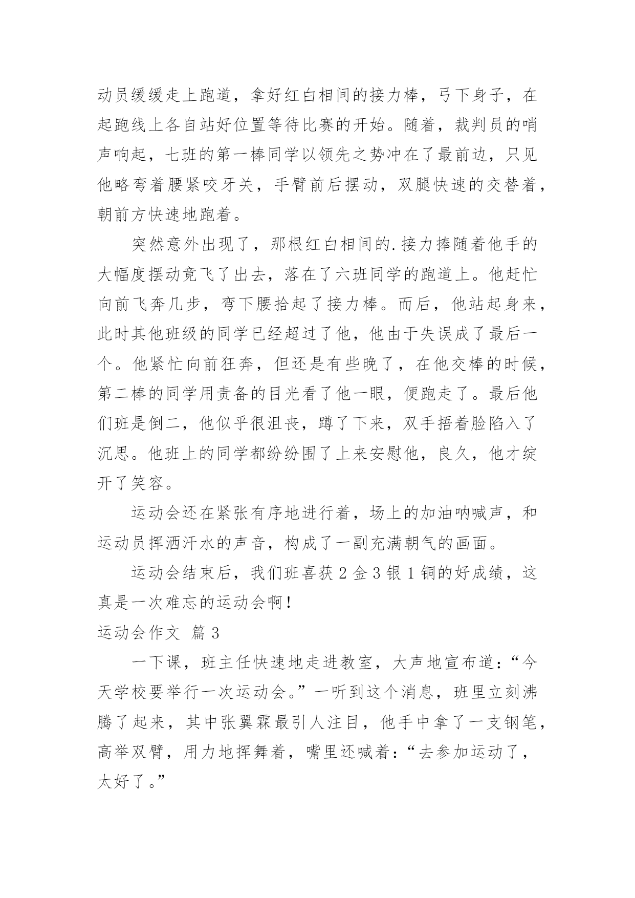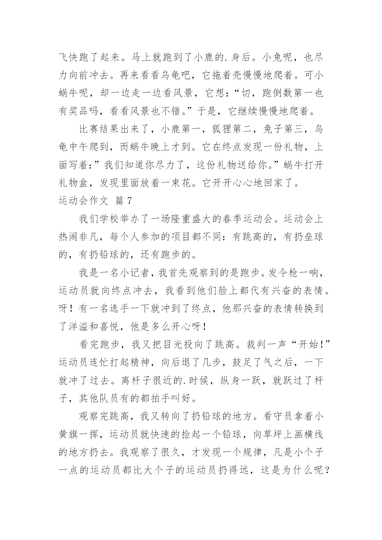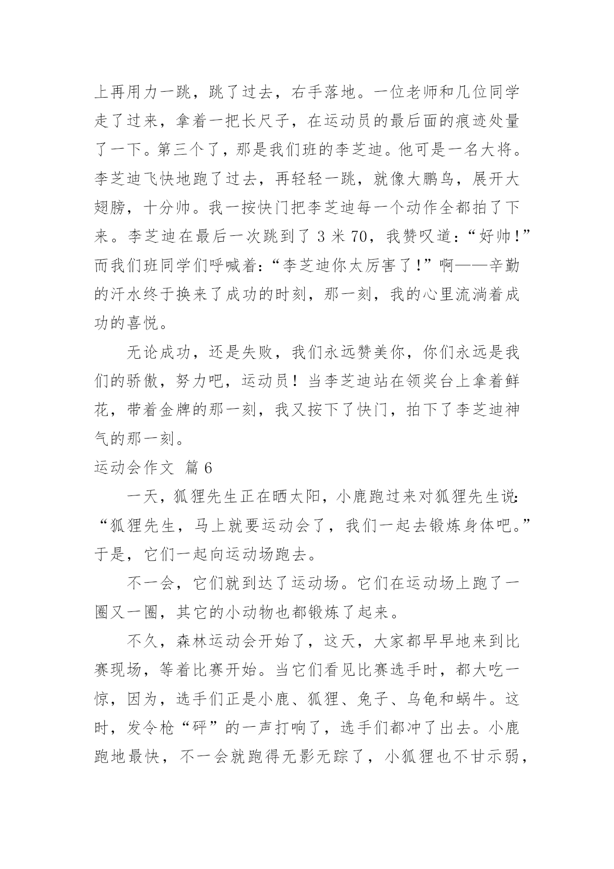 运动会作文运动会作文在日常学习、工作抑或是生活中,大家或多或少都会接触过作文吧,作文根据写作时限的不同可以分为限时作文和非限时作文。那么问题来了,到底应如何写一篇优秀的作文呢?下面是小编为大家收集的运动会作文8篇,希望对大家有所帮助。运动会作文篇1期盼已久的运动会终于来了。这天早上我们都很开心,希望看到我班运动员的出色表现。吴老师说明了运动员的.比赛项目。我也是运动员,我要用最好的状态发挥出最好的成绩。我有三项比赛。第一项是立定跳远。我双手握拳,高高举过耳朵,心里默默数数,数到二的时候,手摆到身后,双腿下蹲,用力一瞪跳出去。立定跳远可以跳三次。前两次都是1·45米。最后一次我跳了1·50米。我很开心,因为我有进步了。我准备去检录的时候,听到广播里报立定跳远的比赛结果。我听到了我的名字,特别开心。我飞奔到领奖台。大姐姐给我一束鲜花。傅老师微笑着给我一张奖状。傅老师还给我们拍了照。我的心情特别激动。我可以和其他同学一起完成接力赛,我很开心。比赛开始了,大家拼命地向前跑。我看到第三棒的吴朱儿向我跑来。我伸出右手,手握空心拳,随时准备着接棒。吴朱儿离我越来越近,我的眼皮越跳越快。我一把抓住接力棒就向前冲冲冲。这真是令人激动的运动会啊!运动会作文篇2刚开学不久,我们学校迎来了一年一度的秋季运动会,大家都非常积极踊跃地报名。每天放学后,大家都在操场上练习着,为运动会做好充分的准备。到了比赛那天,运动场上人声鼎沸。不远处,男子1000米决赛正如火如荼地进行着。裁判员哨声一响,运动员们像离弦的箭一样冲了出去,双蹆不停地交换着位置,步子迈得极大,后脚一蹬整个人就腾空而起,继而落地再腾空。这两个看起来极为简单的动作不停地重复着,运动员们距离起点也越来越远。一圈,两圈,三圈,就剩最后的五十米冲刺了。有些同学突然开始发力,速度越来越快,距离终点越来越近;有些同学因为刚开始跑得太快,体力有些不支,渐渐慢了下来;最旁边跑道上的初三学长,双眼充斥着火光,向终点奋力地跑去。果然不出我所料,初三学长获得了第一名,其他同学也陆陆续续到了终点。他们无一不累得满头大汗,一手拿着毛巾擦着额头的汗珠,一手不停地往嘴里灌着矿泉水。我们台下的观众都在为他们热烈地欢呼着。紧接着,初一100米接力预赛马上就开始了。各班级运动员缓缓走上跑道,拿好红白相间的接力棒,弓下身子,在起跑线上各自站好位置等待比赛的开始。随着,裁判员的哨声响起,七班的第一棒同学以领先之势冲在了最前边,只见他略弯着腰紧咬牙关,手臂前后摆动,双腿快速的交替着,朝前方快速地跑着。突然意外出现了,那根红白相间的.接力捧随着他手的大幅度摆动竟飞了出去,落在了六班同学的跑道上。他赶忙向前飞奔几步,弯下腰拾起了接力棒。而后,他站起身来,此时其他班级的同学已经超过了他,他由于失误成了最后一个。他紧忙向前狂奔,但还是有些晚了,在他交棒的时候,第二棒的同学用责备的目光看了他一眼,便跑走了。最后他们班是倒二,他似乎很沮丧,蹲了下来,双手捂着脸陷入了沉思。他班上的同学都纷纷围了上来安慰他,良久,他才绽开了笑容。运动会还在紧张有序地进行着,场上的加油呐喊声,和运动员挥洒汗水的声音,构成了一副充满朝气的画面。运动会结束后,我们班喜获2金3银1铜的好成绩,这真是一次难忘的运动会啊!运动会作文篇3一下课,班主任快速地走进教室,大声地宣布道:“今天学校要举行一次运动会。”一听到这个消息,班里立刻沸腾了起来,其中张翼霖最引人注目,他手中拿了一支钢笔,高举双臂,用力地挥舞着,嘴里还喊着:“去参加运动了,太好了。”不一会儿,我们就操场上站好了整齐的队伍,其中令我最难忘的就是和七班的拔河比赛。比赛决,同学们都摩拳擦掌准备比赛。比赛开始了,两队谁也不让谁,同学们都咬着牙,瞪着眼,涨红着脸,两只脚紧紧地钉在地上。我们用尽全身的力气全力拼命地往后拉,绳子中间的红带一会儿飘到东,一会儿移到西,两队都争的难分难解。剩下的同学们就象啦啦队一样,有的`挥舞着手中的拳头,有的使劲的跺着脚,还有的扯着嗓门大声喊“加油!加油!八班第一!正在这关键时刻,突然“啪”的一声,是谁摔了一咬。仔细一看,啊,竟然是七班的大力士小胖,因为少了大力士小胖,七班的同学很快就坚持不住了,我们眼看着红带一点一点的向我们班移过来,全都紧张起来,最后我们班齐心协力,用力一拉,七班的同学都被绊倒了,我们赢了,同学们激动地拥抱在一起,非常开心。我永远也忘不了这一天,通过这件事,让我懂得,只要齐心协力,就会战胜对手。运动会作文篇4经过一夜的彻夜未眠,我们终于迎来梦寐以求的春季运动会。一大早,同学们个个穿着蓝白相间的校服,戴着鲜艳的红领巾,蹦蹦跳跳地赶往学校田径场参加春季运动会。没过一会儿,精彩的运动会开幕式开始。领操的同学手上握着五颜六色的彩旗,广播里传来高昂的《运动员进行曲》,运动员代表及裁判