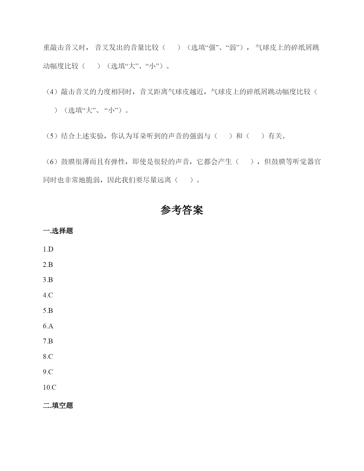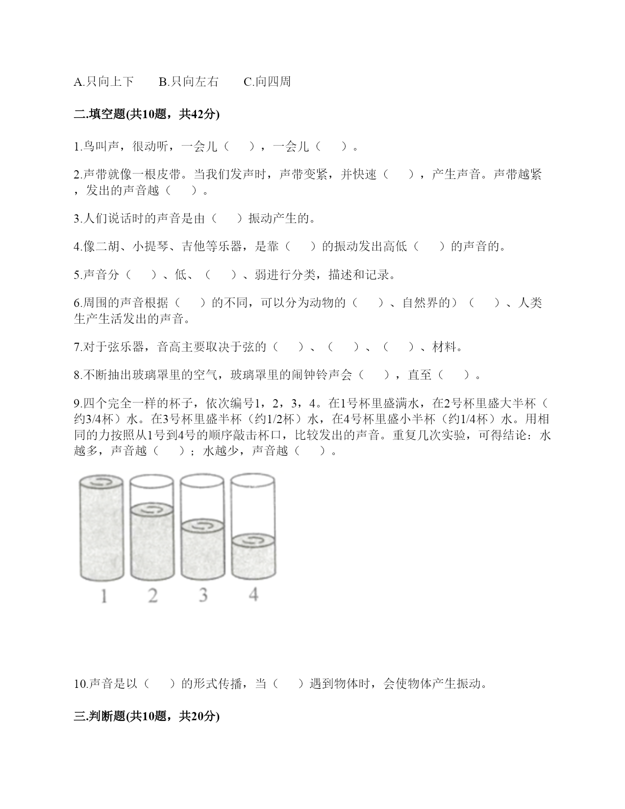 小学科学《声音》综合练习题一.选择题(共10题,共20分)1.声音产生的根源是()。A.摩擦B.空气C.发声器D.物体振动2.风声是由()产生的。A.树枝振动B.空气振动C.喇叭振动3.鼓膜受外耳道传递的声波而产生()。A.声音B.振动C.音质4.敲打音叉会发出声音,敲打停止了仍能听到一段余音,这是因为()。A.音叉停止振动后仍能发声B.声音传到人耳需要一段时间C.敲打停止后音叉继续振动了一段时间5.声音可以向()传播。A.一个方向B.四面八方C.两个方向6.向暖水瓶中倒水时,声音会随水位的上升()。A.越来越高B.越来越低C.不会改变7.关于声音,下面说法正确的是()。A.人说话是靠舌头振动发声的B.一切发声物体都在振动C.只要物体在振动,我们人耳就能听到声音8.让橡皮筋发出声音的做法是()。A.拉伸皮筋B.按压皮筋C.弹拨皮筋9.同一把钢尺伸出桌面的长度越长,振动时发出的声音就越()。A.高B.轻C.低10.把击打过的音叉轻轻放在水面上,可以看到水的波纹从振动的音叉开始()传播。A.只向上下B.只向左右C.向四周二.填空题(共10题,共42分)1.鸟叫声,很动听,一会儿(),一会儿()。2.声带就像一根皮带。当我们发声时,声带变紧,并快速(),产生声音。声带越紧,发出的声音越()。3.人们说话时的声音是由()振动产生的。4.像二胡、小提琴、吉他等乐器,是靠()的振动发出高低()的声音的。5.声音分()、低、()、弱进行分类,描述和记录。6.周围的声音根据()的不同,可以分为动物的()、自然界的)()、人类生产生活发出的声音。7.对于弦乐器,音高主要取决于弦的()、()、()、材料。8.不断抽出玻璃罩里的空气,玻璃罩里的闹钟铃声会(),直至()。9.四个完全一样的杯子,依次编号1,2,3,4。在1号杯里盛满水,在2号杯里盛大半杯(约3/4杯)水。在3号杯里盛半杯(约1/2杯)水,在4号杯里盛小半杯(约1/4杯)水。用相同的力按照从1号到4号的顺序敲击杯口,比较发出的声音。重复几次实验,可得结论:水越多,声音越();水越少,声音越()。10.声音是以()的形式传播,当()遇到物体时,会使物体产生振动。三.判断题(共10题,共20分)1.噪音会影响人的工作、学习和睡眠,对人体有一定危害,也是一种污染。()2.音乐家贝多芬失聪后,用木棒“听”音乐,这说明了木棒也能传播声音。()3.用不同的力敲击鼓面时,鼓面振动的幅度不会发生变化。()4.为了防止琴弦松脱,琴弦调得越紧越好。()5.音叉发声时看起来没有运动,所以音叉发声时不振动。()6.制作小乐器的步骤是“设计—制作—调整—演示”。()7.当我们潜伏在水里时,就完全听不到水面上的声音了。()8.铝板琴上的铝板越大,发出的声音越高。()9.当我们发声时,声带越紧,发出的声音越低。()10.拉伸皮筋就能使其发出声音。()四.连线题(共1题,共4分)1.如果我们在同样条件下,拨动拉得较紧的橡皮筋听到的声音高拨动拉得较松的橡皮筋听到的声音低五.填表题(共2题,共16分)1.根据你对耳朵的了解,完成下表。2.观察物体是否发声。六.简答题(共5题,共25分)1.同根弦发出的声音高低变化的规律是什么?2.在相同力量下,能影响弦发出高低不同声音的因素有哪些?3.向水壶中倒水,随着水越到越多,听到的声音高低不同,倒的水越多,声音越高,其科学原理是什么?4.声音是怎样进行传播的?5.如图,请你提出两个与“橡皮筋发出声音”有关的科学探究问题。七.材料题(共3题,共18分)1.在下图中选出制作土电话的材料。(在选中的材料序号上画“√”)思考:在玩土电话游戏时,对方讲话的声音是通过什么物体传到听话人的耳朵里的?用什么方法能够使土电话中的声音更大一些?2.唐朝著名诗人白居易在《琵琶行》中有“大弦嘈嘈如急雨,小弦切切如私语”的诗句。意思是粗弦嘈嘈,好像是疾风骤雨,细弦切切,好像是儿女私语。根据所学的知识,说一说弦的粗细对音高有什么影响?还有哪些因素能影响音高?3.夏天的夜晚,我们经常能听到蟋蟀的叫声,可是,你知道吗?只有雄性蟋蟀会叫,雌性是不会叫的。而且,蟋蟀的叫声不是从口中发出的,而是靠翅膀的摩擦来发声的。在雄性蟋蟀的前翅上,有旋涡纹状的翅膜,一边翅膀长着锉刀状的翅膜——弦器,另一边翅膀长着较硬的翅膜——弹器。当这两种发音器相互摩擦时,就能发出声音。蟋蟀称得上是昆虫界里一名优秀的小提琴师。你还听见过哪些动物的叫声?试写出5种。八.综合题(共5题,共44分)1.请在图中用“高→低”或“低→高”来表示声音的变化规律。通过比较我发现声音是由()产生的,一般短的、细的物体()快